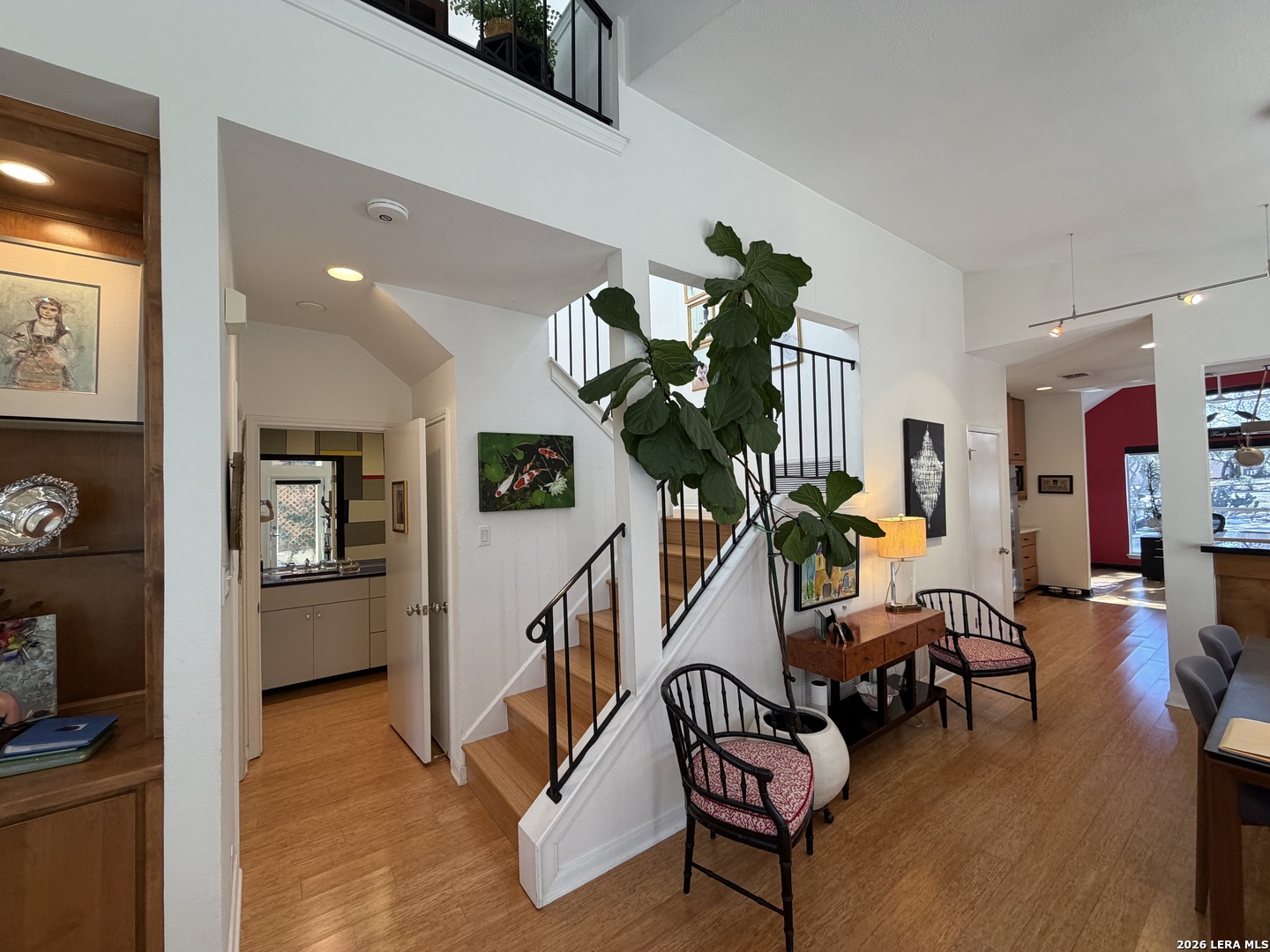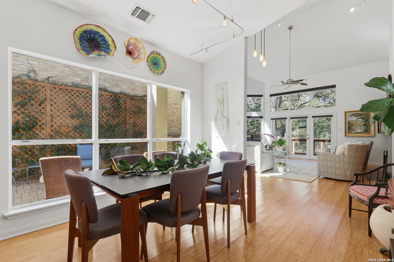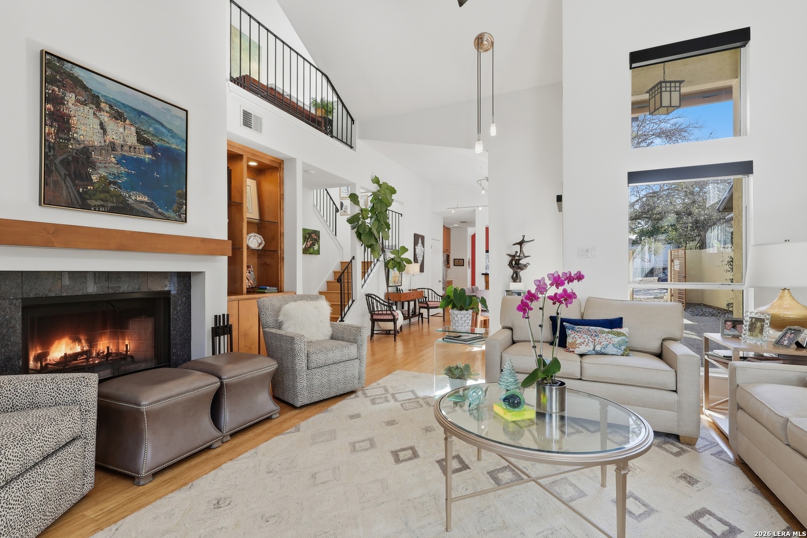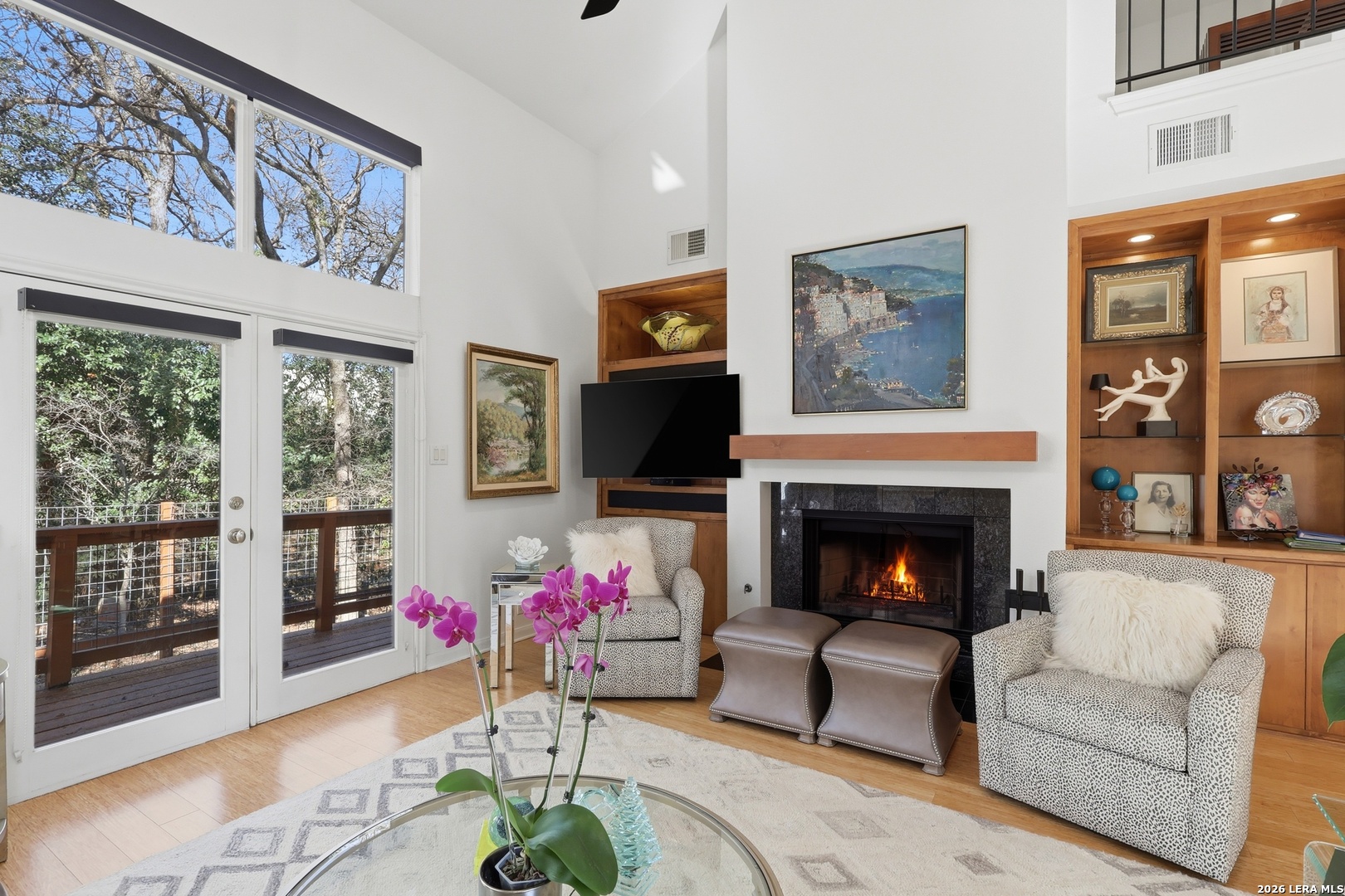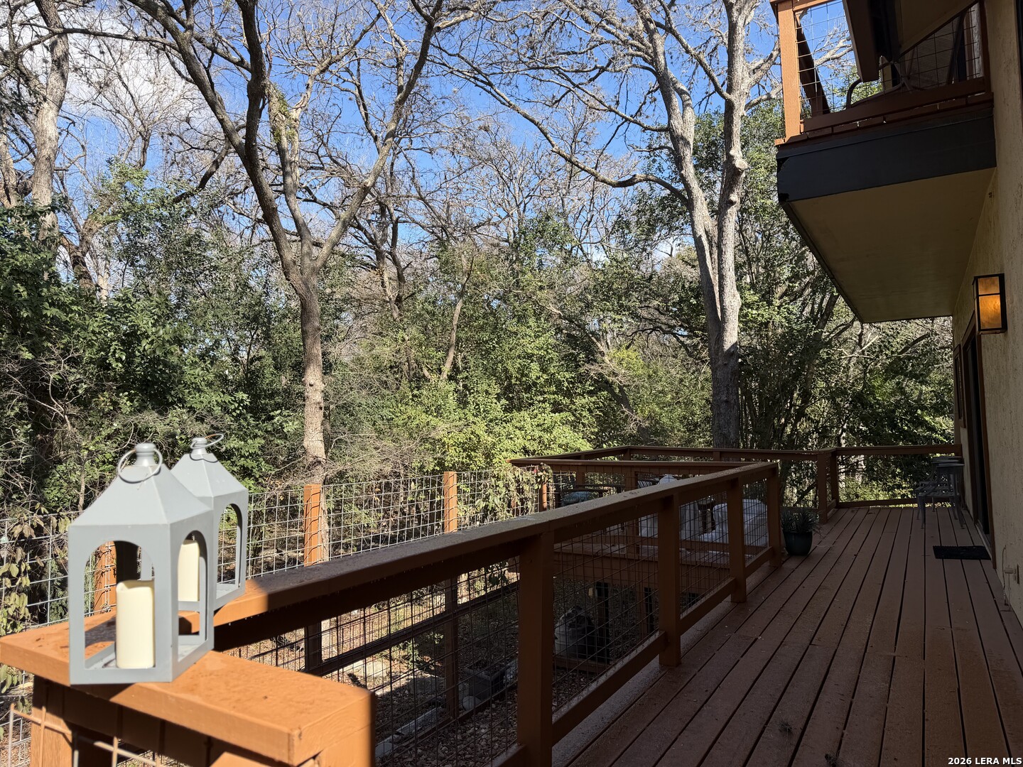 Sophisticated Contemporary Home Designed with Art Lovers in mind, Soaring Ceilings and Walls of Windows flood the Interior with Natural Light that amplifies the Home's Contemporary feel, Enjoy viewing Birds galore through the Front Study Windows as they drink from the Mega-Ton Unique Stone Fountain, Step Out Back onto the 15' X 39' deck that runs the entire length of the house and view a fabulous surround of Mature Trees, Residents of Oakwell Farms enjoy an array of Amenities, including a Community Swimming Pool, Tennis Courts, Playground, Scenic Walking Trails and 24/7 Guarded Entry Gate. The luxurious Primary Bedroom is located on the main floor with direct access to the Back Deck. Secondary Bedroom has a convenient built in Murphy Bed for guests, Custom Cabinetry adorn the walls in the Kitchen along with Solid Counters and a huge Window over the Sink viewing the large Paved Courtyard. Low-maintenance Landscaping adds to the appeal allowing you to spend more time enjoying your Home and less time on upkeep. Conveniently located near the Airport, Military bases, and Shopping, you'll be just a 15-minute drive from the Vibrant Heart of Downtown San Antonio.