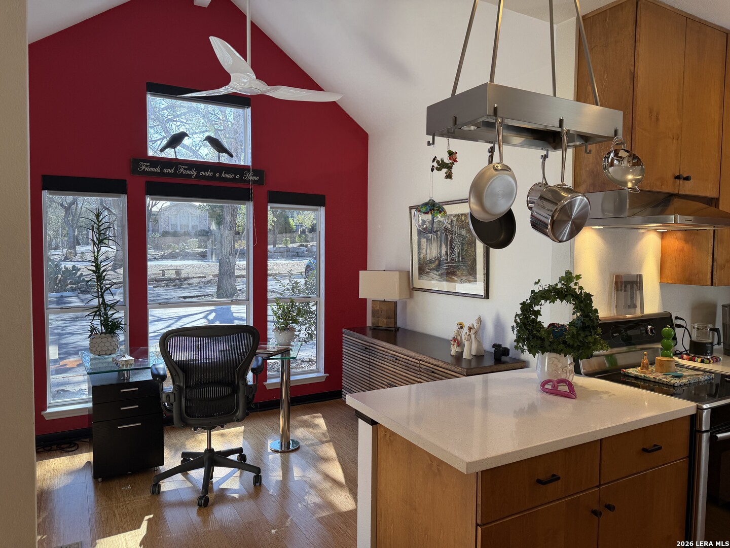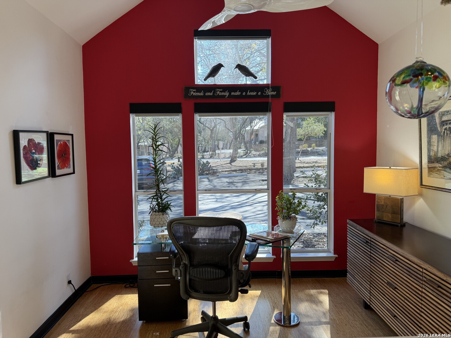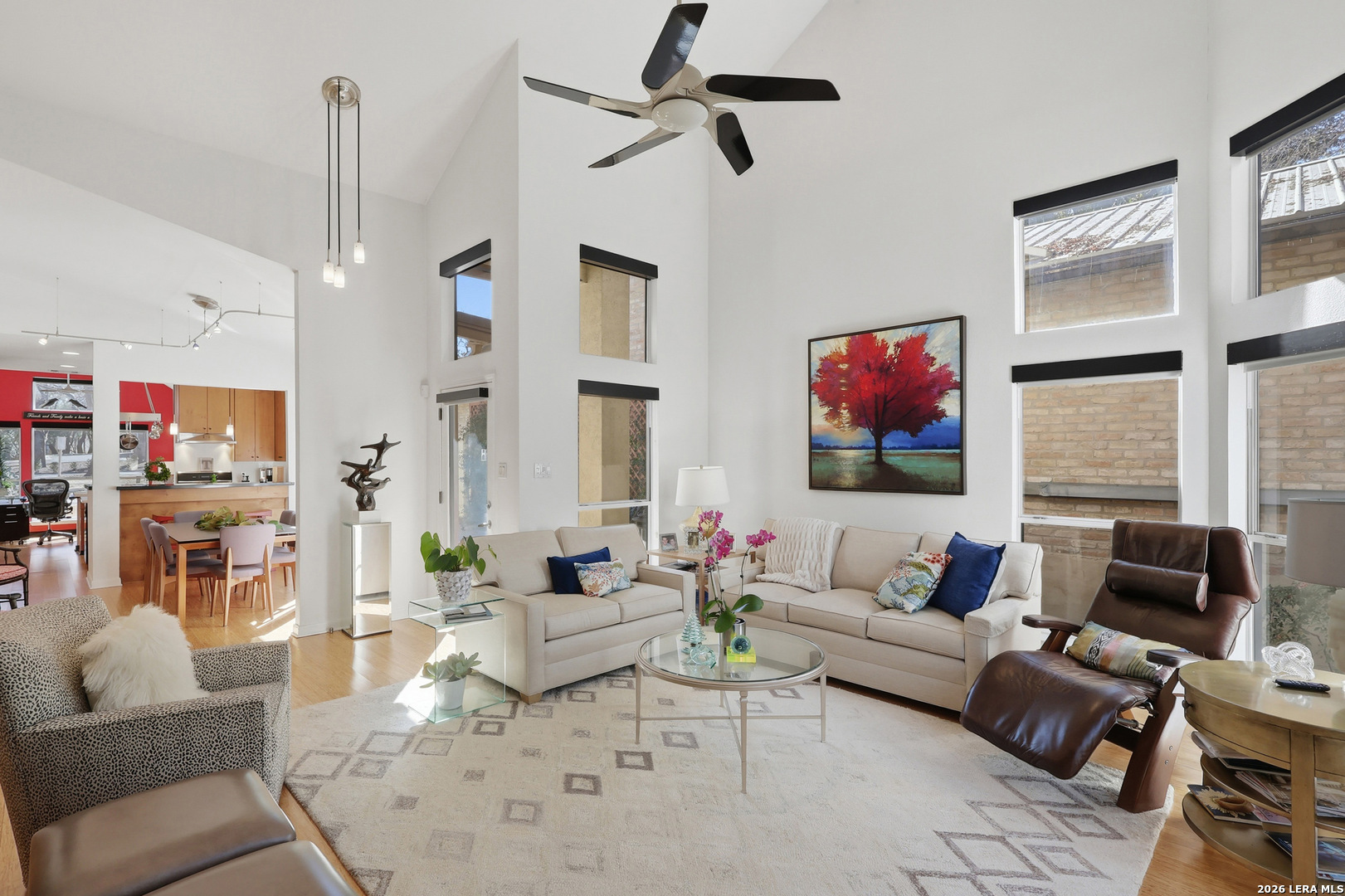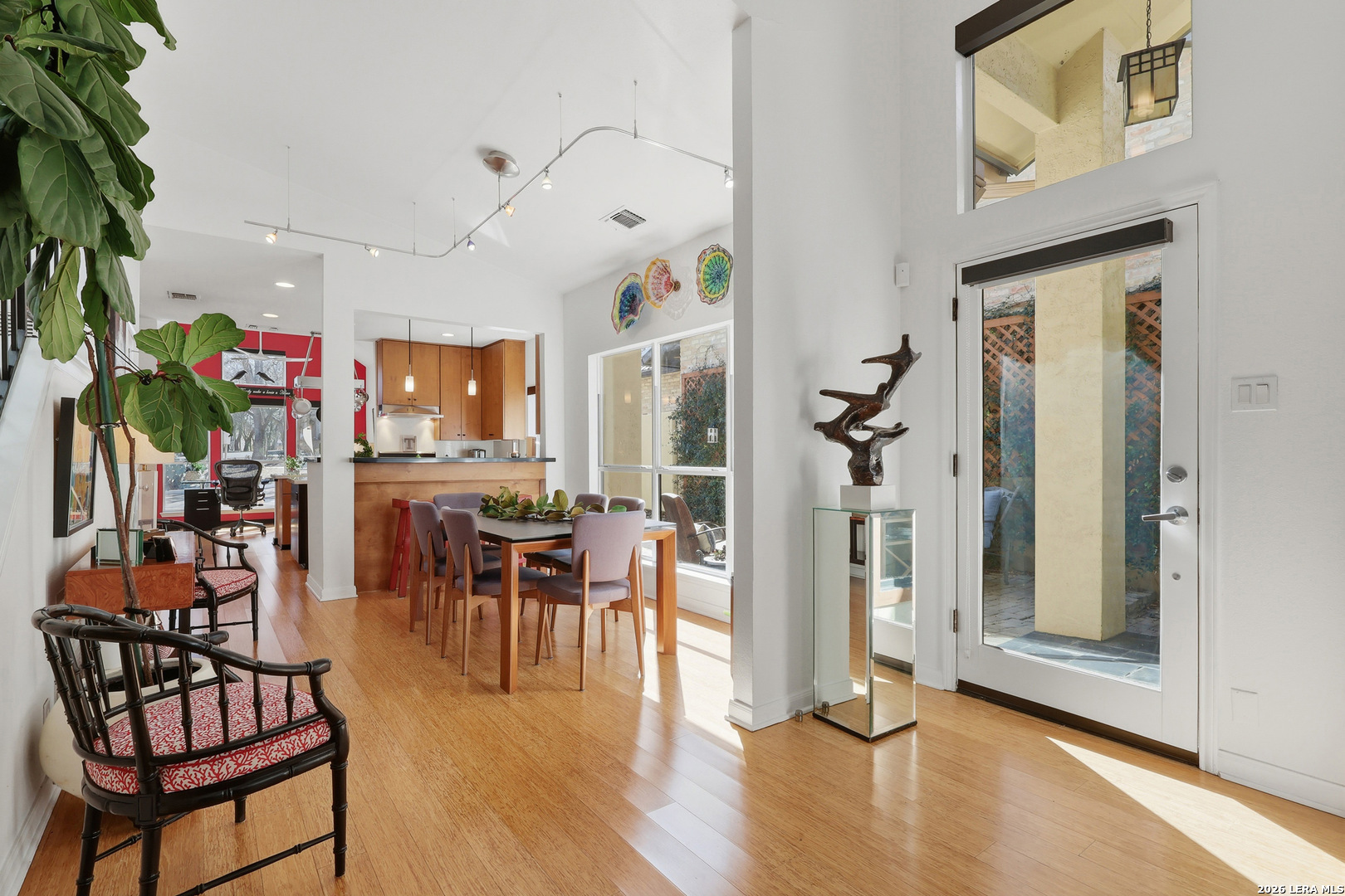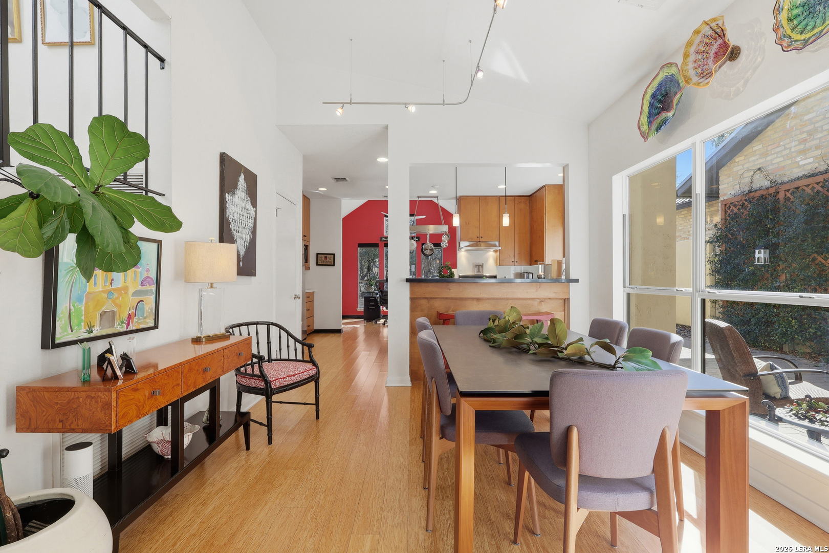 Sophisticated Contemporary Home Designed with Art Lovers in mind, Soaring Ceilings and Walls of Windows flood the Interior with Natural Light that amplifies the Home's Contemporary feel, Enjoy viewing Birds galore through the Front Study Windows as they drink from the Mega-Ton Unique Stone Fountain, Step Out Back onto the 15' X 39' deck that runs the entire length of the house and view a fabulous surround of Mature Trees, Residents of Oakwell Farms enjoy an array of Amenities, including a Community Swimming Pool, Tennis Courts, Playground, Scenic Walking Trails and 24/7 Guarded Entry Gate. The luxurious Primary Bedroom is located on the main floor with direct access to the Back Deck. Secondary Bedroom has a convenient built in Murphy Bed for guests, Custom Cabinetry adorn the walls in the Kitchen along with Solid Counters and a huge Window over the Sink viewing the large Paved Courtyard. Low-maintenance Landscaping adds to the appeal allowing you to spend more time enjoying your Home and less time on upkeep. Conveniently located near the Airport, Military bases, and Shopping, you'll be just a 15-minute drive from the Vibrant Heart of Downtown San Antonio.