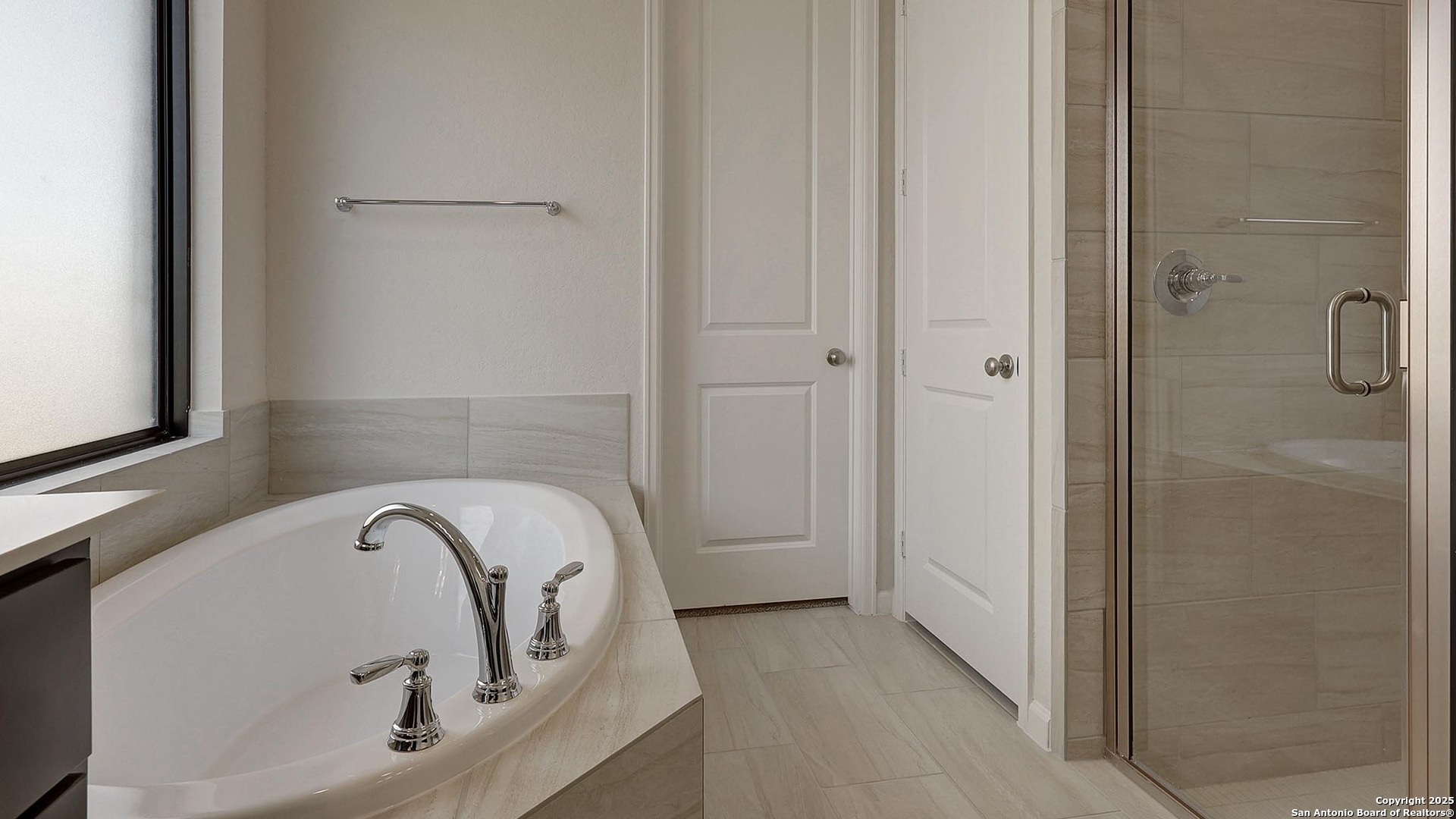 Home office with French doors set at two-story entry. Two-story family room with wall of windows opens to kitchen and dining area. Kitchen hosts inviting island with built-in seating space and 5-burner gas cooktop. First-floor primary suite includes dual vanities, garden tub, separate glass-enclosed shower and large walk-in closet in primary bath. A second bedroom is downstairs. Two secondary bedrooms and a game room are upstairs. Extended covered backyard patio and 5-zone sprinkler system. Two-car garage.