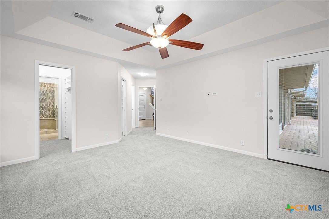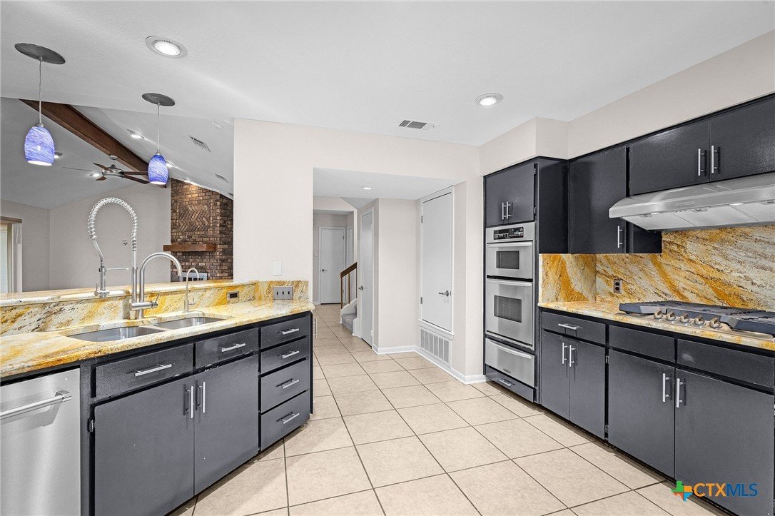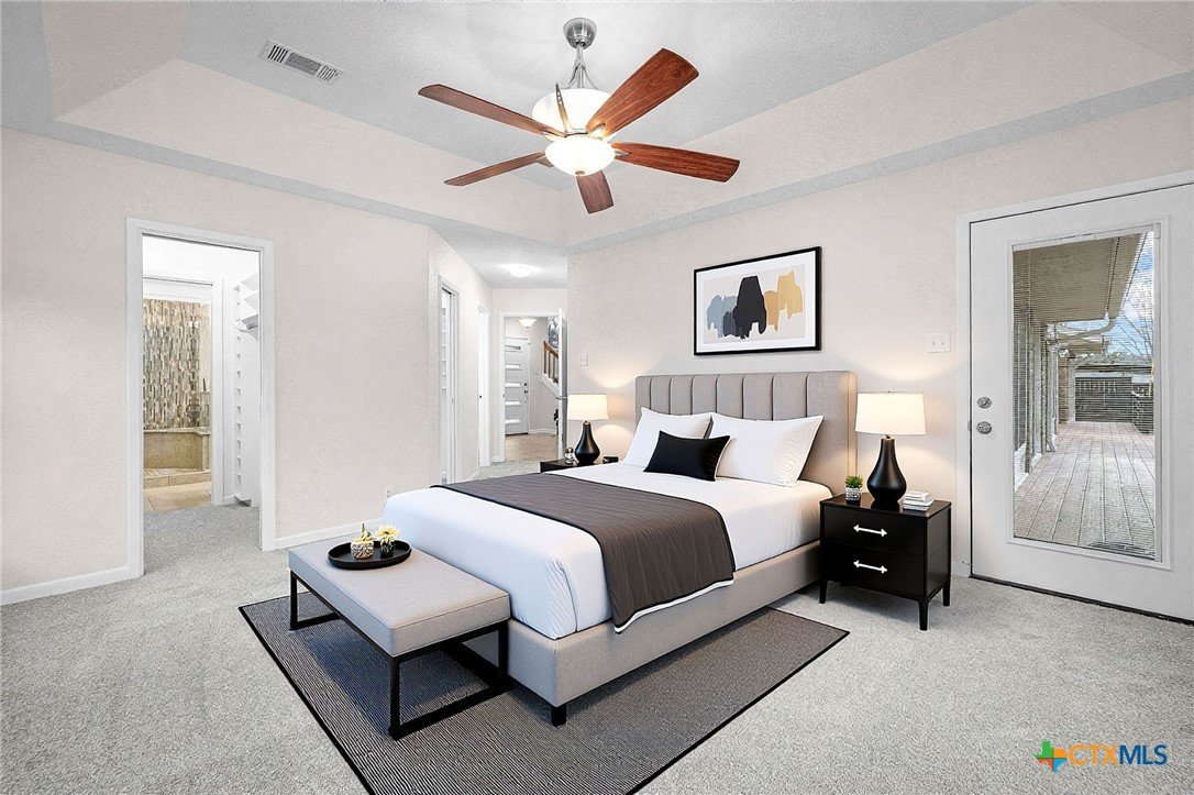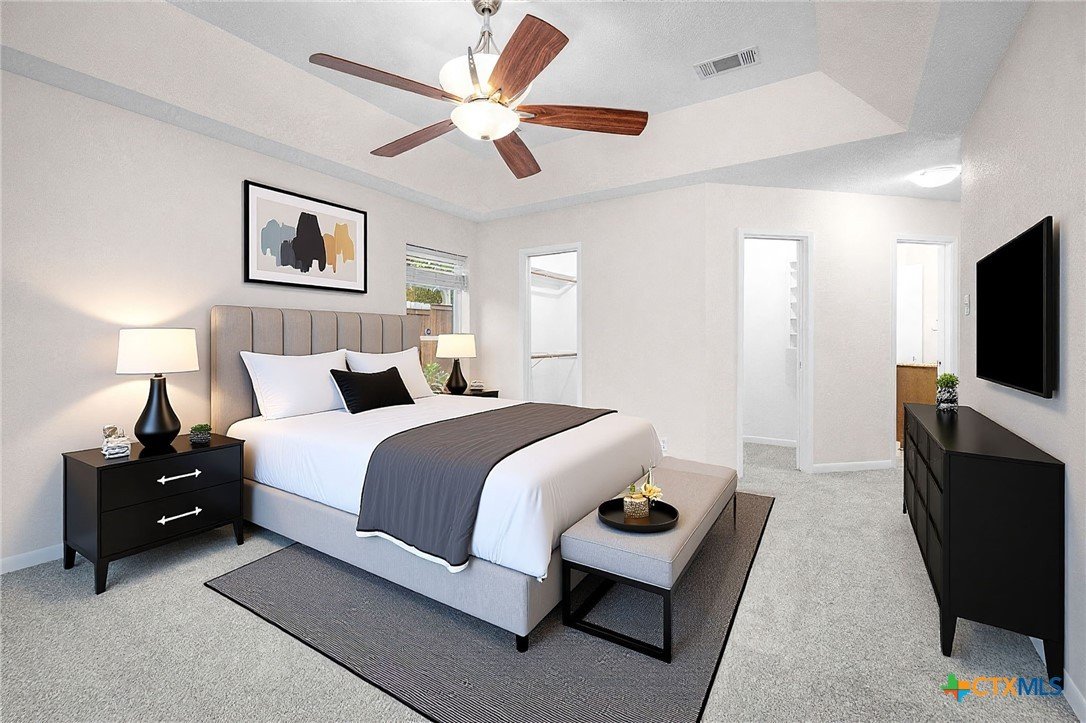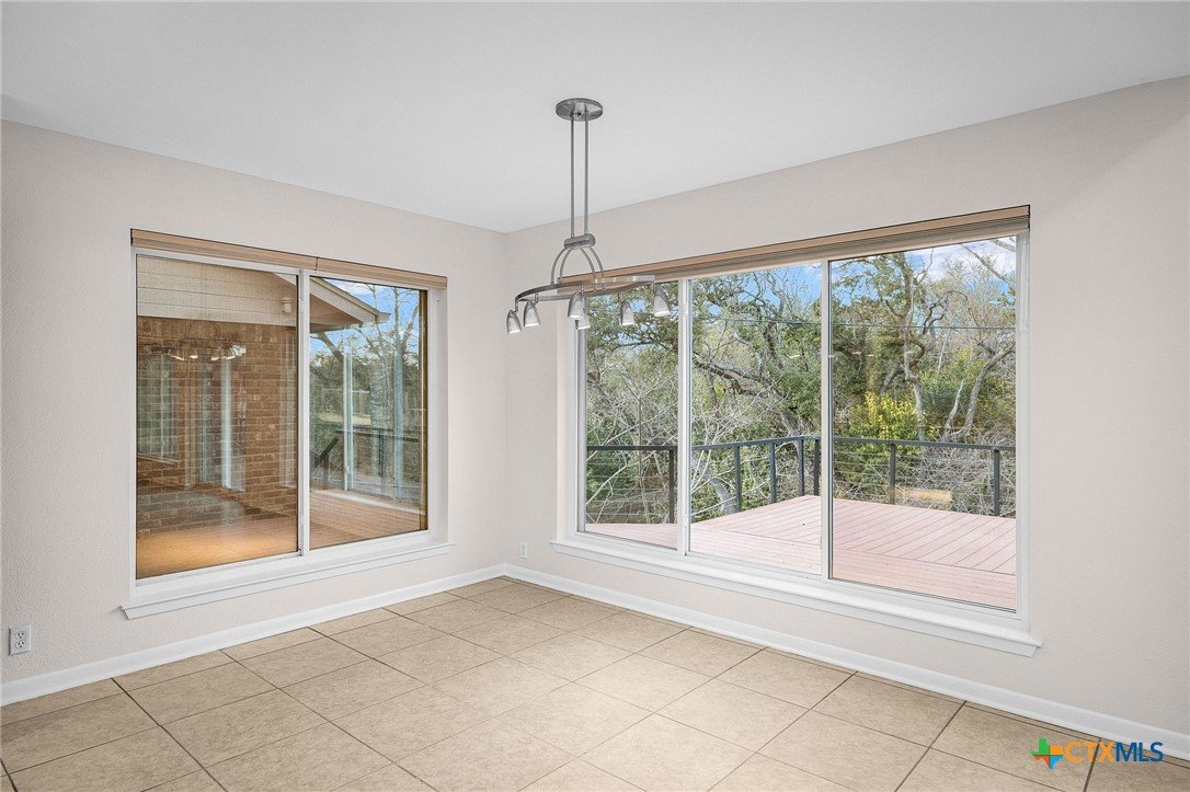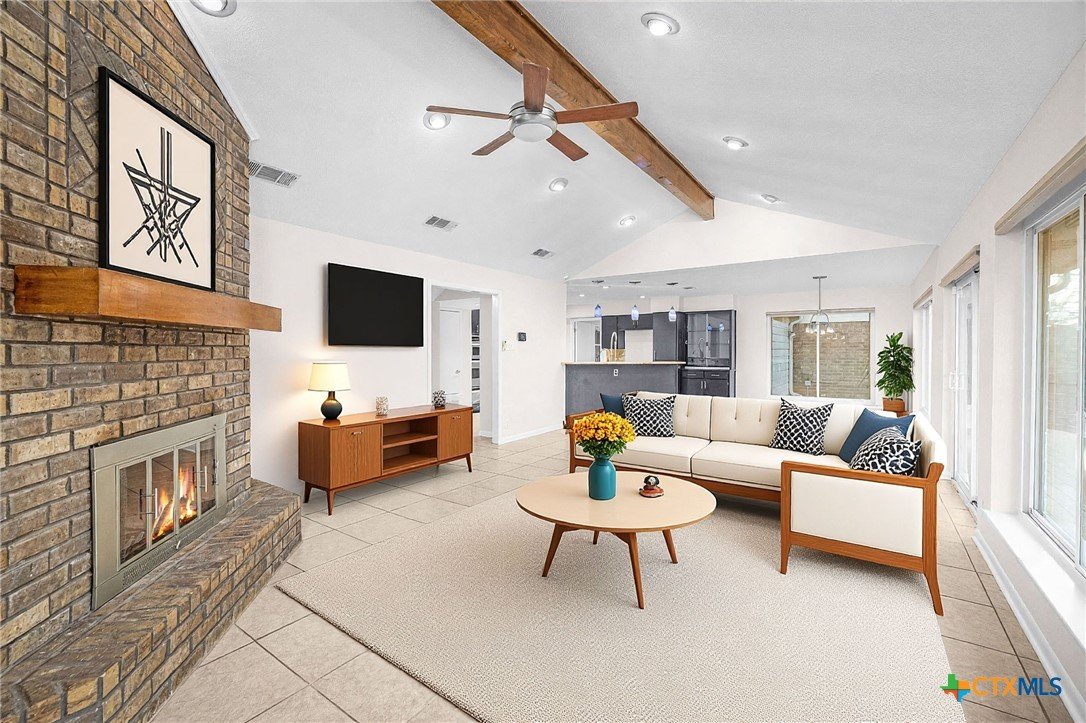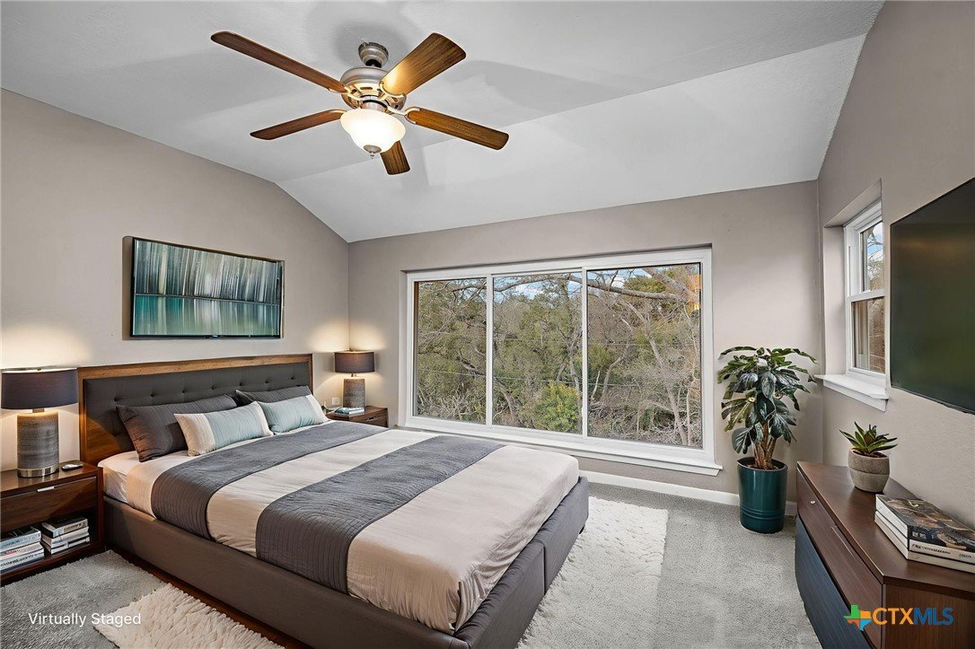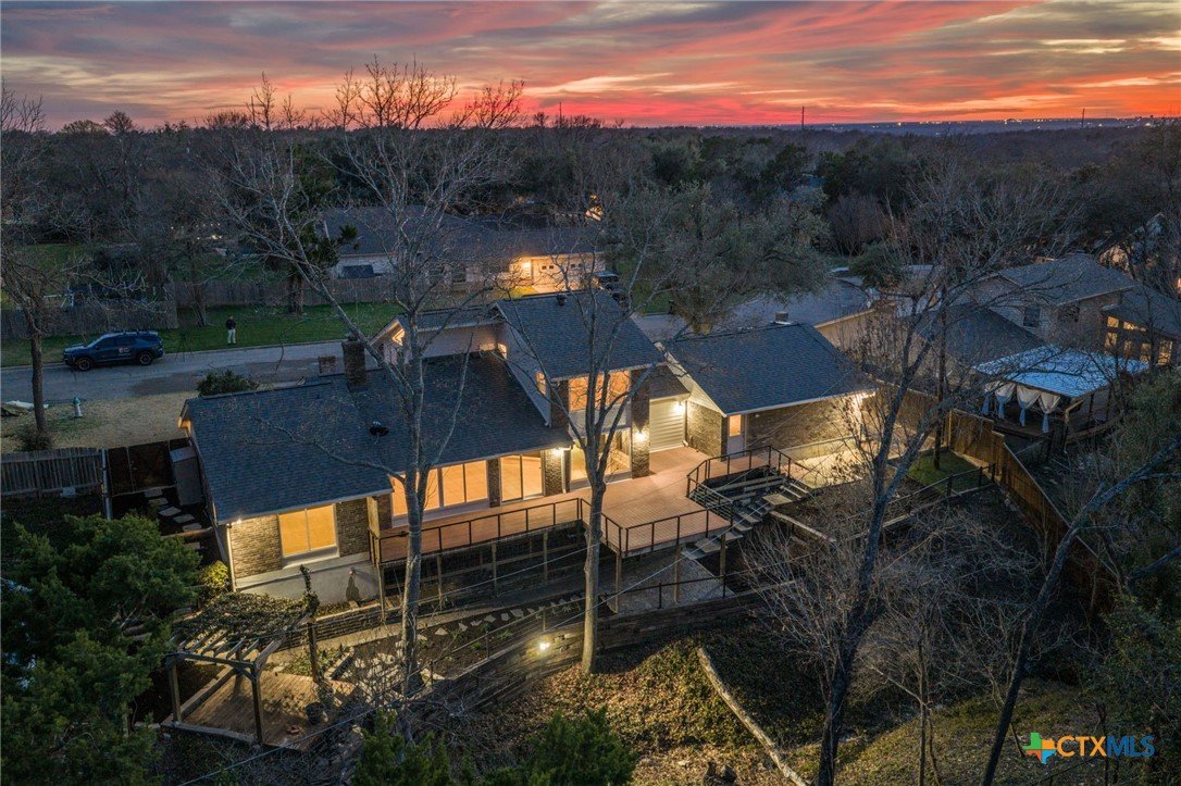 Tucked into the trees in the established Wendy Oaks neighborhood, this striking mid-century modern home blends architectural character with thoughtful updates and energy efficiency. Situated on a beautifully landscaped lot, 3906 Wendy Oaks Drive offers wooded views from nearly every window and a backyard that feels like a private retreat. After a rain, enjoy the peaceful sound of a wet-weather waterfall that flows through the natural landscape below the expansive deck. Multiple outdoor living spaces create the perfect setting for entertaining, relaxing, or simply taking in the sunset views. Inside, you will find over 2,100 square feet of above grade living space featuring clean lines, oversized windows, and warm natural light. The spacious living area anchors the home with a statement fireplace and seamless flow into the dining and kitchen spaces. Fresh interior and exterior paint provide a crisp, modern feel, and new carpet throughout adds comfort and continuity. The primary suite is privately positioned on the main level, while two additional bedrooms and a full bath are located upstairs, offering flexibility for guests, family, or office space. The functional layout also includes generous storage, a large laundry area, and a two car garage. Energy efficiency is a major plus with paid off solar panels, helping reduce utility costs while adding long term value. Located just minutes from everyday conveniences including HEB, Walmart, Aldi, Baylor Scott and White Hospital, the VA Hospital, and a nearby park with playground, this home offers both tranquility and accessibility. Architectural character, wooded privacy, paid off solar, and modern updates make this Wendy Oaks property a rare find in Temple.