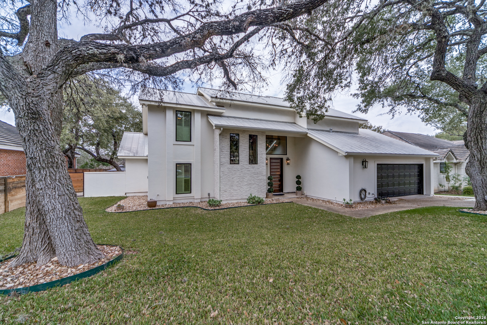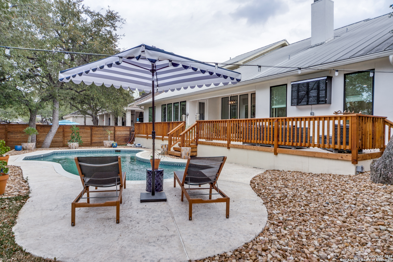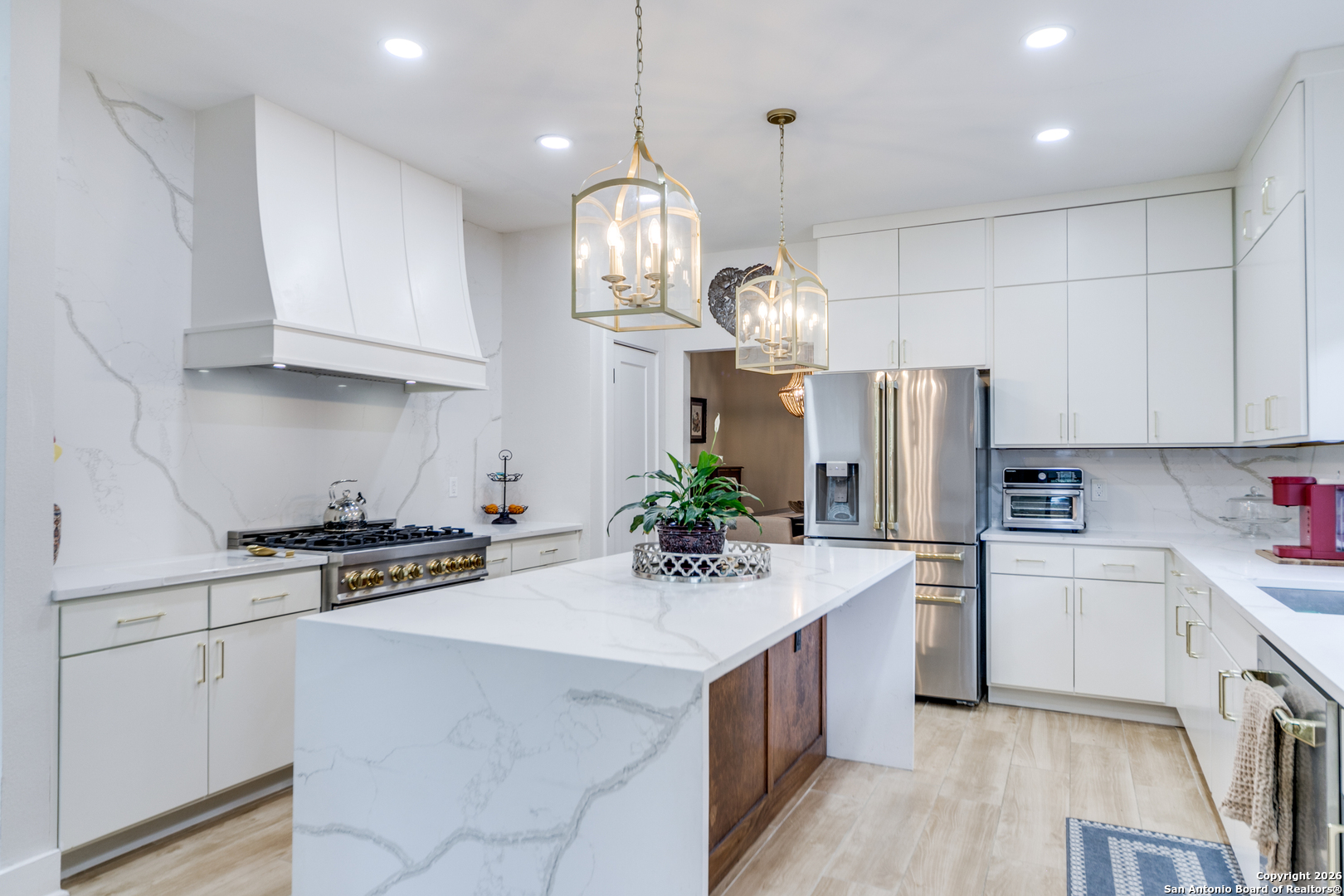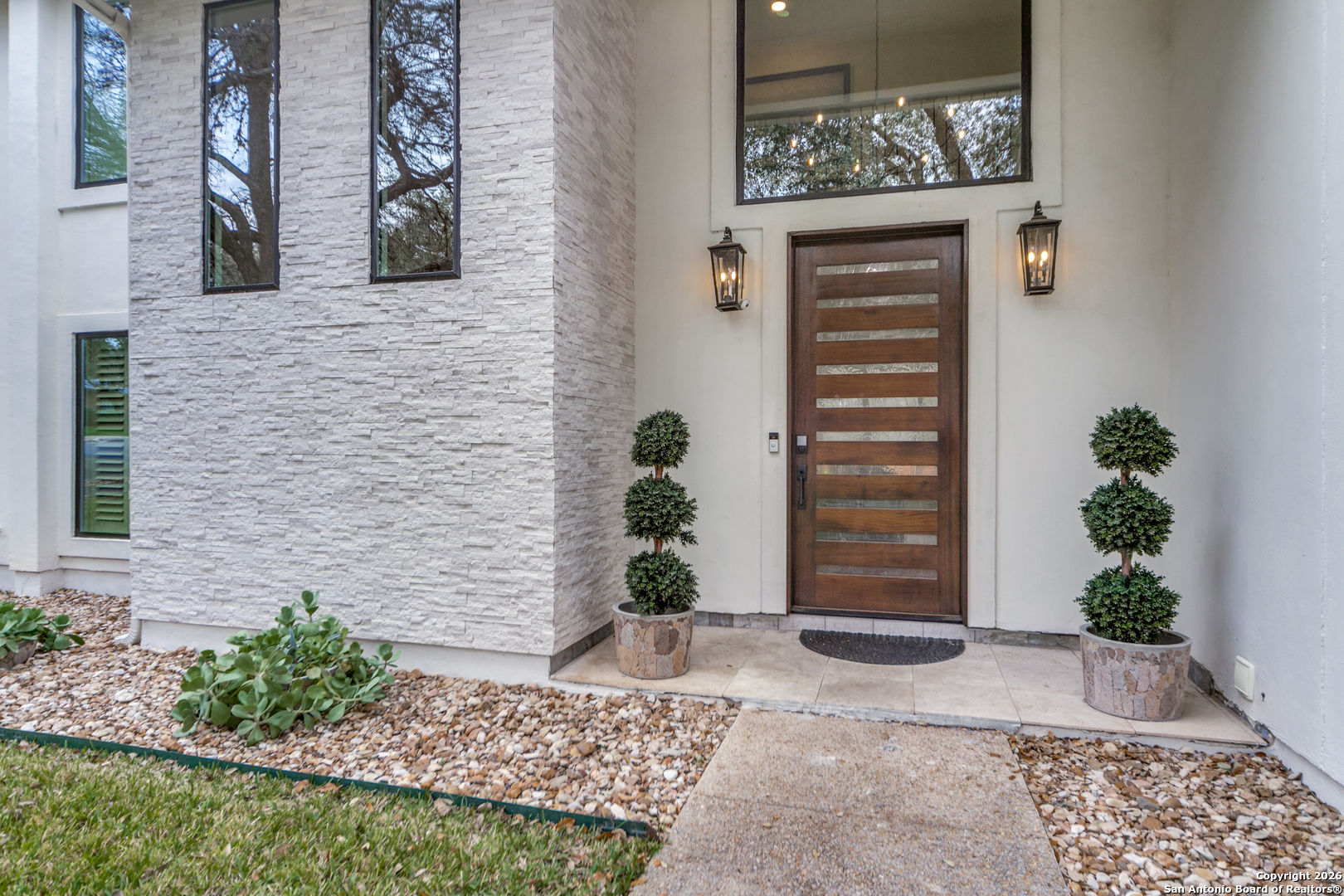 A Hunters Creek North beauty on the greenbelt! An exquisite Modern Traditional custom home showcasing timeless elegance, elevated craftsmanship, and thoughtfully curated modern finishes throughout creating a warm yet sophisticated living experience. This gorgeous modern traditional custom home was fully remodeled in 2023. So many upgrades to mention, agents a list of updates/upgrades can be found in Additional Information. Boasting 5 bedrooms and 3.5 bathrooms, one of the bedrooms can easily be used as an office/study. Upstairs features three bedrooms and two bathrooms in a thoughtfully designed split floor plan. Designed for everyday family living and entertaining, the open-concept layout showcases high ceilings and custom windows that flood the home with natural light and highlight beautiful views of the pool and outdoor landscape. Thoughtfully planned for both function and style, the updated kitchen highlights quartz countertops with waterfall edges, a large island, a gas cooktop, and custom cabinetry. All appliances are ZLine (top of the line) installed in 2023. As you enter the backyard paradise, enjoy time with family and friends on the deck, by the sparkling pool, or down in the lighted cabana. The full sprinkler system in front and back keep green areas happy. The greenbelt behind the property provides access to walking trails and is in close proximity to the Salado Creek Trailhead. Location is everything for 3915 Hunters Rock as you are conveniently located near the airport, La Cantera, Fiesta Texas, shopping, restaurants, USAA, and so much more. Don't miss the opportunity to own this beautifully maintained home!