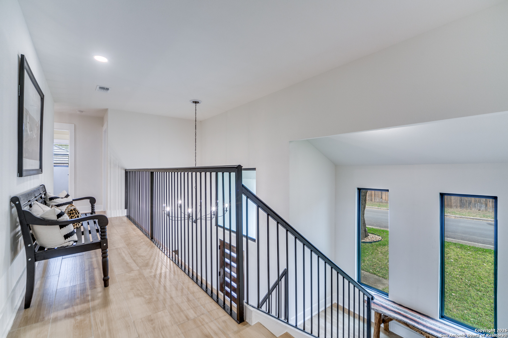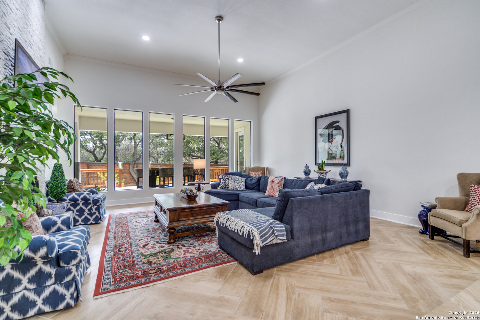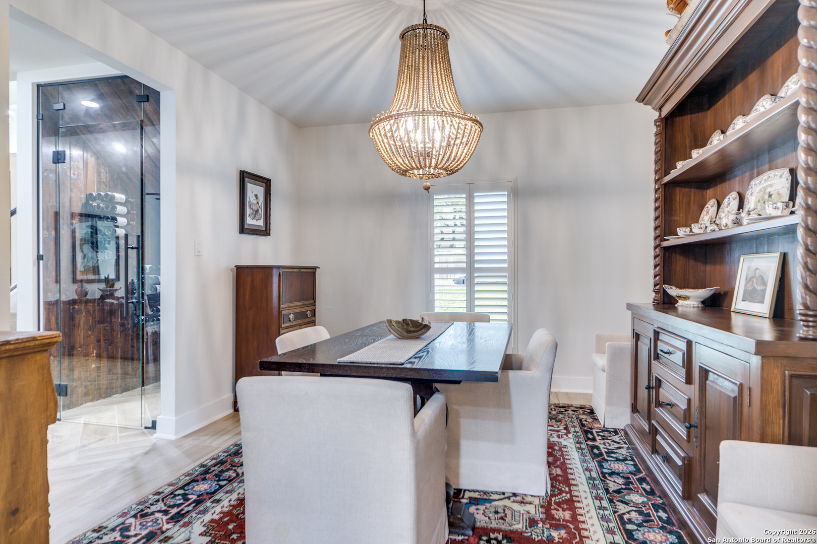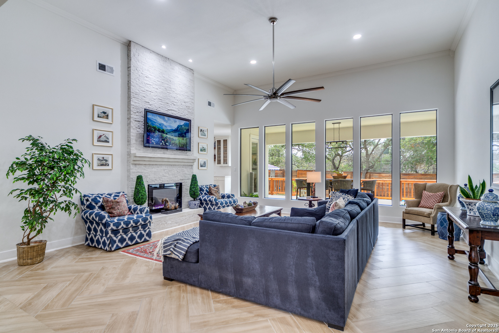 A Hunters Creek North beauty on the greenbelt! An exquisite Modern Traditional custom home showcasing timeless elegance, elevated craftsmanship, and thoughtfully curated modern finishes throughout creating a warm yet sophisticated living experience. This gorgeous modern traditional custom home was fully remodeled in 2023. So many upgrades to mention, agents a list of updates/upgrades can be found in Additional Information. Boasting 5 bedrooms and 3.5 bathrooms, one of the bedrooms can easily be used as an office/study. Upstairs features three bedrooms and two bathrooms in a thoughtfully designed split floor plan. Designed for everyday family living and entertaining, the open-concept layout showcases high ceilings and custom windows that flood the home with natural light and highlight beautiful views of the pool and outdoor landscape. Thoughtfully planned for both function and style, the updated kitchen highlights quartz countertops with waterfall edges, a large island, a gas cooktop, and custom cabinetry. All appliances are ZLine (top of the line) installed in 2023. As you enter the backyard paradise, enjoy time with family and friends on the deck, by the sparkling pool, or down in the lighted cabana. The full sprinkler system in front and back keep green areas happy. The greenbelt behind the property provides access to walking trails and is in close proximity to the Salado Creek Trailhead. Location is everything for 3915 Hunters Rock as you are conveniently located near the airport, La Cantera, Fiesta Texas, shopping, restaurants, USAA, and so much more. Don't miss the opportunity to own this beautifully maintained home!
