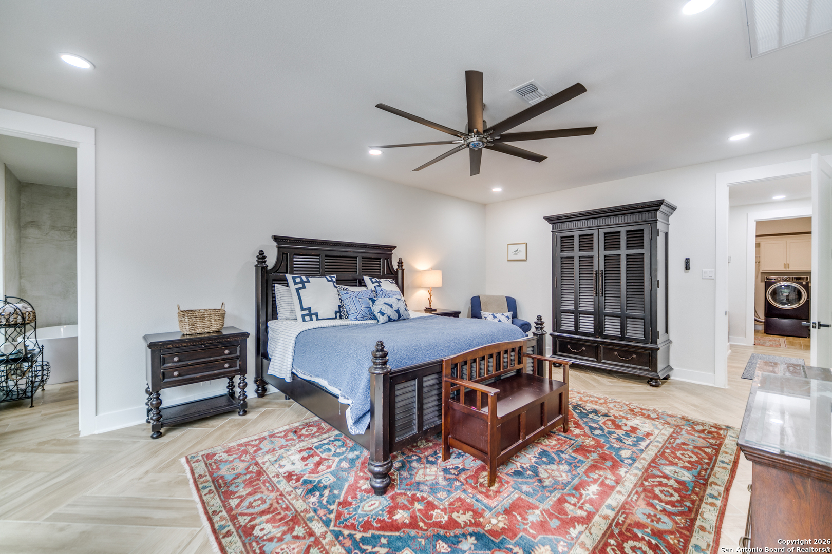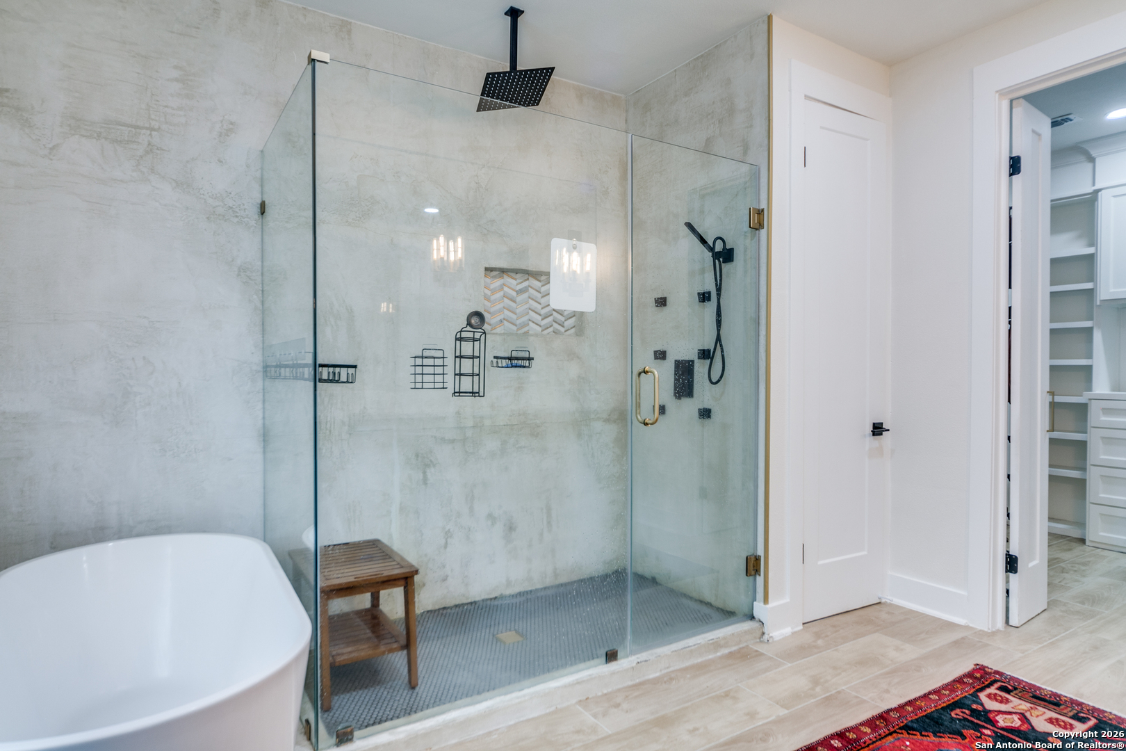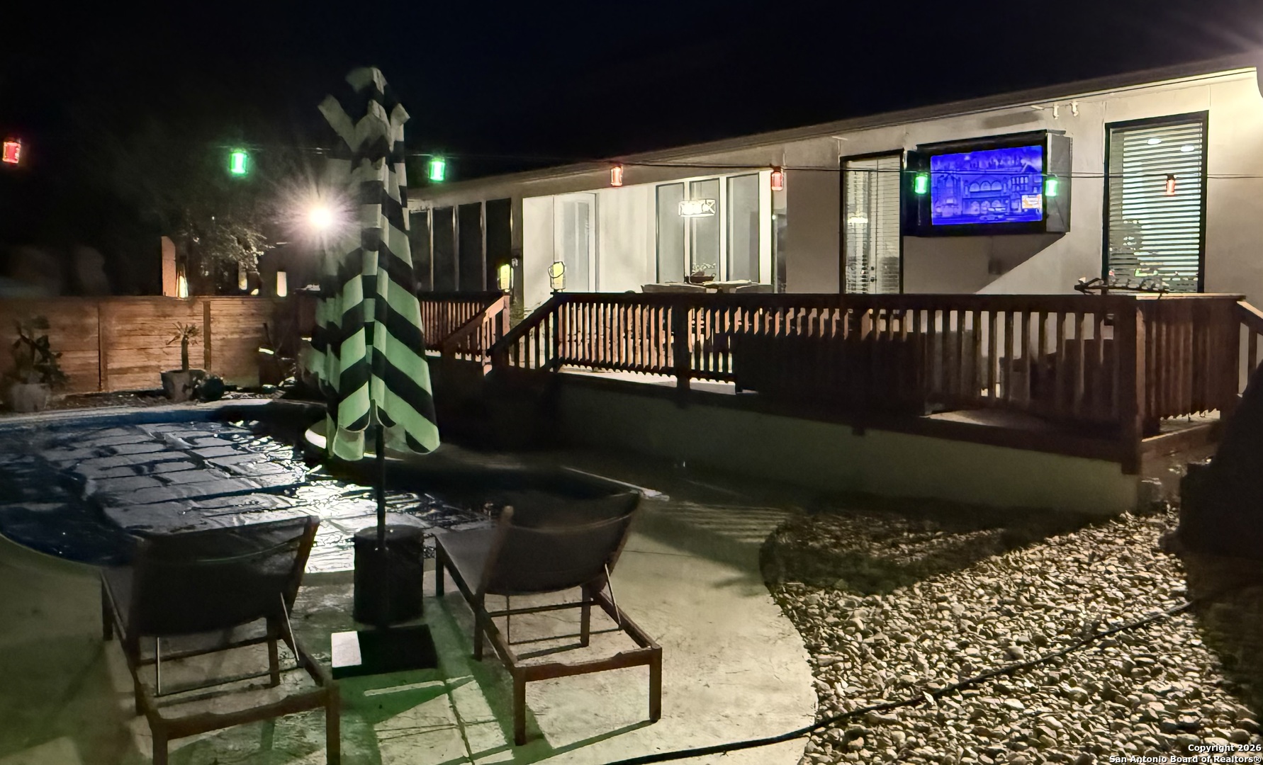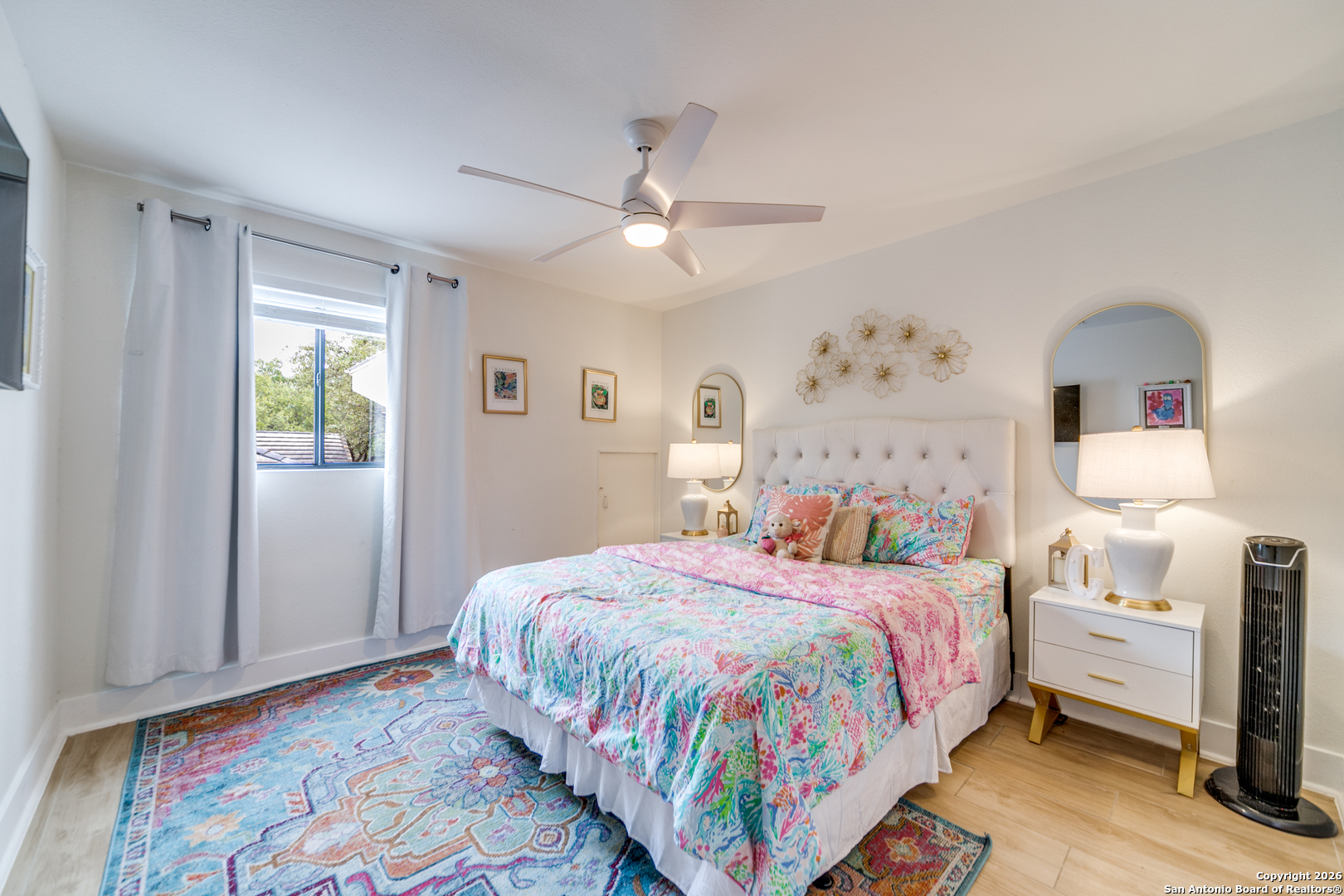 A Hunters Creek North beauty on the greenbelt! An exquisite Modern Traditional custom home showcasing timeless elegance, elevated craftsmanship, and thoughtfully curated modern finishes throughout creating a warm yet sophisticated living experience. This gorgeous modern traditional custom home was fully remodeled in 2023. So many upgrades to mention, agents a list of updates/upgrades can be found in Additional Information. Boasting 5 bedrooms and 3.5 bathrooms, one of the bedrooms can easily be used as an office/study. Upstairs features three bedrooms and two bathrooms in a thoughtfully designed split floor plan. Designed for everyday family living and entertaining, the open-concept layout showcases high ceilings and custom windows that flood the home with natural light and highlight beautiful views of the pool and outdoor landscape. Thoughtfully planned for both function and style, the updated kitchen highlights quartz countertops with waterfall edges, a large island, a gas cooktop, and custom cabinetry. All appliances are ZLine (top of the line) installed in 2023. As you enter the backyard paradise, enjoy time with family and friends on the deck, by the sparkling pool, or down in the lighted cabana. The full sprinkler system in front and back keep green areas happy. The greenbelt behind the property provides access to walking trails and is in close proximity to the Salado Creek Trailhead. Location is everything for 3915 Hunters Rock as you are conveniently located near the airport, La Cantera, Fiesta Texas, shopping, restaurants, USAA, and so much more. Don't miss the opportunity to own this beautifully maintained home!