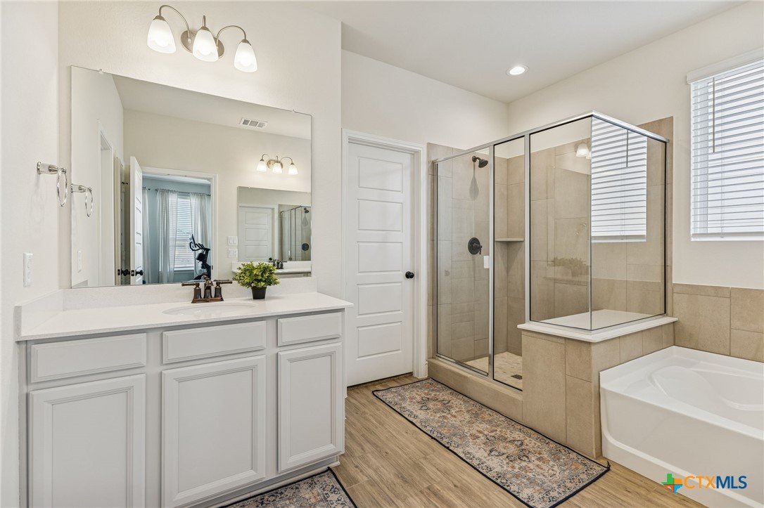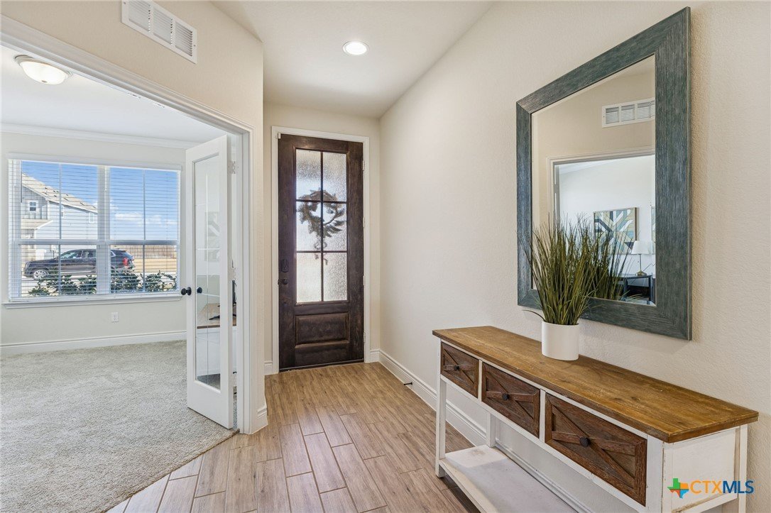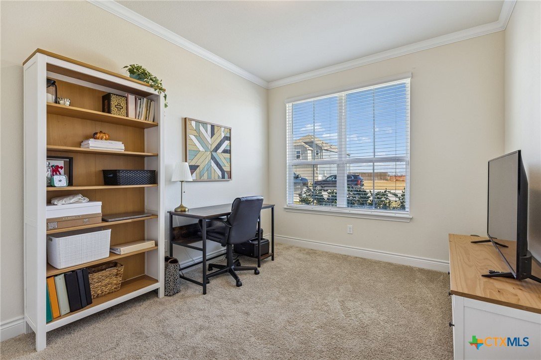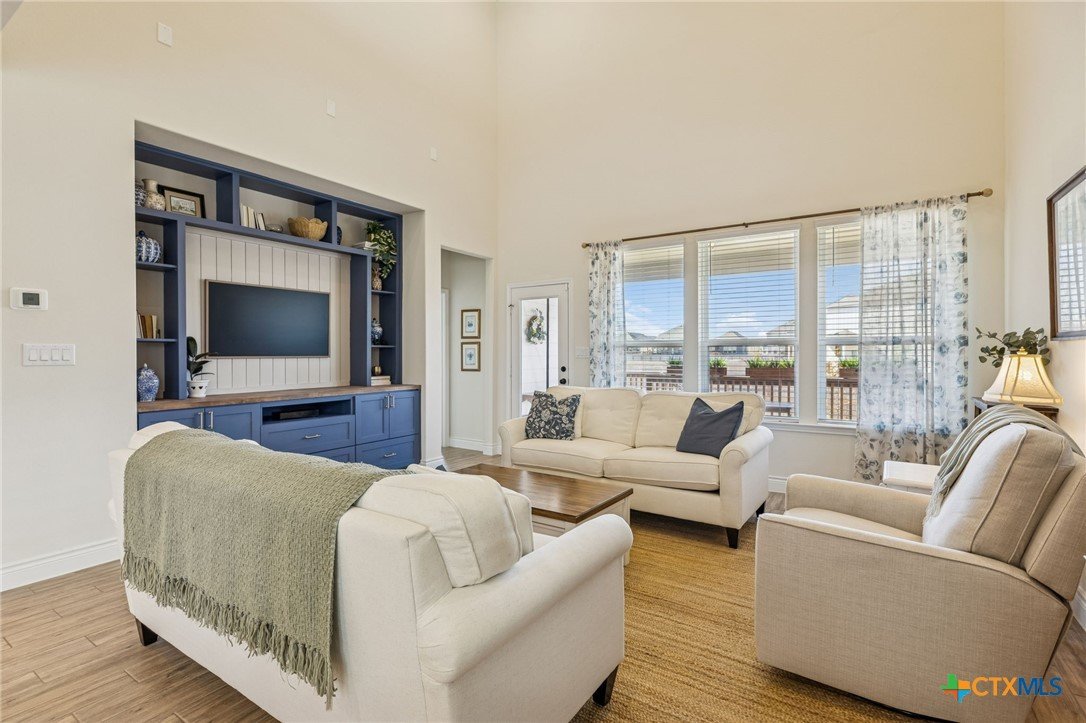 Welcome to 4008 Wild Bloom Rd in Seguin, Texas—where thoughtful upgrades, a standout floor plan, and a fast-growing location come together. Located in a thriving area experiencing continued development, retail expansion, and new amenities, this home offers the advantage of buying into an established community while still enjoying future growth. Just a short walk to the neighborhood pool and park, residents also enjoy convenient access to major roadways, shopping, and dining. Built by Pulte Homes, this highly sought-after Riverdale floor plan includes features that set it apart from nearby new construction. Upon entry, you’re greeted by a dramatic living room with soaring two-story ceilings and a custom built-in bookshelf—an impressive focal point ideal for everyday living and entertaining. The primary suite is located on the main level, offering comfort and privacy, and features a charming bay window that fills the room with natural light. A dedicated home office is also conveniently located downstairs. Upstairs, the spacious layout includes a loft, media room, and three additional bedrooms. Two full bathrooms serve the upper level, including a private ensuite bedroom—ideal for guests or multigenerational living. What truly sets this home apart are the included upgrades that often cost extra or aren’t offered at all: a water softener system, blinds on every window, garage door opener, cabinet hardware and upgraded fixtures throughout, and an automatic sprinkler system in both the front and back yards. While nearby homes may still be under construction, this property offers immediate comfort, style, and value—without the wait or added upgrade costs. 4008 Wild Bloom Rd is a rare opportunity to own a move-in-ready home with premium features, a desirable layout, and a location positioned for continued growth.
