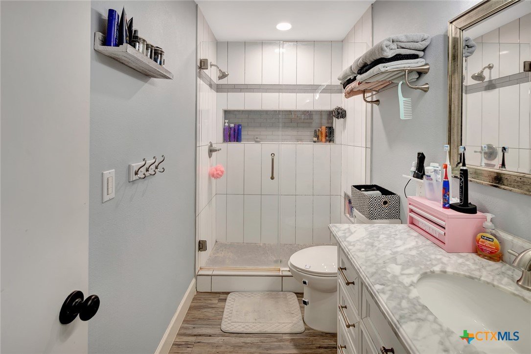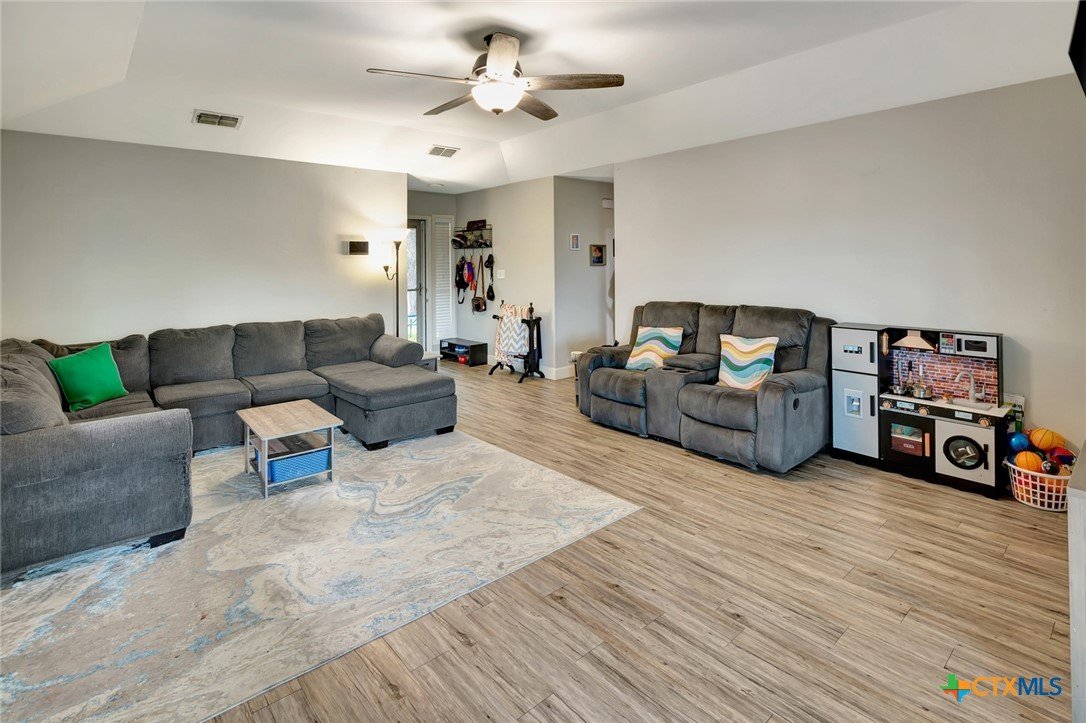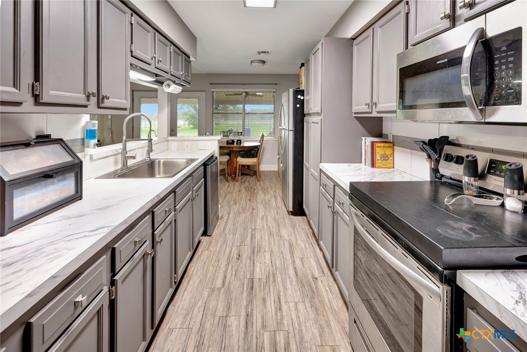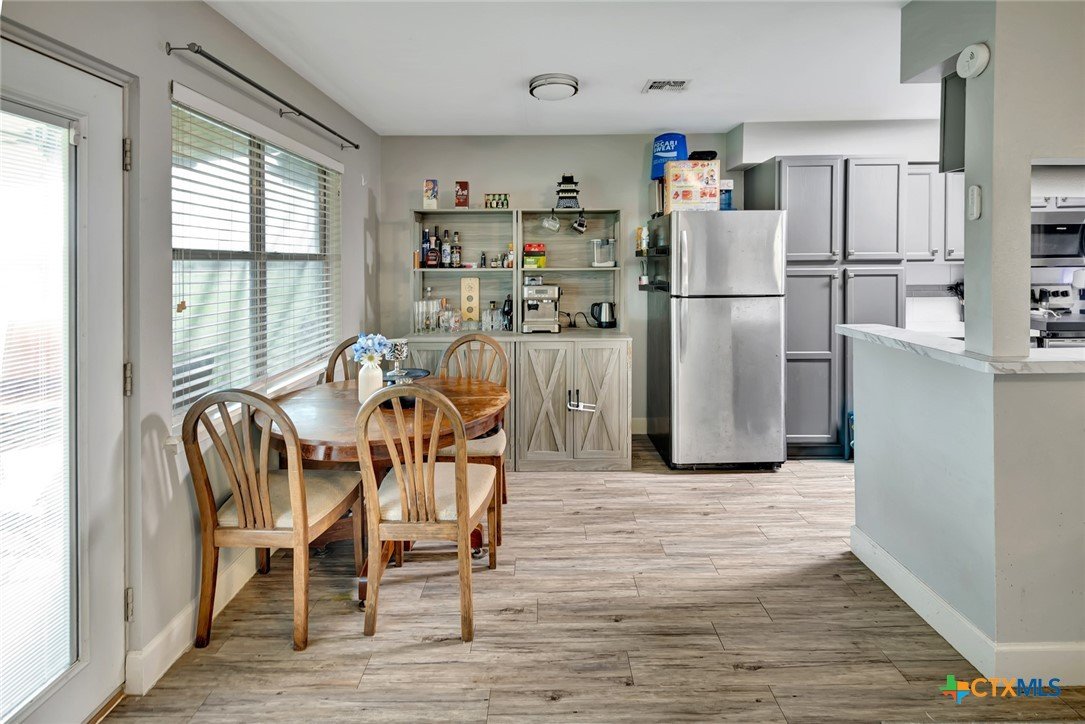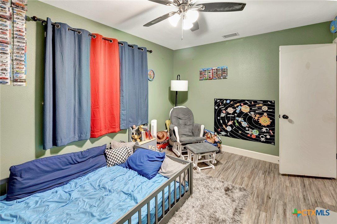 Located on an expansive 0.33-acre corner lot within the Brentwood Manor subdivision, this 3-bedroom, 2-bathroom home features a variety of interior and exterior functional spaces. The kitchen is equipped with grey cabinetry and a large, deep-basin sink, while the main living areas are finished with updated plank-style flooring. Both bathrooms have been refreshed with specific tile work; the primary bathroom includes a fully tiled walk-in shower and a dedicated vanity, while the secondary bathroom features a full-tile wall surround for the bathtub. The exterior of the property includes a covered deck and a large storage shed, offering additional space for outdoor activities and equipment organization. The backyard is fully fenced, encompassing the perimeter of the generous corner lot. Situated in an established Victoria neighborhood, the home is positioned near local sidewalks and provides convenient access to nearby community amenities and services.