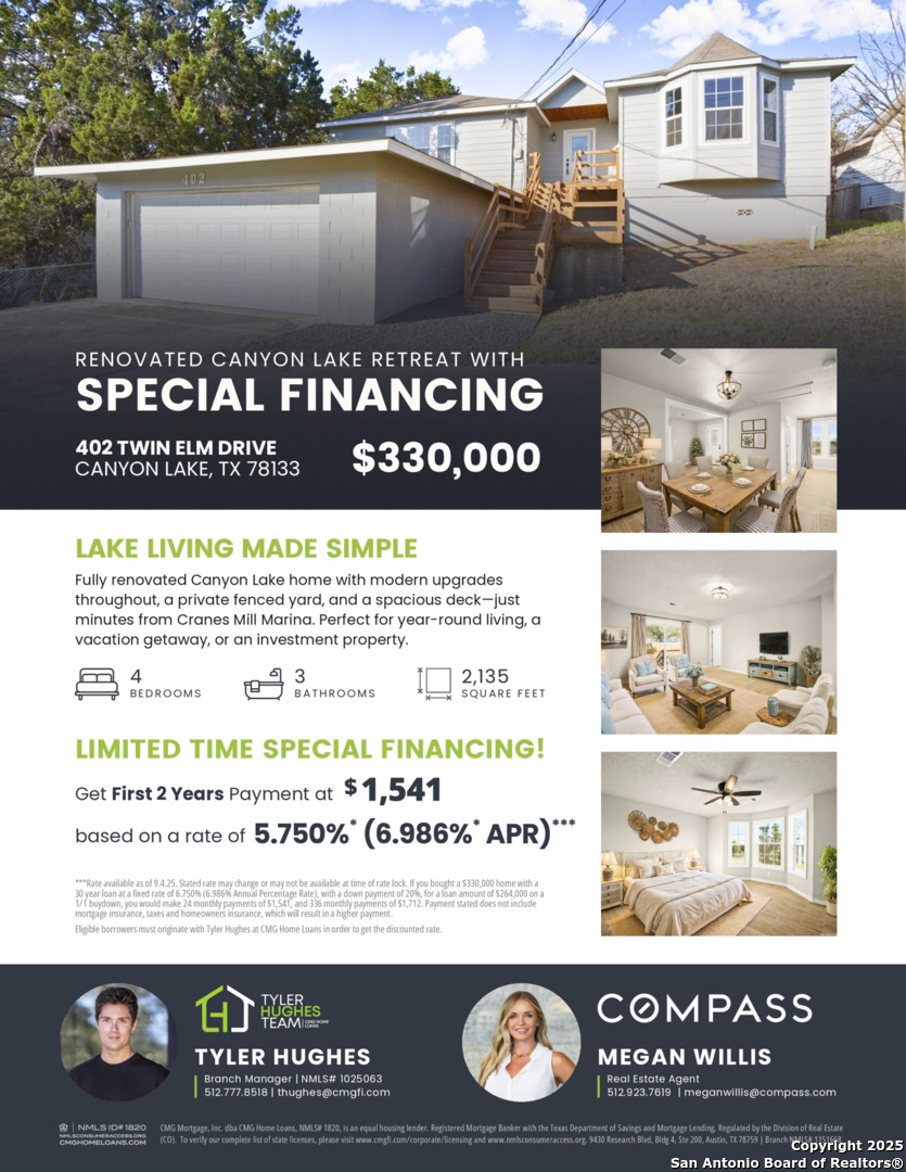 *Ask about a 1:1 Buydown and No Fees on Refinance with Preferred Lender* Exceptional Property in Canyon Lake! This meticulously renovated home offers a rare opportunity, featuring high-end upgrades throughout. Every detail has been thoughtfully addressed, including an entirely new kitchen with stainless steel appliances, HVAC system, heat pump, windows, roof, flooring, hot water heater, garage door opener and tracks, lighting, ceiling fans, doors, trim, fencing, and deck. No expense has been spared! Located just minutes from Cranes Mill Marina, this home is ideally suited for year-round living, a vacation retreat, or an Airbnb investment. The layout offers three spacious living areas, with two bedrooms on the ground level and two additional bedrooms on the second floor. The property also boasts ample parking space for boats, RVs, guests, and includes a storage shed in the backyard. The private, fully fenced yard features a taller privacy fence, a fire ring, and a large back deck, perfect for entertaining or relaxing in seclusion. This property is a must-see to truly appreciate the attention to detail and careful craftsmanship that went into every inch. Schedule your tour today!