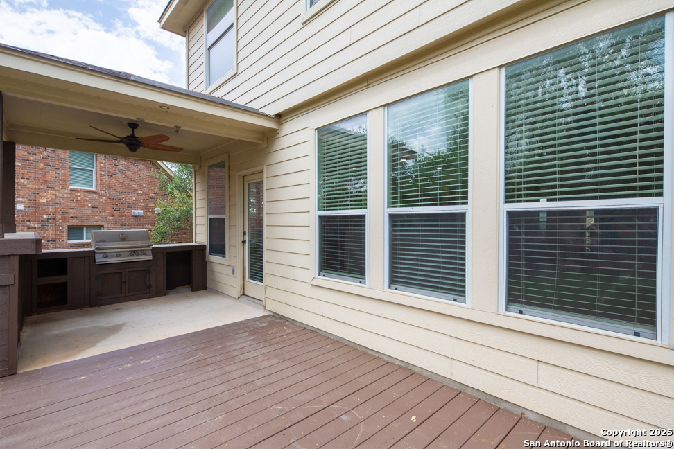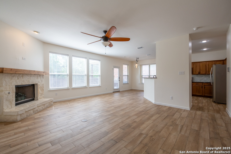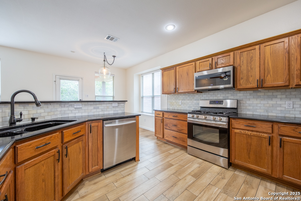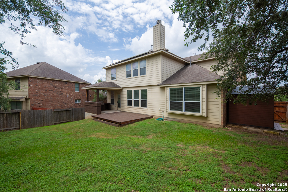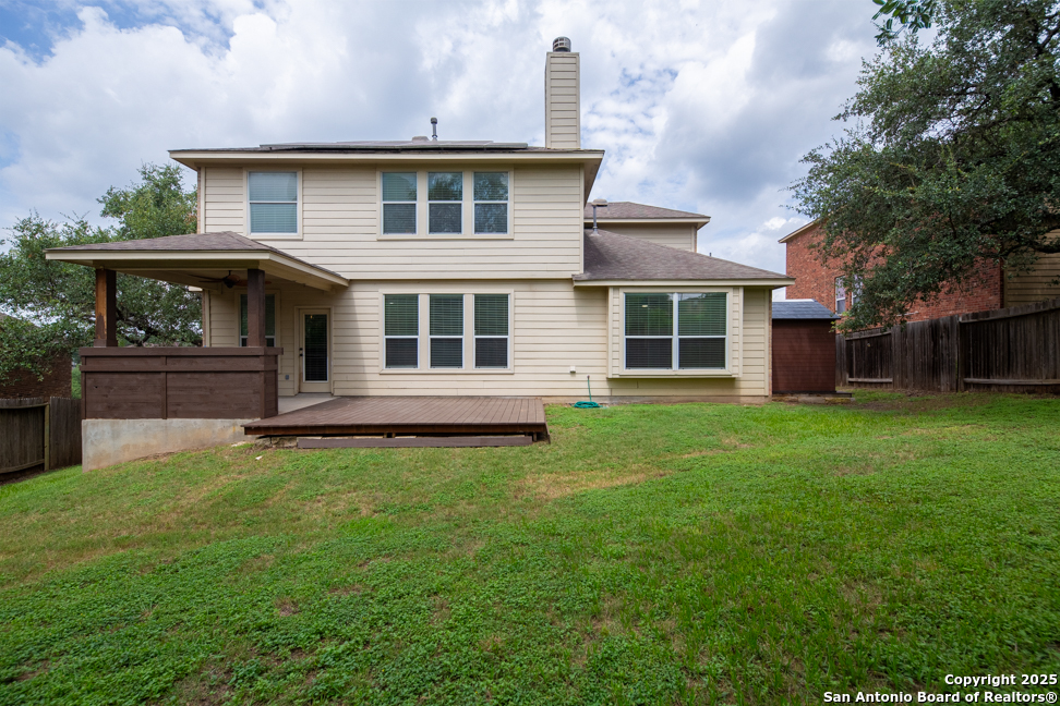 Located in the heart of Stone Oak, this spacious home features an open floor plan, high ceilings, and a cozy fireplace. The first-floor primary suite offers a garden tub, walk-in shower, and large closet. Enjoy a beautifully updated kitchen with gas cooking and custom touches throughout. Upstairs includes a game room, 3 bedrooms, and 2 full baths. The large backyard is perfect for entertaining with a covered patio, deck, gas grill, and shed. Solar panels help reduce energy costs. Walk to top-rated schools, dining, and shopping-no street crossing needed for the elementary! Additional $350 refundable pet deposit.