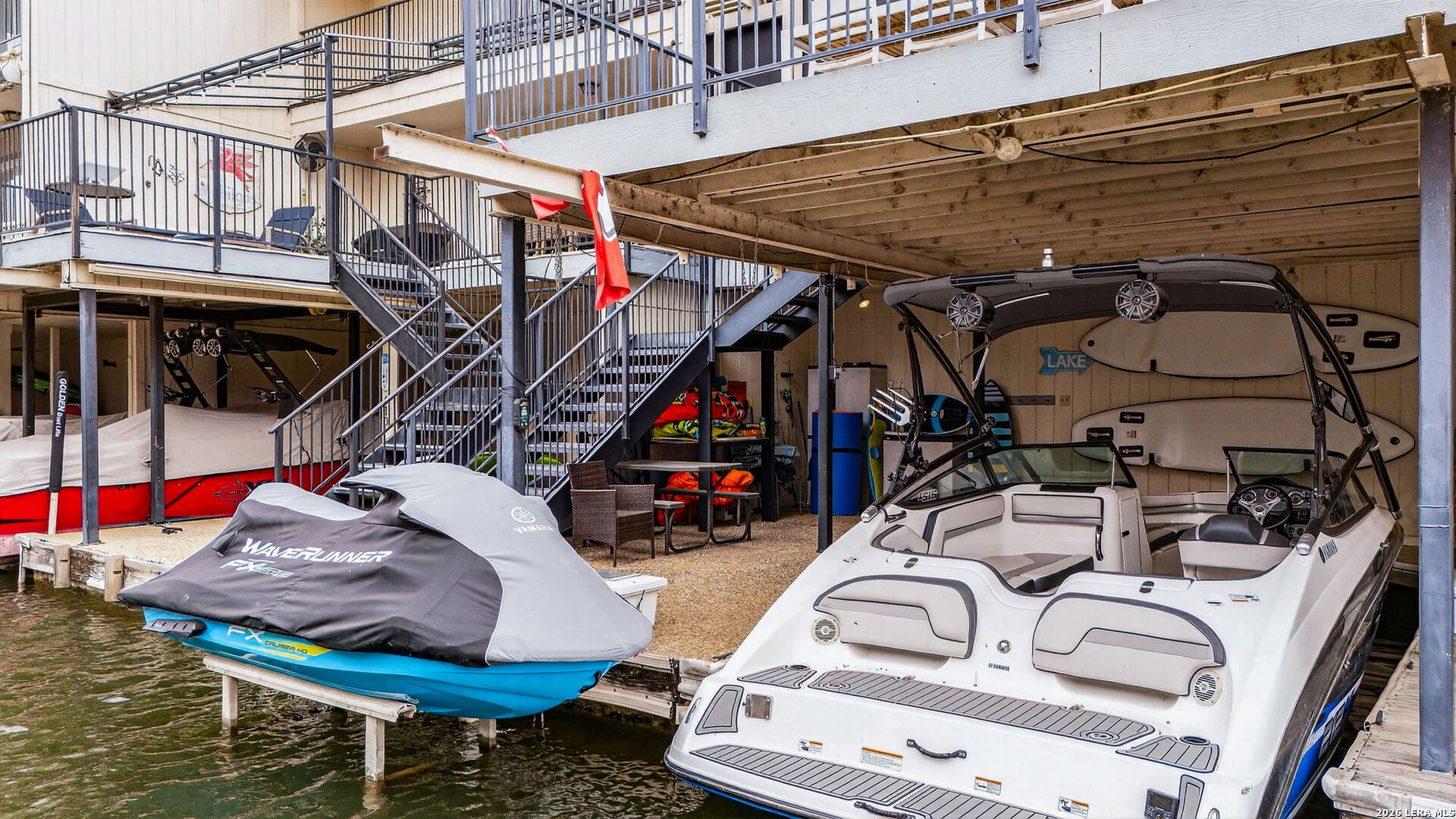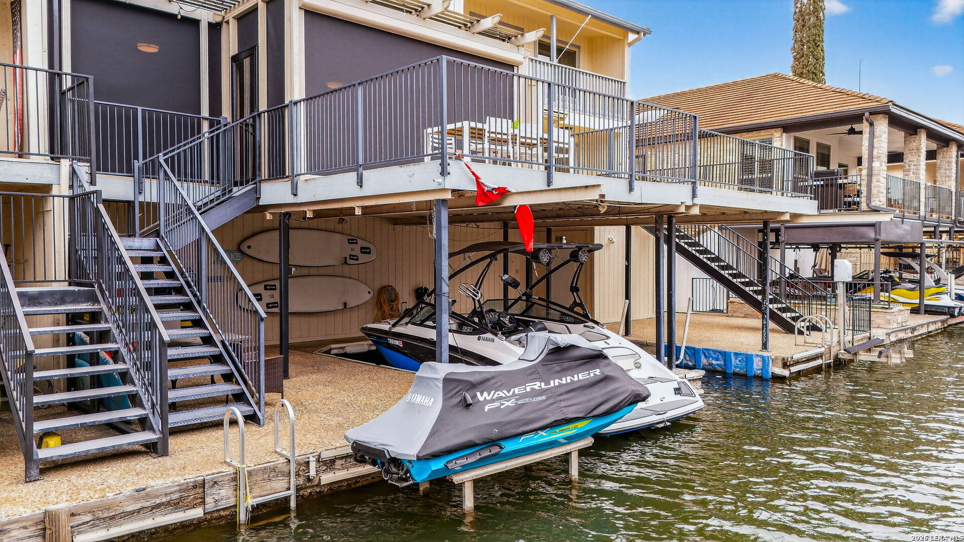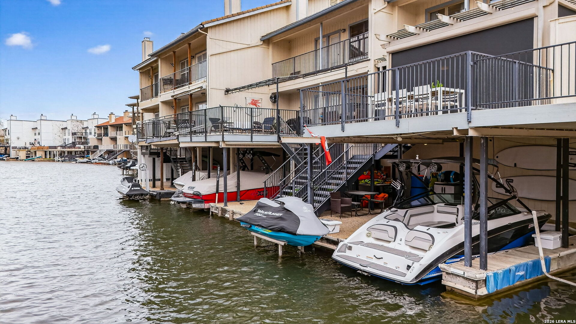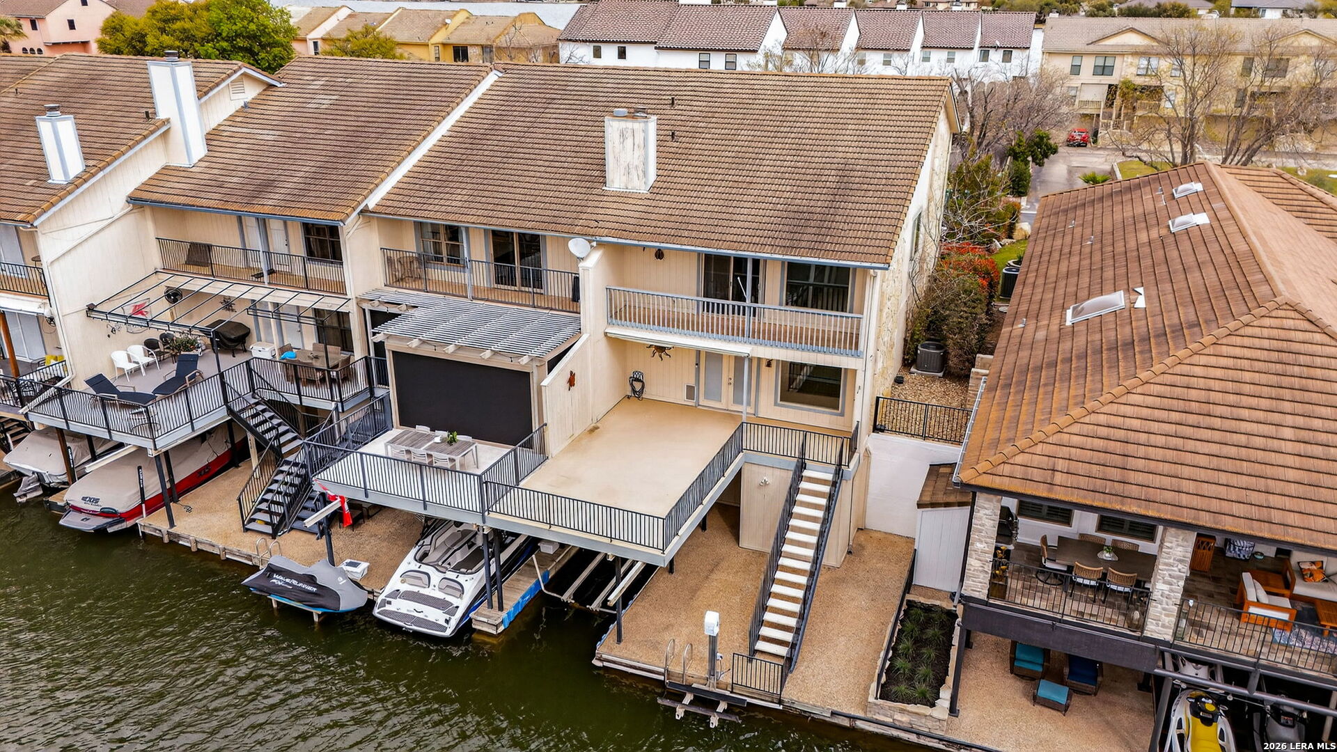 Experience the best of lakefront living in this completely updated waterfront townhouse on Lake LBJ. This beautifully appointed home features three spacious bedrooms, each with its own private ensuite bathroom, offering comfort and privacy for family and guests alike. The primary suite is a true retreat, complete with a private balcony overlooking the water-perfect for morning coffee or evening sunsets. The open and inviting floor plan includes a well-designed eat-in kitchen with quartz countertops, premium KitchenAid appliances, and a generous breakfast area. The adjoining family room provides a comfortable gathering space with hard surface flooring throughout and power shades for added convenience and ambiance. Modern upgrades include two air conditioning units with programmable Nest thermostats, ensuring year-round comfort and efficiency. A convenient half bath adds to the home's thoughtful layout. Step outside to a large outdoor patio designed for entertaining, featuring a power sunshade and space to relax while watching TV-enhanced by a portable outdoor air conditioning unit for those warm Texas days. At the water's edge, enjoy direct access to the lake with a hydraulic boat lift and a separate hydraulic lift for a personal watercraft. Both the boat and watercraft are available for purchase, making it easy to start enjoying lake life immediately. This turnkey property is offered fully furnished, including all furniture and TVs (excluding the primary bedroom mattress), making it ready for immediate enjoyment or rental potential. The two-car garage offers flexibility, serving as a traditional garage or easily converting into an additional entertaining space or game room. Don't miss this exceptional opportunity to own a fully furnished, move-in-ready waterfront retreat on Lake LBJ.