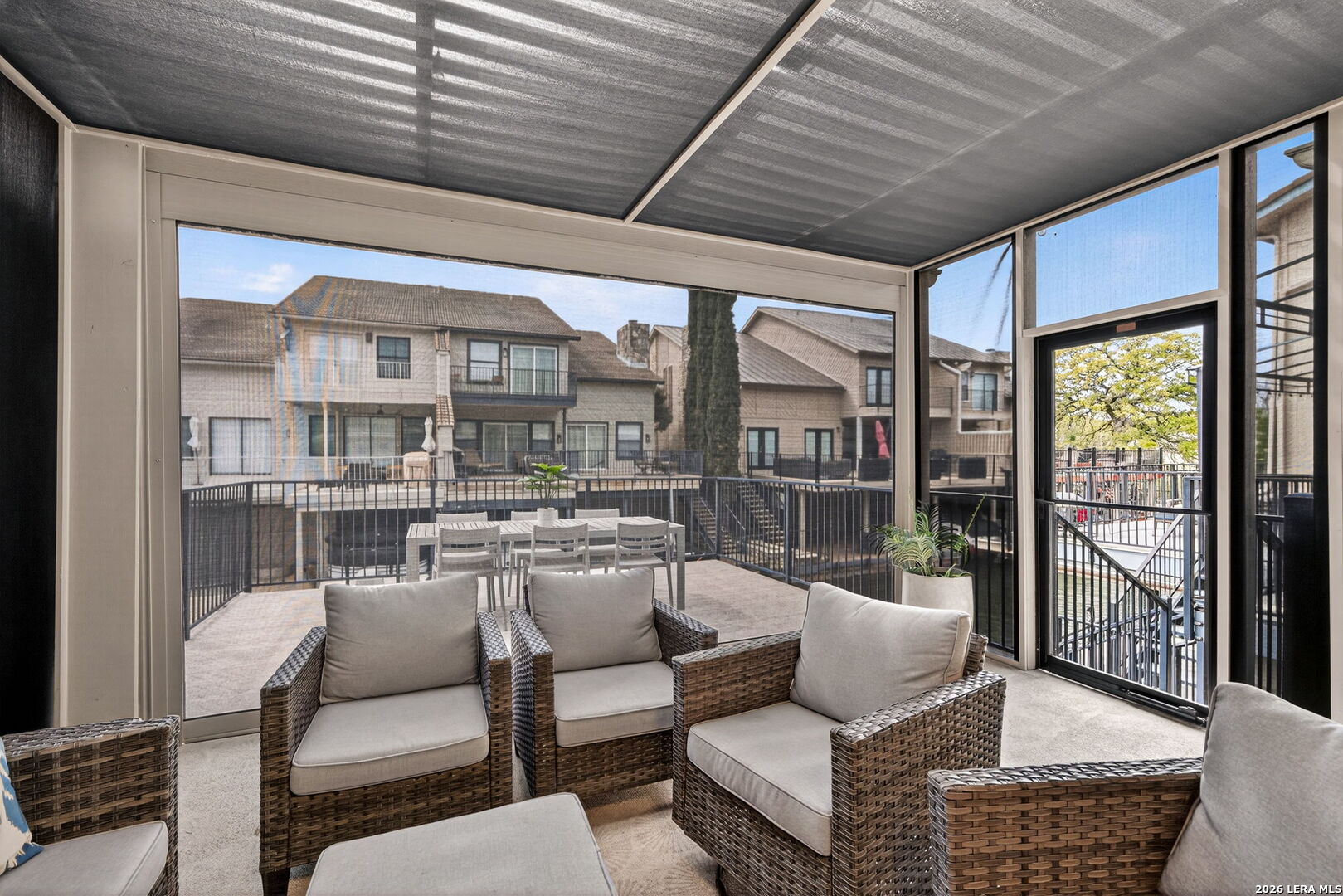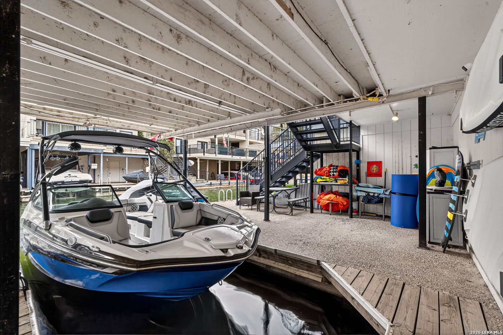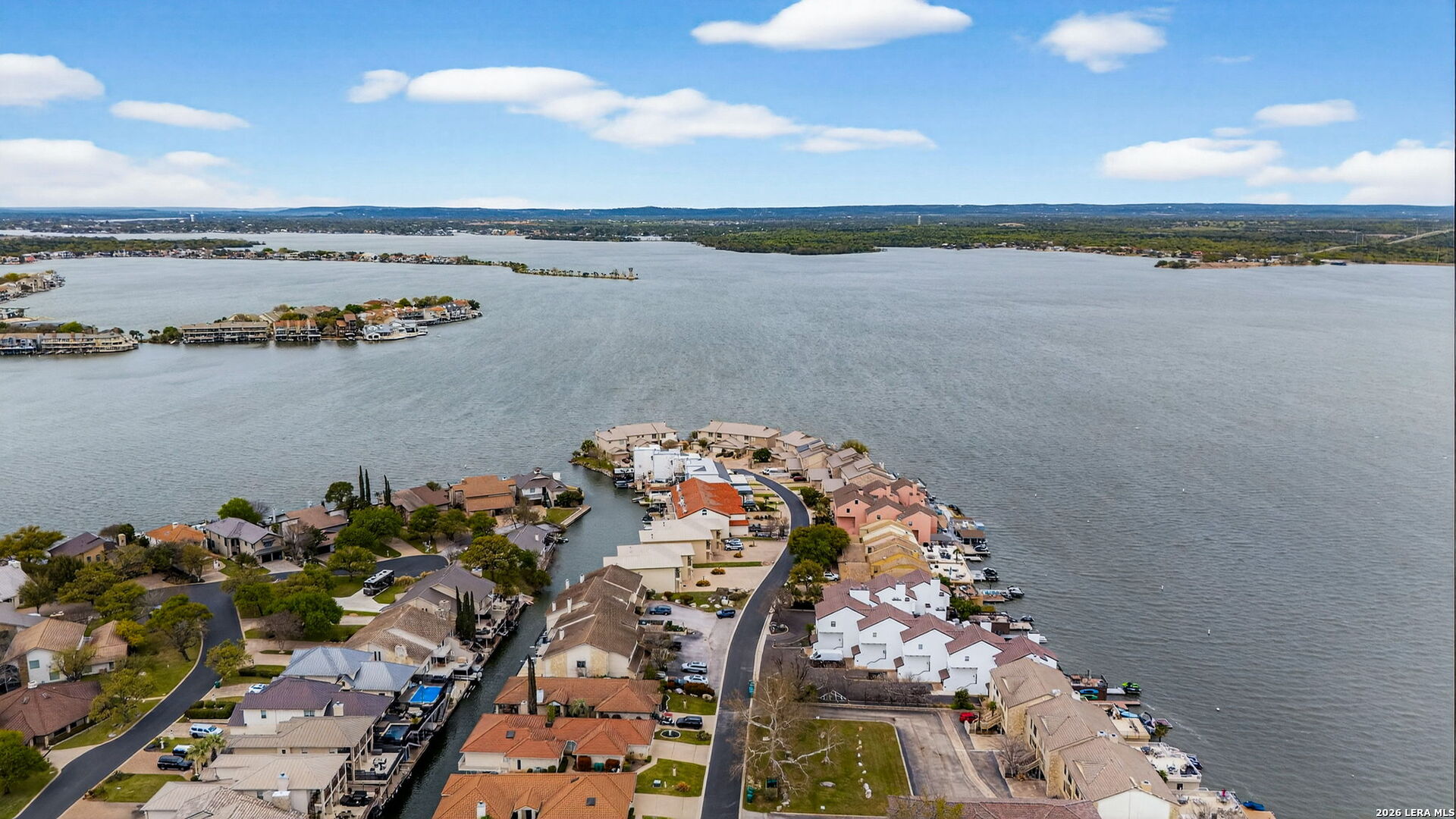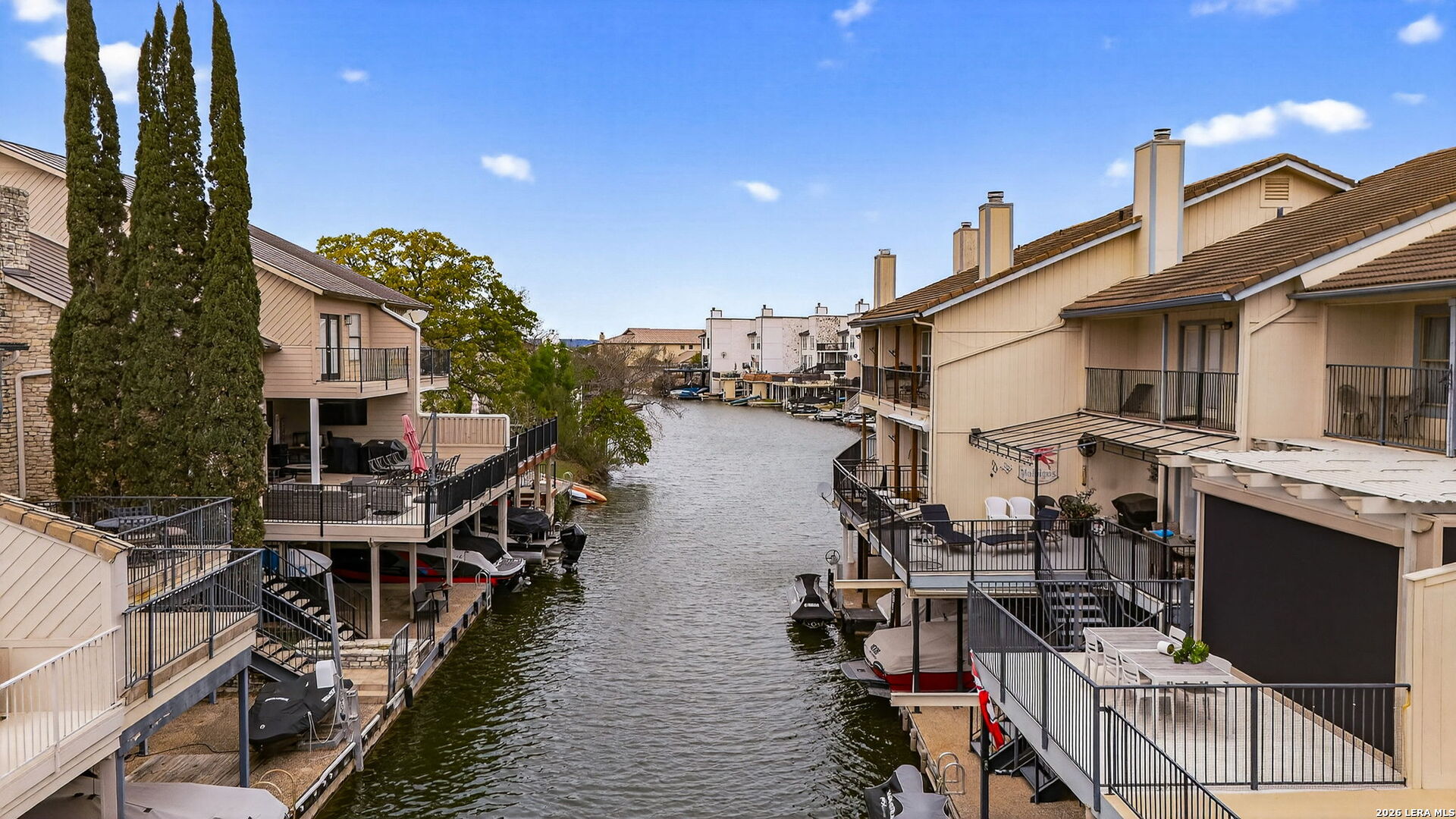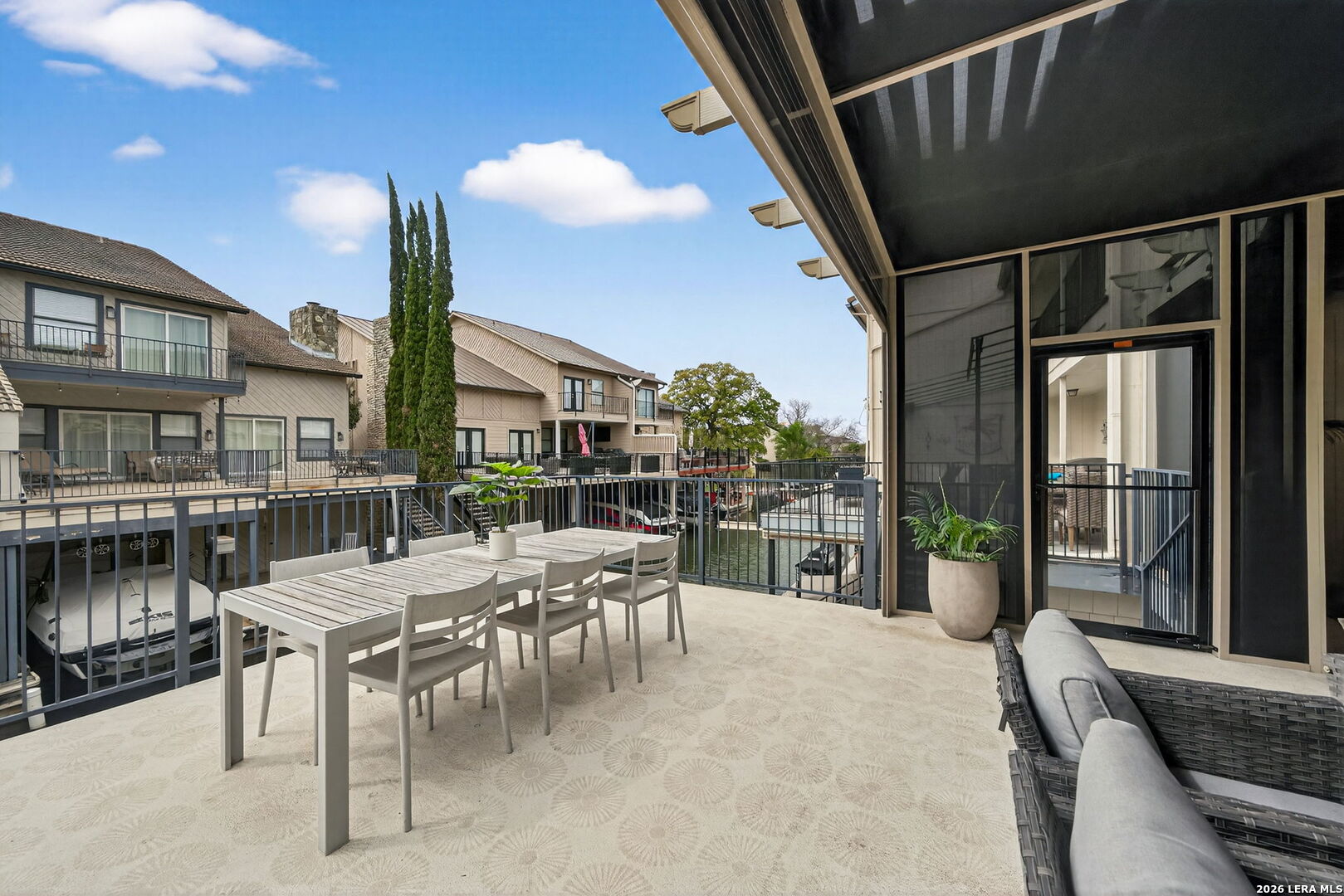 Experience the best of lakefront living in this completely updated waterfront townhouse on Lake LBJ. This beautifully appointed home features three spacious bedrooms, each with its own private ensuite bathroom, offering comfort and privacy for family and guests alike. The primary suite is a true retreat, complete with a private balcony overlooking the water-perfect for morning coffee or evening sunsets. The open and inviting floor plan includes a well-designed eat-in kitchen with quartz countertops, premium KitchenAid appliances, and a generous breakfast area. The adjoining family room provides a comfortable gathering space with hard surface flooring throughout and power shades for added convenience and ambiance. Modern upgrades include two air conditioning units with programmable Nest thermostats, ensuring year-round comfort and efficiency. A convenient half bath adds to the home's thoughtful layout. Step outside to a large outdoor patio designed for entertaining, featuring a power sunshade and space to relax while watching TV-enhanced by a portable outdoor air conditioning unit for those warm Texas days. At the water's edge, enjoy direct access to the lake with a hydraulic boat lift and a separate hydraulic lift for a personal watercraft. Both the boat and watercraft are available for purchase, making it easy to start enjoying lake life immediately. This turnkey property is offered fully furnished, including all furniture and TVs (excluding the primary bedroom mattress), making it ready for immediate enjoyment or rental potential. The two-car garage offers flexibility, serving as a traditional garage or easily converting into an additional entertaining space or game room. Don't miss this exceptional opportunity to own a fully furnished, move-in-ready waterfront retreat on Lake LBJ.