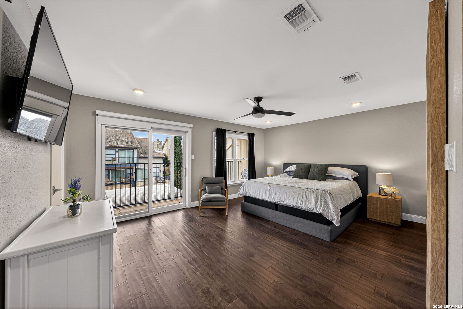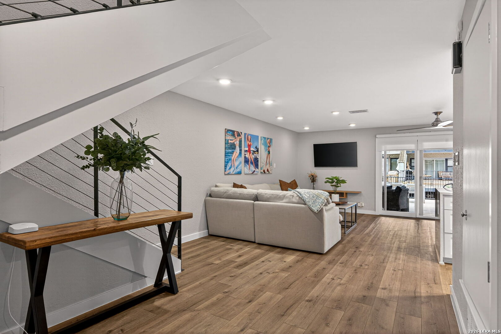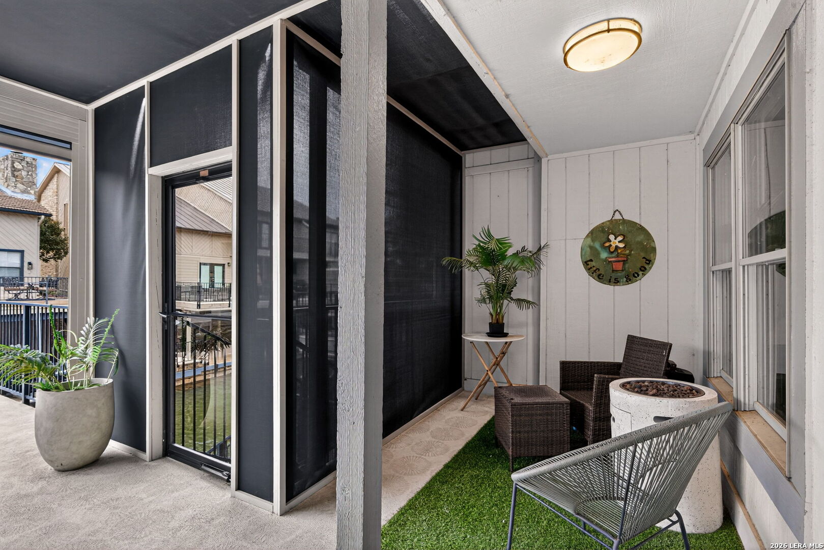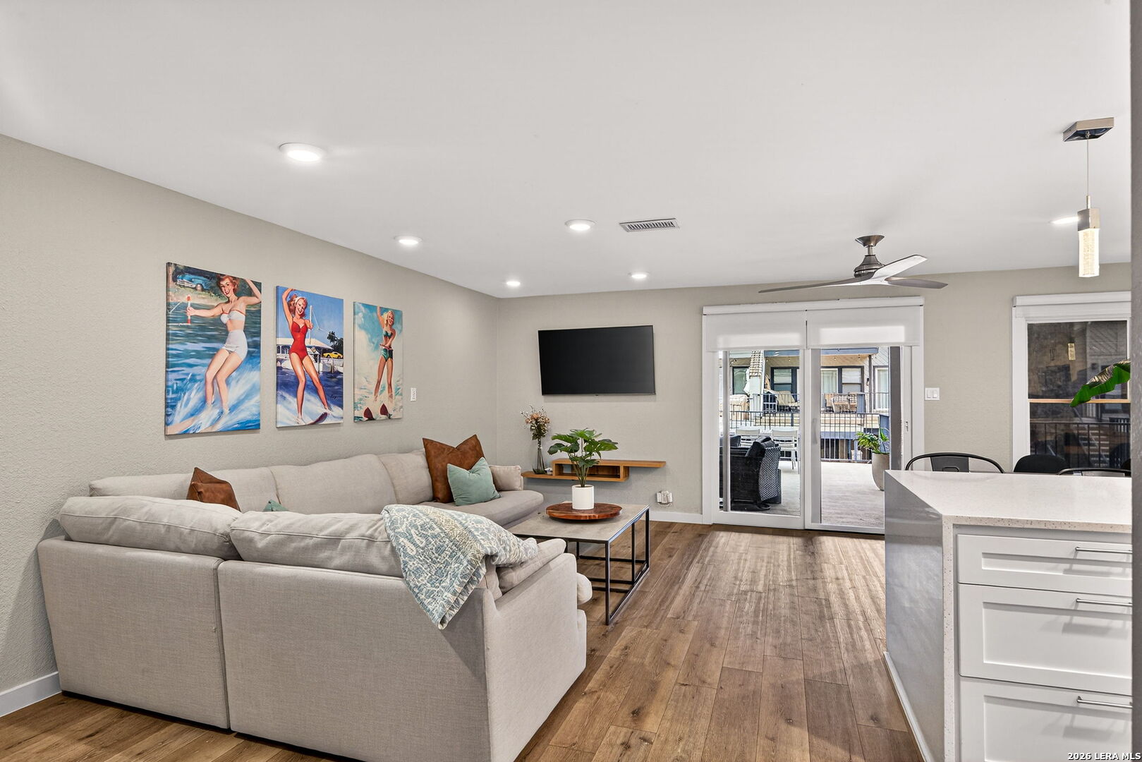 Experience the best of lakefront living in this completely updated waterfront townhouse on Lake LBJ. This beautifully appointed home features three spacious bedrooms, each with its own private ensuite bathroom, offering comfort and privacy for family and guests alike. The primary suite is a true retreat, complete with a private balcony overlooking the water-perfect for morning coffee or evening sunsets. The open and inviting floor plan includes a well-designed eat-in kitchen with quartz countertops, premium KitchenAid appliances, and a generous breakfast area. The adjoining family room provides a comfortable gathering space with hard surface flooring throughout and power shades for added convenience and ambiance. Modern upgrades include two air conditioning units with programmable Nest thermostats, ensuring year-round comfort and efficiency. A convenient half bath adds to the home's thoughtful layout. Step outside to a large outdoor patio designed for entertaining, featuring a power sunshade and space to relax while watching TV-enhanced by a portable outdoor air conditioning unit for those warm Texas days. At the water's edge, enjoy direct access to the lake with a hydraulic boat lift and a separate hydraulic lift for a personal watercraft. Both the boat and watercraft are available for purchase, making it easy to start enjoying lake life immediately. This turnkey property is offered fully furnished, including all furniture and TVs (excluding the primary bedroom mattress), making it ready for immediate enjoyment or rental potential. The two-car garage offers flexibility, serving as a traditional garage or easily converting into an additional entertaining space or game room. Don't miss this exceptional opportunity to own a fully furnished, move-in-ready waterfront retreat on Lake LBJ.