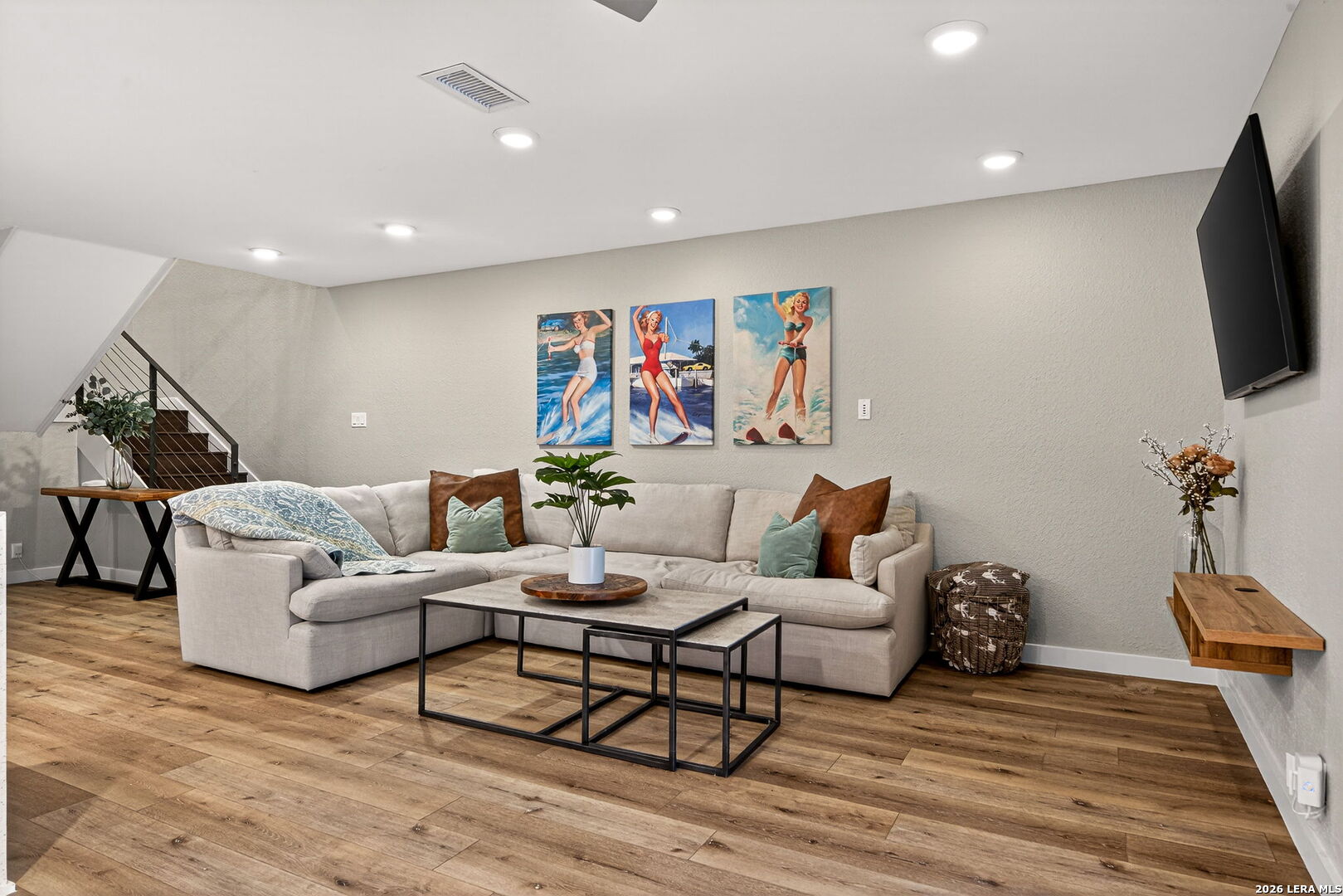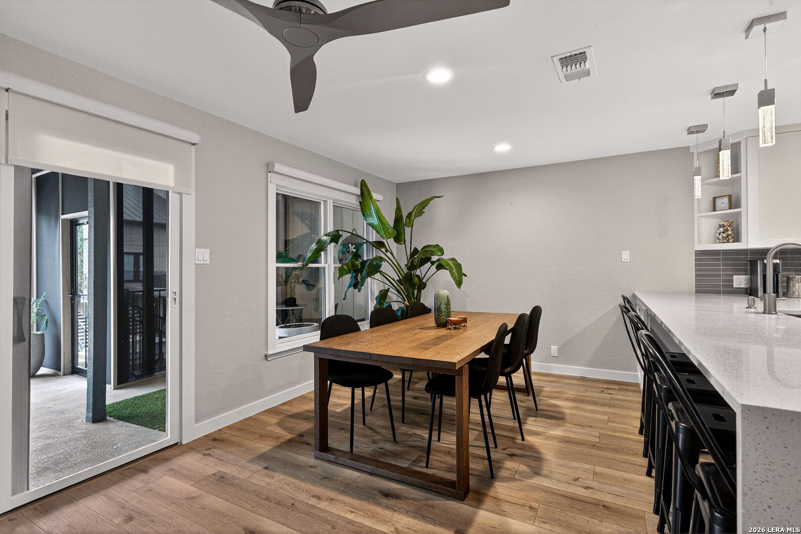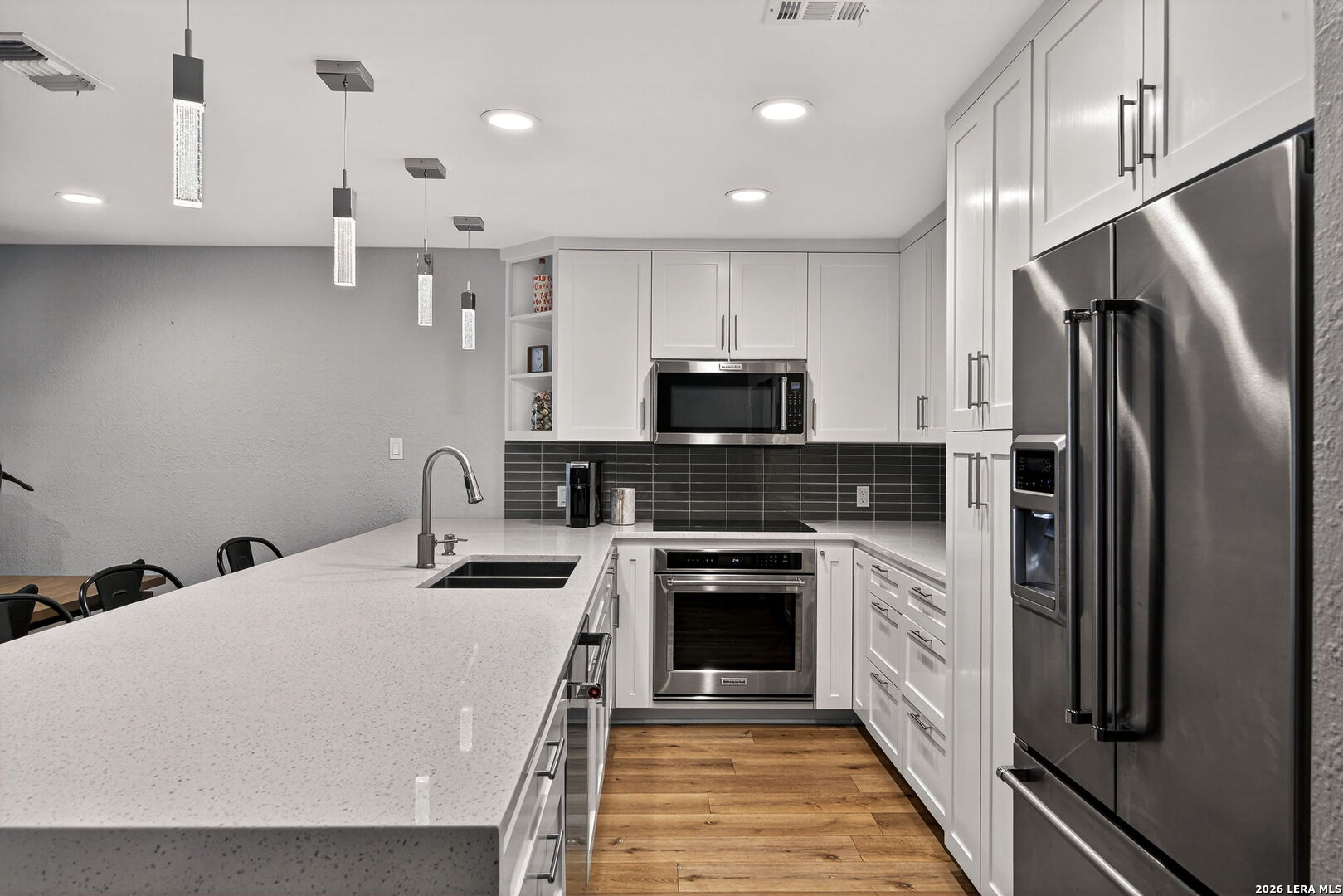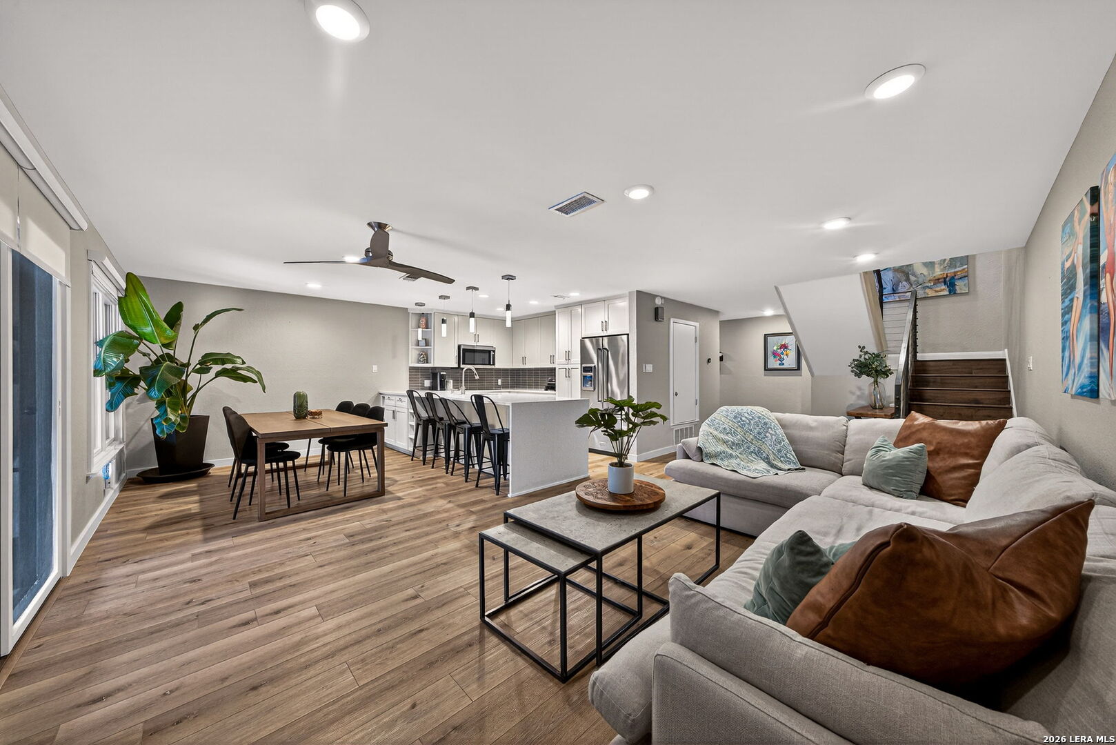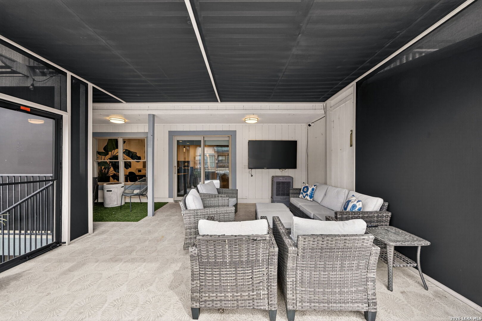 Experience the best of lakefront living in this completely updated waterfront townhouse on Lake LBJ. This beautifully appointed home features three spacious bedrooms, each with its own private ensuite bathroom, offering comfort and privacy for family and guests alike. The primary suite is a true retreat, complete with a private balcony overlooking the water-perfect for morning coffee or evening sunsets. The open and inviting floor plan includes a well-designed eat-in kitchen with quartz countertops, premium KitchenAid appliances, and a generous breakfast area. The adjoining family room provides a comfortable gathering space with hard surface flooring throughout and power shades for added convenience and ambiance. Modern upgrades include two air conditioning units with programmable Nest thermostats, ensuring year-round comfort and efficiency. A convenient half bath adds to the home's thoughtful layout. Step outside to a large outdoor patio designed for entertaining, featuring a power sunshade and space to relax while watching TV-enhanced by a portable outdoor air conditioning unit for those warm Texas days. At the water's edge, enjoy direct access to the lake with a hydraulic boat lift and a separate hydraulic lift for a personal watercraft. Both the boat and watercraft are available for purchase, making it easy to start enjoying lake life immediately. This turnkey property is offered fully furnished, including all furniture and TVs (excluding the primary bedroom mattress), making it ready for immediate enjoyment or rental potential. The two-car garage offers flexibility, serving as a traditional garage or easily converting into an additional entertaining space or game room. Don't miss this exceptional opportunity to own a fully furnished, move-in-ready waterfront retreat on Lake LBJ.