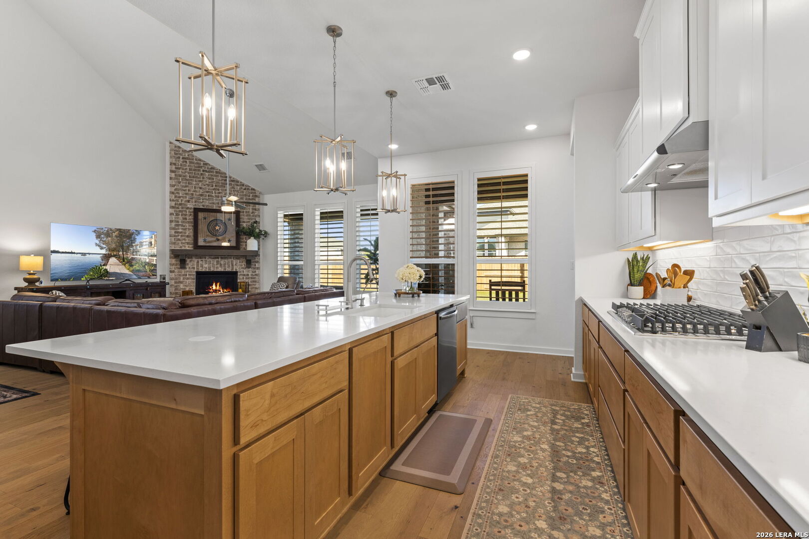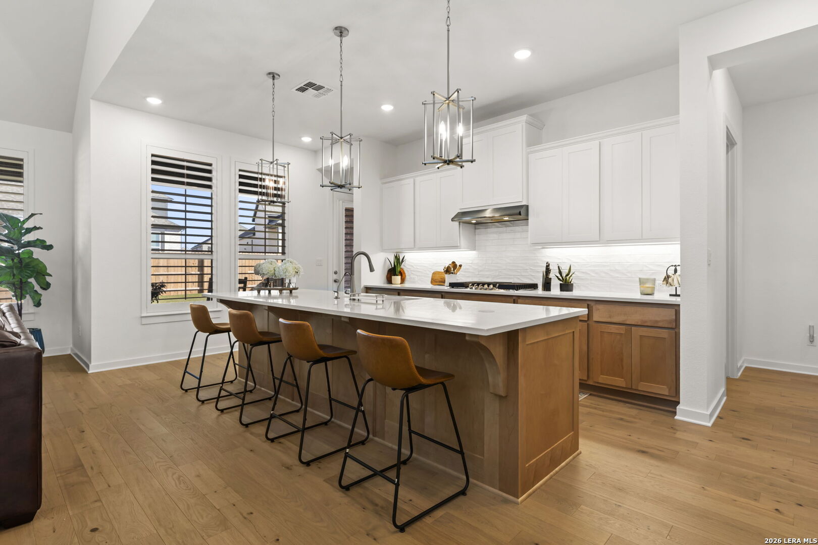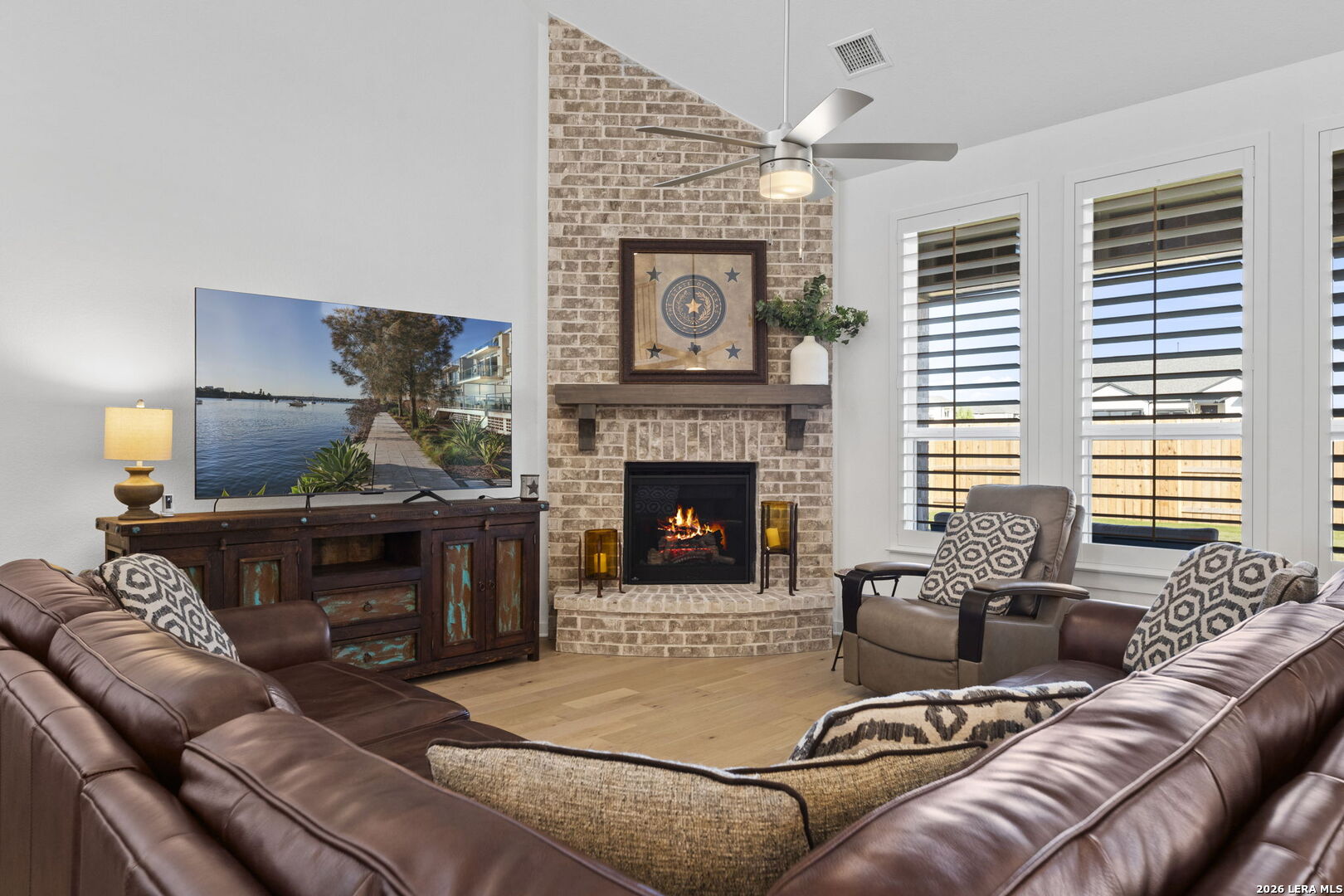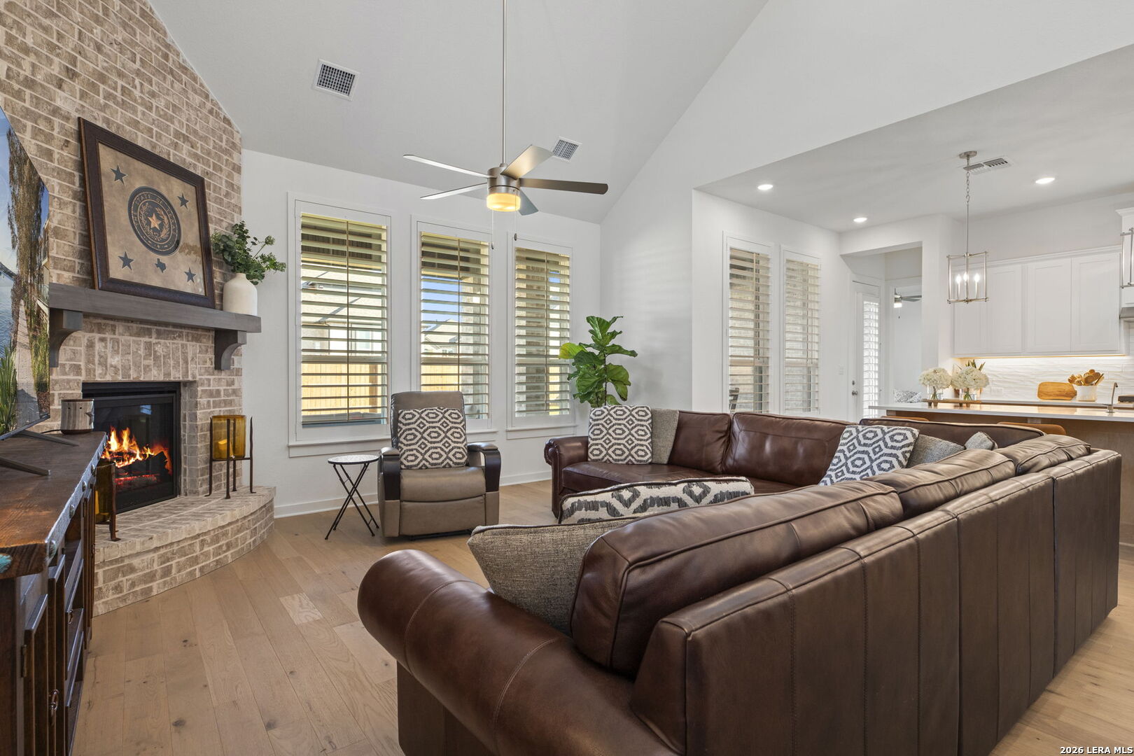 6 Creeks at Waterridge. Come for the smalltown feel with the big city convenient location and resort like amenities, and you'll want to stay for the serene feeling this home gives at golden hour when you watch the last drop of sun set, and see the deer wander through as you relax on the porch, soaking in the picturesque unobstructed greenbelt view. This luxurious Highland home not only makes a statement, it exudes a sense of comfort and tranquility with its warm wooden floors, floor to ceiling brick fireplace and room for every part of your lifestyle. This type of luxury is functional and elegant all at once with its open flow concept, soaring ceilings, and a grand foyer greeted by a rounded staircase. The gourmet kitchen would be any chef's delight with a quartz countertop abundant island, gas cooking, and high-end built-in appliances flocked by Kent Moore cabinets and a coffee bar. The owners have added even more style, function and value by adding plantation shutters throughout and an owned water softener system. This stunning 5-bedroom, 4.5-bath offers 3,562 sq ft of thoughtfully designed living space with 3 ensuites and a 3-car garage. A dedicated office/study, a media/theatre room, and a guest suite round out the main level. On the 2nd floor you'll find 3 bedrooms- 1 with an ensuite and 1 with a lifestyle room off of it for a variety of options & interests, as well as a game room that overlooks the main floor, making this home ideal for entertaining and a multitude of activities. The primary suite features a bay window and an upgraded spa-inspired bath with a freestanding tub and tile surround that feels like a personal retreat. You'll find the oversized covered back patio a place to unwind or entertain outdoors with plenty of room to dine al fresco then sit by an outdoor fire. This home was built to elevate and cater to every part of one's lifestyle. The owners are even negotiable to let any or all of the furnishings convey with the home. The location is unbeatable- small town but near Austin and all its entertainment and industry growth. Don't miss out, schedule your home tour today!