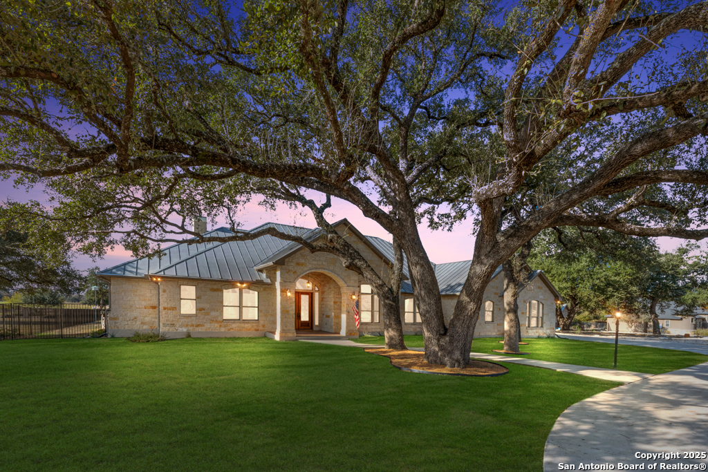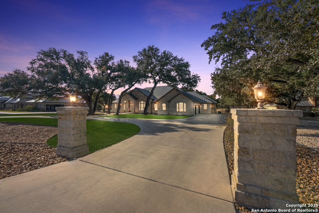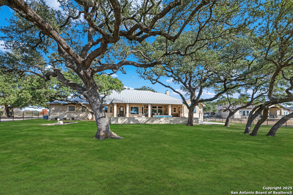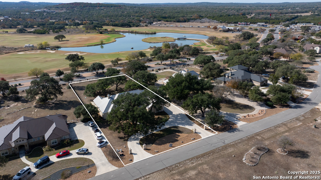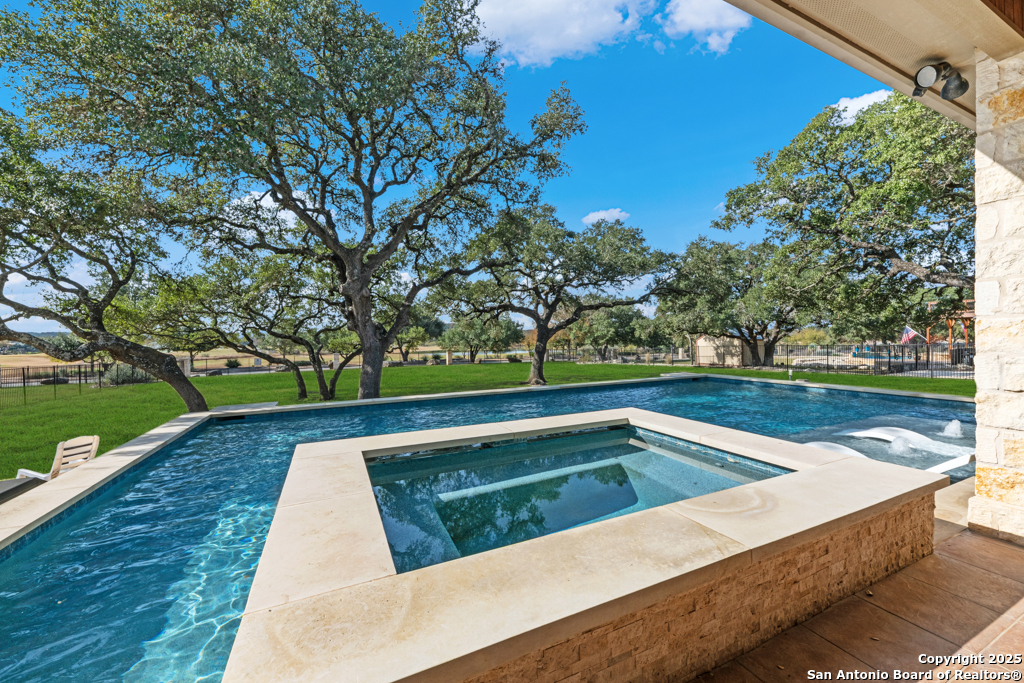 Stunning one story estate located in the gated community of The Waters of River Crossing. This exceptional 4,600+ sq. ft. home offers breathtaking panoramic backyard views of holes 1 & 2 and the pond of River Crossing Golf Course. Thoughtfully designed for entertaining and everyday luxury, this residence features 4 bedrooms, 3.5 baths, with the 4 bedroom being versatile as a secondary suite ideal for a study, guest space, or flex room. The chef's kitchen is a true showstopper, complete with custom hickory cabinetry, double wall ovens, warming drawer, pot filler, built-in ice maker, prep kitchen, two walk-in pantries, oversized island with veggie sink, instant hot water, slide-out cutting boards, pull-out spice racks, and abundant storage. The private primary suite offers exterior access, tray ceilings with accent lighting, and a beautiful bay window. The spa-like primary bath features dual vanities, a soaking Jacuzzi tub, and an expansive walk-through shower. The custom walk-in closet includes built-ins and a full-length mirror. The living room showcases wood beam ceilings, a gas-start stone fireplace with wood mantle, custom built-ins, and expansive windows framing views of mature oaks and the golf course. A wet bar seamlessly serves both the living room and patio, making it perfect for indoor and outdoor entertaining. Step outside to a backyard designed for resort-style living, featuring a high-end custom pool with spa that is less than two years old, perfectly positioned to take in the serene golf course and water views. Exceptional setting for both relaxation and entertaining. Bedrooms 3 and 4 feature tray ceilings, private vanities, and walk-in closets. The game room boasts vaulted ceilings, wood beams, and exterior access. Additional highlights include surround sound inside and out, central vacuum, circular drive, and a spacious laundry room with cabinetry, sink, built-in ironing board, and convenient access from the primary suite. The oversized 3-car garage includes cabinetry, counter space, room for a freezer, plus an additional workshop with exterior access. Exceptional quality construction, remarkable features, and an unbeatable setting-this home is truly a must-see to fully appreciate. Easy Access to 281, school, restaurants and shopping