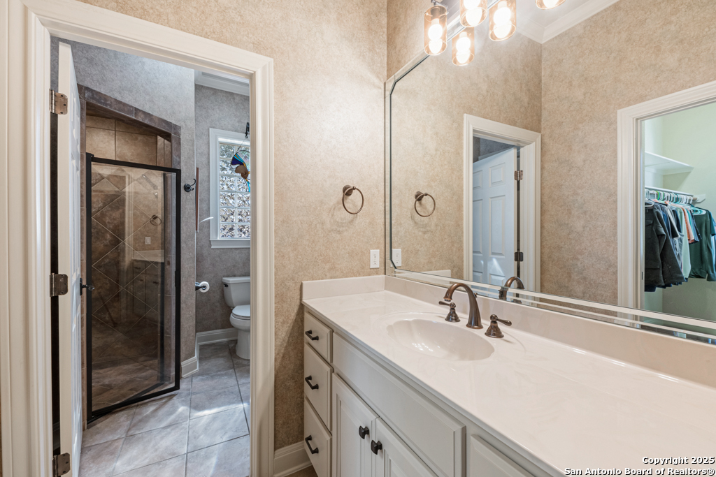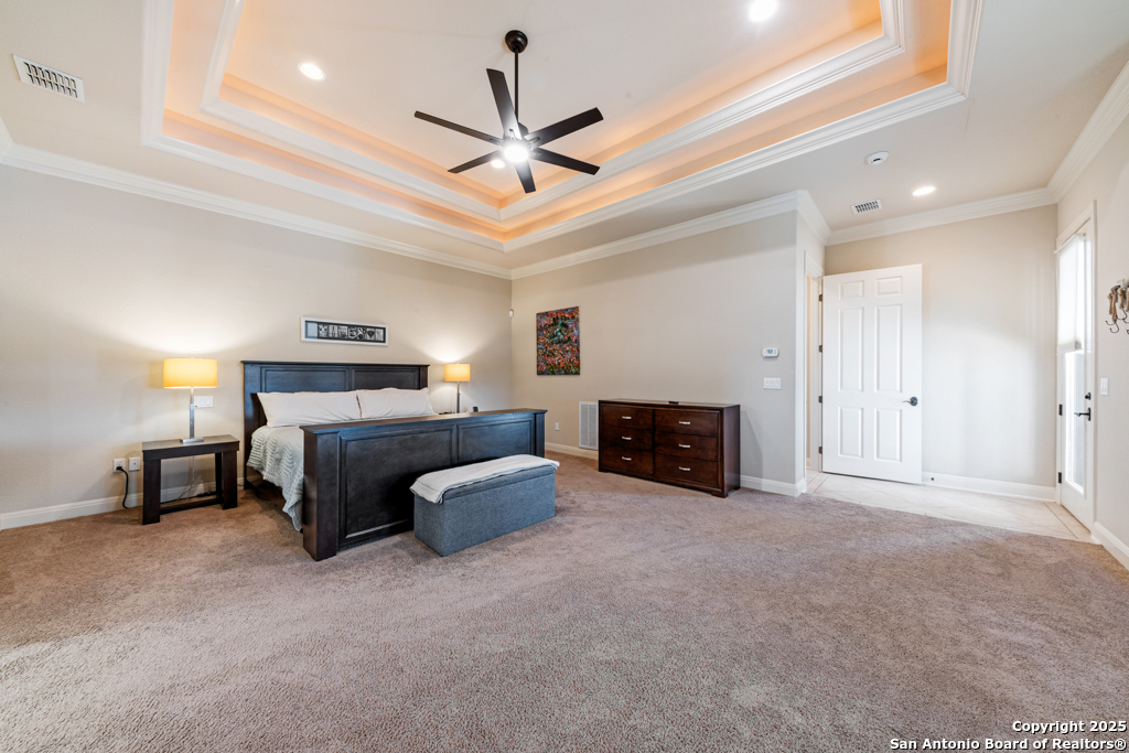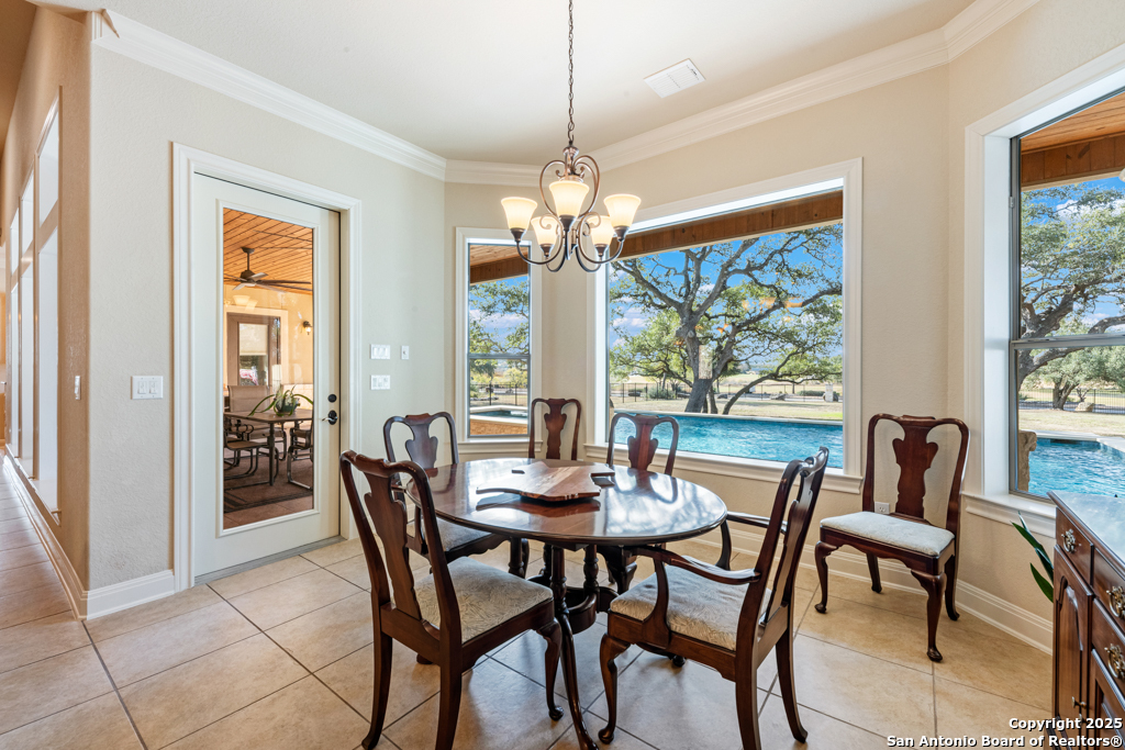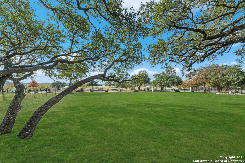 Stunning one story estate located in the gated community of The Waters of River Crossing. This exceptional 4,600+ sq. ft. home offers breathtaking panoramic backyard views of holes 1 & 2 and the pond of River Crossing Golf Course. Thoughtfully designed for entertaining and everyday luxury, this residence features 4 bedrooms, 3.5 baths, with the 4 bedroom being versatile as a secondary suite ideal for a study, guest space, or flex room. The chef's kitchen is a true showstopper, complete with custom hickory cabinetry, double wall ovens, warming drawer, pot filler, built-in ice maker, prep kitchen, two walk-in pantries, oversized island with veggie sink, instant hot water, slide-out cutting boards, pull-out spice racks, and abundant storage. The private primary suite offers exterior access, tray ceilings with accent lighting, and a beautiful bay window. The spa-like primary bath features dual vanities, a soaking Jacuzzi tub, and an expansive walk-through shower. The custom walk-in closet includes built-ins and a full-length mirror. The living room showcases wood beam ceilings, a gas-start stone fireplace with wood mantle, custom built-ins, and expansive windows framing views of mature oaks and the golf course. A wet bar seamlessly serves both the living room and patio, making it perfect for indoor and outdoor entertaining. Step outside to a backyard designed for resort-style living, featuring a high-end custom pool with spa that is less than two years old, perfectly positioned to take in the serene golf course and water views. Exceptional setting for both relaxation and entertaining. Bedrooms 3 and 4 feature tray ceilings, private vanities, and walk-in closets. The game room boasts vaulted ceilings, wood beams, and exterior access. Additional highlights include surround sound inside and out, central vacuum, circular drive, and a spacious laundry room with cabinetry, sink, built-in ironing board, and convenient access from the primary suite. The oversized 3-car garage includes cabinetry, counter space, room for a freezer, plus an additional workshop with exterior access. Exceptional quality construction, remarkable features, and an unbeatable setting-this home is truly a must-see to fully appreciate. Easy Access to 281, school, restaurants and shopping