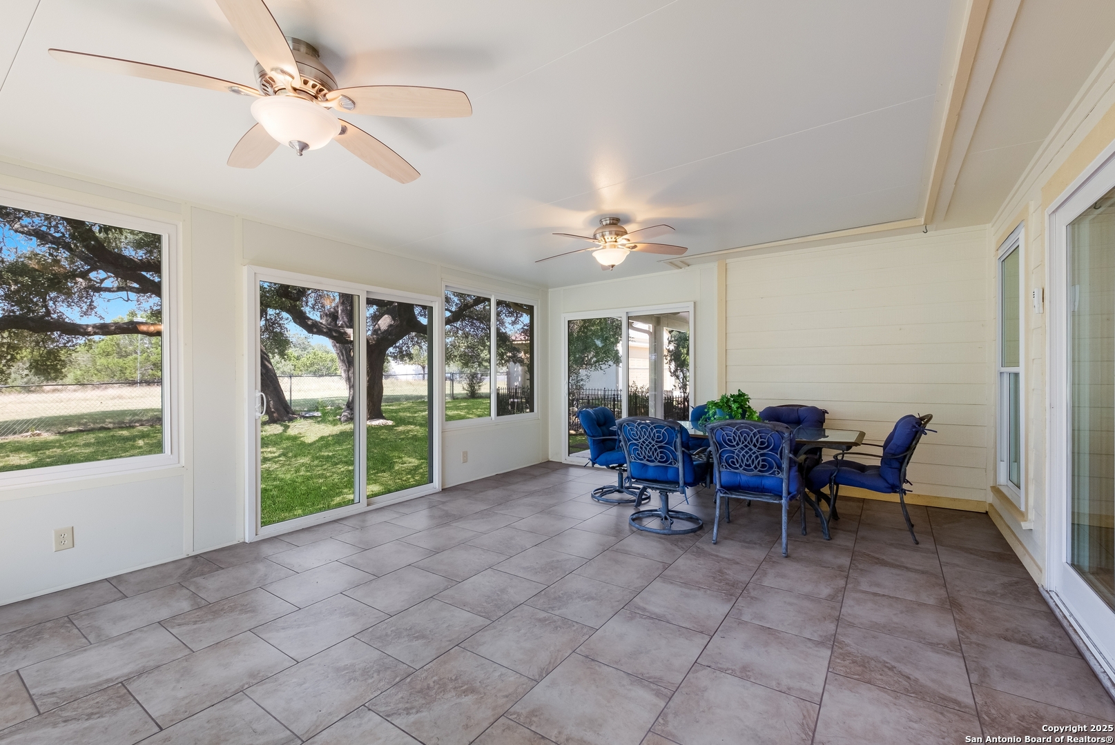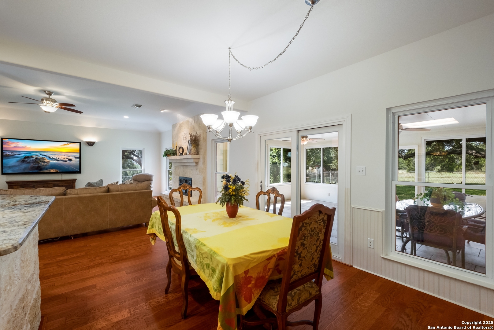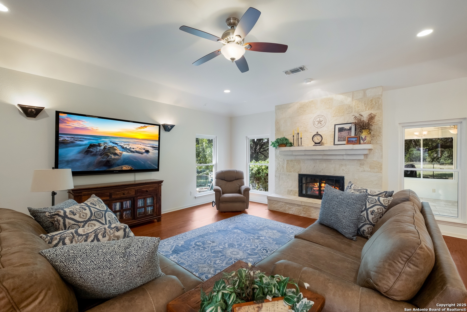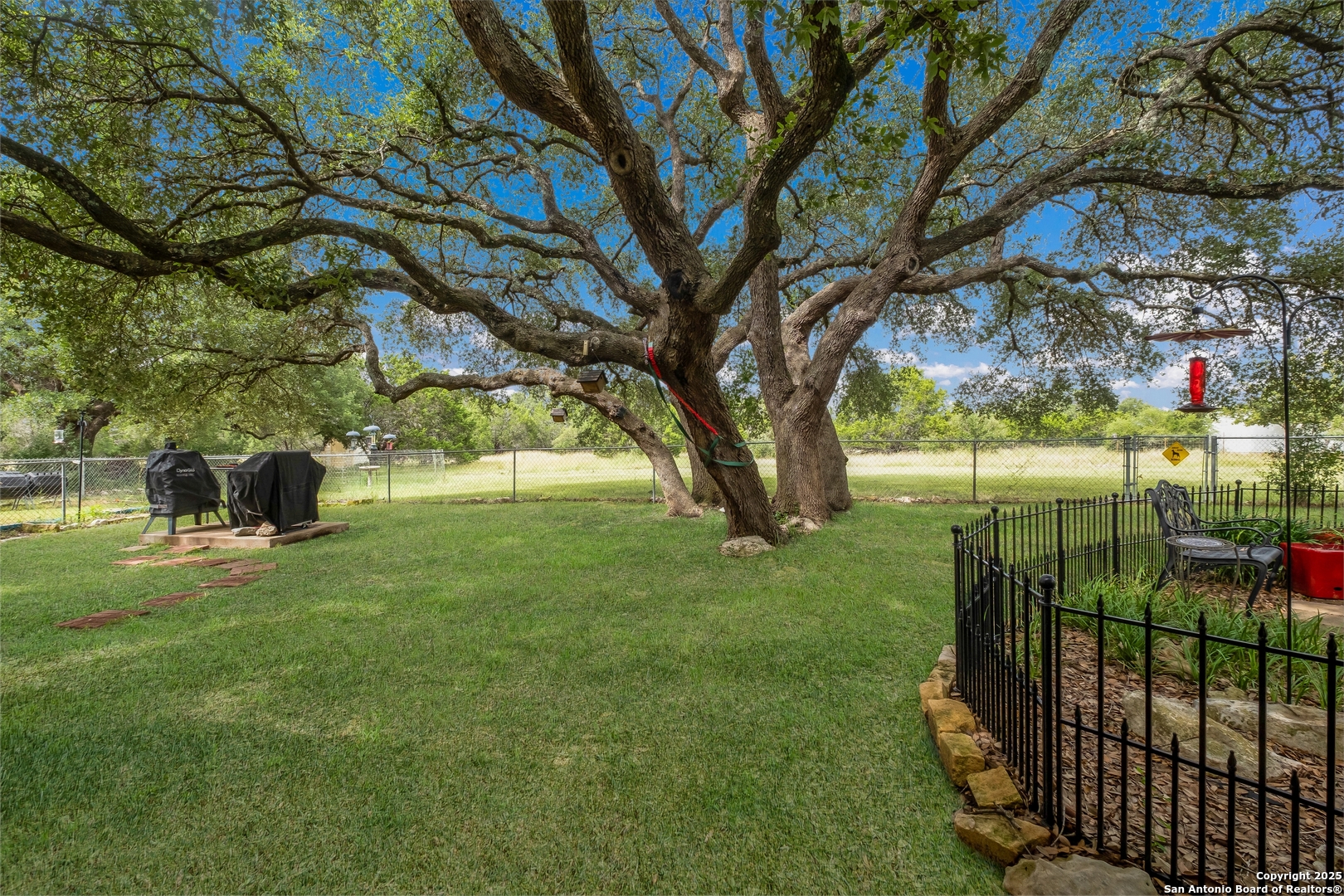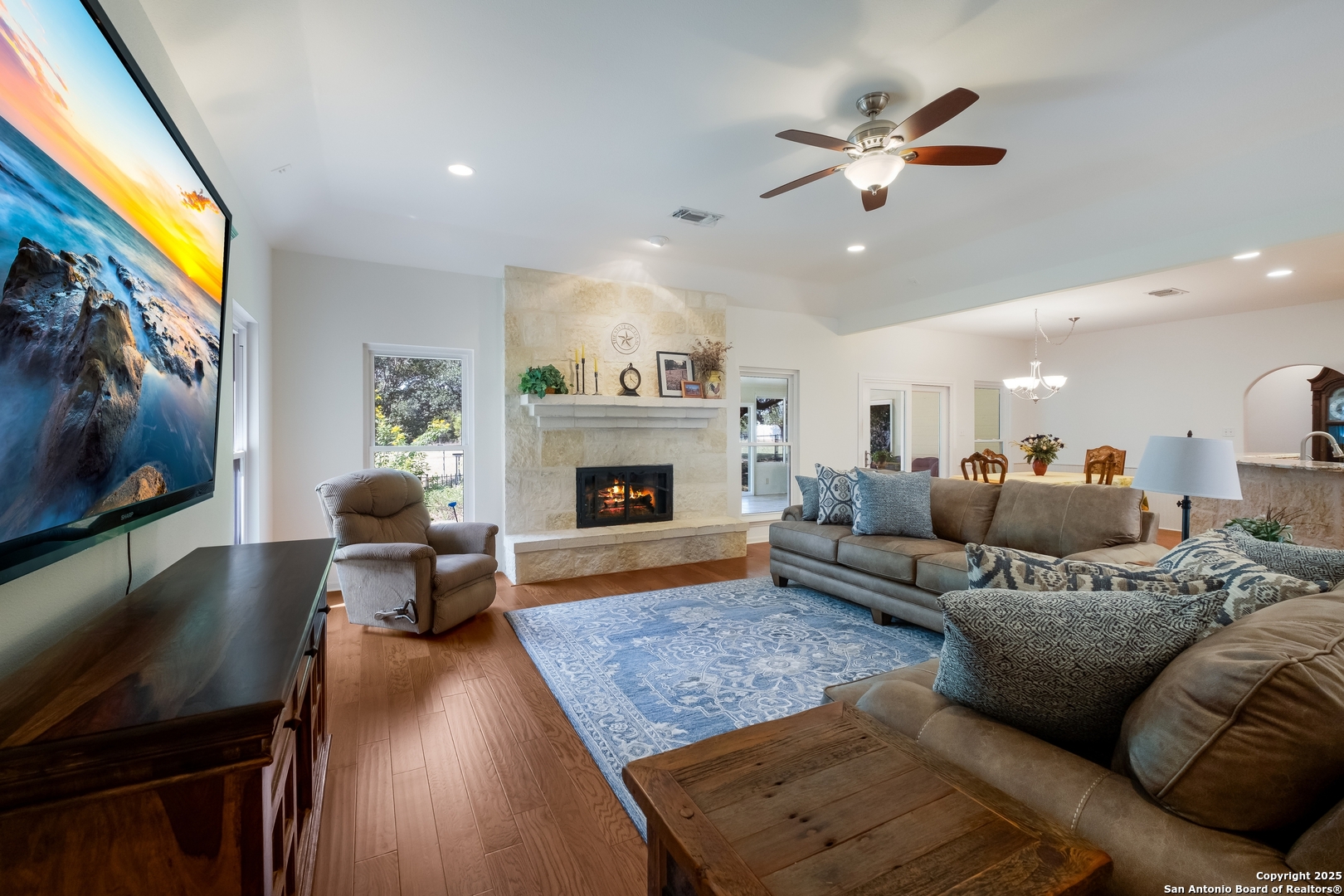 Welcome to your slice of Texas Hill Country paradise! This stunning 4-bedroom, 2.5-bathroom home sits proudly on 3.59 acres of level land, where mature oak trees provide natural shade and year-round beauty. With 2,137 square feet of thoughtfully designed living space plus a delightful 300-square-foot Four Seasons sunroom featuring new tile flooring and trim, you'll have plenty of room to spread out and breathe easy. Step inside to discover gorgeous wood floors flowing throughout the main living areas, centered around an open floor plan concept that seamlessly connects the living room with a stunning enhanced stone fireplace to the dining area and completely renovated kitchen. This flowing layout creates an inviting space perfect for both everyday living and entertaining. The kitchen would make any chef smile, featuring gleaming granite countertops, creamy white cabinetry, stainless steel appliances, butcher block island, subway tile backsplash, and pull-out drawers in most lower cabinets. The modern induction cooktop provides precise temperature control and energy efficiency, while the huge walk-in pantry offers abundant storage for all your culinary essentials. The open design allows conversation to flow naturally between the kitchen, dining area, and living room, creating a warm and welcoming atmosphere.The primary bathroom transformation is nothing short of spectacular, featuring a luxurious walk-in tiled shower with tile bench and built-in storage for the ultimate in comfort. The outdoor living spaces truly shine with extensive improvements including a new 8x10 covered patio complete with ceiling fan for comfortable entertaining. A dedicated 5x7 concrete grilling pad creates the perfect outdoor cooking space, while your Four Seasons sunroom provides year-round enjoyment. Thoughtful landscaping additions include fruit trees, elegant crepe myrtles, and beautiful gardens throughout the property. The Purple Martin house adds charming character while supporting local wildlife. Beyond these improvements, you'll find a detached 2-car garage and workshop, enhanced split rail fencing with recent expansions, fresh exterior painting, and a fenced backyard perfect for furry family members. The expansive acreage is ideal for horses, chickens, and goats. The real treasure lies in your exclusive access to the Guadalupe River through the private homeowner's river park. Located in the desirable River Mountain Ranch community within the highly-rated Boerne Independent School District, you're just minutes from Cave Without a Name, local wineries, and charming Boerne shopping.