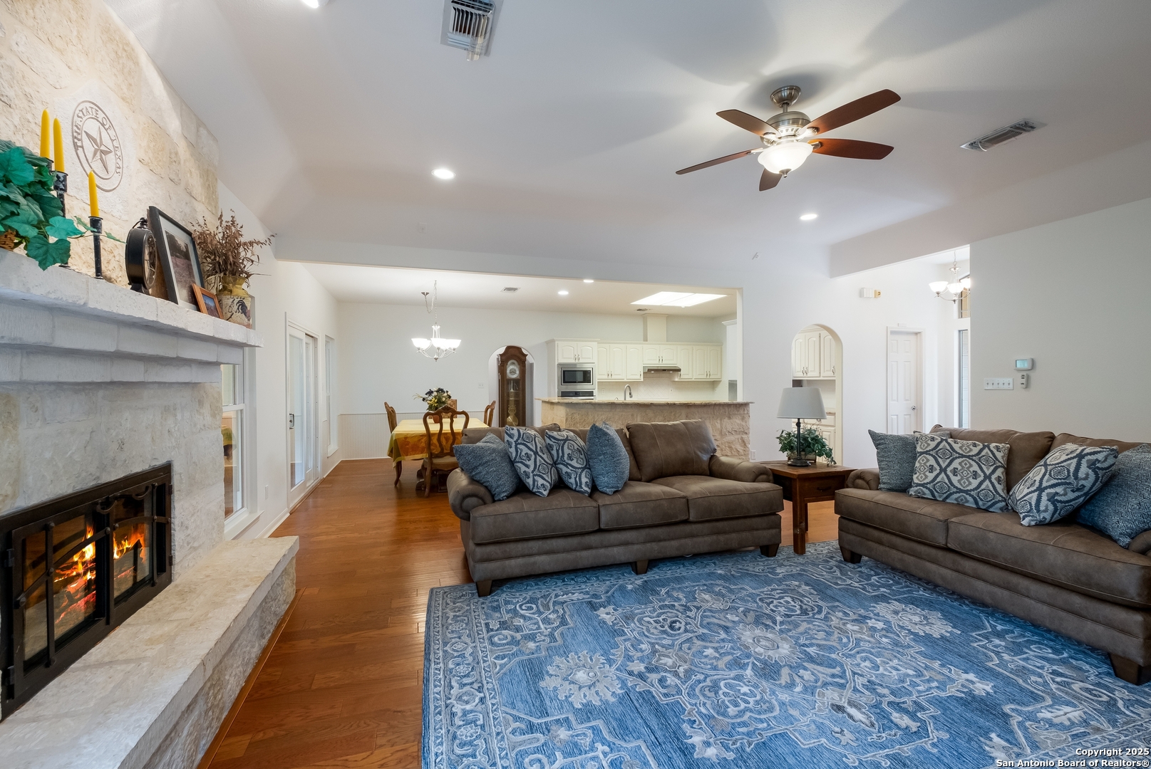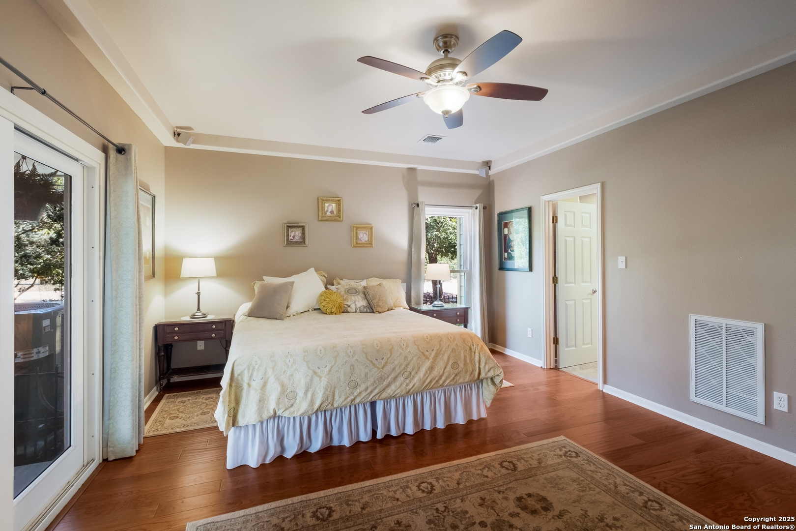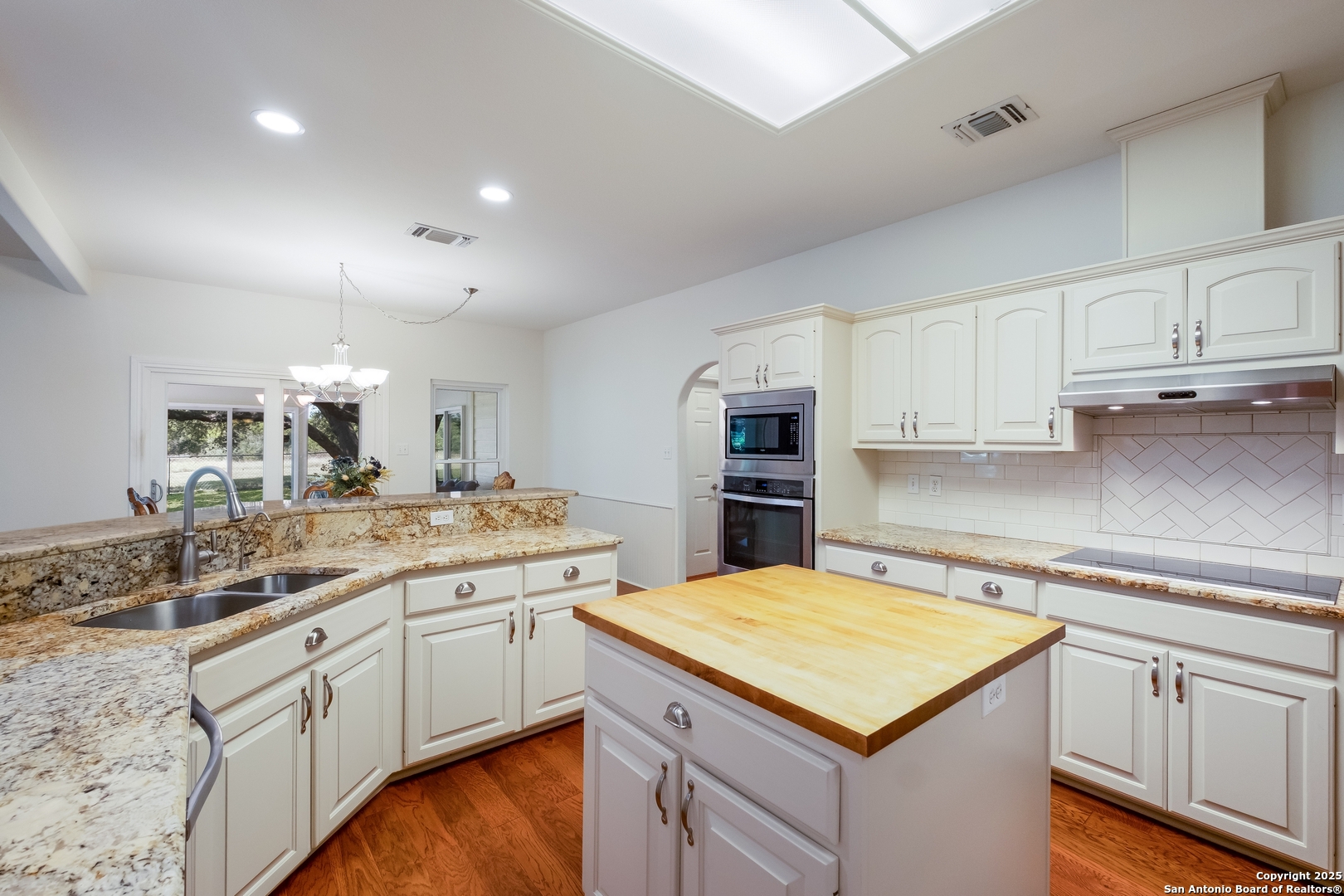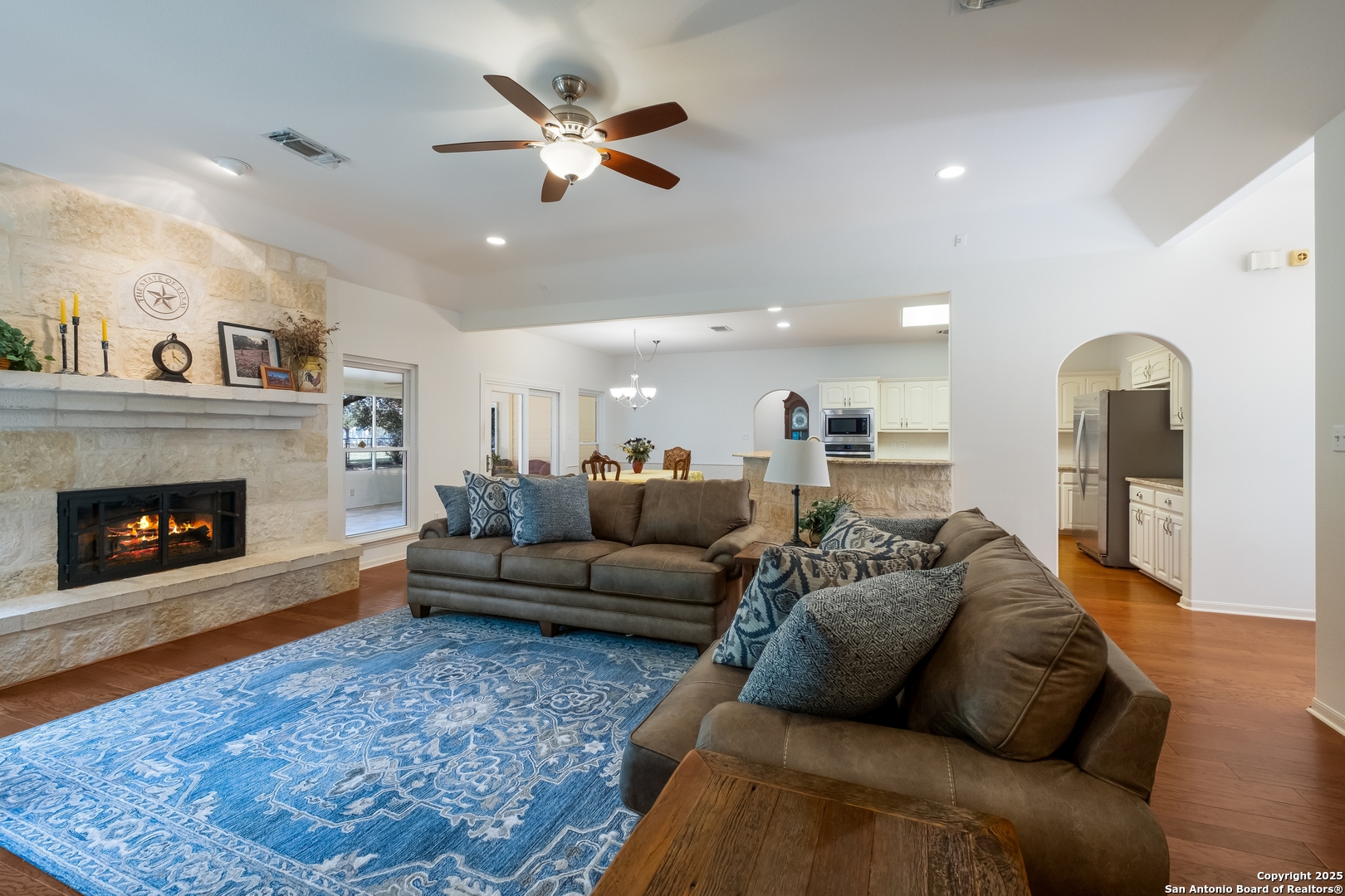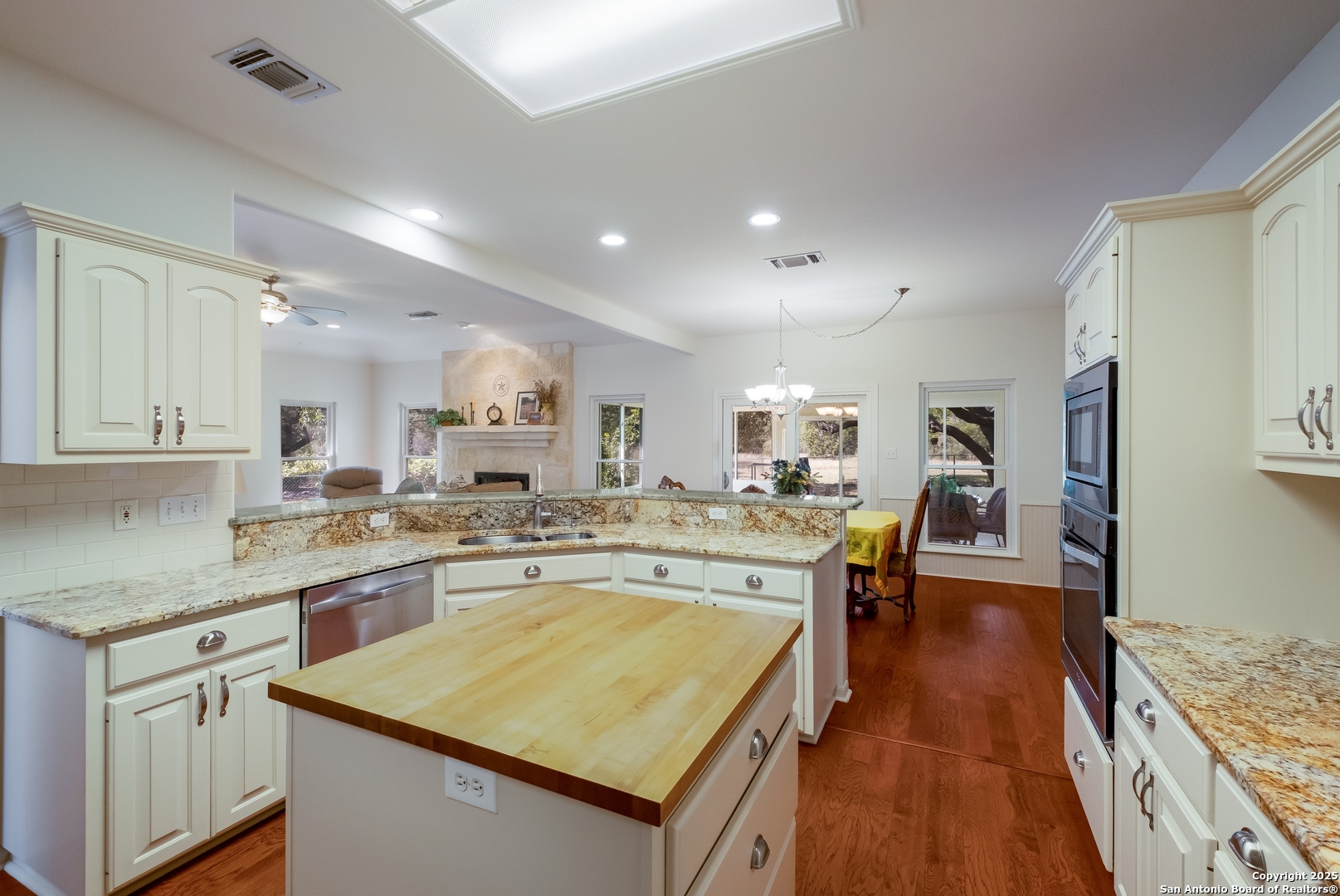 Welcome to your slice of Texas Hill Country paradise! This stunning 4-bedroom, 2.5-bathroom home sits proudly on 3.59 acres of level land, where mature oak trees provide natural shade and year-round beauty. With 2,137 square feet of thoughtfully designed living space plus a delightful 300-square-foot Four Seasons sunroom featuring new tile flooring and trim, you'll have plenty of room to spread out and breathe easy. Step inside to discover gorgeous wood floors flowing throughout the main living areas, centered around an open floor plan concept that seamlessly connects the living room with a stunning enhanced stone fireplace to the dining area and completely renovated kitchen. This flowing layout creates an inviting space perfect for both everyday living and entertaining. The kitchen would make any chef smile, featuring gleaming granite countertops, creamy white cabinetry, stainless steel appliances, butcher block island, subway tile backsplash, and pull-out drawers in most lower cabinets. The modern induction cooktop provides precise temperature control and energy efficiency, while the huge walk-in pantry offers abundant storage for all your culinary essentials. The open design allows conversation to flow naturally between the kitchen, dining area, and living room, creating a warm and welcoming atmosphere.The primary bathroom transformation is nothing short of spectacular, featuring a luxurious walk-in tiled shower with tile bench and built-in storage for the ultimate in comfort. The outdoor living spaces truly shine with extensive improvements including a new 8x10 covered patio complete with ceiling fan for comfortable entertaining. A dedicated 5x7 concrete grilling pad creates the perfect outdoor cooking space, while your Four Seasons sunroom provides year-round enjoyment. Thoughtful landscaping additions include fruit trees, elegant crepe myrtles, and beautiful gardens throughout the property. The Purple Martin house adds charming character while supporting local wildlife. Beyond these improvements, you'll find a detached 2-car garage and workshop, enhanced split rail fencing with recent expansions, fresh exterior painting, and a fenced backyard perfect for furry family members. The expansive acreage is ideal for horses, chickens, and goats. The real treasure lies in your exclusive access to the Guadalupe River through the private homeowner's river park. Located in the desirable River Mountain Ranch community within the highly-rated Boerne Independent School District, you're just minutes from Cave Without a Name, local wineries, and charming Boerne shopping.