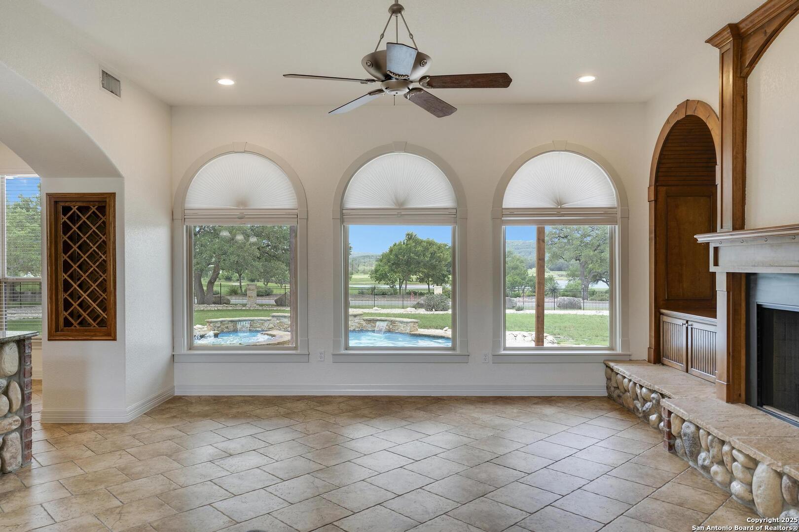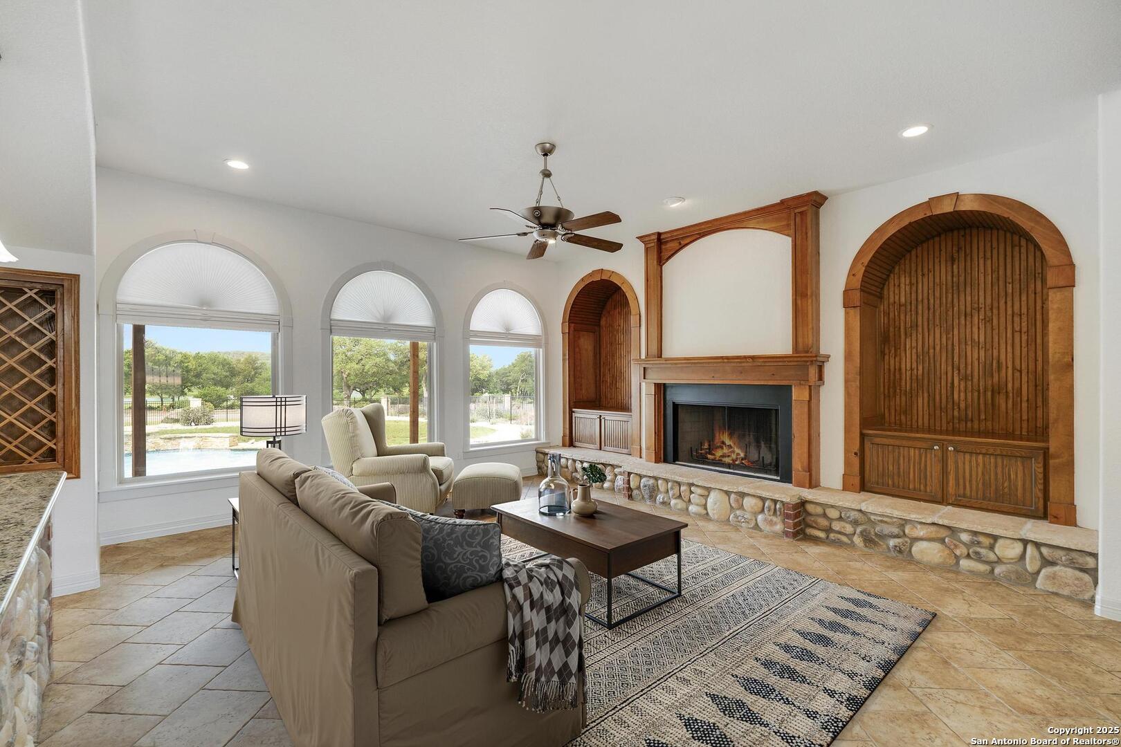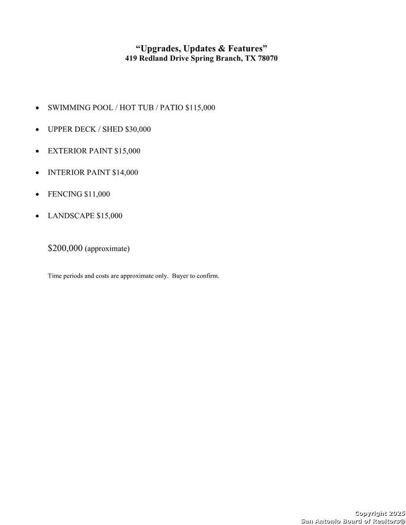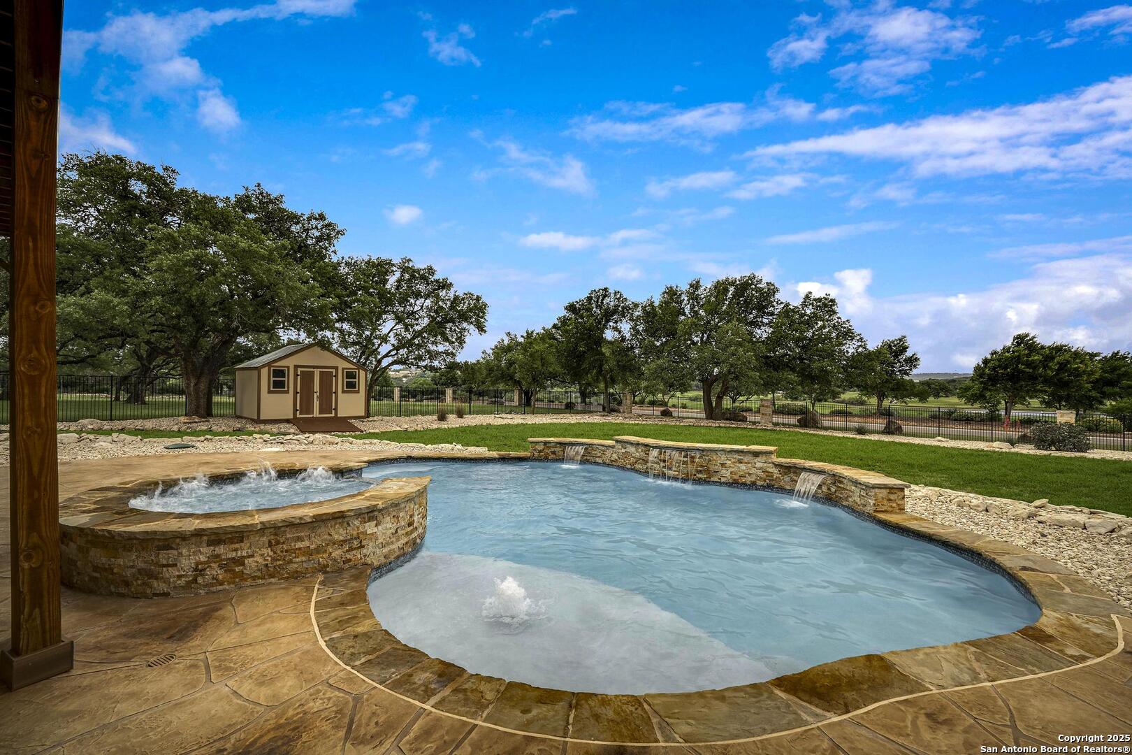 peaceful 1) free from disturbance; tranquil 2) 419 Redland Drive. ------- 419 Redland Drive most definitely defines peaceful. Relaxation from the city bustle sets in as you meander through the streets of River Crossing. Security, serenity and seclusion best describe this unique golf course community. Resort style living in the rustic beauty of the Texas Hill Country. The private River Crossing Club offers its members an exceptional golf experience and activities for the entire family. The River Crossing Club offers members dining and social events, a beautiful resort style pool, complimentary group exercise classes, and a well-appointed fitness center. Additional neighborhood amenities include tennis, basketball, hiking as well as a fun park/playground for the kids. Enjoy the private access resident river park. Spend your summer days along The Guadalupe River fishing, floating and grilling. No city property taxes are a plus. ------- Majestic century oak trees welcome one home to this peaceful 1.04 corner acre lot. Built by Tradition Custom Homes. Constructed with the highest quality materials, masterful engineering, highest efficiencies and beautiful appointments throughout. Hand scraped oak floors and plenty of natural light, low profile picture windows and views of the backyard greet you upon entry. This 4 bedroom open floor plan boasts of a beautiful great room adorned by a high ceiling foyer. The spacious fireplace is perfect for those somewhat chilly nights. The dining room offers plenty of space for family and friends. Beautiful outdoor views from the study. From the master bedroom step into the ensuite bath to enjoy an amazing walk-in shower, double vanities and his/her closets. Upstairs you will discover an additional living area, guest suite and large secondary bedrooms. Watch your favorite movies and sports events in the oversized theater room. The views from the recently built upper deck are amazing. Looking out towards the picturesque waterfront fairway. Wide hallways, solid doors, ample closet space and timeless flooring are carried throughout the house. Possible elevator shaft located in front foyer. Buyer to confirm. ------- Mountain river stone is carried through to the Chef's Kitchen. Boasting granite countertops, a double island cook area, custom cabinets and top of the line stainless steel appliances. The oversized garage provides ample space for 3 vehicles, secondary refrigerators, fitness area and storage. Step out from the breakfast room onto the updated covered patio area where grilling and chilling is a must. Enjoy the soft sounds of the waterfalls spilling into the recently installed swimming pool. The spacious backyard allows for plenty of creative ideas such as a cabana, children's playscape, garden or workshop. The large shed allows plenty of room for storage. Recently added upgrades, updates and features include the patio, pool, hot tub, upper deck system, fencing, shed, landscape, paint (exterior and interior) and overhead garage doors. ------- Only a short drive to the historic towns of Gruene and New Braunfels. Hop on nearby HWY 281 to San Antonio and the Highland Lakes areas. IH-35 is an easy commute to San Marcos, Wimberley and Austin. Plenty of shopping, restaurants, hospitals, entertainment, the Hill Country Wine Trail, the Guadalupe River and Canyon Lake (the cleanest, clearest, coldest water in Texas). Seclusion, privacy and just plain better living await you at 419 Redland Drive.