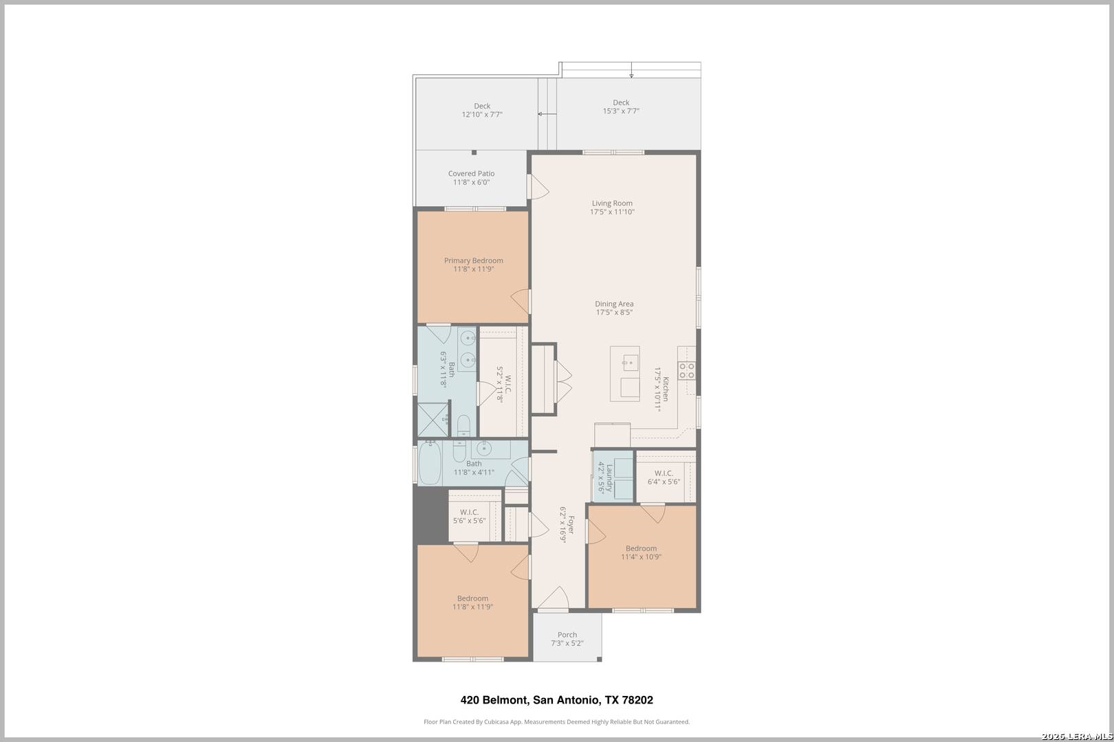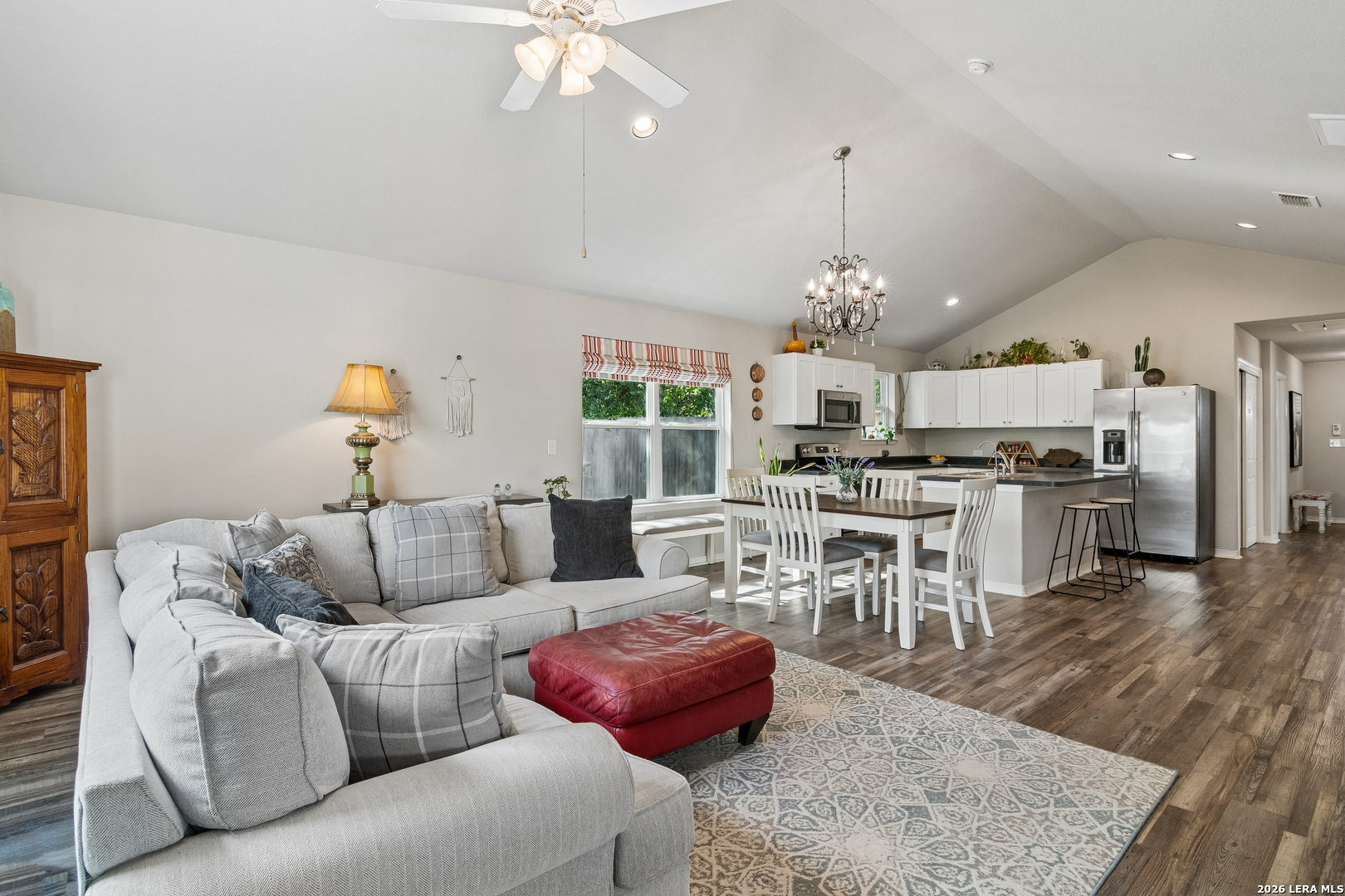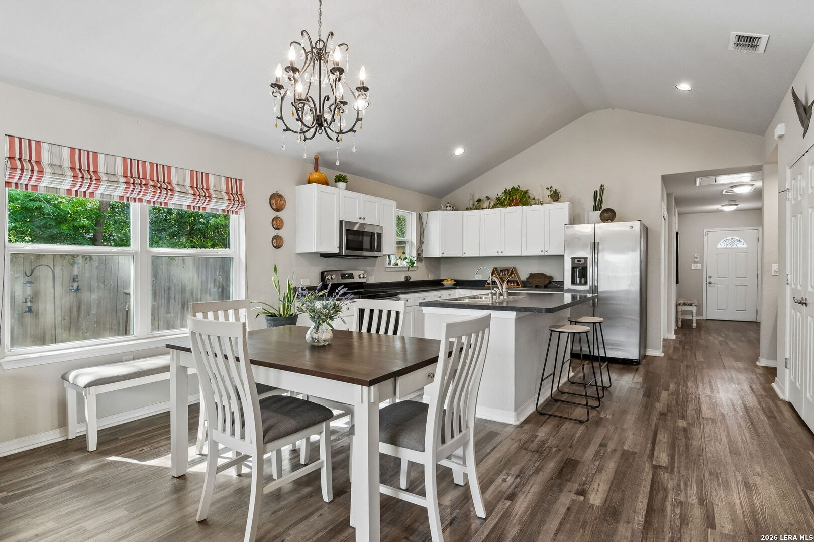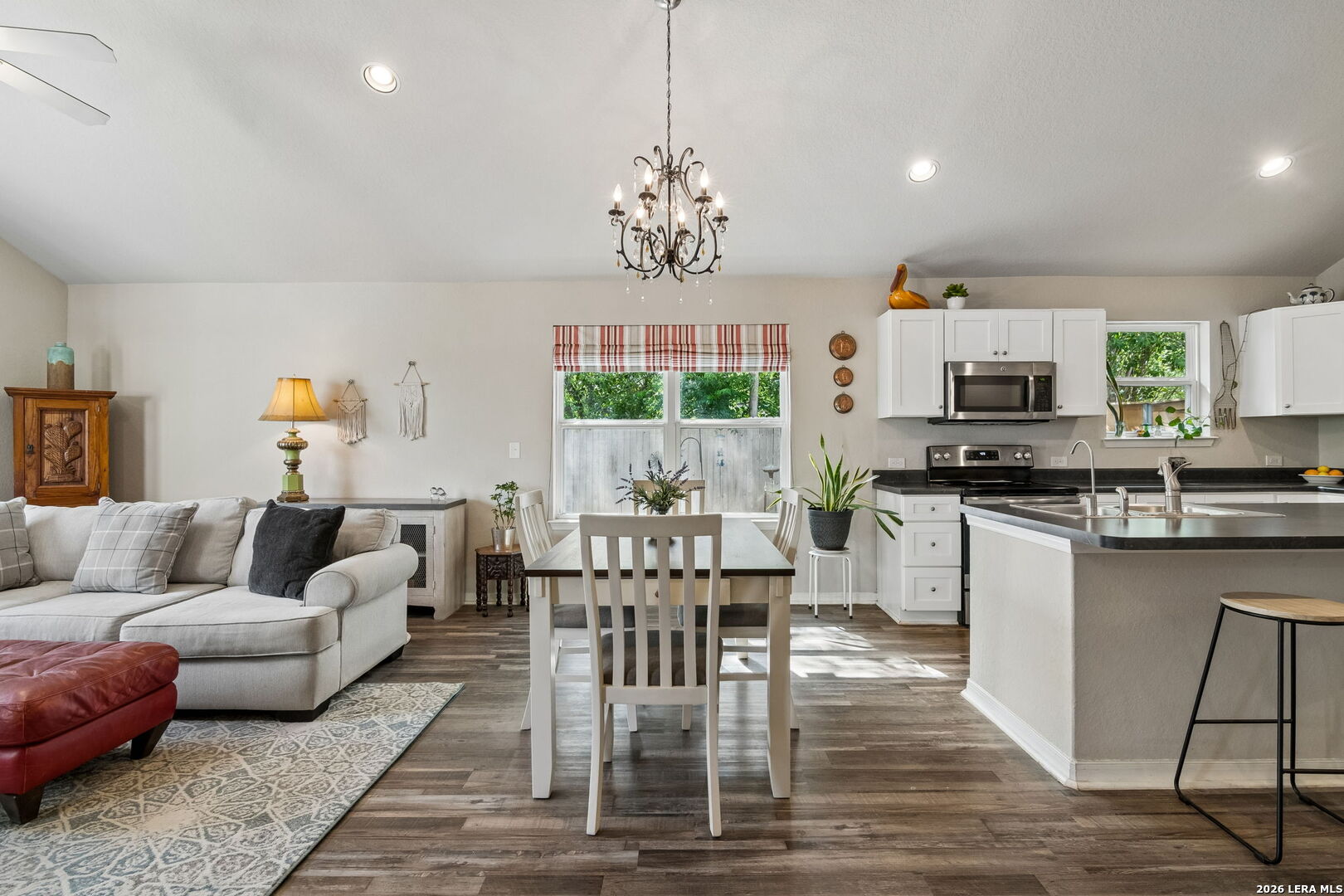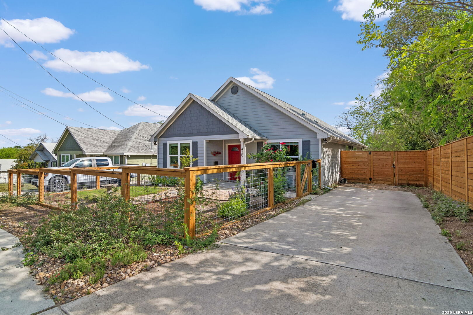 At 420 Belmont, charm and comfort come together in a home that feels inviting from the moment you arrive. A fenced front yard with established plants and mature landscaping creates welcoming curb appeal. Inside, an island kitchen and dining area flow naturally into a light-filled living room at the back of the home, while high vaulted ceilings add character and volume to the space. No carpet throughout offers easy maintenance and a clean, cohesive feel. Bedrooms feature spacious walk-in closets, and the overall layout balances functionality with comfort. Out back, a covered patio overlooks a double-layer deck and a large yard shaded by mature trees and enclosed by a privacy fence, offering plenty of room to relax, entertain, or enjoy the outdoors. Well-maintained and full of warmth, 420 Belmont offers comfortable indoor and outdoor living just minutes from downtown San Antonio, nearby parks, St. Philip's College, the Frost Bank Center, and the Pearl, placing some of the city's best destinations within easy reach.