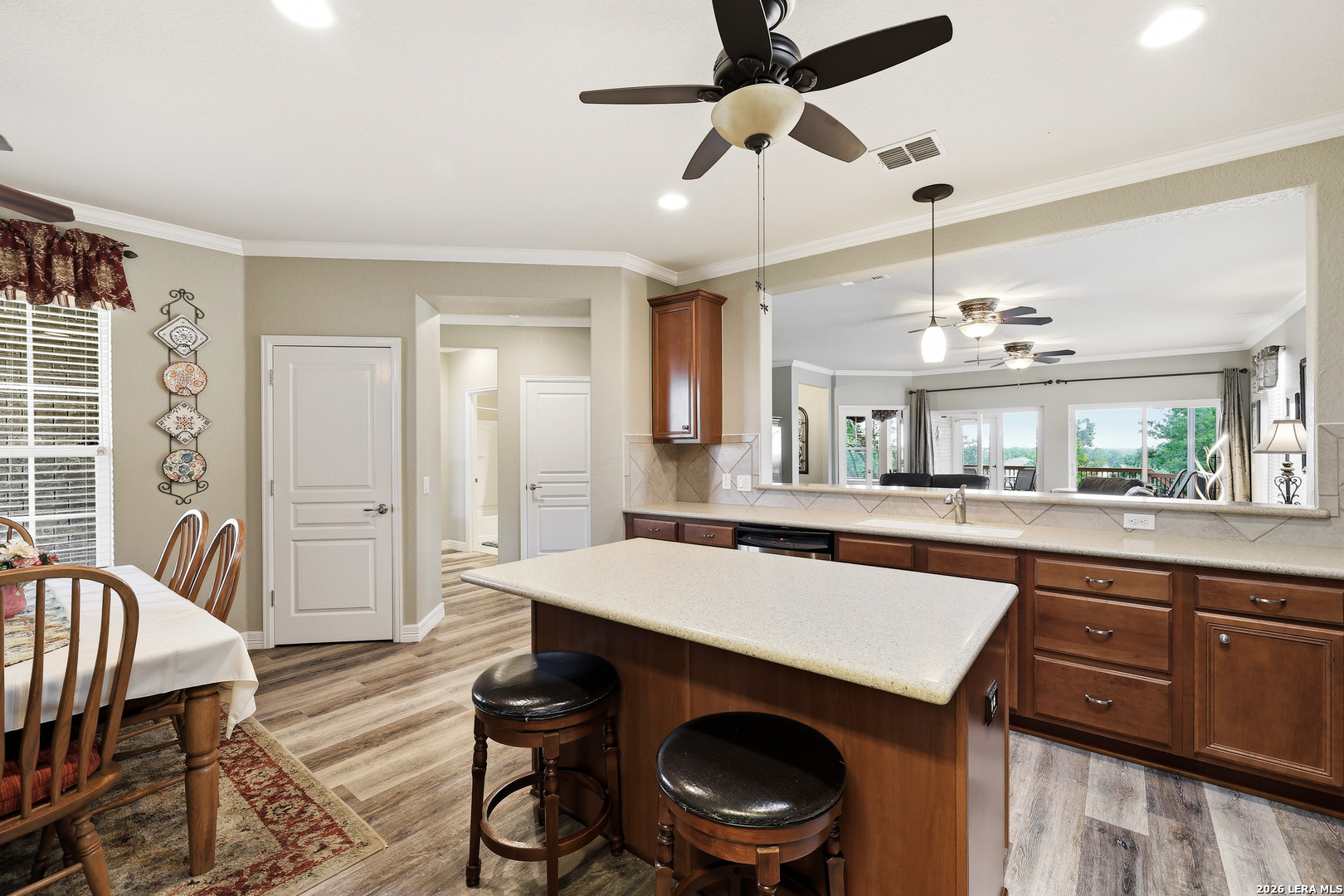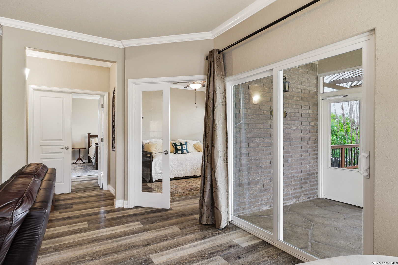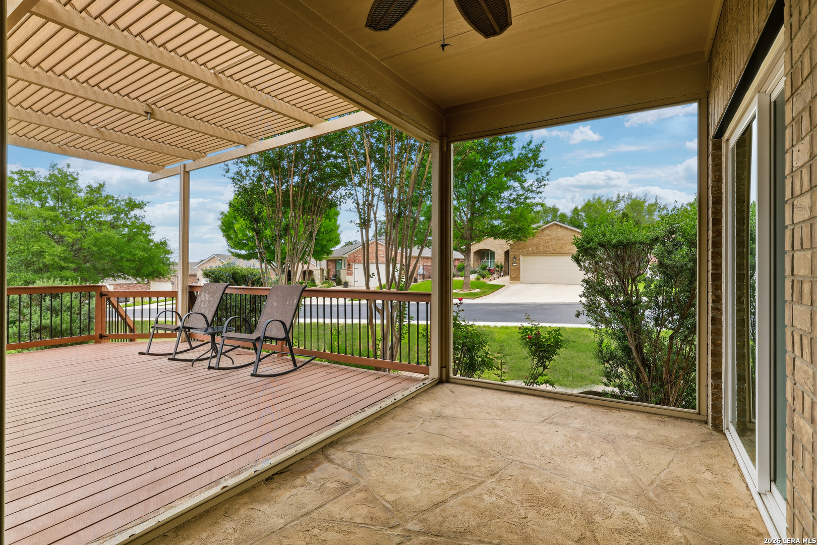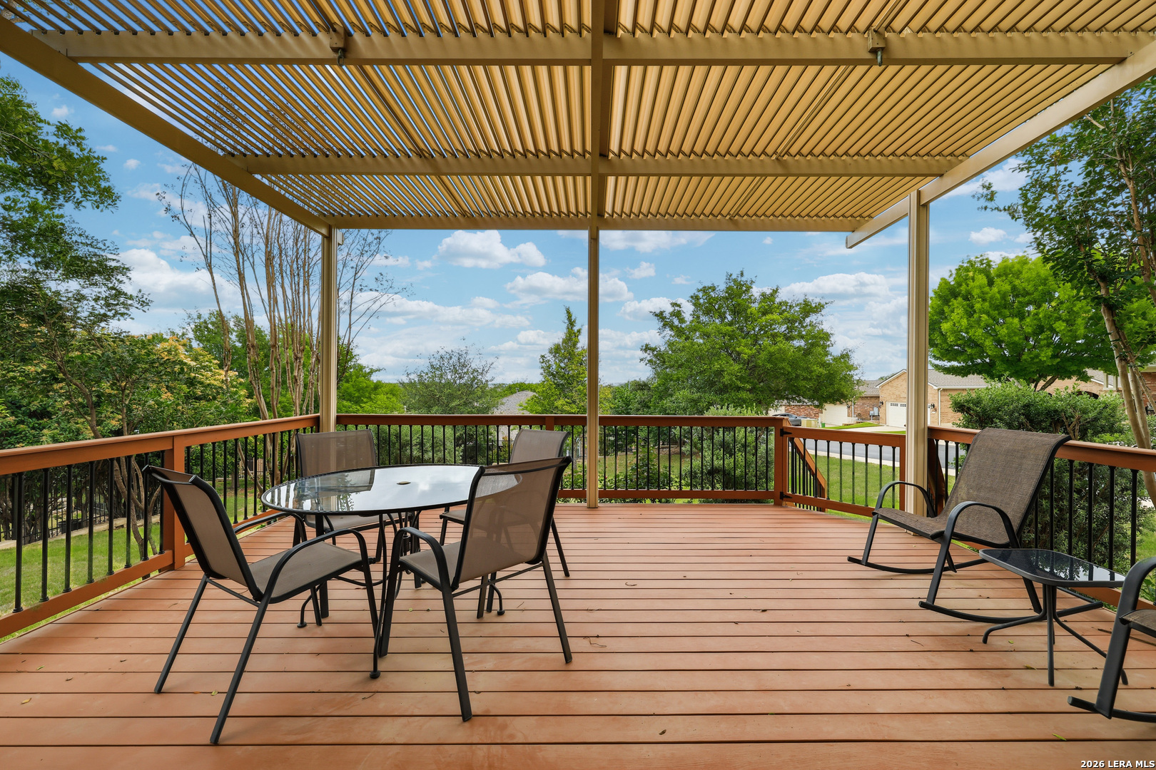 Welcome to 4202 Black Rock in San Antonio's premier 55+ community, Hill Country Retreat, where thoughtful upgrades and resort-style living come together beautifully. This beautifully maintained 2-bedroom, 2-bath home with a private study offers a spacious open-concept layout designed for both everyday comfort and effortless entertaining. The heart of the home is the well-appointed kitchen featuring Corian countertops, stainless steel appliances, a large island with ample storage, and cabinet pullouts throughout for ease of access. What truly sets this home apart is the extensive list of recent improvements and high-value upgrades. Enjoy luxury vinyl plank flooring throughout the main living areas, bedrooms, and flex space, along with crown molding and upgraded baseboards that add a refined finish. Step outside to an exceptional outdoor living space featuring a massive 19x19 Ipe wood deck and an upgraded pergola with adjustable louvers, offering the perfect blend of shade and sunlight. The screened-in patio, heavy-duty sliders, and beautiful landscaping with brick edging and mature trees create a private, serene retreat ideal for year-round enjoyment. Major system updates provide peace of mind, including a Carrier 16 SEER HVAC system (2024), roof replacement with ridge vents (2021), water heater (2024), and water softener system updates (2024). Additional features like WiFi-enabled sprinkler system, skylight tunnels for natural light, added cabinetry, and storm doors enhance both functionality and efficiency. Situated on a desirable corner lot with scenic views, this home offers both space and privacy within one of San Antonio's most sought-after active adult communities. Residents of Hill Country Retreat enjoy a 28,000 sq. ft. amenity center, indoor/outdoor pools, fitness center, walking trails, social clubs, and a vibrant lifestyle calendar. This is the perfect blend of low-maintenance living, thoughtful upgrades, and community lifestyle-all in a prime location close to shopping, dining, and medical facilities.