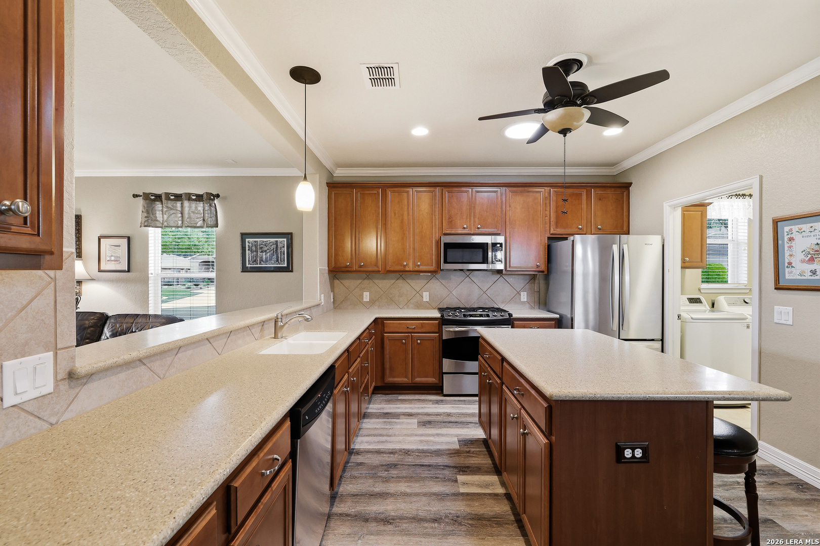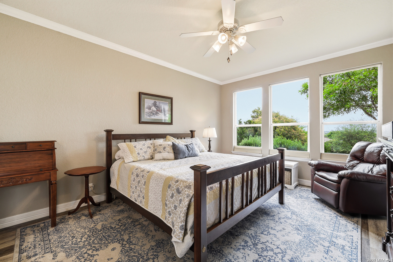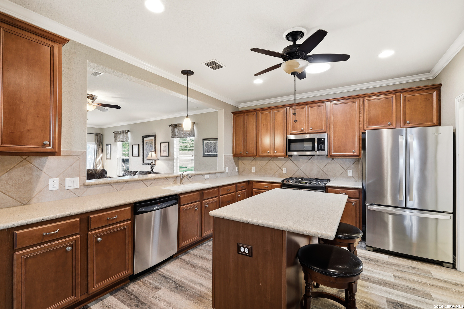 Welcome to 4202 Black Rock in San Antonio's premier 55+ community, Hill Country Retreat, where thoughtful upgrades and resort-style living come together beautifully. This beautifully maintained 2-bedroom, 2-bath home with a private study offers a spacious open-concept layout designed for both everyday comfort and effortless entertaining. The heart of the home is the well-appointed kitchen featuring Corian countertops, stainless steel appliances, a large island with ample storage, and cabinet pullouts throughout for ease of access. What truly sets this home apart is the extensive list of recent improvements and high-value upgrades. Enjoy luxury vinyl plank flooring throughout the main living areas, bedrooms, and flex space, along with crown molding and upgraded baseboards that add a refined finish. Step outside to an exceptional outdoor living space featuring a massive 19x19 Ipe wood deck and an upgraded pergola with adjustable louvers, offering the perfect blend of shade and sunlight. The screened-in patio, heavy-duty sliders, and beautiful landscaping with brick edging and mature trees create a private, serene retreat ideal for year-round enjoyment. Major system updates provide peace of mind, including a Carrier 16 SEER HVAC system (2024), roof replacement with ridge vents (2021), water heater (2024), and water softener system updates (2024). Additional features like WiFi-enabled sprinkler system, skylight tunnels for natural light, added cabinetry, and storm doors enhance both functionality and efficiency. Situated on a desirable corner lot with scenic views, this home offers both space and privacy within one of San Antonio's most sought-after active adult communities. Residents of Hill Country Retreat enjoy a 28,000 sq. ft. amenity center, indoor/outdoor pools, fitness center, walking trails, social clubs, and a vibrant lifestyle calendar. This is the perfect blend of low-maintenance living, thoughtful upgrades, and community lifestyle-all in a prime location close to shopping, dining, and medical facilities.