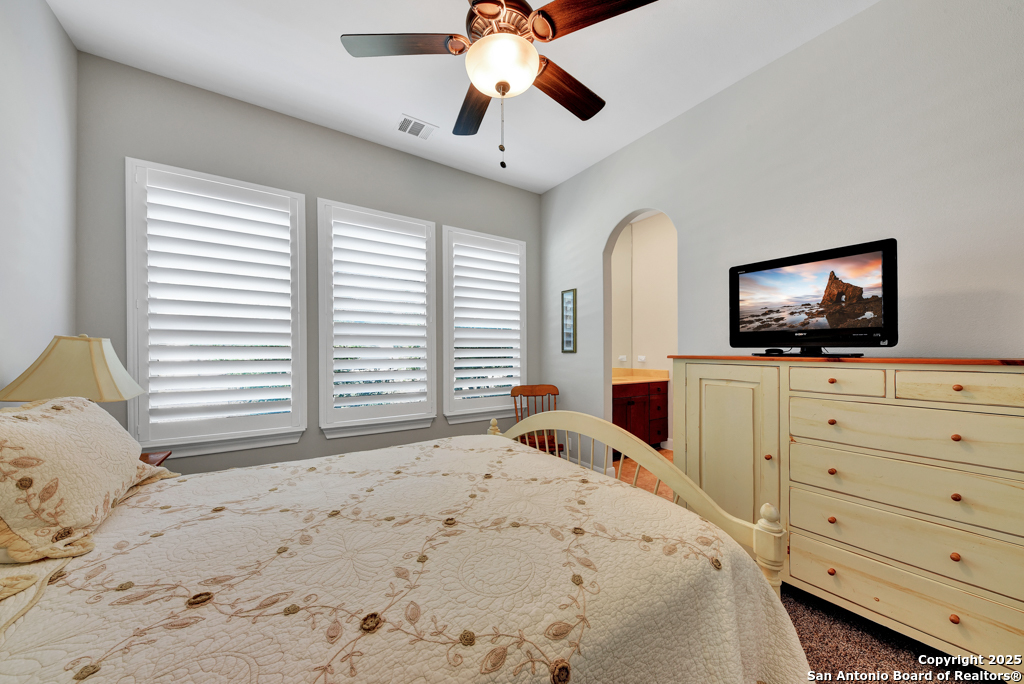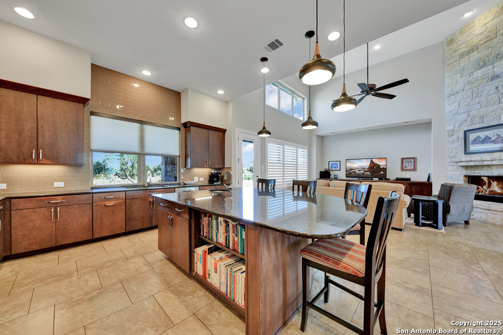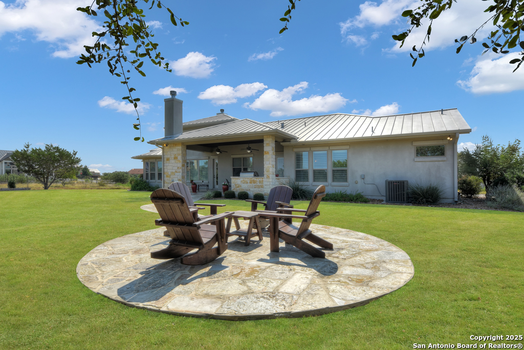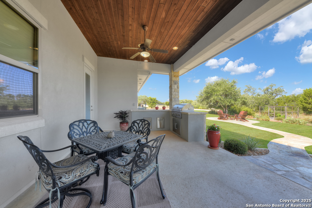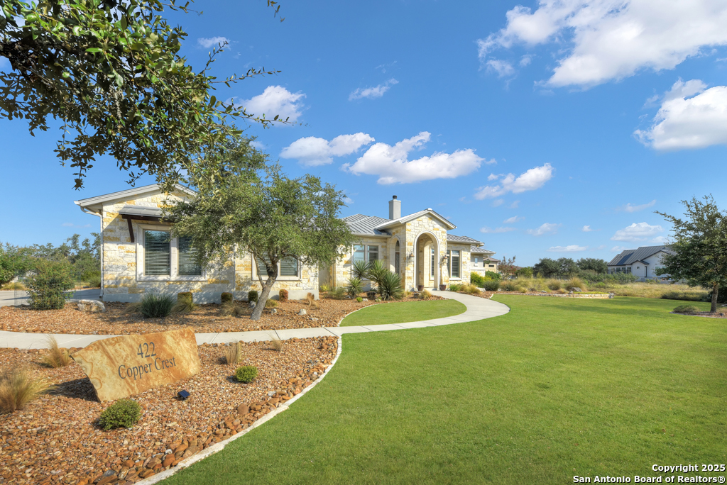 Welcome into the guard gated community of Copper Ridge to see this one story Weston Dean custom build. This open concept home with 3 bedrooms, 2 and a half bath, flex space, and formal dining create a layout to be desired and large windows throughout offer abundant natural light. Take in the special details like plantation shutters on all windows, grand stone fireplace in living area along with surround sound for great entertainment. Enjoy cooking on a quiet evening in your large kitchen with prep sink, custom cabinetry, Bosch appliances, and oversized island or host others in your adjacent dining room. At the end of the day, retreat to the owner's suite with beautiful bay window and adjoining bathroom that features dual vanities, dual closets, separate garden tub and doorless walk in shower with dual shower heads. Out back the covered patio offers plenty of space for dining al fresco next to your outdoor kitchen and the gas fireplace can really set the scene. Follow the stone path out into the backyard to find yourself a great additional space for conversation and a potential future home for fun firepit hangout. Come and see it for yourself.
