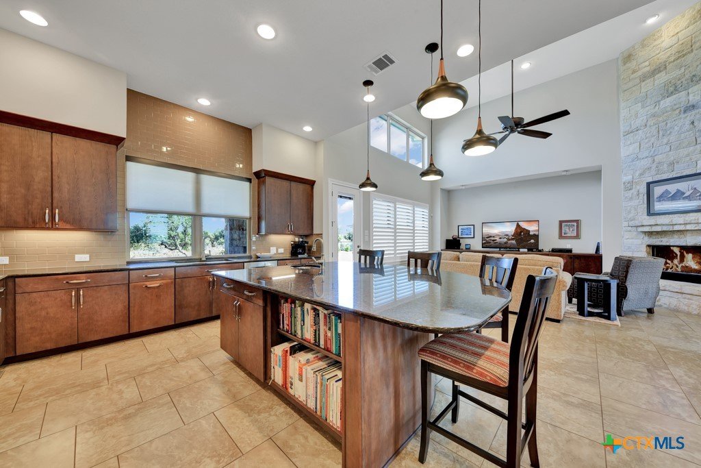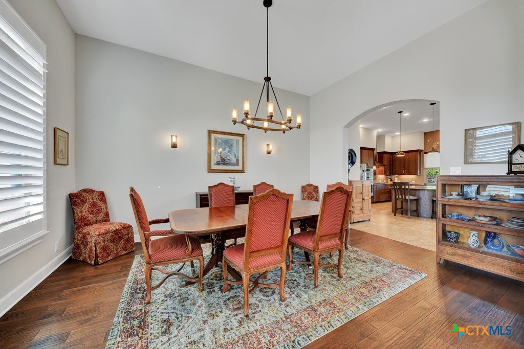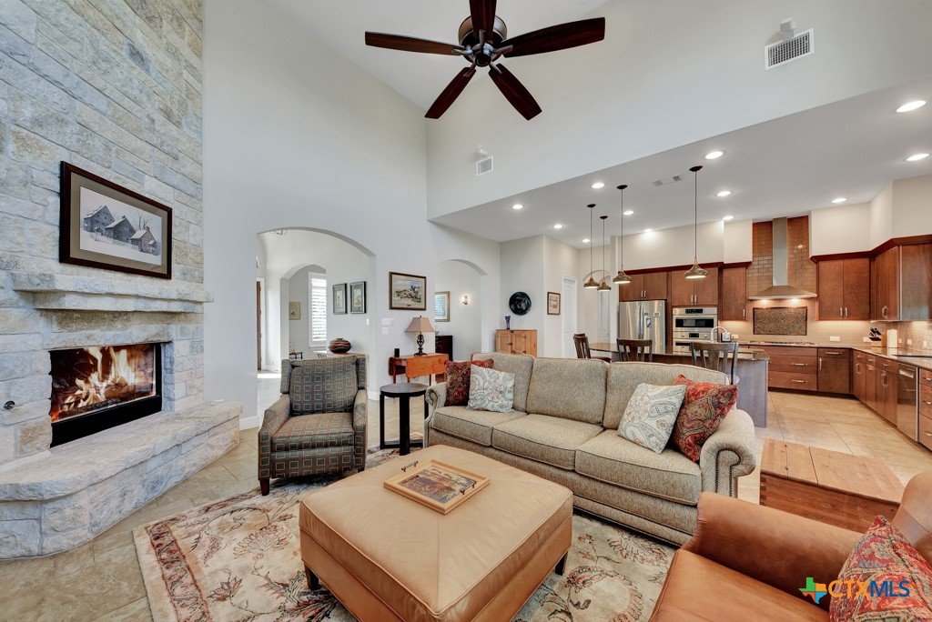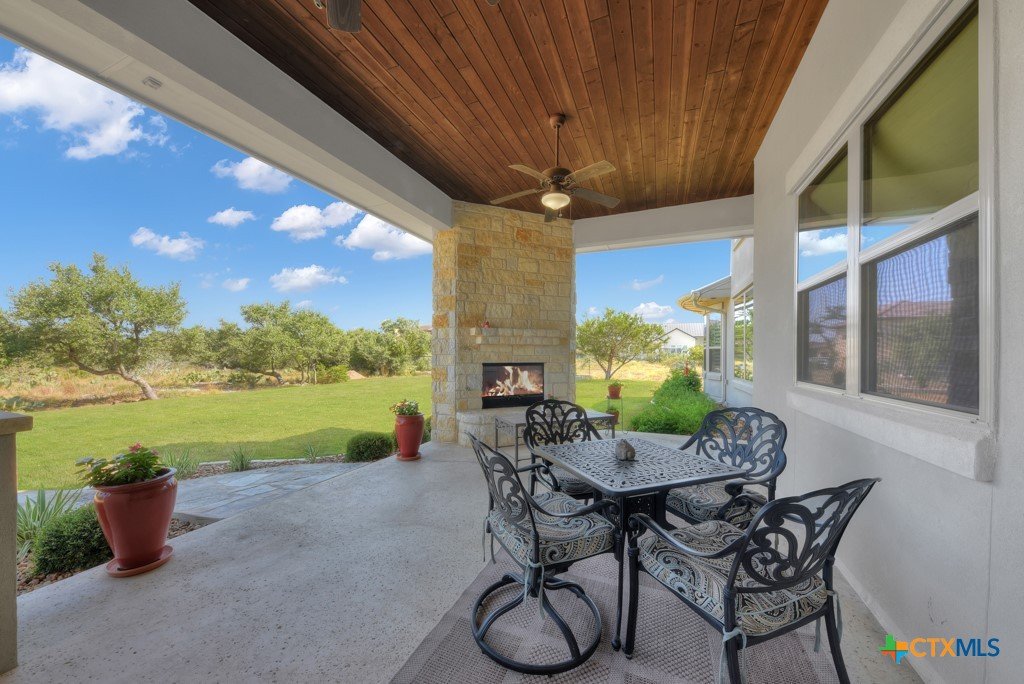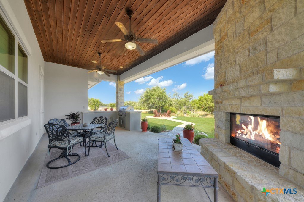 Welcome into the guard gated community of Copper Ridge to see this one story Weston Dean custom build. This open concept home with 3 bedrooms, 2 and a half bath, flex space, and formal dining create a layout to be desired and large windows throughout offer abundant natural light. Take in the special details like plantation shutters on all windows, grand stone fireplace in living area along with surround sound for great entertainment. Enjoy cooking on a quiet evening in your large kitchen with prep sink, custom cabinetry, Bosch appliances, and oversized island or host others in your adjacent dining room. At the end of the day, retreat to the owner's suite with beautiful bay window and adjoining bathroom that features dual vanities, dual closets, separate garden tub and doorless walk in shower with dual shower heads. Out back the covered patio offers plenty of space for dining al fresco next to your outdoor kitchen and the gas fireplace can really set the scene. Follow the stone path out into the backyard to find yourself a great additional space for conversation and a potential future home for fun firepit hangout. Come and see it for yourself.