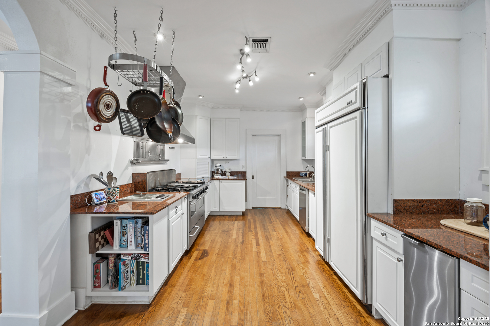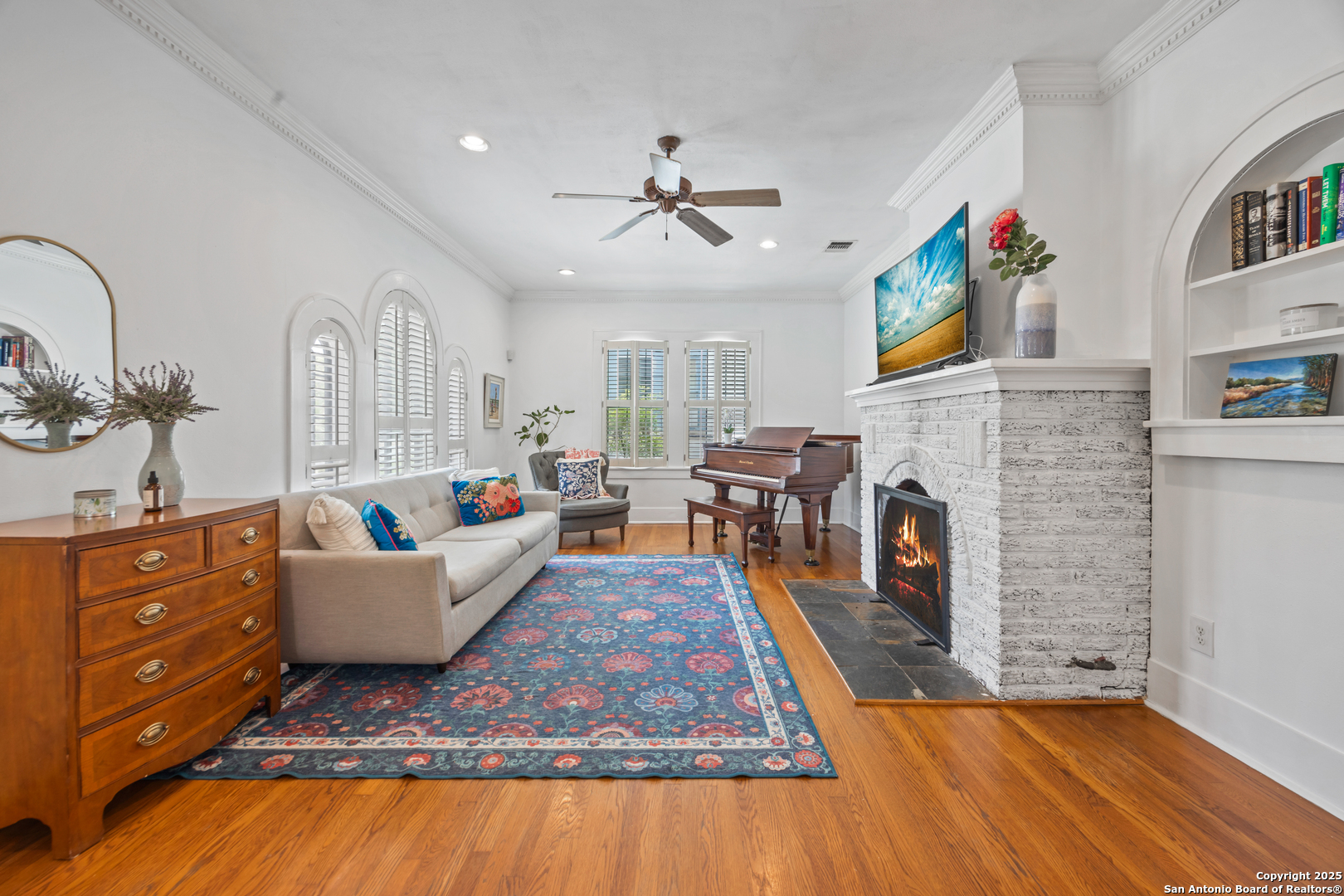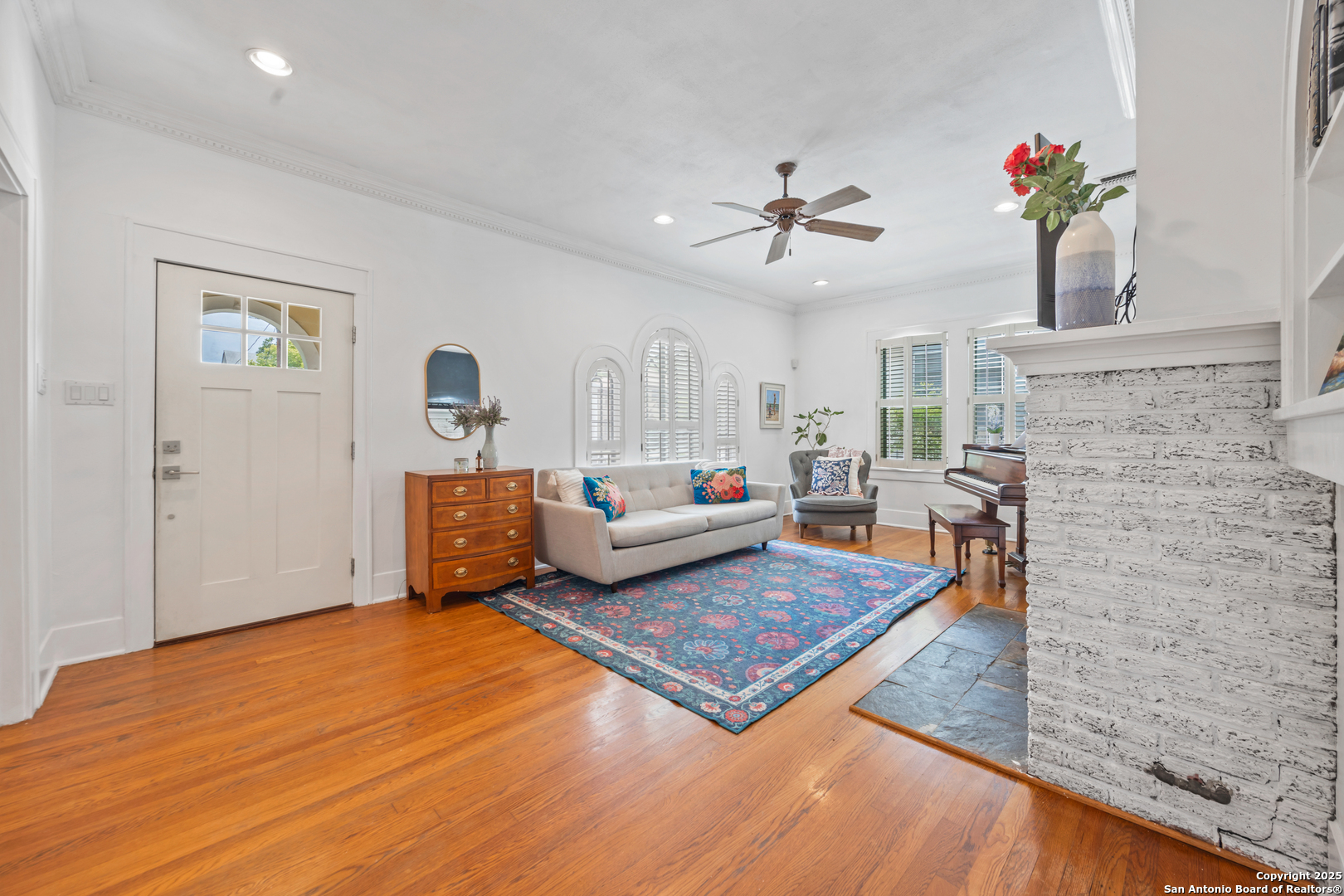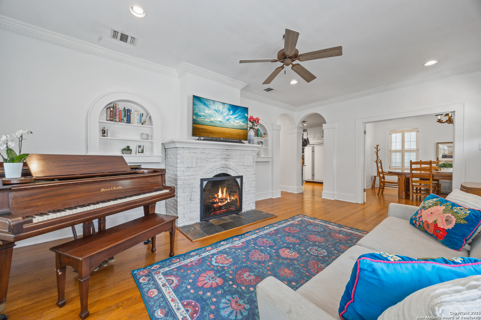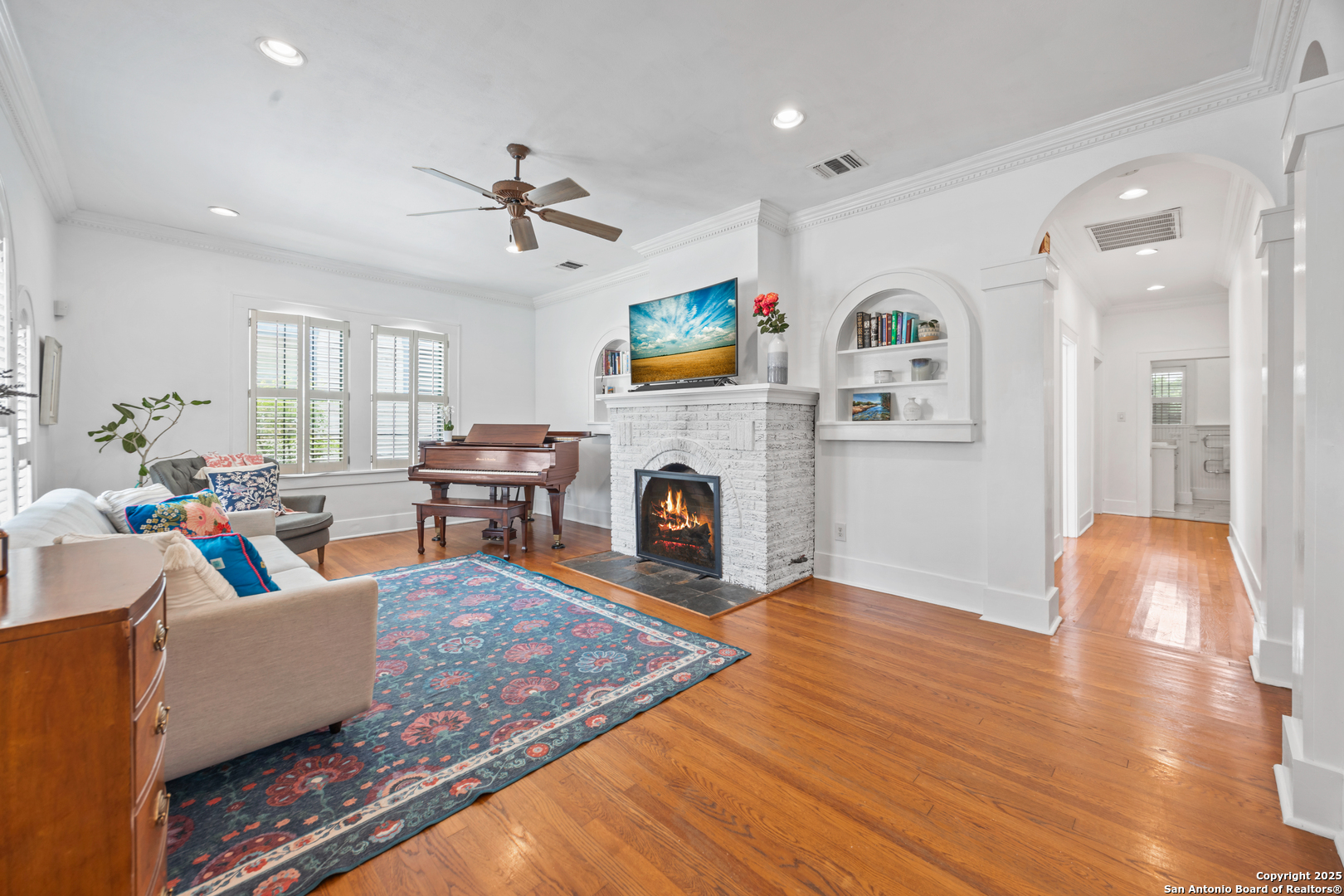 Charming 1928 Craftsman Bungalow with Modern Upgrades! This beautifully maintained home features original oak hardwood floors and a cozy family room with a classic brick fireplace. Enjoy a chef-inspired kitchen complete with 30 feet of granite countertops, Sub-Zero refrigerator/freezer, Hoshizaki ice maker, and a professional-grade 6-burner and pot filler. The luxurious custom bathroom boasts Italian tile, Kohler fixtures, heated floors, and a heated towel rack. Don't miss the massive walk-in master closet! Elegant crown molding and shutters add timeless charm. The private backyard offers lush landscaping and multiple patios, perfect for entertaining. Notable improvements made within the past several years include updated electrical and plumbing systems, insulation, a newer water heater, and a water softener system.