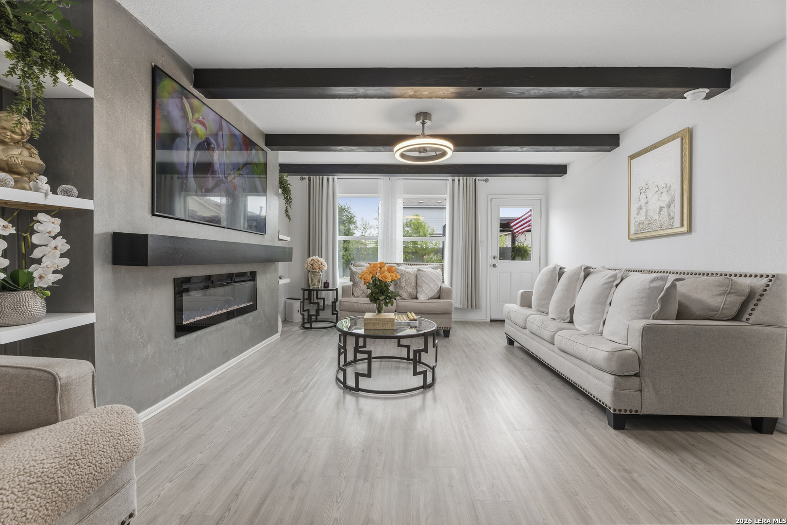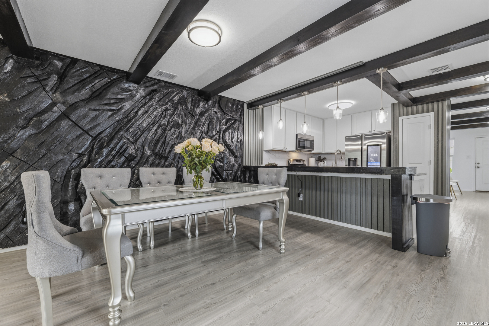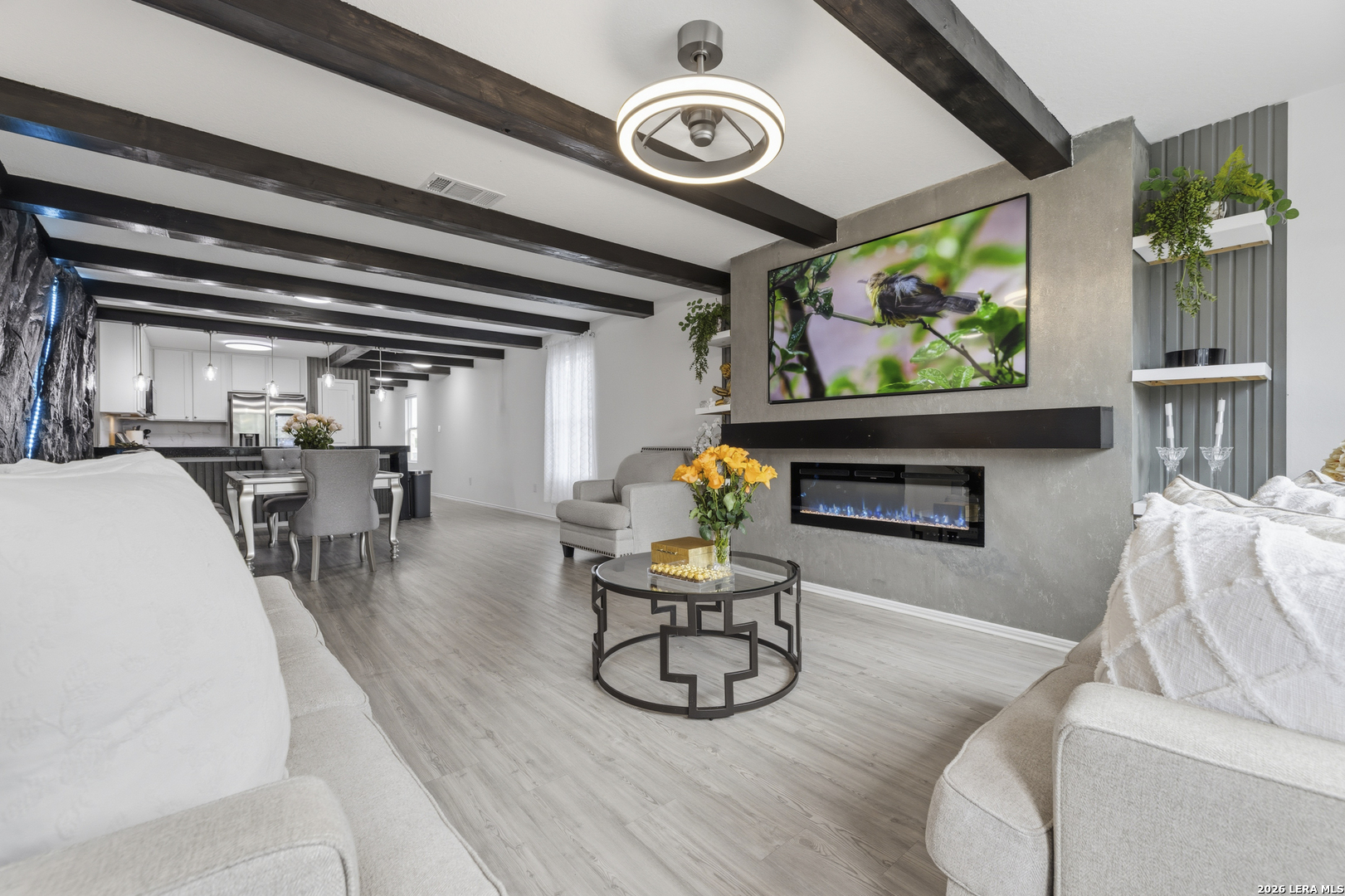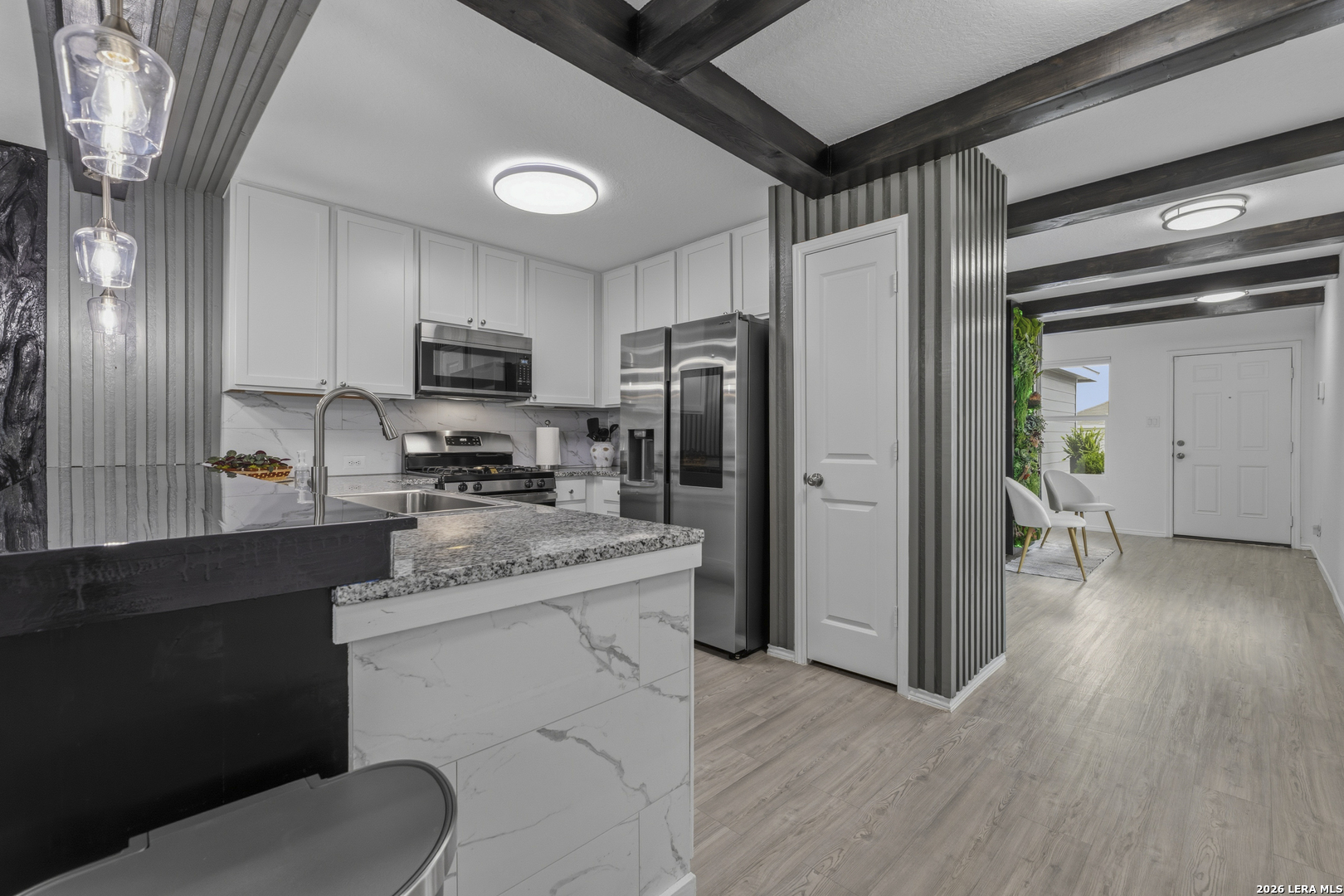 OPEN HOUSE THIS SUNDAY 4/26 FROM 12-4PM. This striking, re-imagined 4-bedroom, 2-bath home with a 2-car garage offers 1,606 square feet of beautifully updated living space and standout design you do not see every day. From the moment you arrive, the custom landscaping, modern hardscaping, and bold exterior styling create unforgettable curb appeal. Inside, the home is filled with designer touches, including dramatic exposed beams, sleek contemporary lighting, custom accent walls, and an open-concept layout that feels both stylish and inviting. The living area is a true showpiece with a stunning fireplace feature wall and seamless flow into the dining and kitchen spaces. The kitchen shines with granite countertops, stainless steel appliances, crisp white cabinetry, and a breakfast bar perfect for everyday living and entertaining. The spacious primary suite offers a relaxing retreat, while the secondary bedrooms provide flexibility for guests, hobbies, or a home office. All TV's remain except in the secondary bedroom at the end of the hallway. Throughout the home, thoughtful updates and unique finishes give each space character and a polished, custom feel. Step outside to enjoy an incredible backyard setup featuring a one-of-a-kind covered patio structure with modern lines and plenty of room to lounge, entertain, or unwind. The outdoor spaces have been carefully designed to extend the home's style beyond the interior, making this property as impressive outside as it is inside. Located in a neighborhood with fantastic amenities, residents enjoy access to a large community pool and playground for even more recreation and fun. This is not your typical builder-grade home-thoughtful upgrades, custom finishes, and standout design choices have transformed it into a space that feels elevated, stylish, and truly one of a kind.