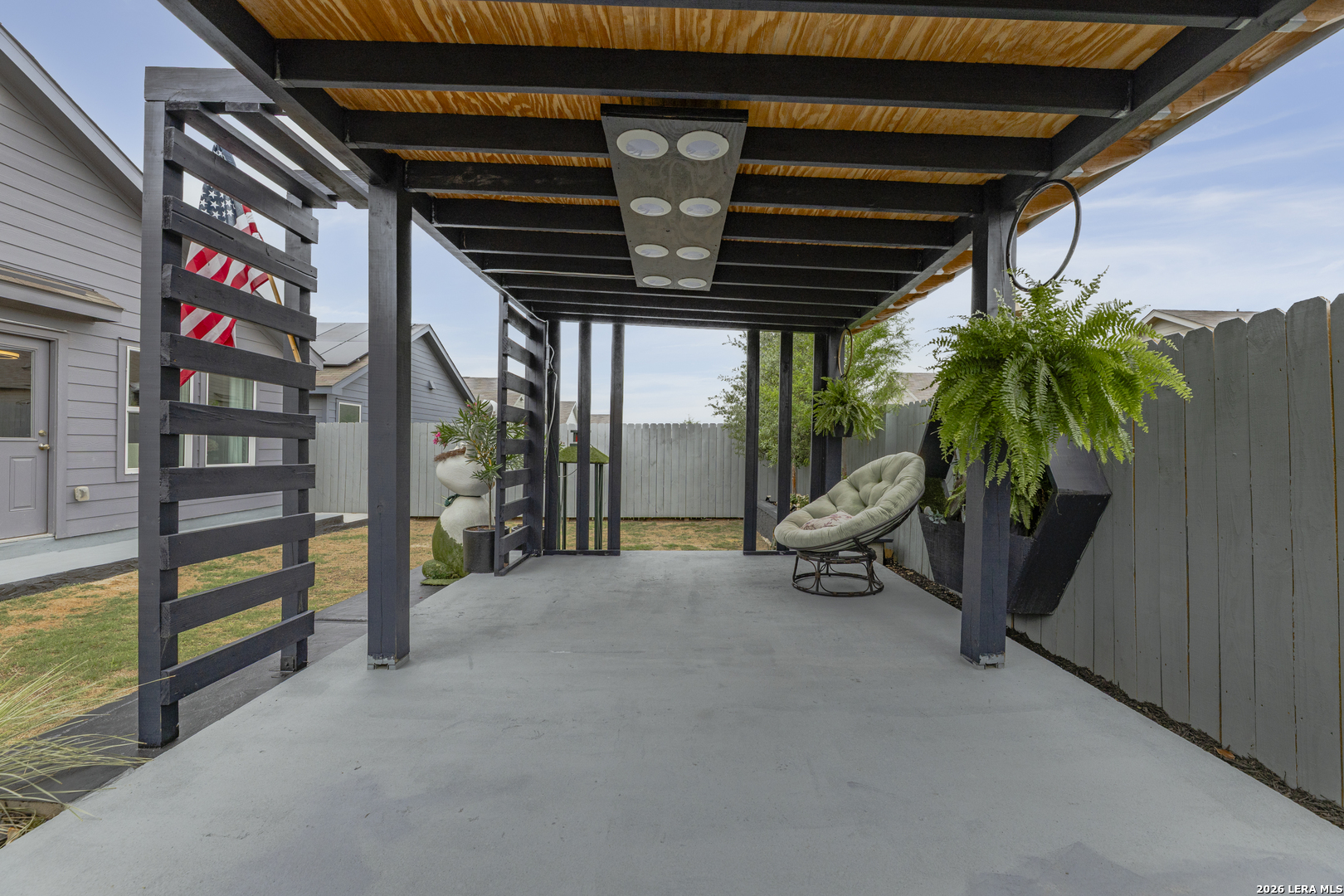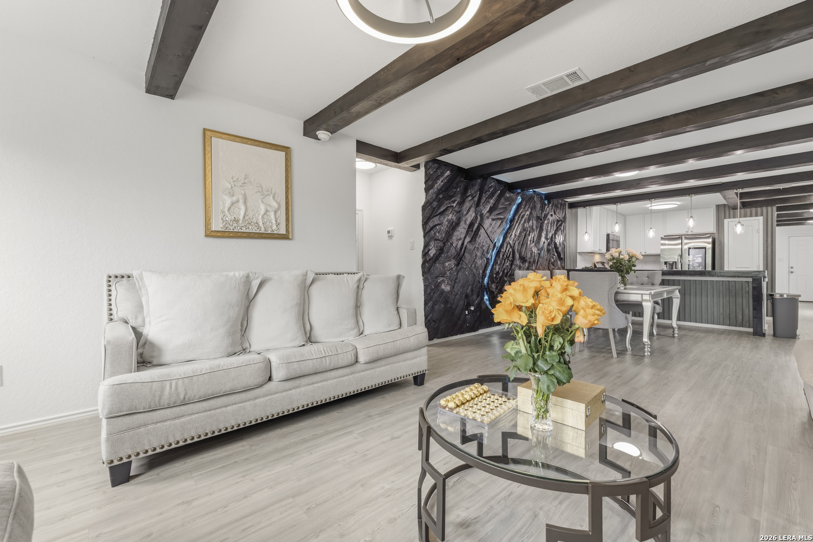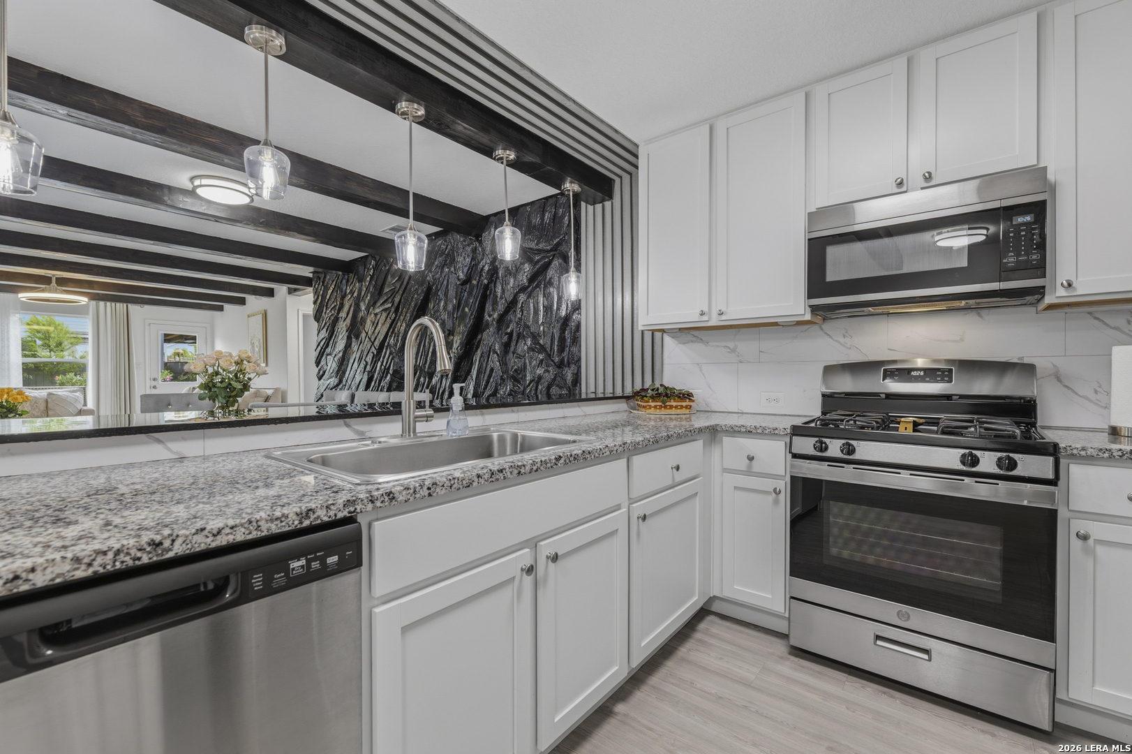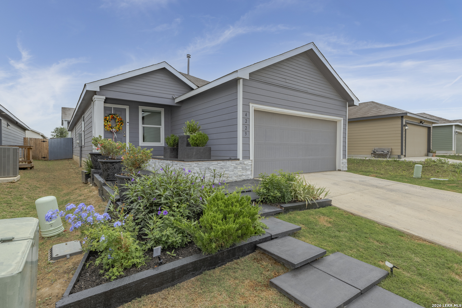 OPEN HOUSE THIS SUNDAY 4/26 FROM 12-4PM. This striking, re-imagined 4-bedroom, 2-bath home with a 2-car garage offers 1,606 square feet of beautifully updated living space and standout design you do not see every day. From the moment you arrive, the custom landscaping, modern hardscaping, and bold exterior styling create unforgettable curb appeal. Inside, the home is filled with designer touches, including dramatic exposed beams, sleek contemporary lighting, custom accent walls, and an open-concept layout that feels both stylish and inviting. The living area is a true showpiece with a stunning fireplace feature wall and seamless flow into the dining and kitchen spaces. The kitchen shines with granite countertops, stainless steel appliances, crisp white cabinetry, and a breakfast bar perfect for everyday living and entertaining. The spacious primary suite offers a relaxing retreat, while the secondary bedrooms provide flexibility for guests, hobbies, or a home office. All TV's remain except in the secondary bedroom at the end of the hallway. Throughout the home, thoughtful updates and unique finishes give each space character and a polished, custom feel. Step outside to enjoy an incredible backyard setup featuring a one-of-a-kind covered patio structure with modern lines and plenty of room to lounge, entertain, or unwind. The outdoor spaces have been carefully designed to extend the home's style beyond the interior, making this property as impressive outside as it is inside. Located in a neighborhood with fantastic amenities, residents enjoy access to a large community pool and playground for even more recreation and fun. This is not your typical builder-grade home-thoughtful upgrades, custom finishes, and standout design choices have transformed it into a space that feels elevated, stylish, and truly one of a kind.