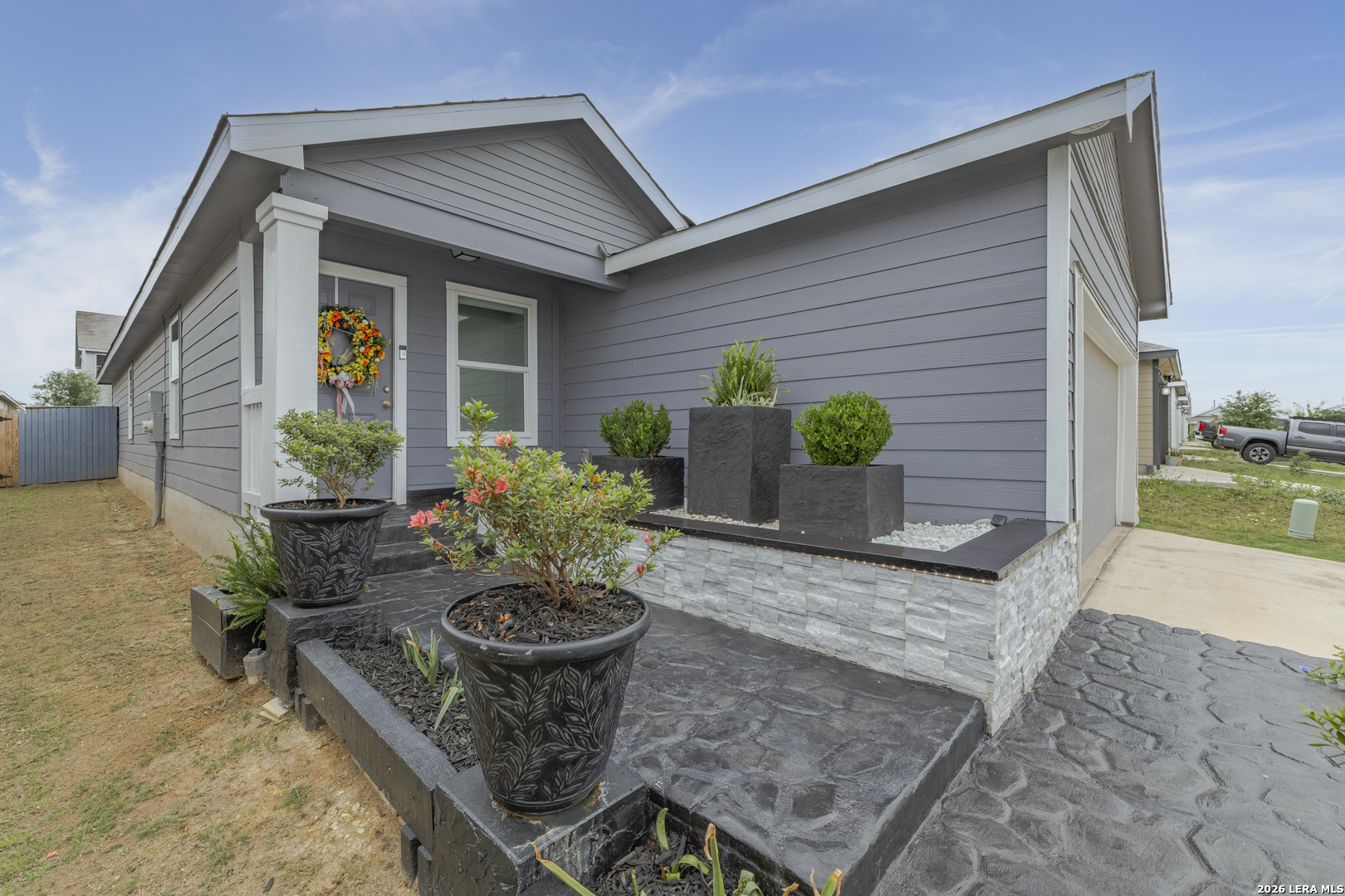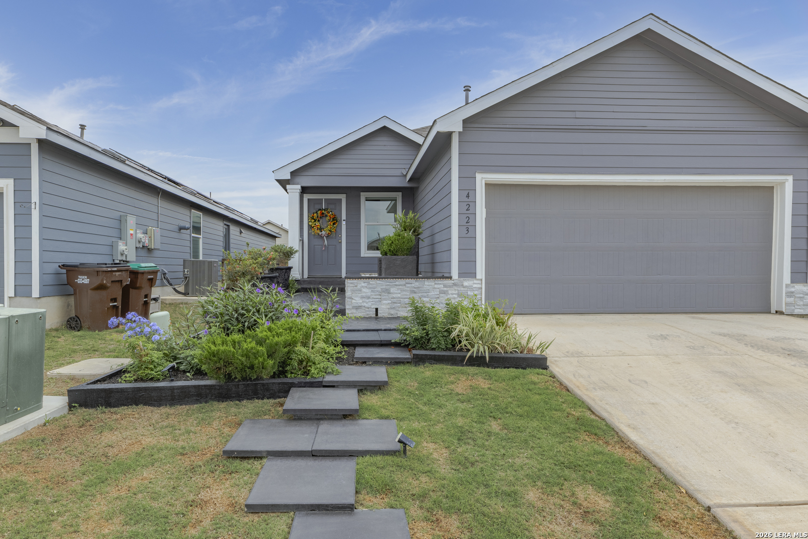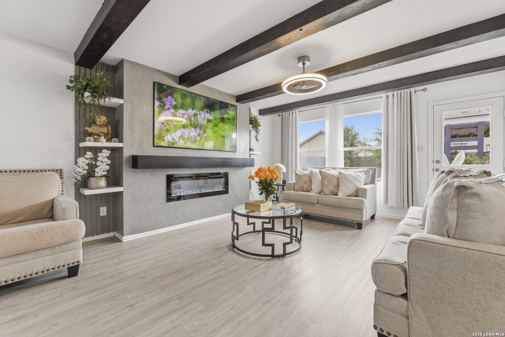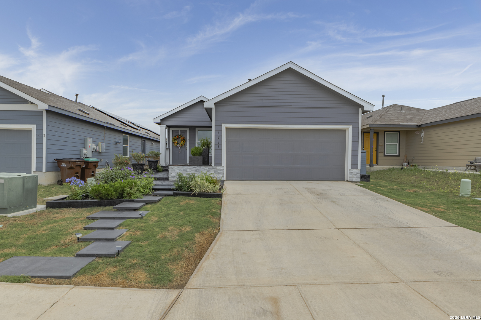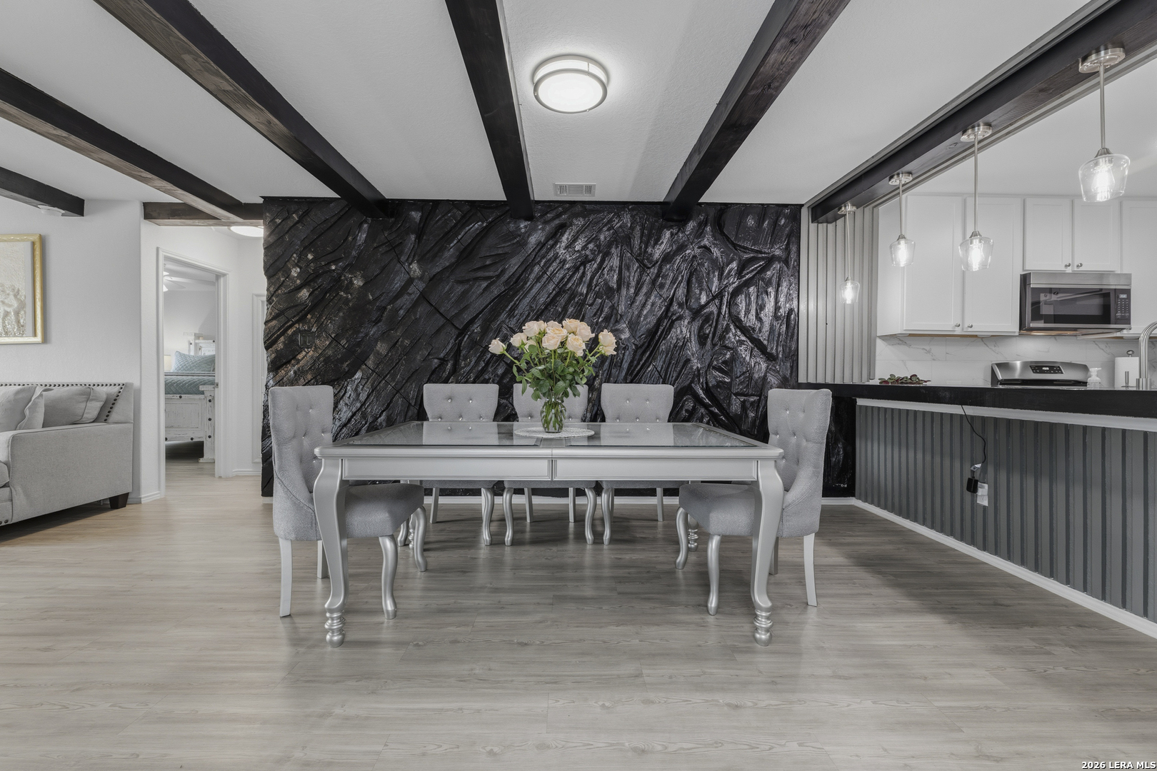 OPEN HOUSE THIS SUNDAY 4/26 FROM 12-4PM. This striking, re-imagined 4-bedroom, 2-bath home with a 2-car garage offers 1,606 square feet of beautifully updated living space and standout design you do not see every day. From the moment you arrive, the custom landscaping, modern hardscaping, and bold exterior styling create unforgettable curb appeal. Inside, the home is filled with designer touches, including dramatic exposed beams, sleek contemporary lighting, custom accent walls, and an open-concept layout that feels both stylish and inviting. The living area is a true showpiece with a stunning fireplace feature wall and seamless flow into the dining and kitchen spaces. The kitchen shines with granite countertops, stainless steel appliances, crisp white cabinetry, and a breakfast bar perfect for everyday living and entertaining. The spacious primary suite offers a relaxing retreat, while the secondary bedrooms provide flexibility for guests, hobbies, or a home office. All TV's remain except in the secondary bedroom at the end of the hallway. Throughout the home, thoughtful updates and unique finishes give each space character and a polished, custom feel. Step outside to enjoy an incredible backyard setup featuring a one-of-a-kind covered patio structure with modern lines and plenty of room to lounge, entertain, or unwind. The outdoor spaces have been carefully designed to extend the home's style beyond the interior, making this property as impressive outside as it is inside. Located in a neighborhood with fantastic amenities, residents enjoy access to a large community pool and playground for even more recreation and fun. This is not your typical builder-grade home-thoughtful upgrades, custom finishes, and standout design choices have transformed it into a space that feels elevated, stylish, and truly one of a kind.