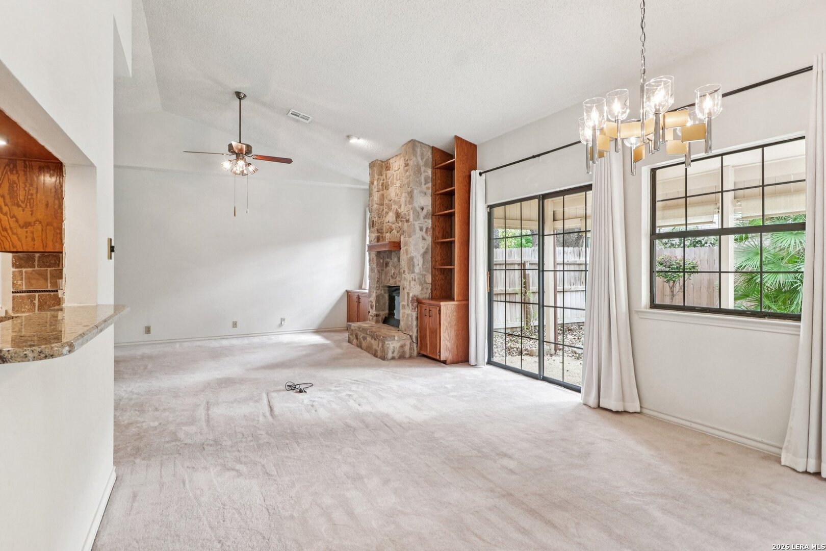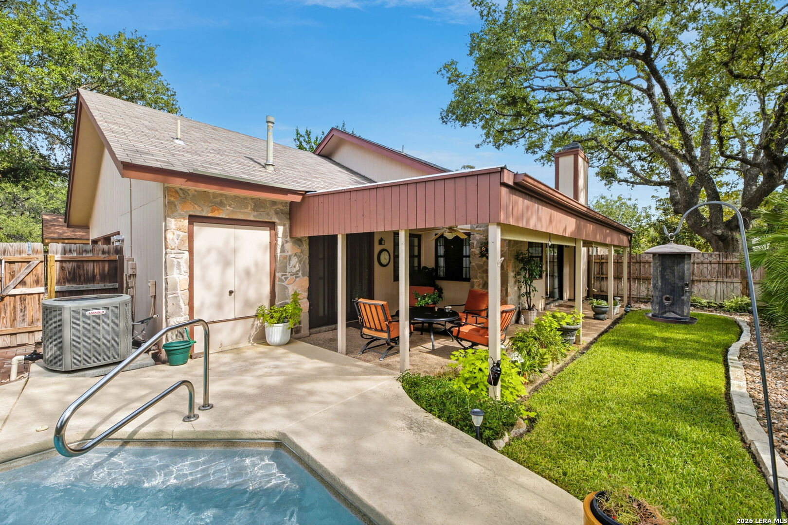 Single Story Home with Pool in Woods of Shavano | 4 Bedrooms | Over 2,000 Sq Ft | Updated Kitchen & Primary Bath Rare opportunities like this do not come available often in the highly sought after Woods of Shavano community. This spacious single-story home offers 2,025 square feet, four generously sized bedrooms, two updated bathrooms, and a backyard designed for both relaxation and entertaining. From the moment you arrive, the mature trees, established landscaping, and inviting curb appeal set the tone for what this home offers inside. The interior welcomes you with soaring ceilings, a large open living area, and expansive windows that fill the space with natural light. A beautiful stone fireplace serves as the focal point of the living room, creating a warm and inviting atmosphere while built-in cabinetry adds both character and functionality. The kitchen has been tastefully updated with granite countertops, a stone backsplash, stainless steel appliances, abundant cabinetry, and extensive countertop workspace-perfect for both everyday cooking and hosting gatherings. The home also offers two dining areas including a formal dining room and a breakfast nook just off the kitchen, giving flexibility for entertaining or casual meals. The primary suite is oversized and filled with natural light, offering a peaceful retreat from the rest of the home. The renovated primary bathroom features a large walk-in shower, dual vanity with granite countertops, updated fixtures, and a spacious walk-in closet. Secondary bedrooms are all well sized with ceiling fans, ample closet space, and flexible use for guests, family, or a home office. The true highlight of this property is the outdoor living space. Step outside to a massive covered patio ideal for year-round enjoyment. The backyard features a beautiful in-ground pool, mature landscaping, and additional outdoor seating areas that create a private backyard retreat. A storage shed adds extra functionality while the rear entry two-car garage with alley access helps maintain the clean front streetscape that makes this neighborhood so desirable. Additional highlights include: * Interior laundry room with storage cabinets * Updated bathrooms with granite countertops * Multiple living and dining spaces * Rear entry garage * Established neighborhood with mature trees Location is another major advantage. The home is conveniently located just minutes from the Medical Center, USAA, Loop 1604, Interstate 10, and major shopping and dining destinations, making commuting simple while keeping everyday conveniences close by. Homes with this combination of size, location, updates, and a private pool rarely become available in Woods of Shavano. Woods of Shavano homes for sale, San Antonio homes with pool, San Antonio single story homes, homes near Medical Center San Antonio, Shavano area homes, San Antonio 4 bedroom homes, San Antonio homes with covered patio, homes with rear entry garage San Antonio, updated homes San Antonio, homes near USAA San Antonio.