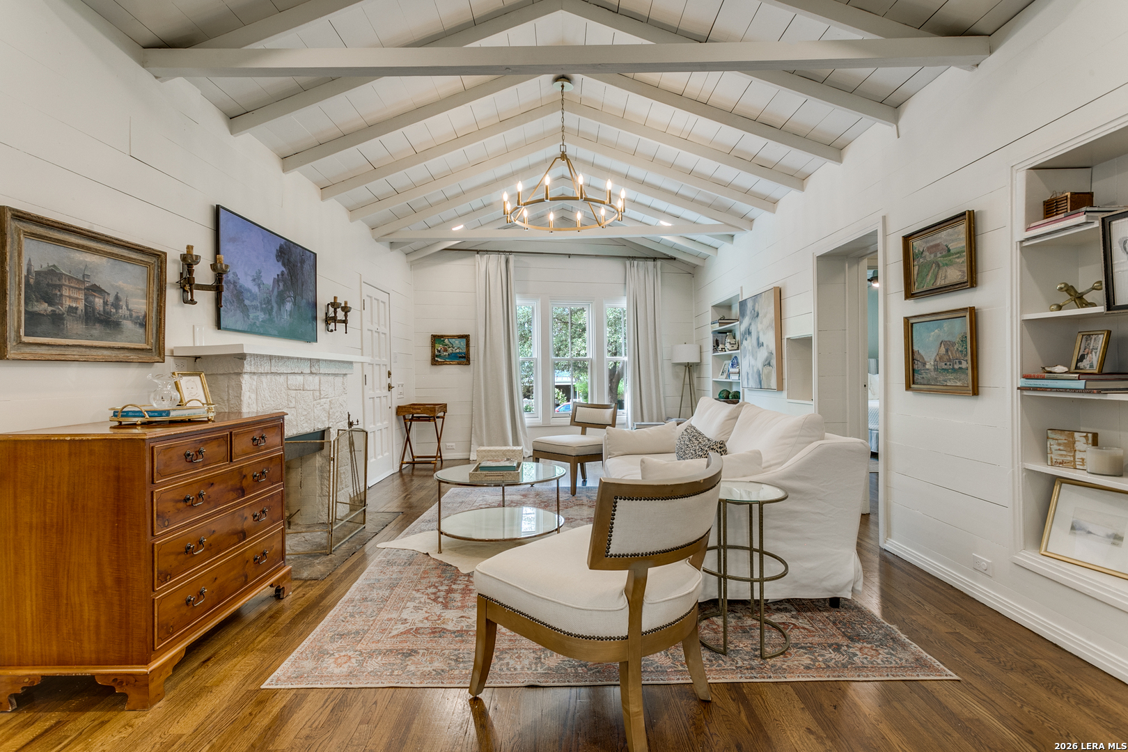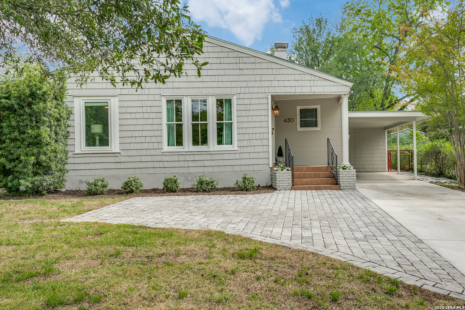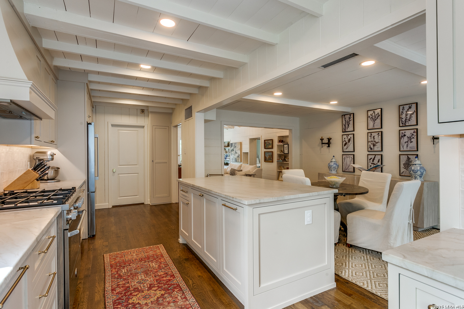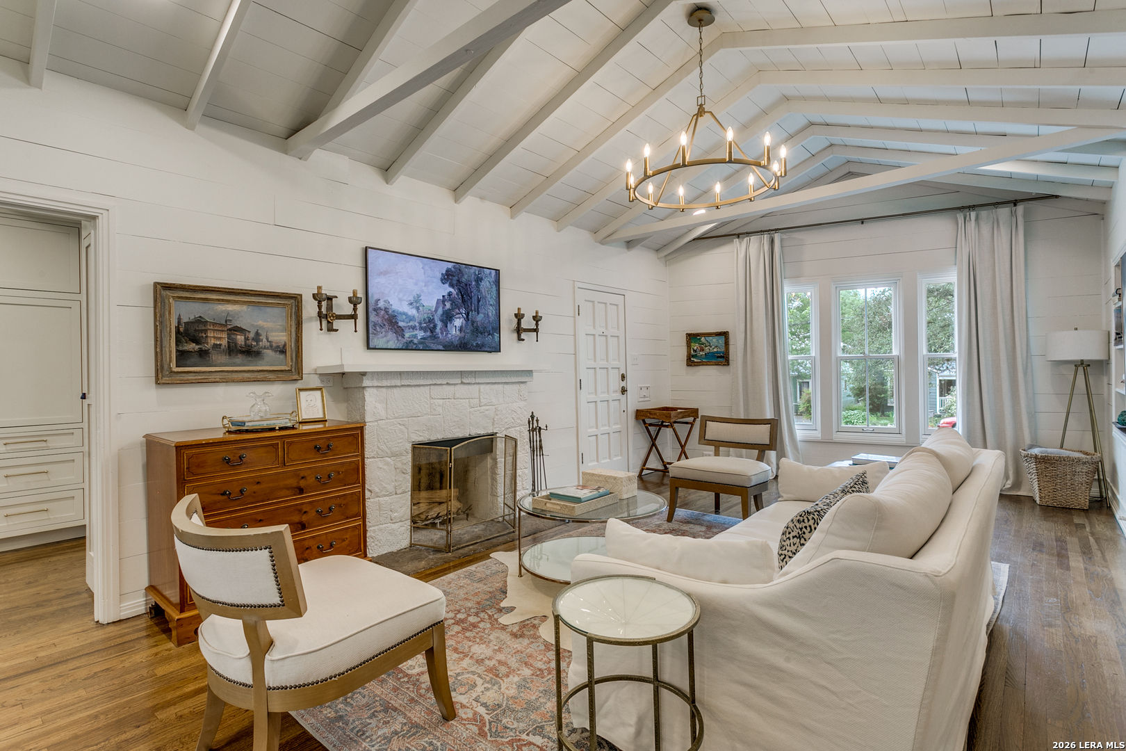 This charming, updated cottage in Alamo Heights is ready for you! Enter into the living room with vaulted ceiling, wood burning fireplace and large picture window looking out to front yard allows for an abundance of natural light. The beautifully updated chef's kitchen with honed quartzite countertops, custom cabinetry, gas range, built-in beverage refrigerator overlooks dining area and back patio.