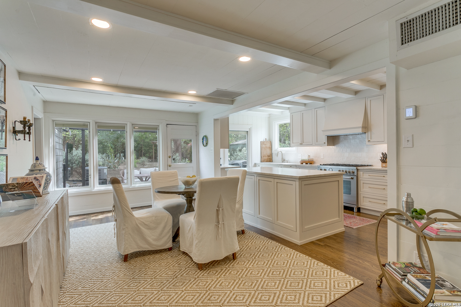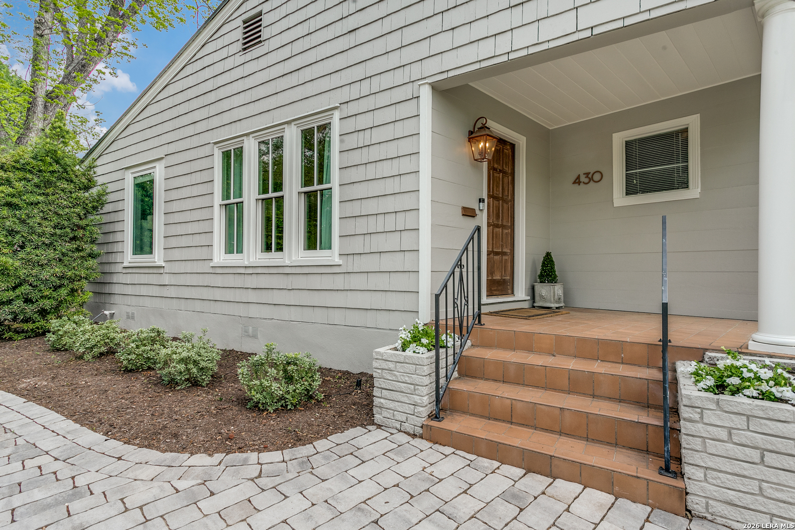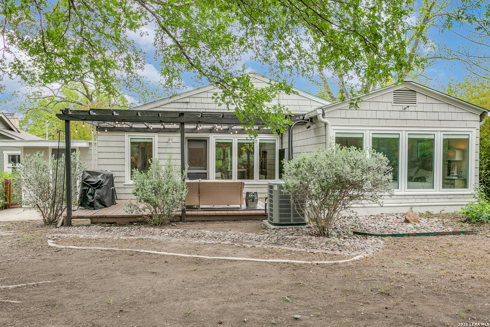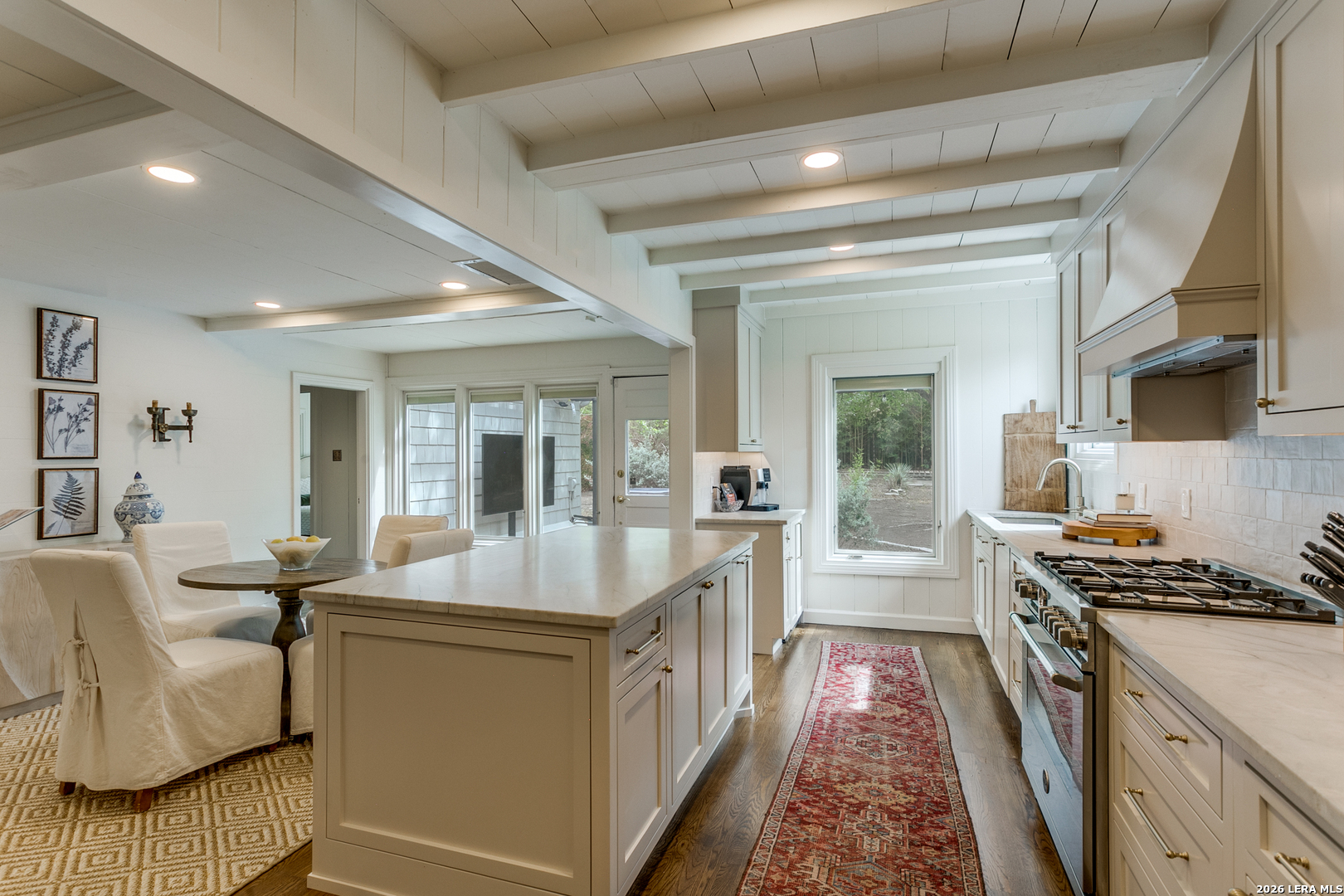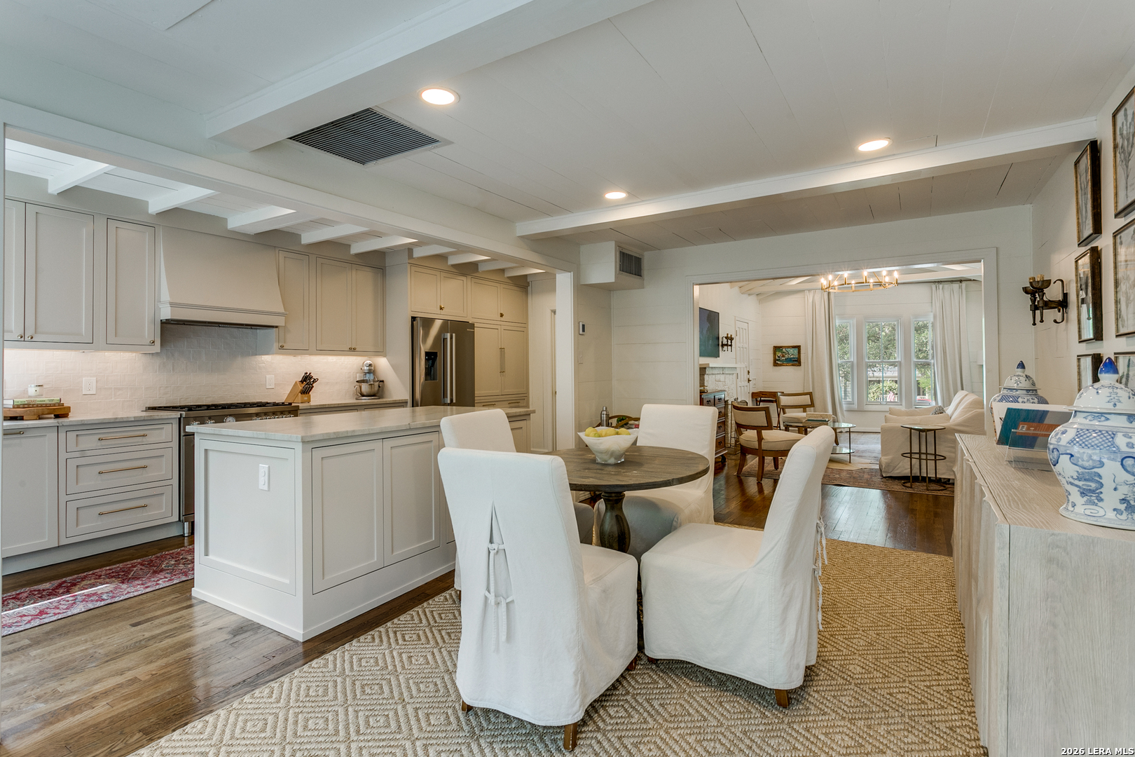This charming, updated cottage in Alamo Heights is ready for you! Enter into the living room with vaulted ceiling, wood burning fireplace and large picture window looking out to front yard allows for an abundance of natural light. The beautifully updated chef's kitchen with honed quartzite countertops, custom cabinetry, gas range, built-in beverage refrigerator overlooks dining area and back patio.