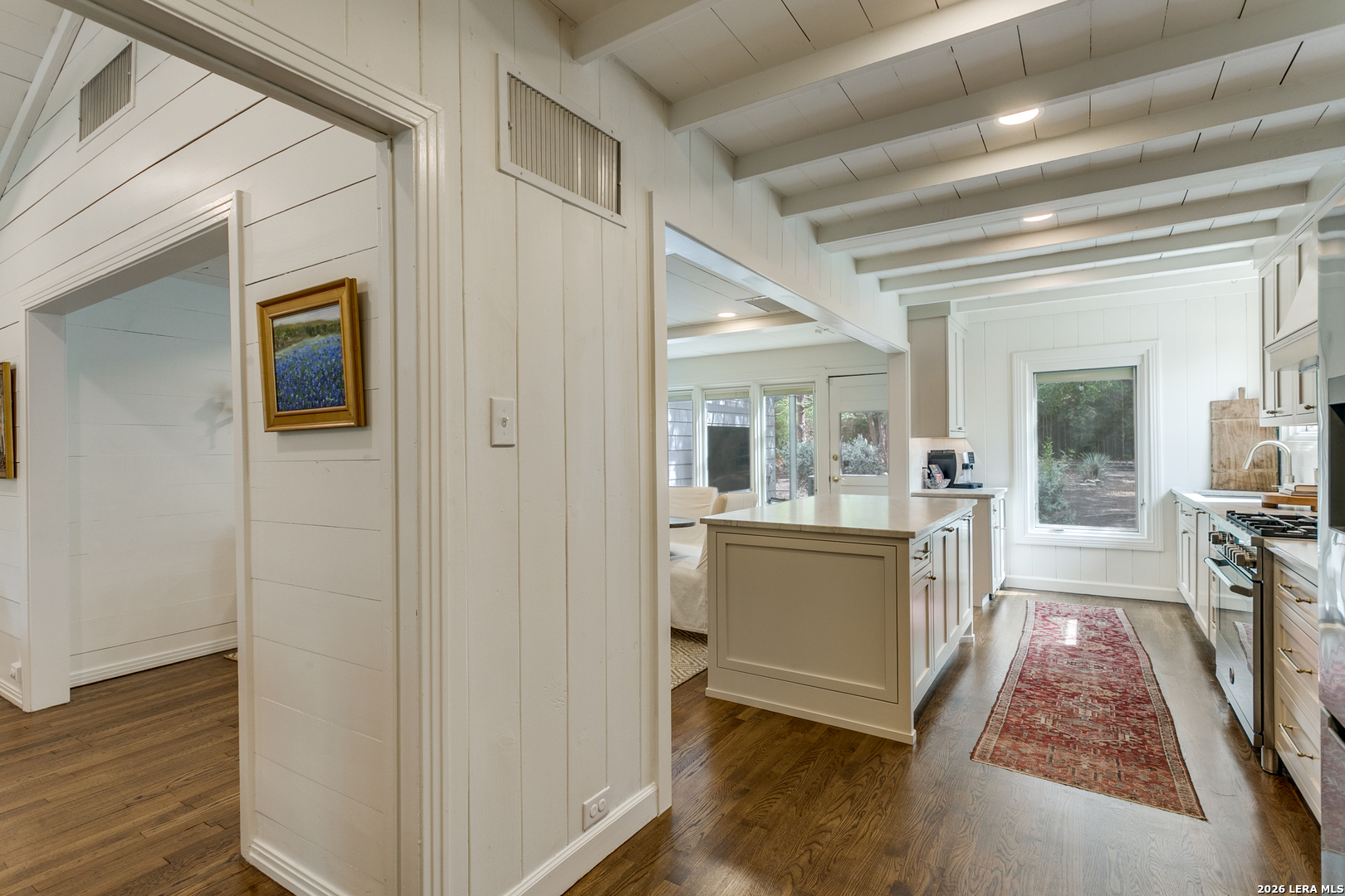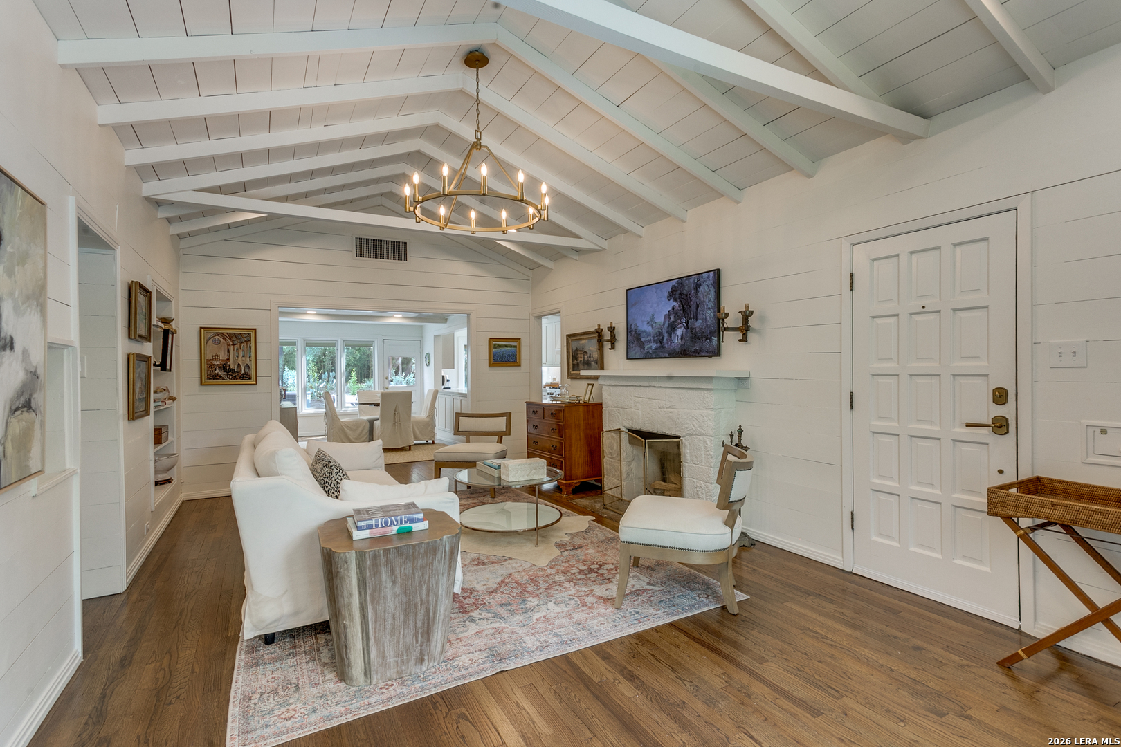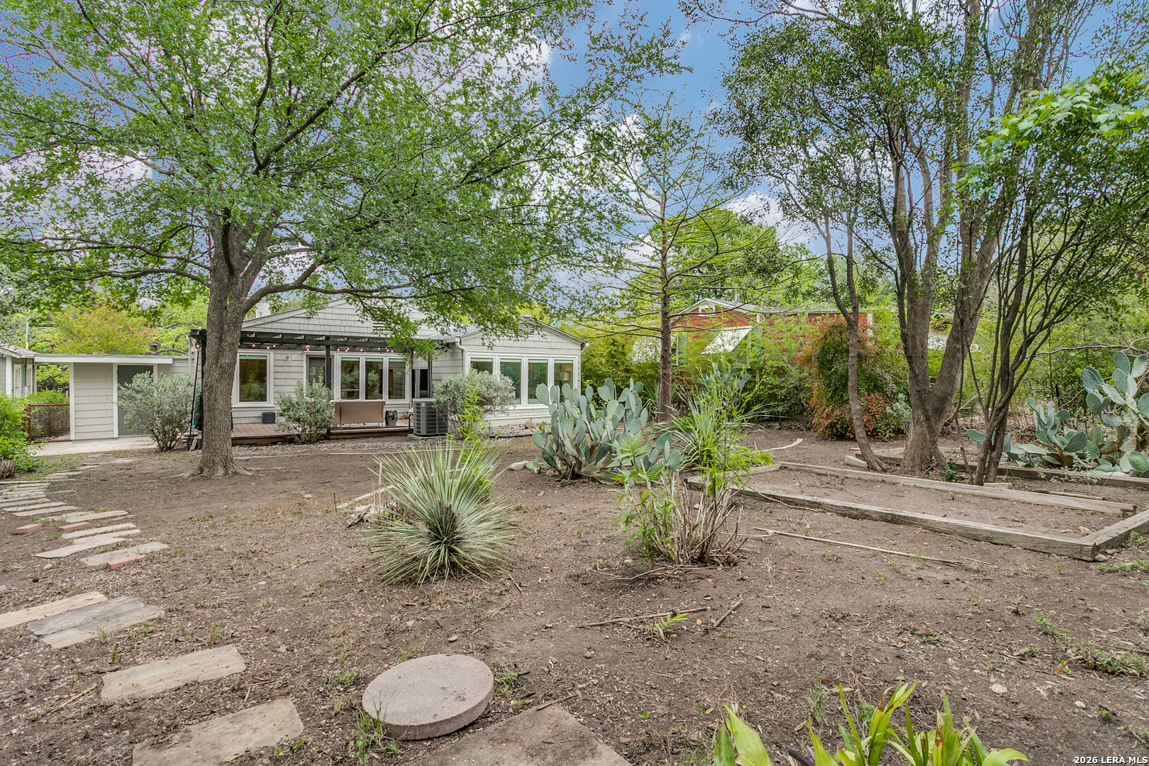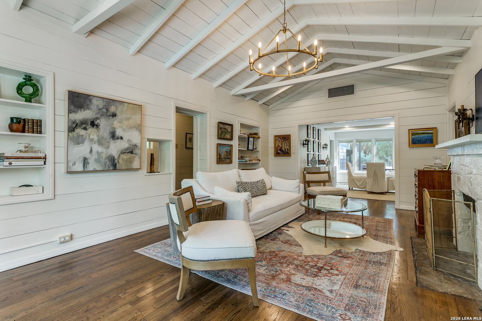 This charming, updated cottage in Alamo Heights is ready for you! Enter into the living room with vaulted ceiling, wood burning fireplace and large picture window looking out to front yard allows for an abundance of natural light. The beautifully updated chef's kitchen with honed quartzite countertops, custom cabinetry, gas range, built-in beverage refrigerator overlooks dining area and back patio.