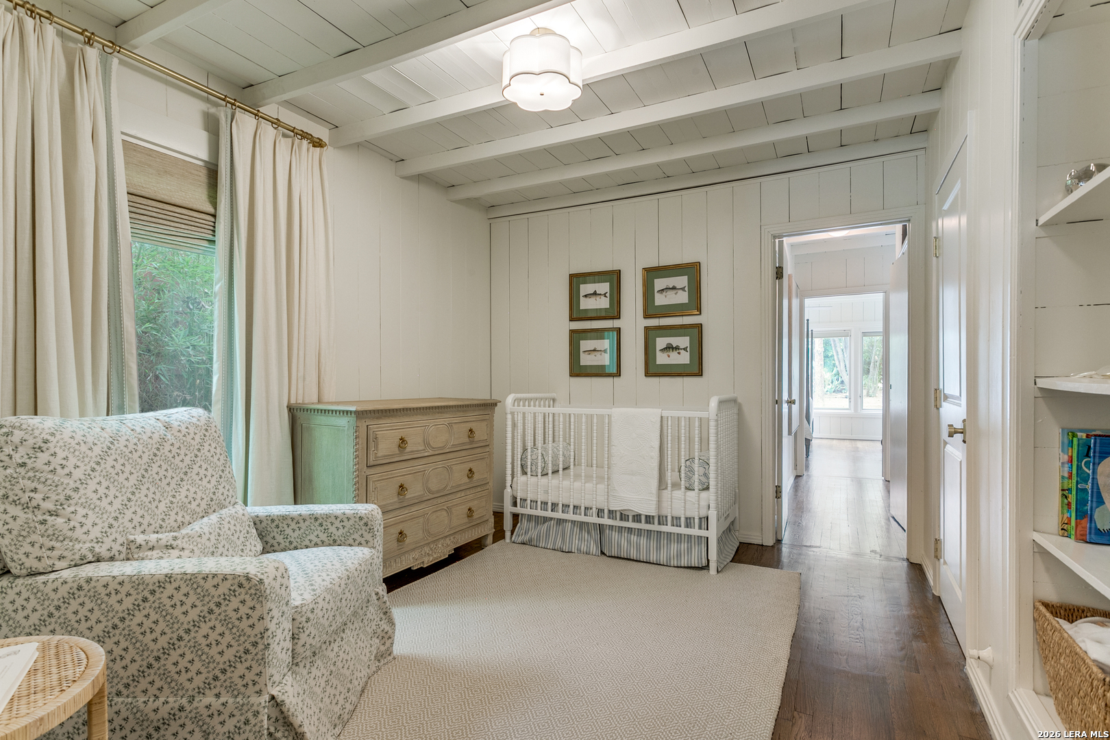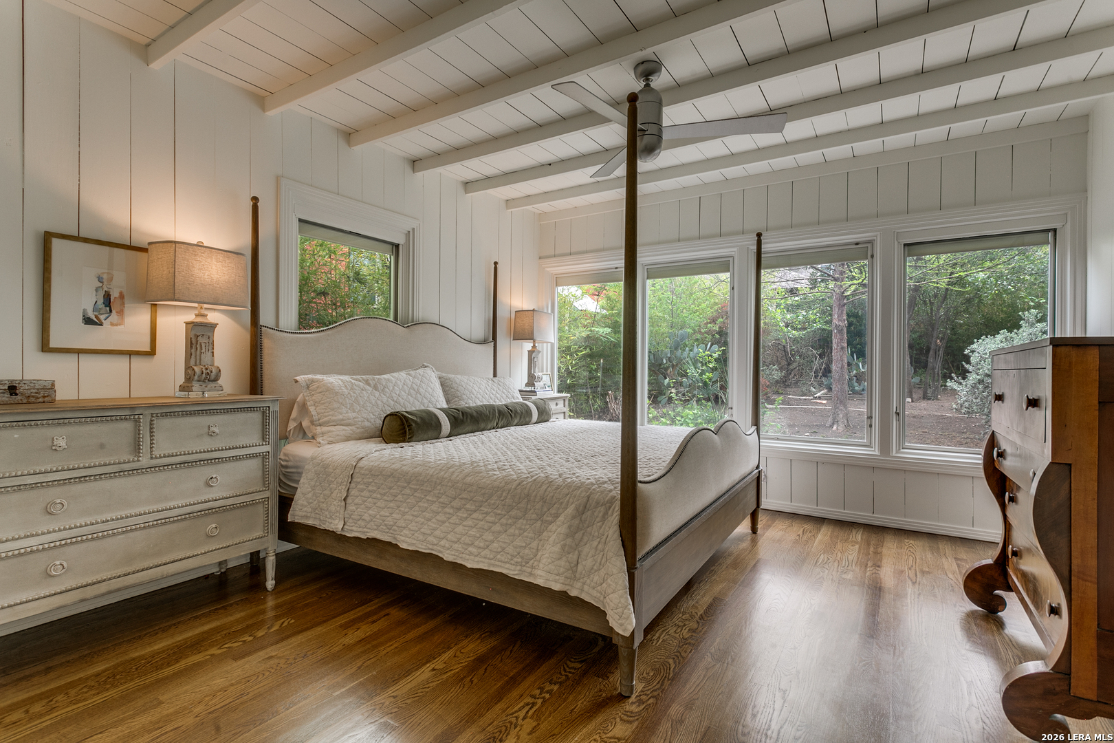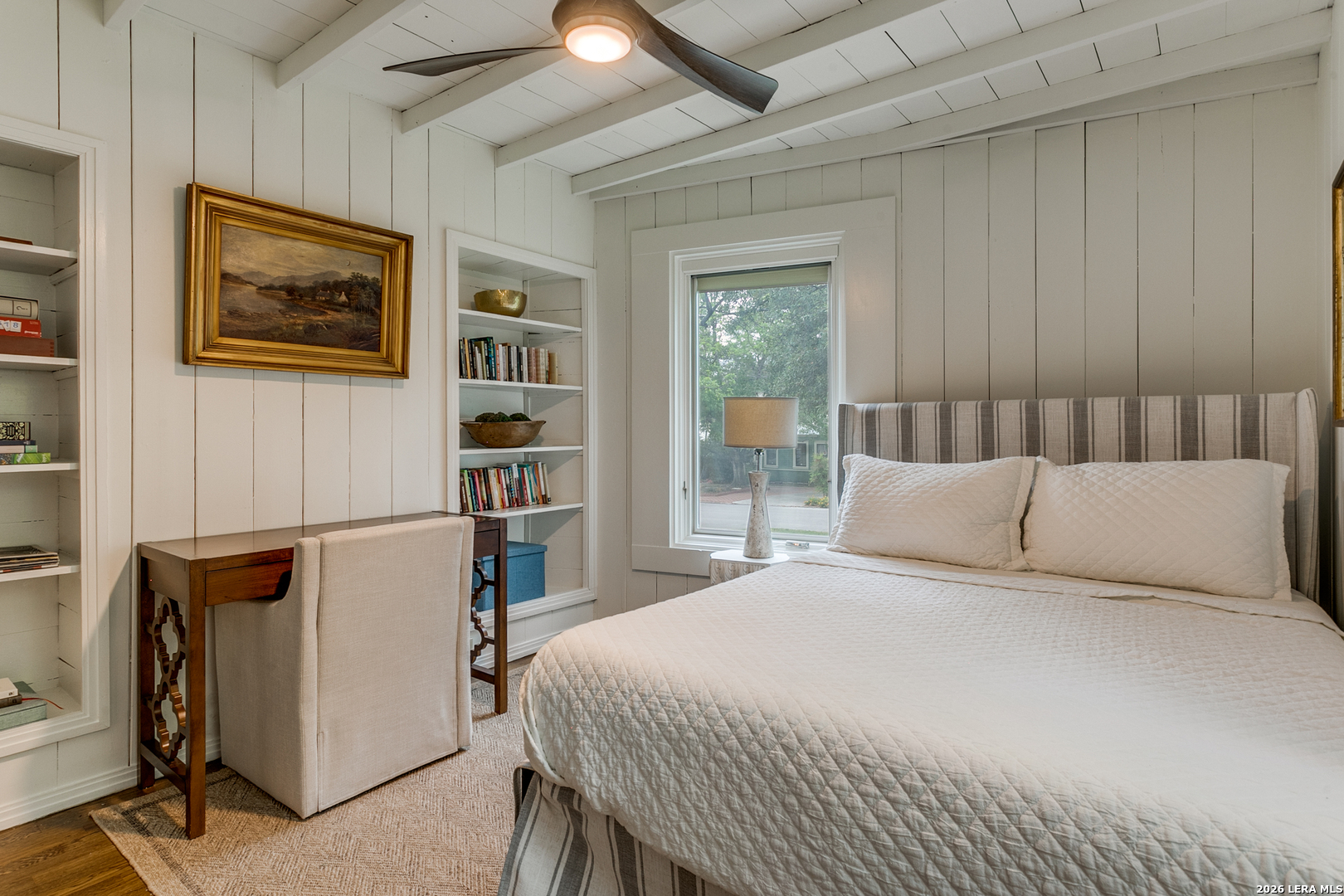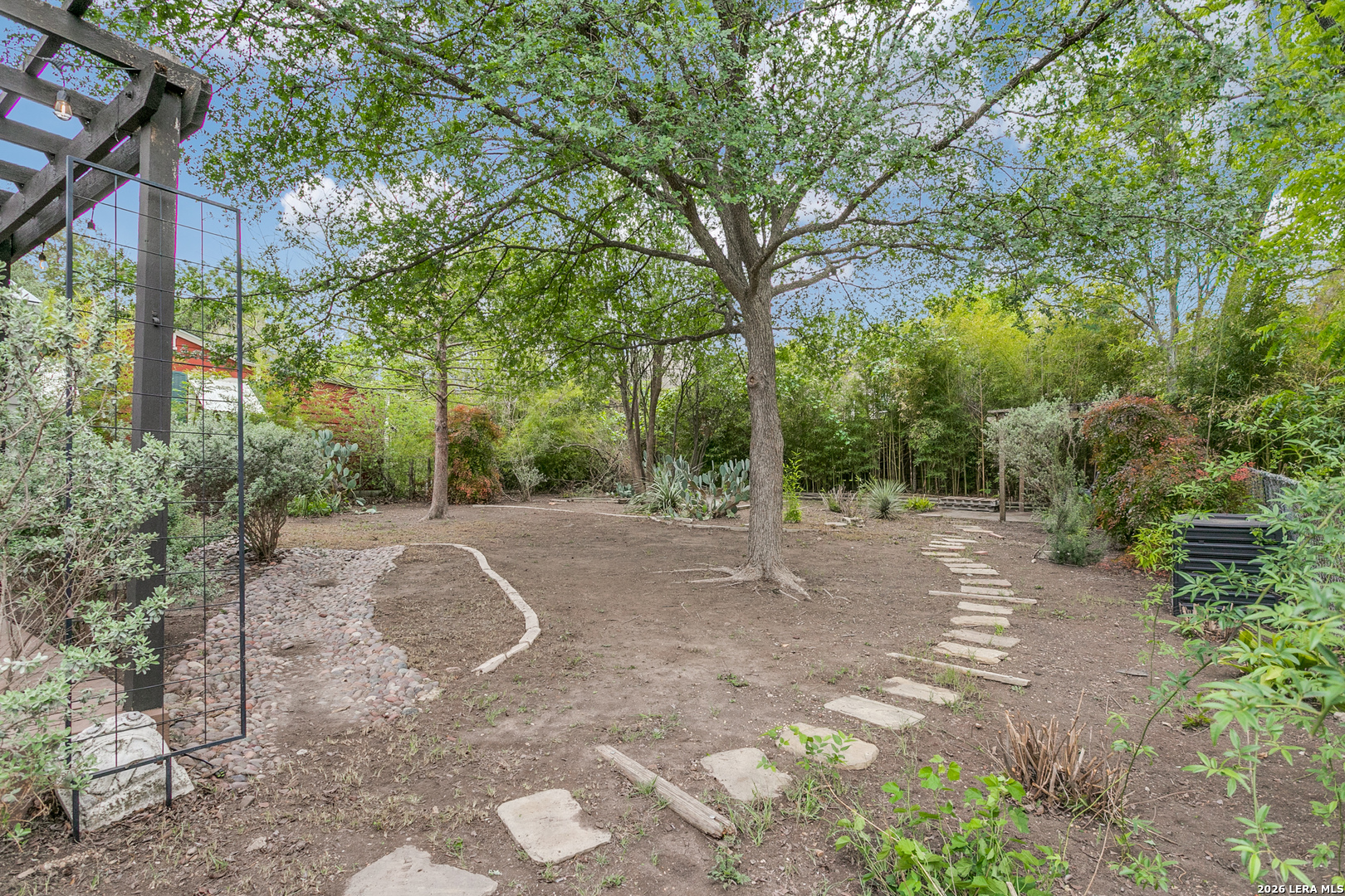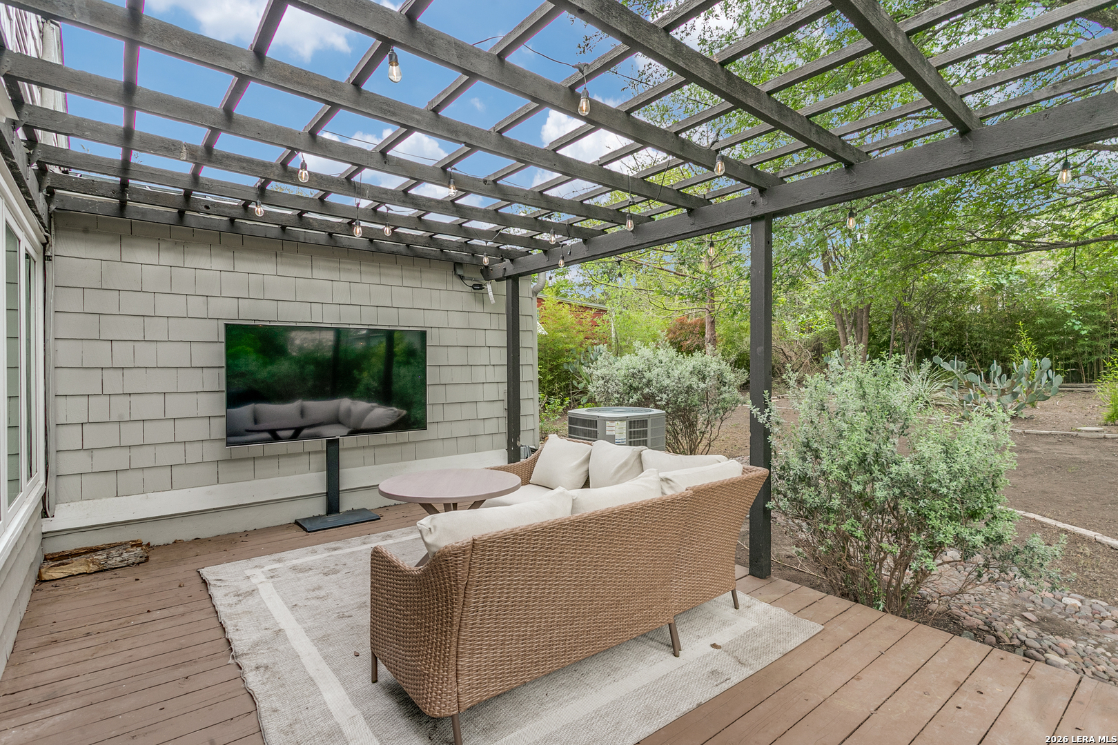 This charming, updated cottage in Alamo Heights is ready for you! Enter into the living room with vaulted ceiling, wood burning fireplace and large picture window looking out to front yard allows for an abundance of natural light. The beautifully updated chef's kitchen with honed quartzite countertops, custom cabinetry, gas range, built-in beverage refrigerator overlooks dining area and back patio.