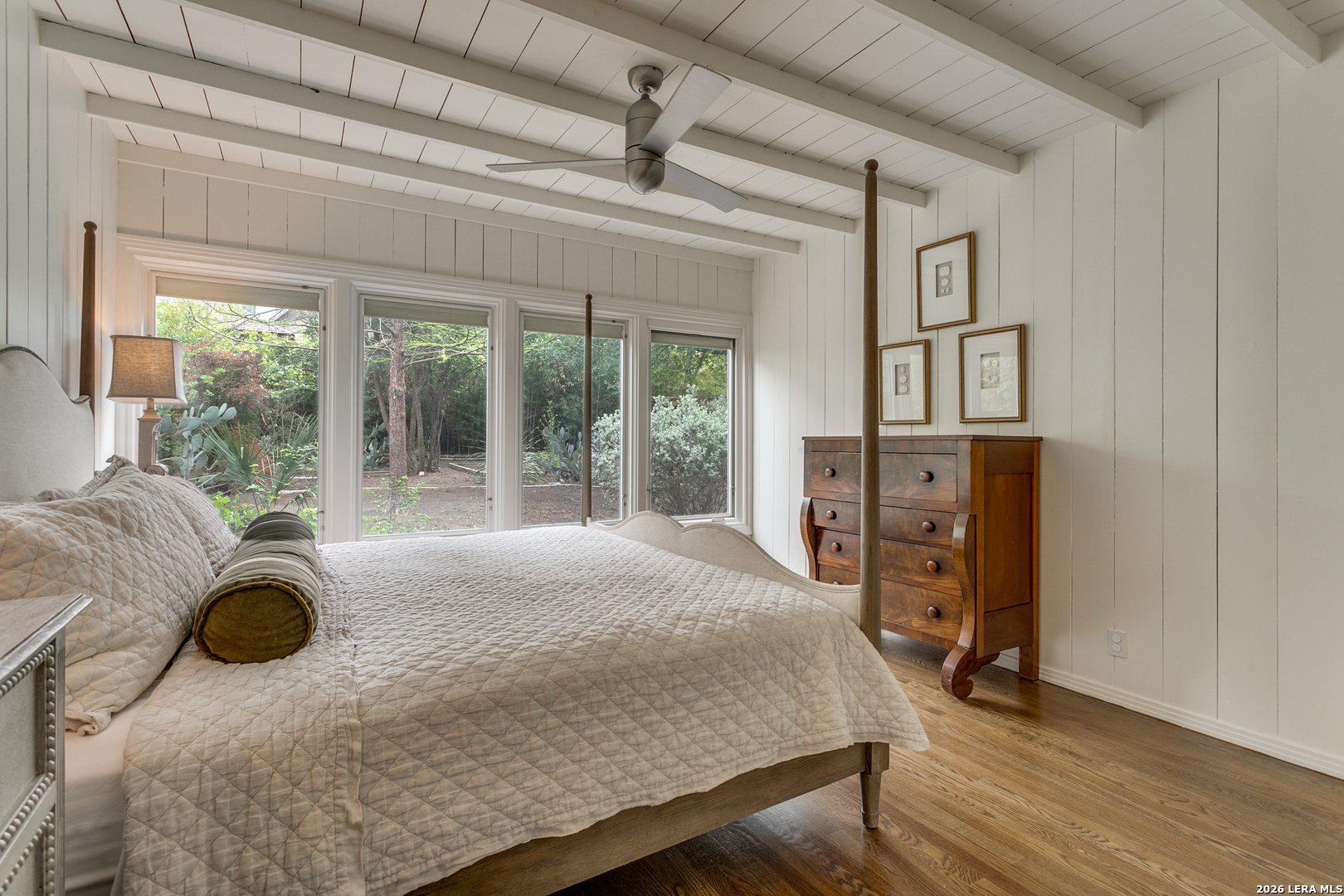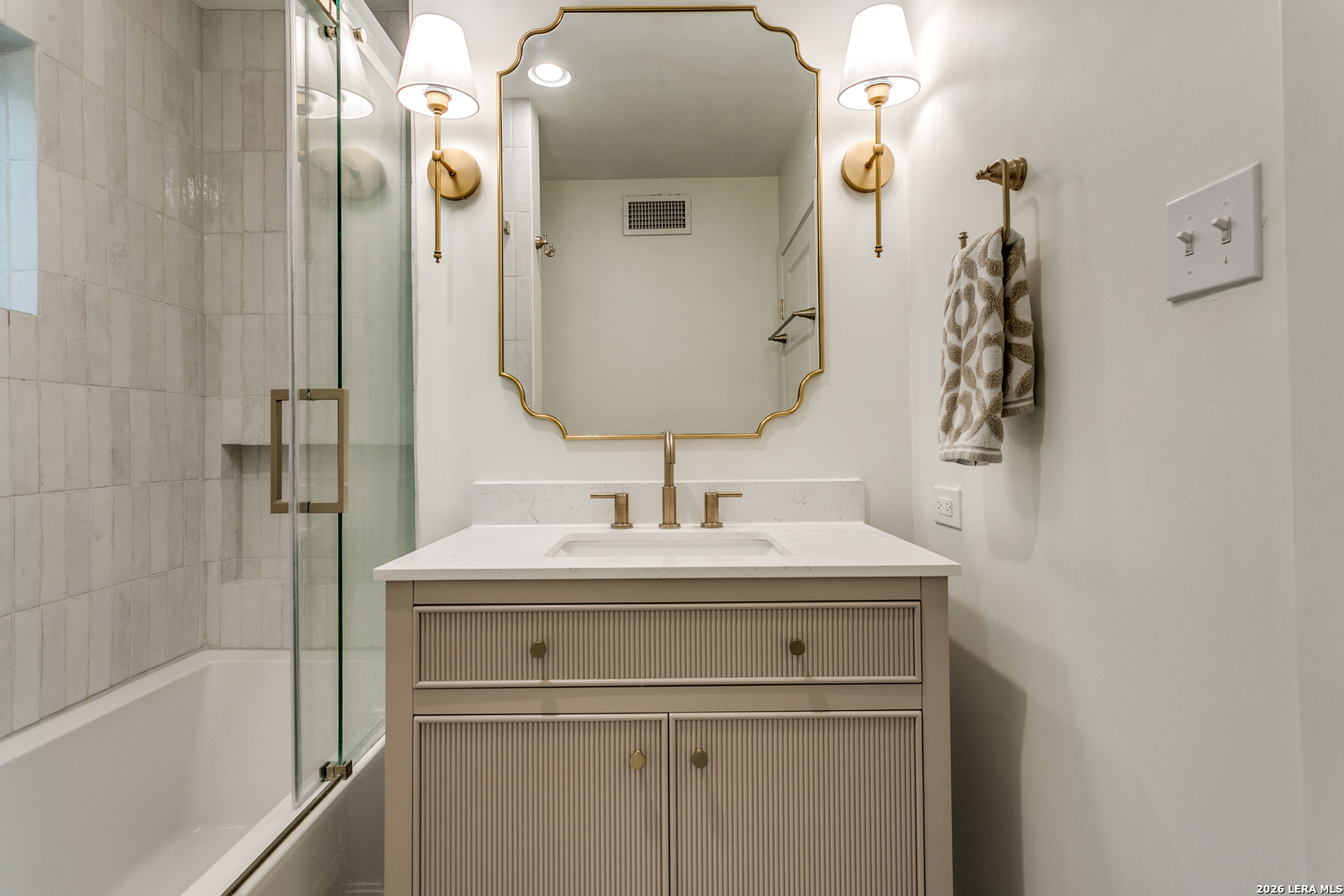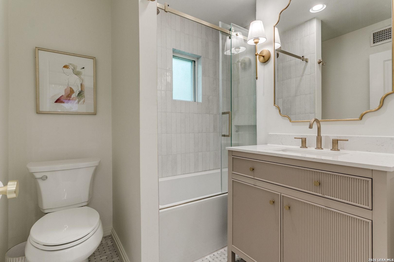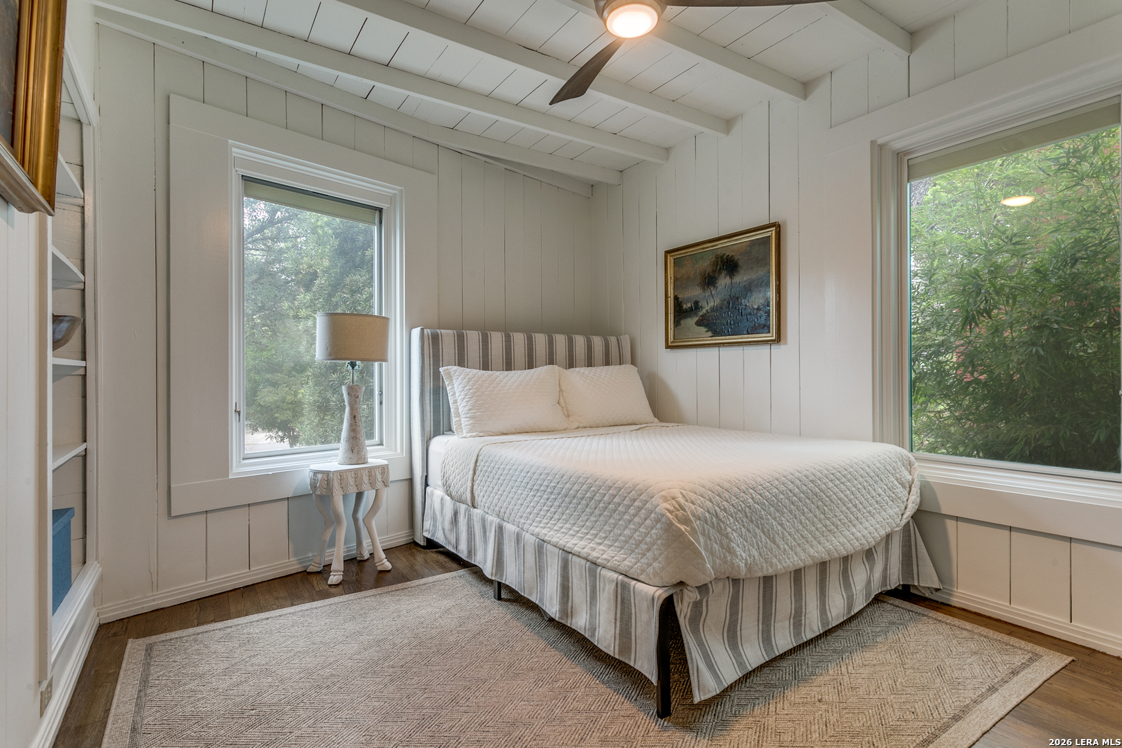 This charming, updated cottage in Alamo Heights is ready for you! Enter into the living room with vaulted ceiling, wood burning fireplace and large picture window looking out to front yard allows for an abundance of natural light. The beautifully updated chef's kitchen with honed quartzite countertops, custom cabinetry, gas range, built-in beverage refrigerator overlooks dining area and back patio.