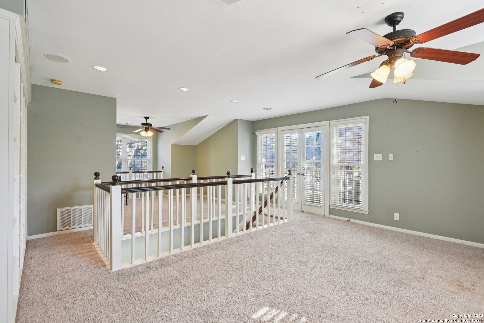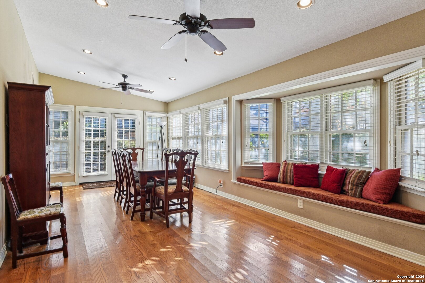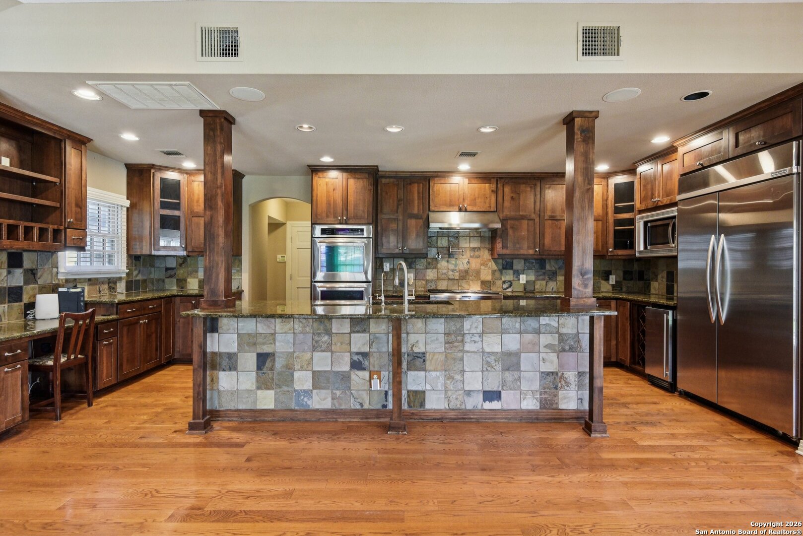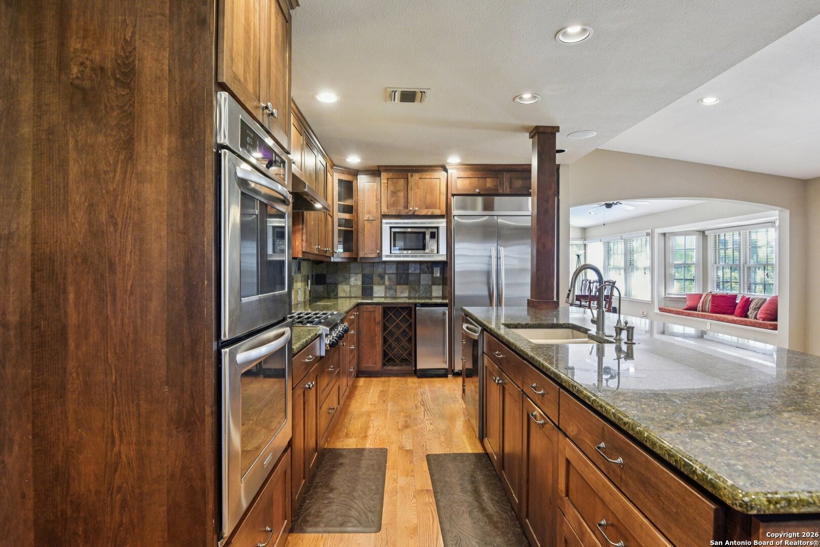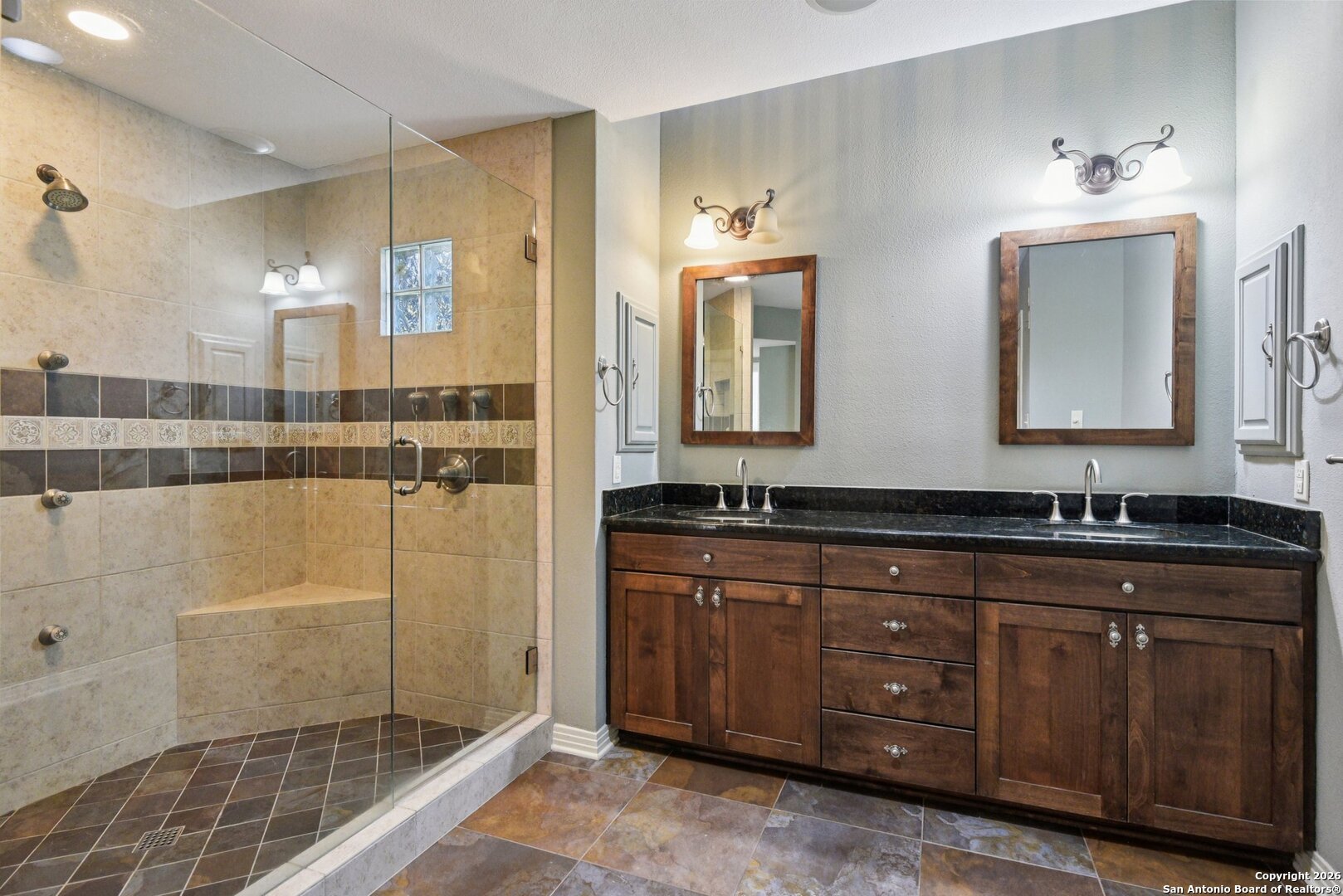 Welcome home to this AMAZING corner lot home with unlimited potential. Nestled in Terrell Hills and zoned in the sought-after Alamo Heights School District, this beautifully appointed 4-bedroom, 3.5-bath home offers timeless style, exceptional function, and room to grow. Situated on a spacious .28-acre corner lot with mature trees and plenty of room for a custom swimming pool, this 3,333 sq ft home is designed for both refined living and everyday comfort. The chef's kitchen features high-end appliances, including a gas cooktop, double ovens, warming drawers, and a Sub-Zero refrigerator. Perfect for culinary enthusiasts and entertainers alike. The primary suite is a true retreat, boasting a private staircase leading to an upstairs library/office and media area, complete with a private balcony making it deal for morning coffee or evening reading. Thoughtful floorplan includes two bedrooms upstairs with a shared full bath, and two bedrooms downstairs, including the primary suite. One of the full baths on the main level offers direct access to the covered patio, making it perfect for future poolside entertaining. Warm up in either of the two spacious living areas, each with its own fireplace-one gas and one electric-providing options for ambiance and comfort. Enjoy outdoor living with two patios: one covered for year-round use, and another open to the sky. A full two-car garage offers convenience and storage (also a large shed in the back), completing this exceptional property. A rare opportunity to own a refined, flexible home in one of San Antonio's most desirable neighborhoods.