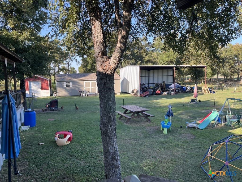 3 bed, 2 bath, 1680 sf mobile home on 10 acres just outside Cameron, minutes from dining & shopping. Private, gated entrance with remote & keypad. Front acreage is fully cross-fenced. Rear pasture is barbed-wire fenced & ready for livestock. A 40x30 metal building with roof & partial walls offers RV/boat parking, storage, or workspace, with water access nearby. Covered carport by kitchen entry. Includes 20x12 storage shed. Home features a covered wraparound porch on 3 sides with views of the stocked tank and visiting wildlife. Mature oak and elm trees provide shade; plum, peach, pear, and fig trees add seasonal fruit. LVP flooring throughout for easy maintenance. No restrictions: hunt, fish, relax, or build to your heart's content.