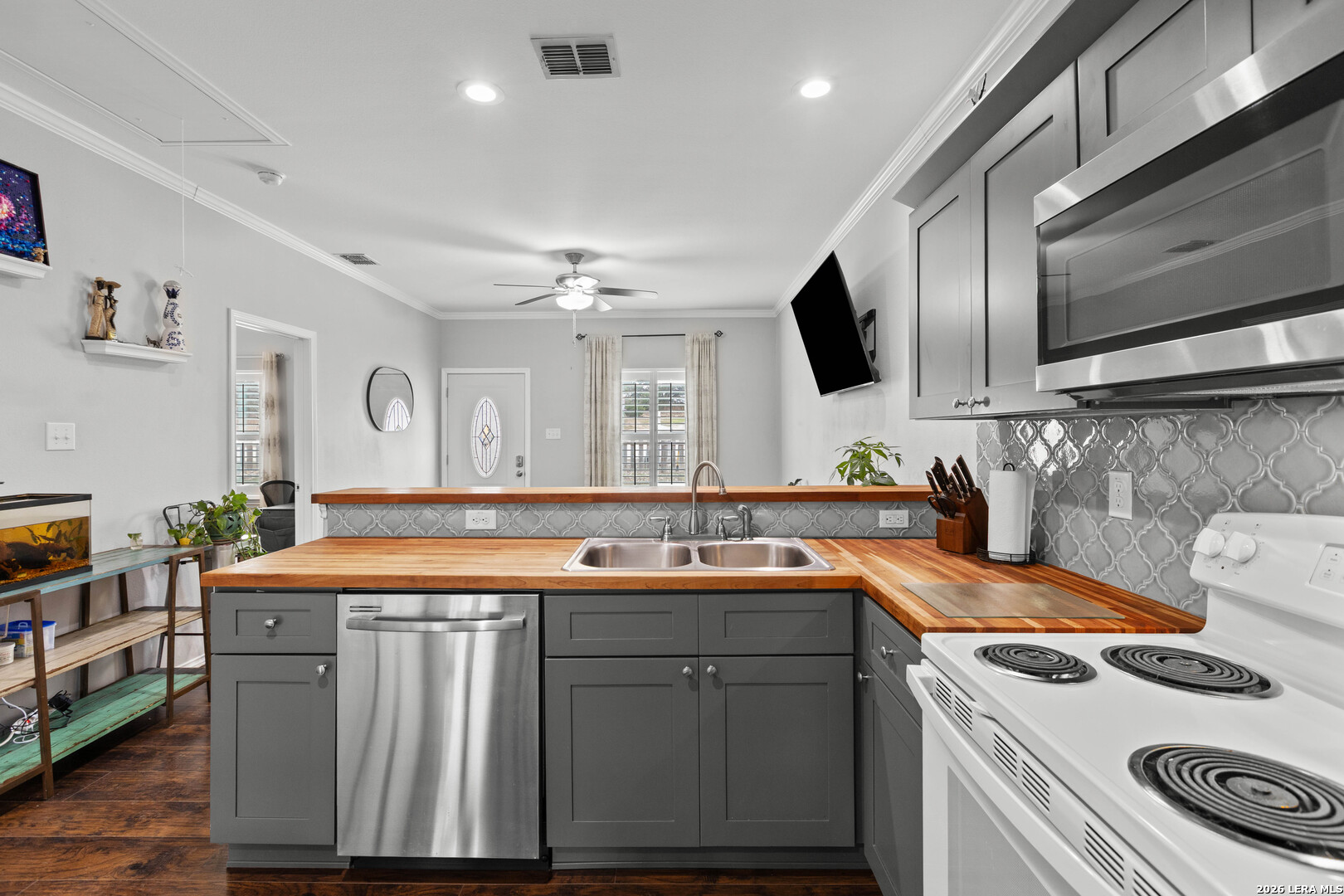 Tucked gently into the heart of the Hill Country with no back neighbors, this 2 bedroom, 2 bath home radiates the kind of warmth and charm that makes life slow down in all the right ways. From the moment you pull up, the inviting curb appeal and cozy character set the tone for a home that has been thoughtfully designed. Step inside to an inviting open floor plan featuring handcrafted wood countertops, a decorative backsplash, crown molding and plantation shutters that elevate the room. Nothing was overlooked and every detail adds to the home's cozy vibe. Outside is where this property truly steals hearts. The curb appeal is top notch, and the fully fenced yard includes a concrete driveway and a picture-perfect two car carport. The oversized backyard is your private Hill Country escape, complete with a cedar post deck, gorgeous views, a mix of grass and xeriscape landscaping, and an 8x10 storage shed. Washer and Dryer are negotiable.