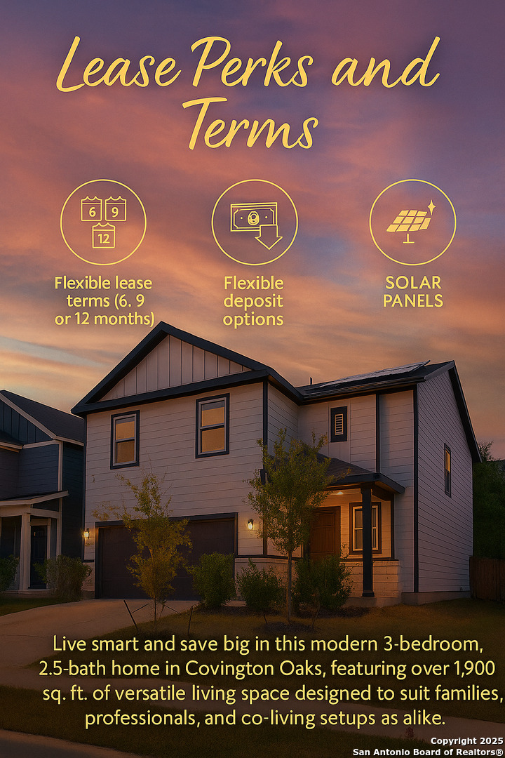 Offering **flexible lease terms (6, 9, or 12 months)**, **flexible deposit options**, and **half off one month's rent on a 12-month lease**, this energy-efficient home stands out with **SOLAR PANELS for major monthly utility savings**, plus a full upgrade package including a refrigerator, reverse osmosis system, water softener, and in-ground sprinklers. Live smart and save big in this modern 3-bedroom, 2.5-bath home in Covington Oaks, featuring over 1,900 sq. ft. of versatile living space designed to suit families, professionals, and co-living setups alike. The open-concept first floor flows effortlessly into a sleek island kitchen with a walk-in pantry, while the spacious upstairs game room offers endless flexibility for a home office, gym, media space, or creative retreat. All bedrooms are located upstairs for added privacy, with a comfortable primary suite boasting a walk-in closet and dual vanity. Ideally located near I-410, Brooks City Base, downtown, shopping, dining, and schools, this home blends suburban comfort with urban access while delivering long-term value through energy savings and modern convenience.