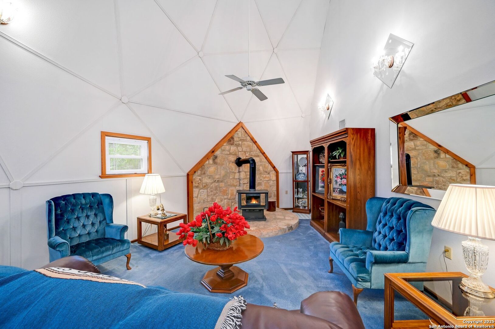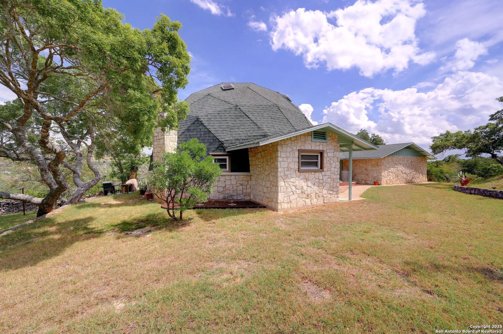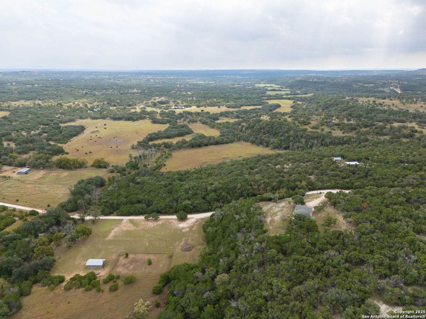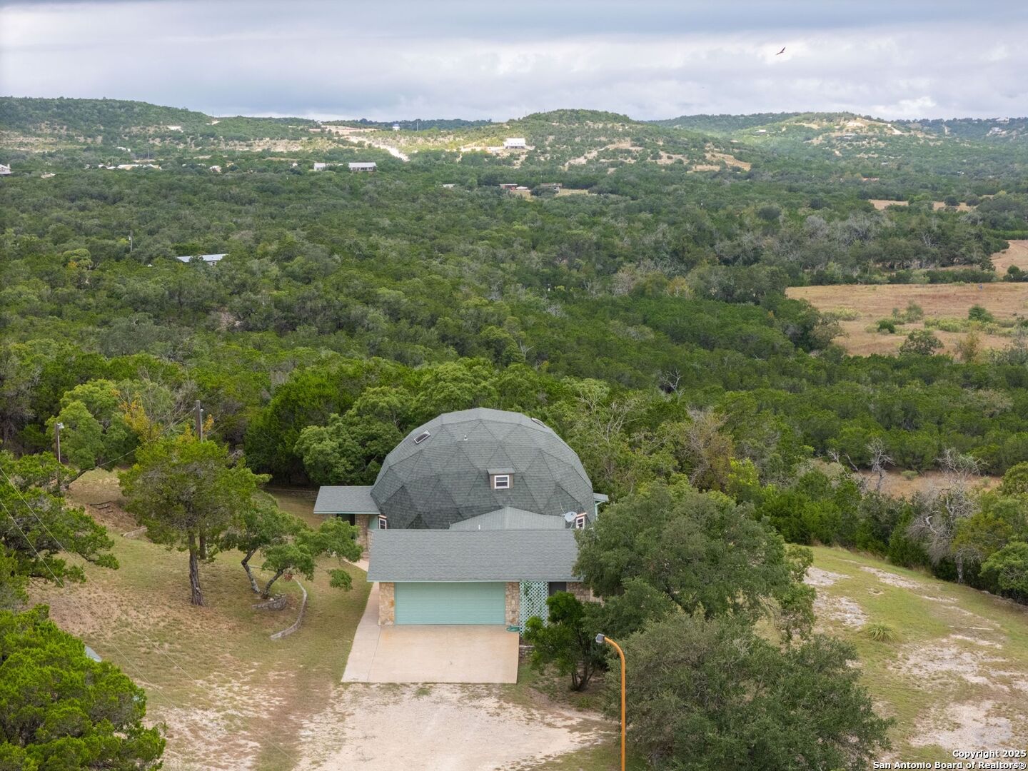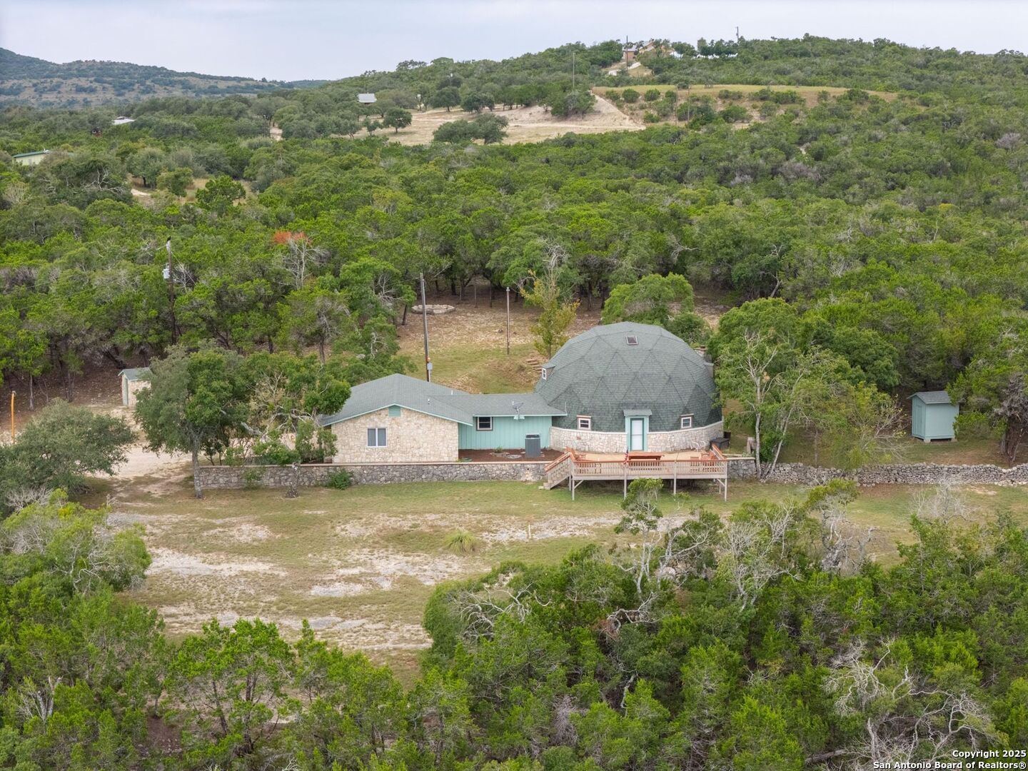 Peace and Quiet, Beautiful Views, Stunning Sunsets, Unrestricted 5.446 Acres and NO HOA! Enjoy the best of Hill Country Living perched at the top of a hill and make use of the large flat area to build on with a seasonal creek! With an abundance of scraped cedars and oak trees this property is about 7 miles out from town between Blanco and Kendalia! There are three bedrooms and each room has it's own full bathroom for your guests to enjoy! There's an office both upstairs and downstairs and a spacious living area with a formal dining area for entertaining! Spend your mornings out on your back deck sipping coffee and watching the sunrise! Make use of the 20x30 workshop for all of your hobbies! This dome home would make a wonderful weekend retreat or VRBO for all those who want to come enjoy all that the TX Hill Country has to offer whether it's to visit the wine country, distilleries, dancing at the historic Kendalia Dance Hall, Albert Dance Hall, or Luckenbach. Blanco is conveniently situated between Fredericksburg, Wimberley, Gruene, Boerne, San Antonio and Austin where there is so much to do and see! This is a real gem of a property!