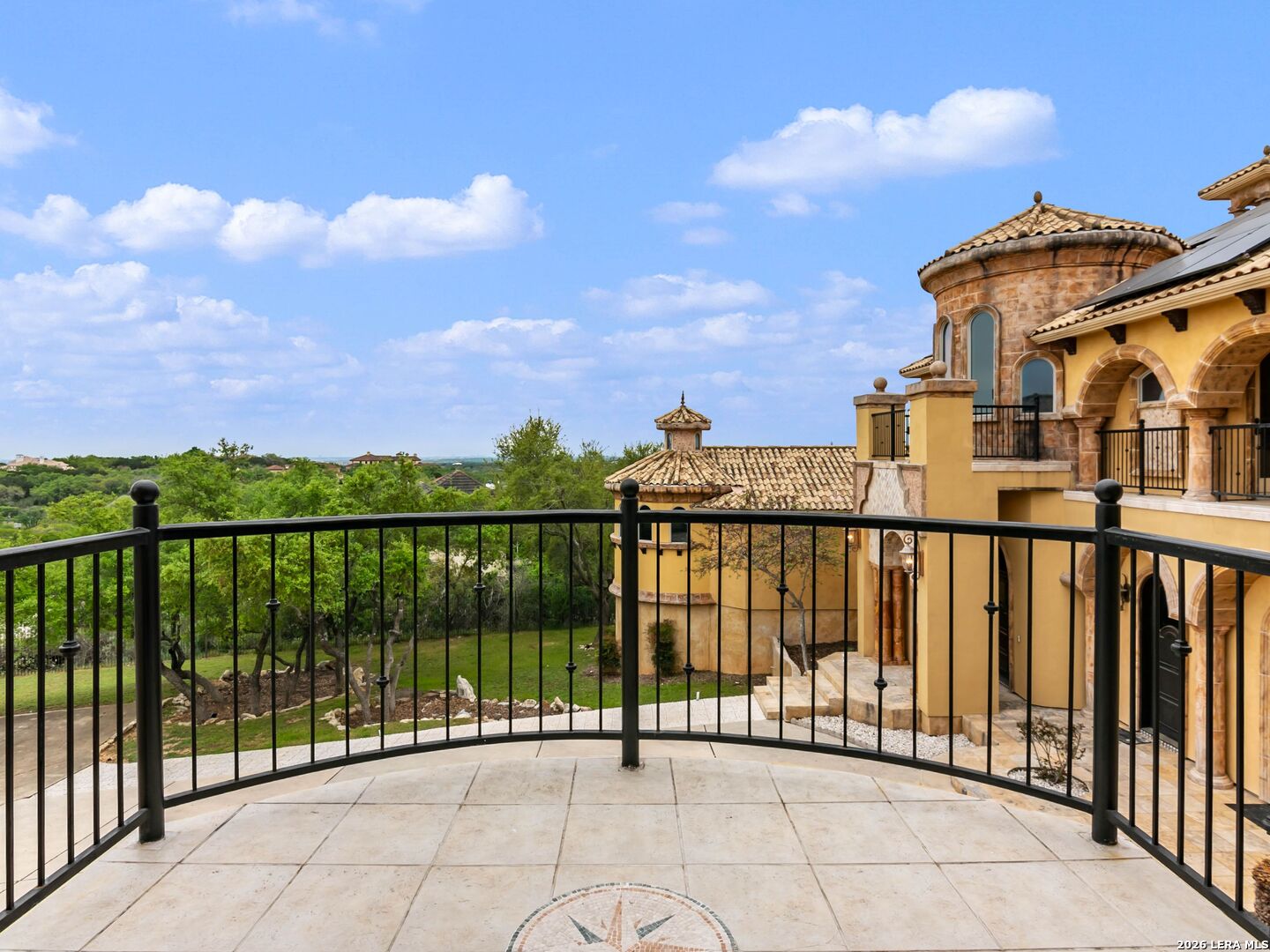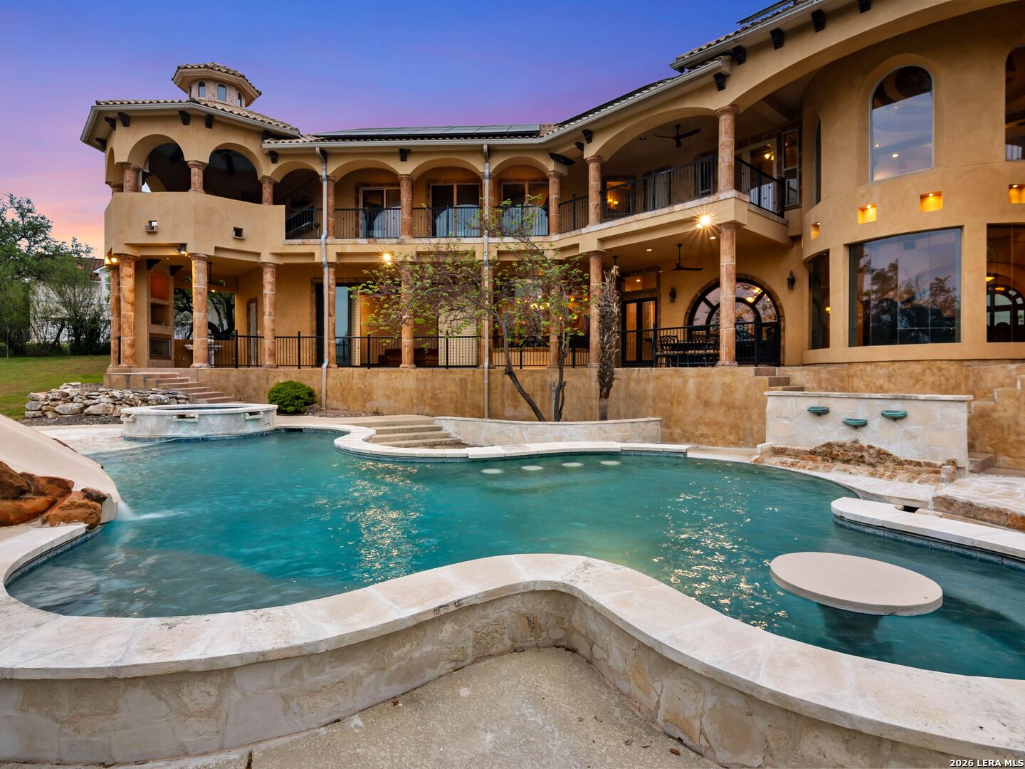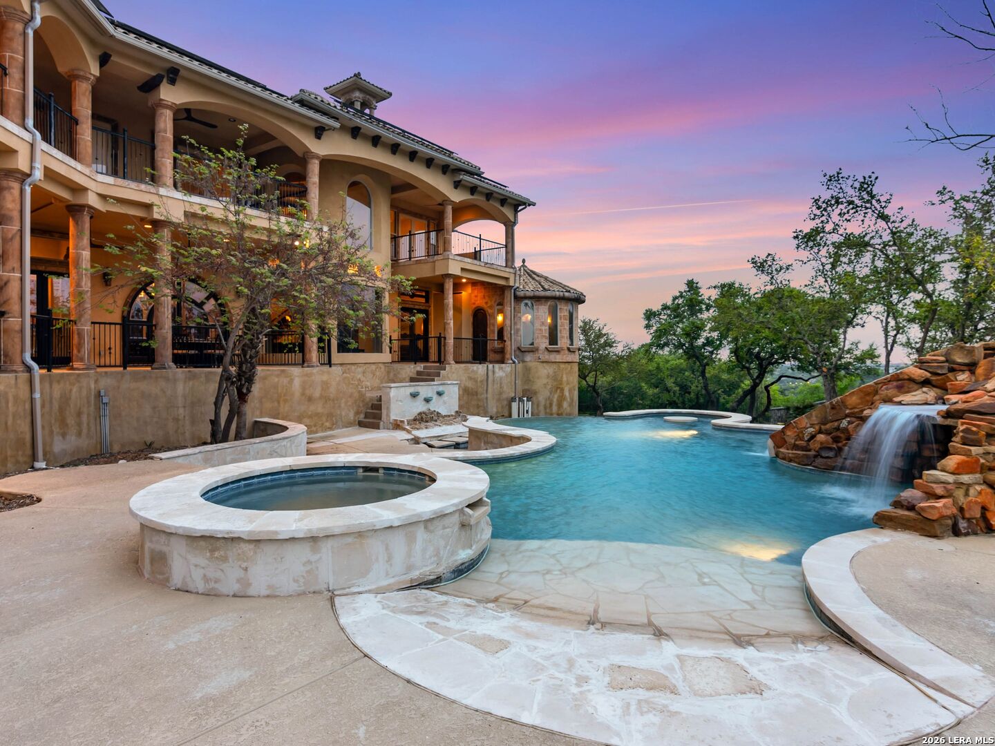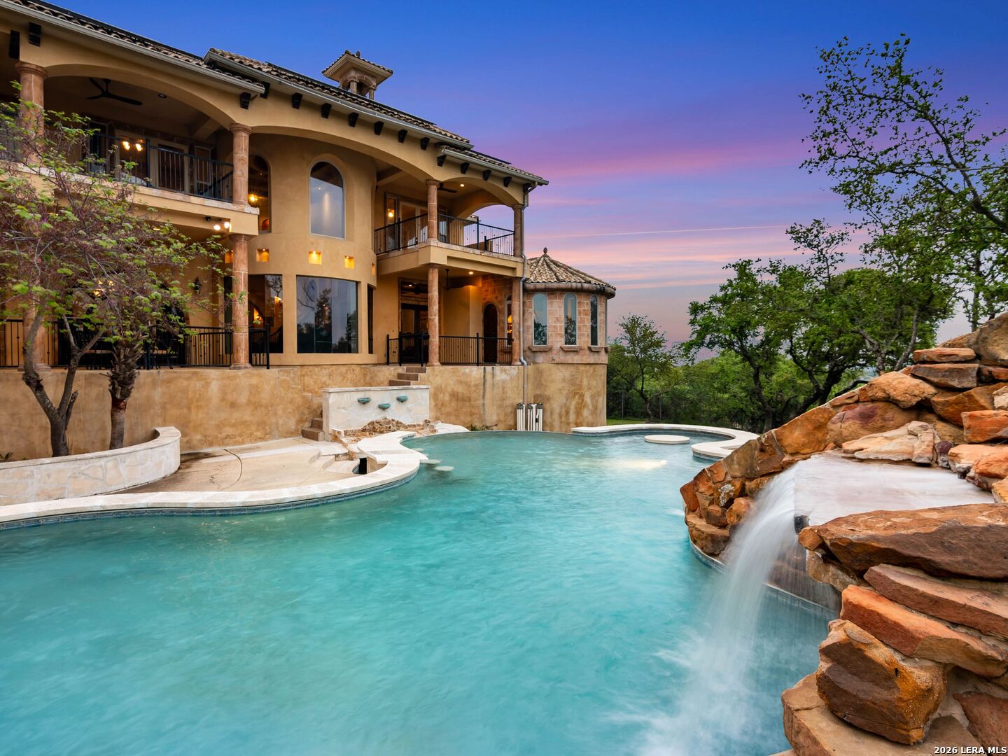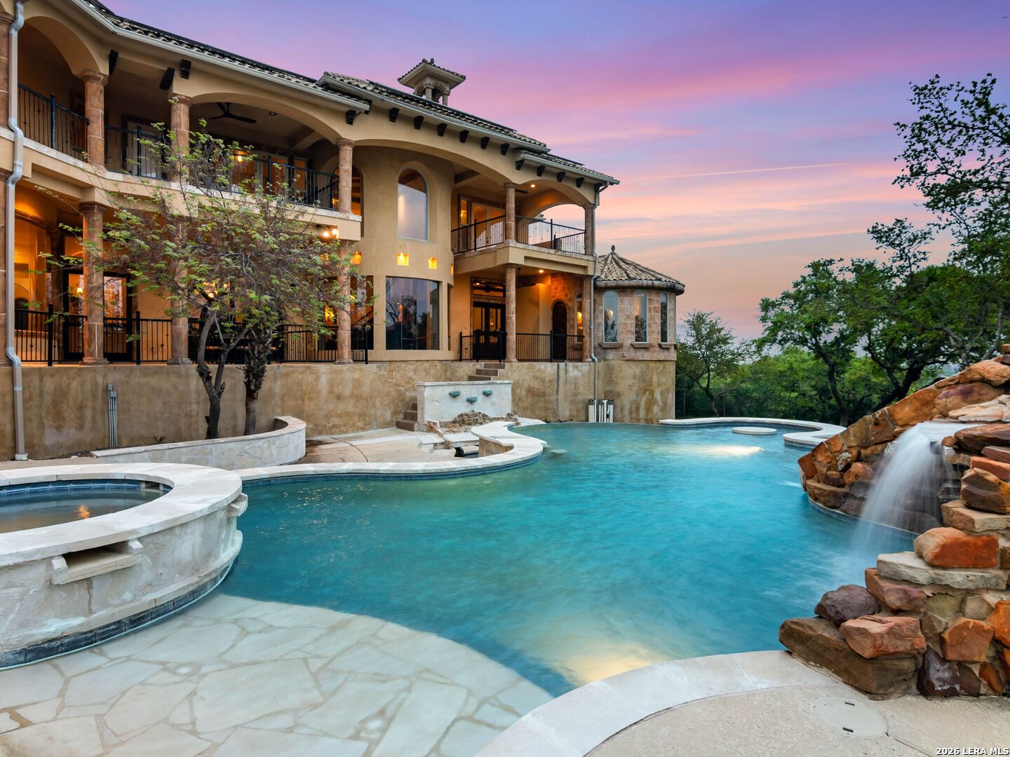 Set behind the gates of one of San Antonio's most exclusive enclaves, this refined Tuscan inspired estate blends European architecture with resort caliber living. Framed by mature oak trees and thoughtfully landscaped grounds, the residence delivers a sense of arrival defined by proportion, craftsmanship, and timeless design. Inside, soaring ceilings, graceful archways, and curated architectural detailing create a seamless flow throughout the home. A private elevator connects all levels, offering both convenience and long term functionality. Natural light fills the interiors, enhancing the scale and warmth of each living space. At the center of the home, the chef's kitchen is designed for both everyday living and elevated entertaining, featuring commercial grade appliances, custom cabinetry, and effortless connection to multiple terraces and Juliet balconies. Interior spaces transition naturally outdoors, creating an ideal setting for dining, hosting, or quiet retreat. Designed for entertainment and comfort, the home includes a private theater, observatory style library, and well appointed bedroom suites offering privacy and flexibility. Discreet solar integration and advanced home systems support modern living while preserving the integrity of the architecture. Outdoors, over 2,000 square feet of terrace and entertaining space surrounds a Keith Zars heated pool and spa complete with waterslide and multiple gathering areas anchored by dual outdoor fireplaces. The result is a private retreat that feels both expansive and intimate. A stately three car garage completes the property, delivering functionality without compromising design. This is a residence defined by craftsmanship, setting, and thoughtful execution, offering a rare opportunity to experience elevated living within a truly distinguished estate environment.