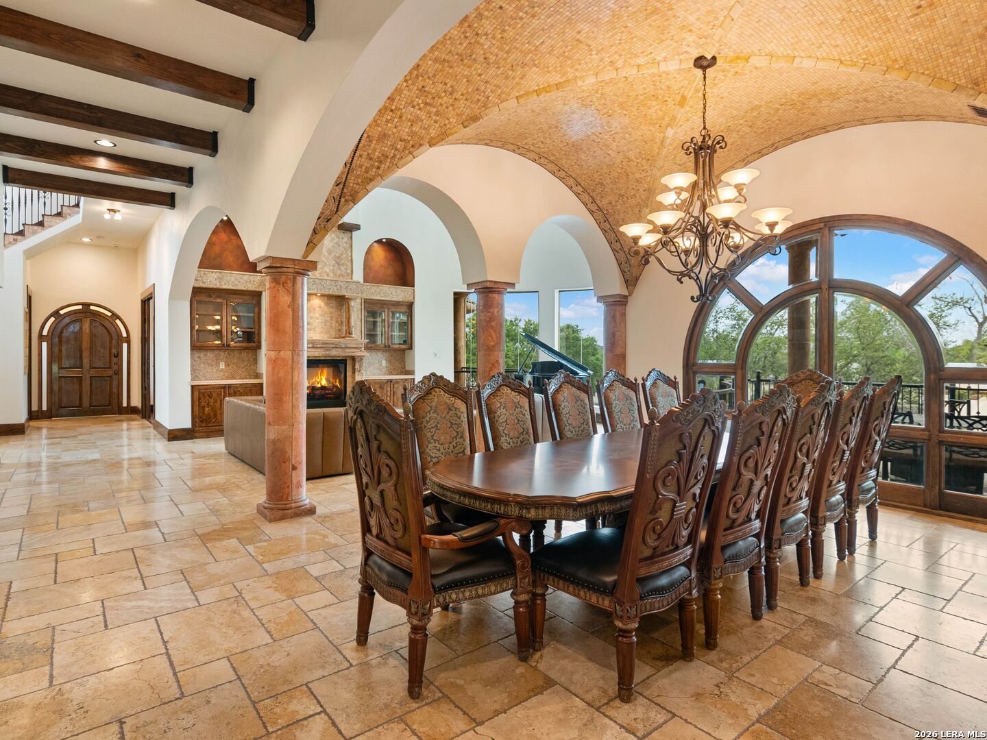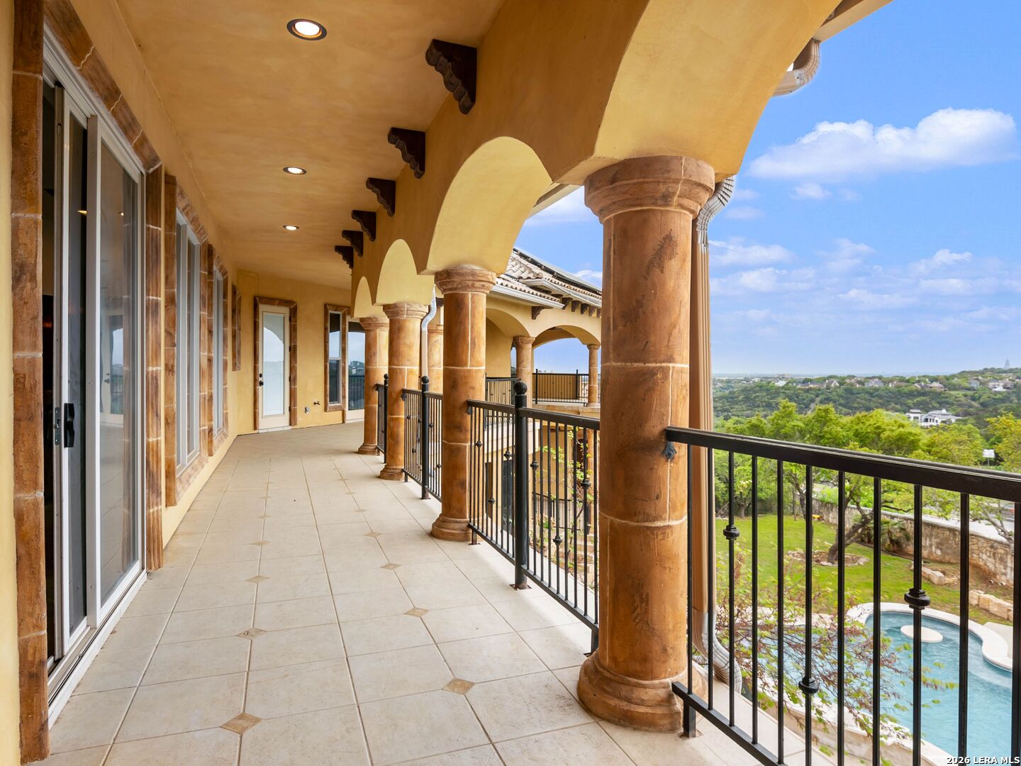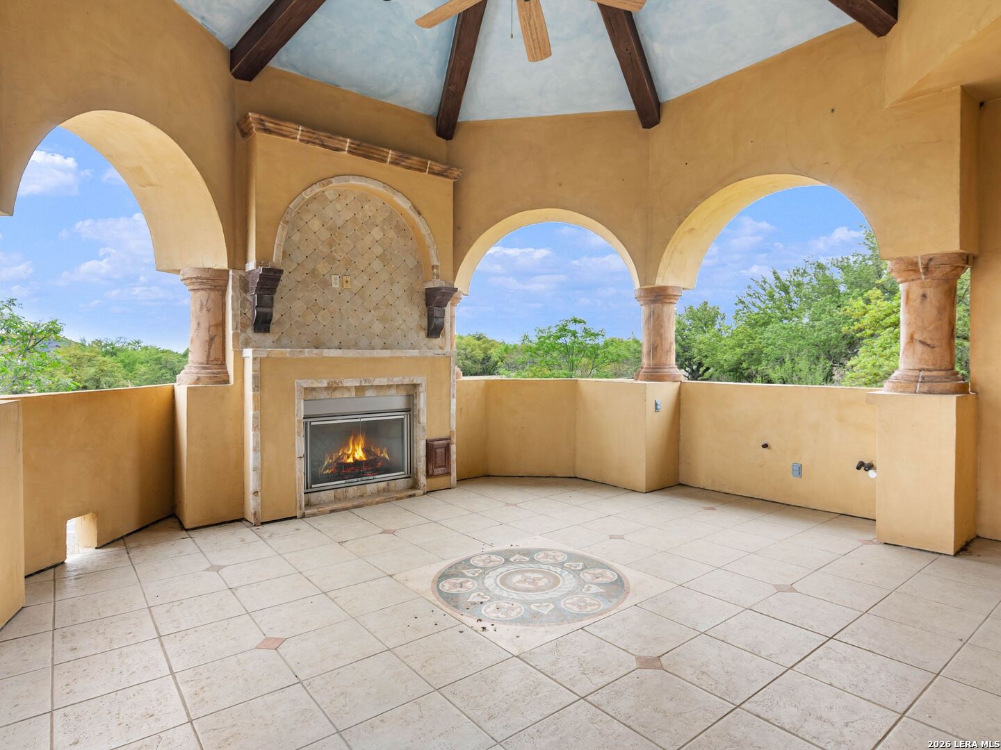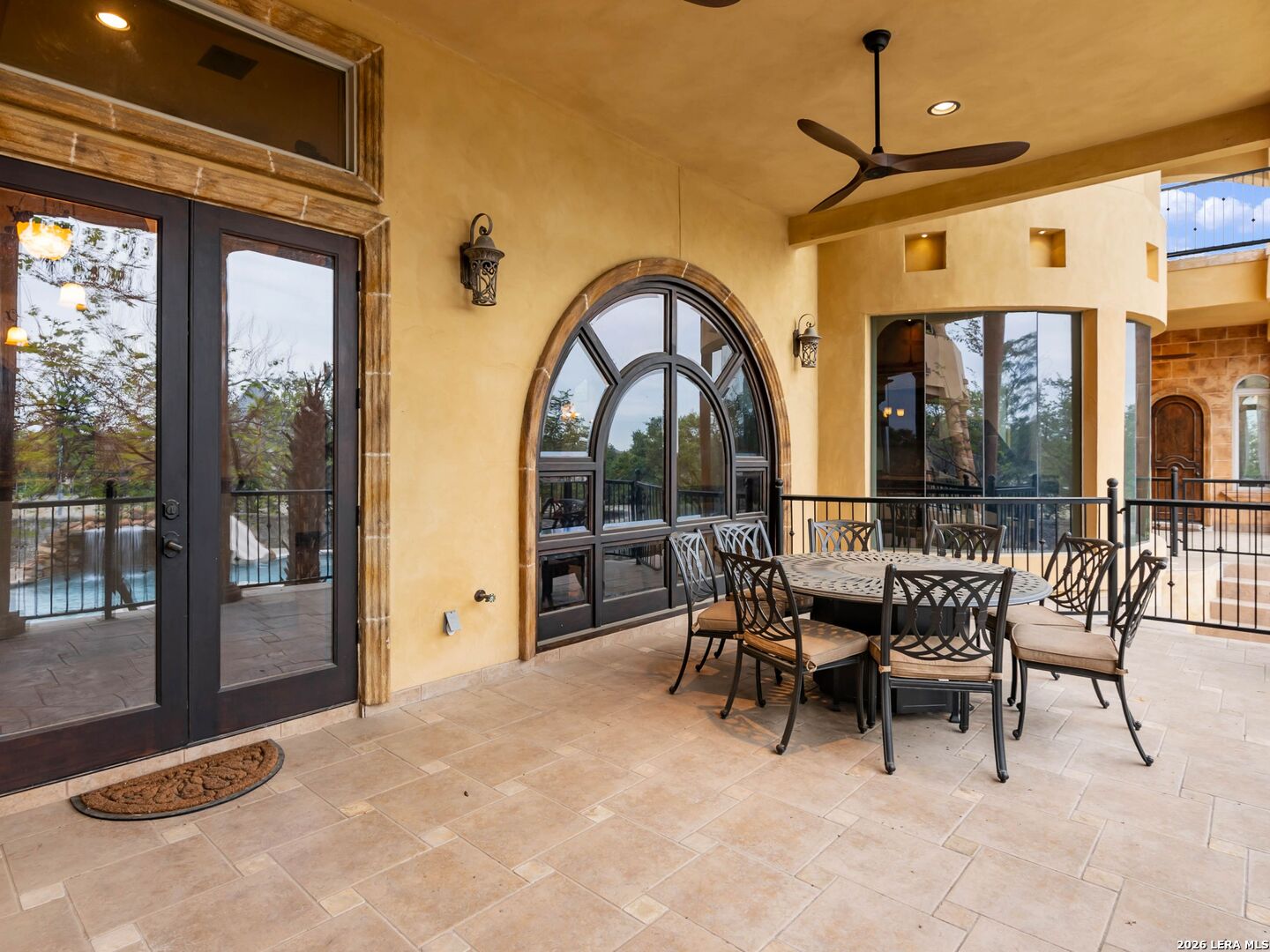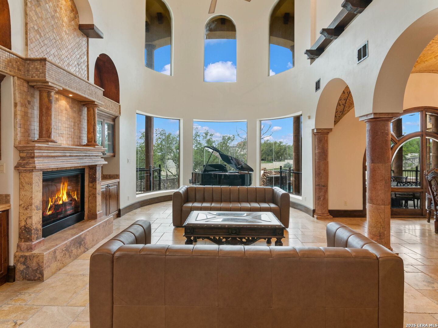 Set behind the gates of one of San Antonio's most exclusive enclaves, this refined Tuscan inspired estate blends European architecture with resort caliber living. Framed by mature oak trees and thoughtfully landscaped grounds, the residence delivers a sense of arrival defined by proportion, craftsmanship, and timeless design. Inside, soaring ceilings, graceful archways, and curated architectural detailing create a seamless flow throughout the home. A private elevator connects all levels, offering both convenience and long term functionality. Natural light fills the interiors, enhancing the scale and warmth of each living space. At the center of the home, the chef's kitchen is designed for both everyday living and elevated entertaining, featuring commercial grade appliances, custom cabinetry, and effortless connection to multiple terraces and Juliet balconies. Interior spaces transition naturally outdoors, creating an ideal setting for dining, hosting, or quiet retreat. Designed for entertainment and comfort, the home includes a private theater, observatory style library, and well appointed bedroom suites offering privacy and flexibility. Discreet solar integration and advanced home systems support modern living while preserving the integrity of the architecture. Outdoors, over 2,000 square feet of terrace and entertaining space surrounds a Keith Zars heated pool and spa complete with waterslide and multiple gathering areas anchored by dual outdoor fireplaces. The result is a private retreat that feels both expansive and intimate. A stately three car garage completes the property, delivering functionality without compromising design. This is a residence defined by craftsmanship, setting, and thoughtful execution, offering a rare opportunity to experience elevated living within a truly distinguished estate environment.
