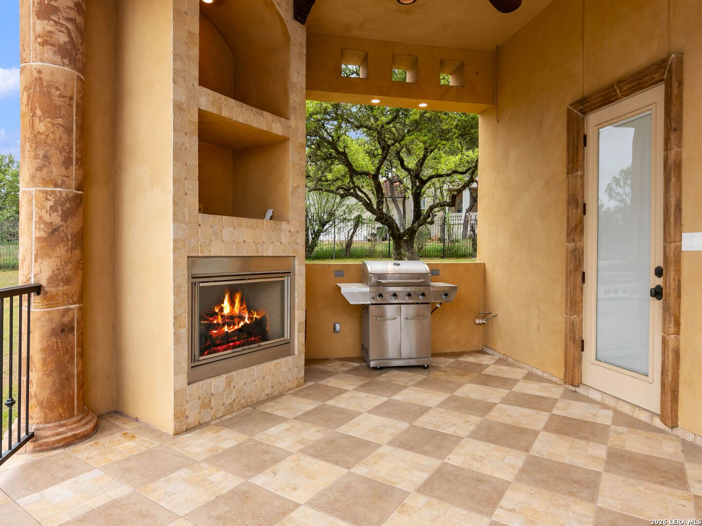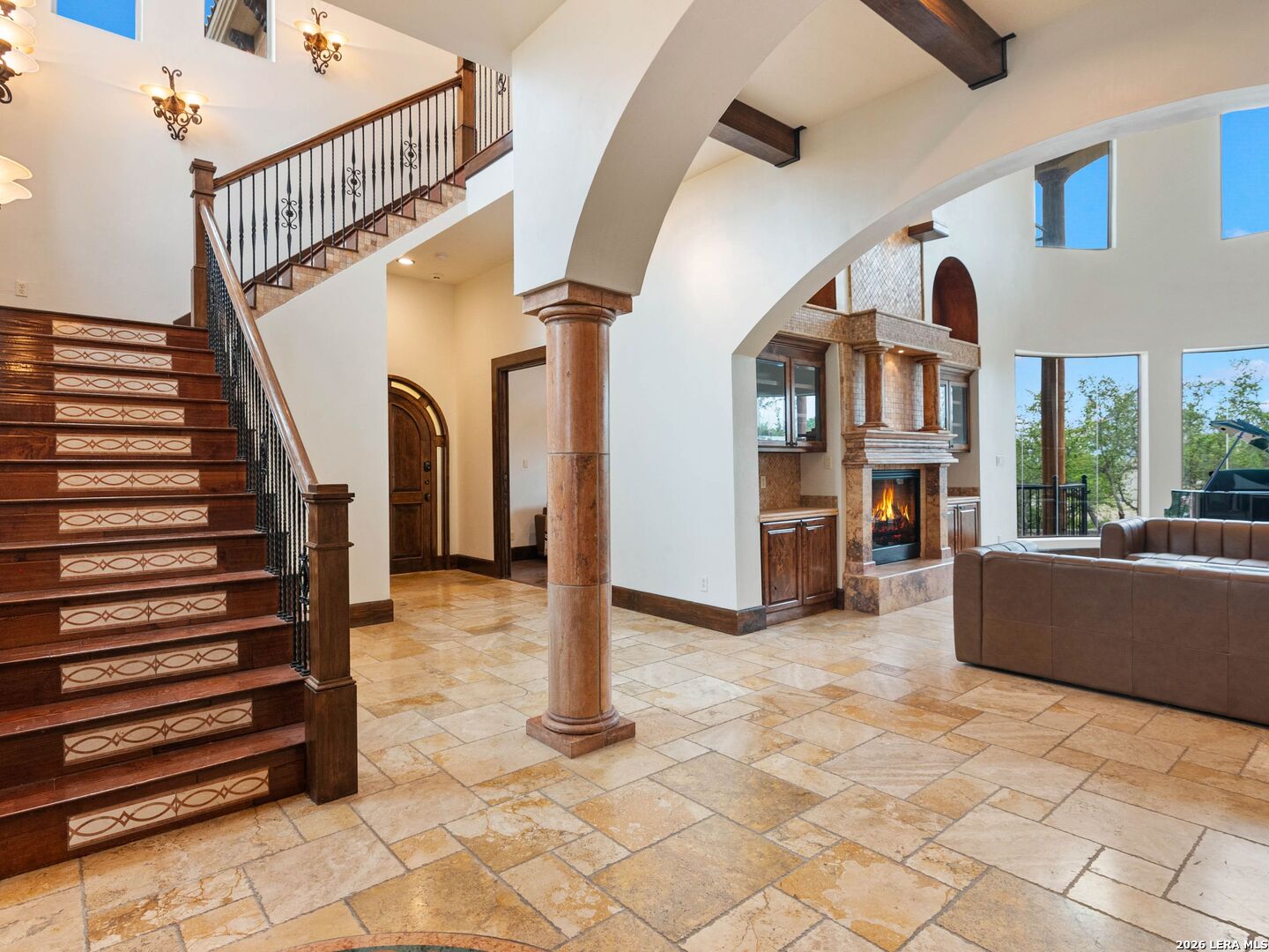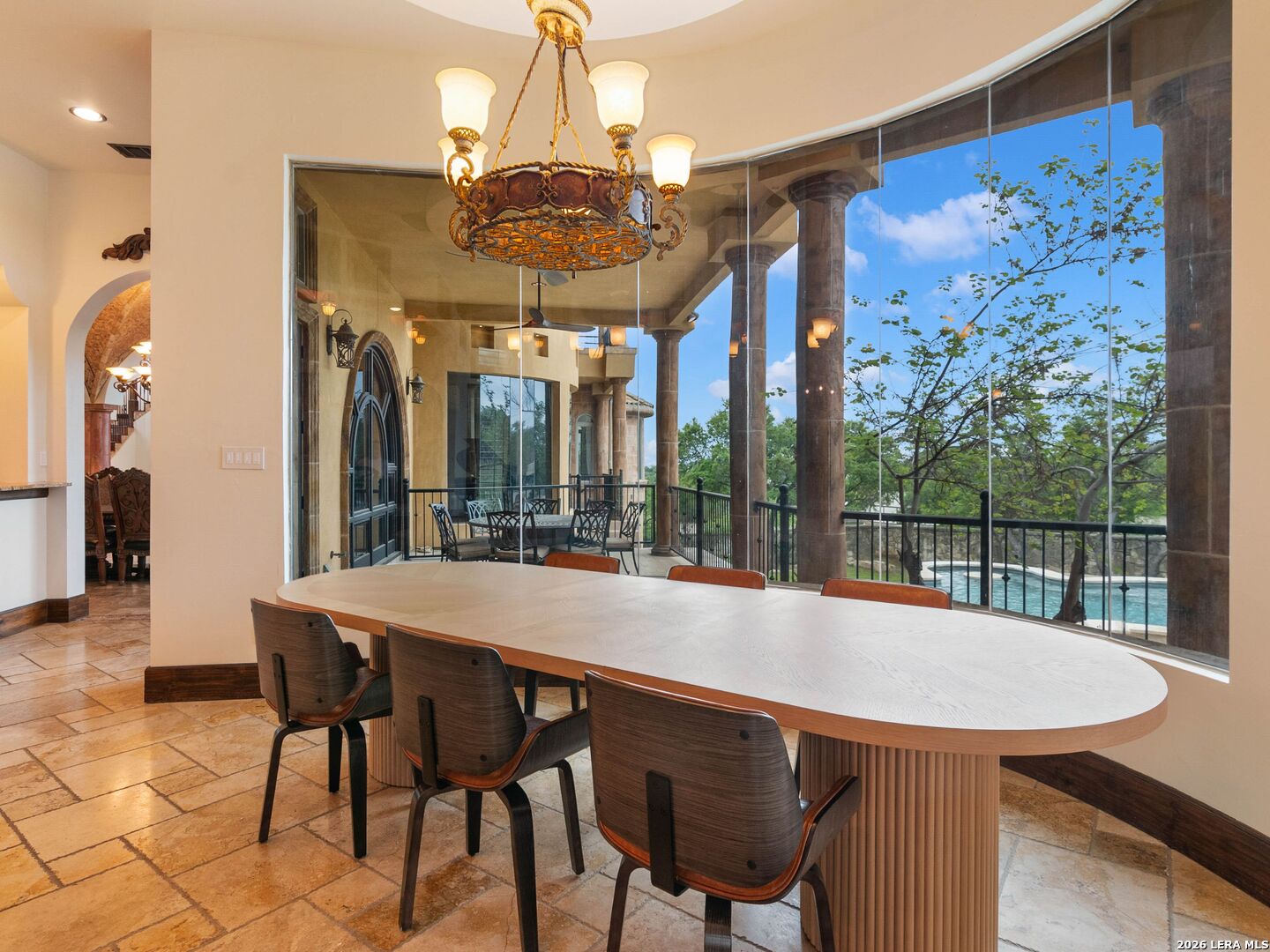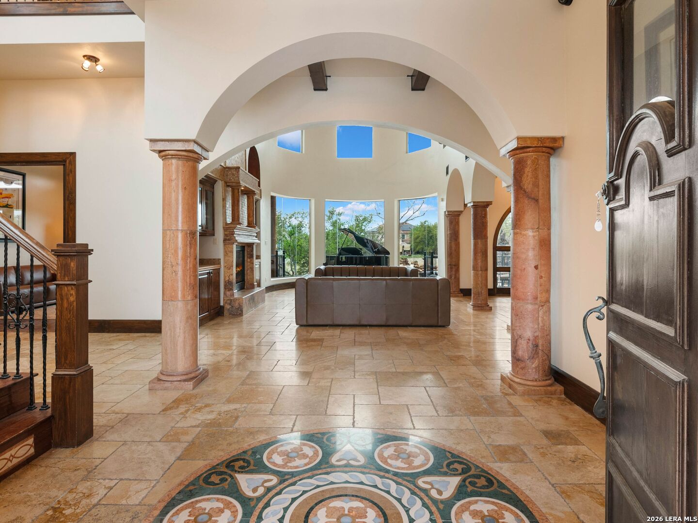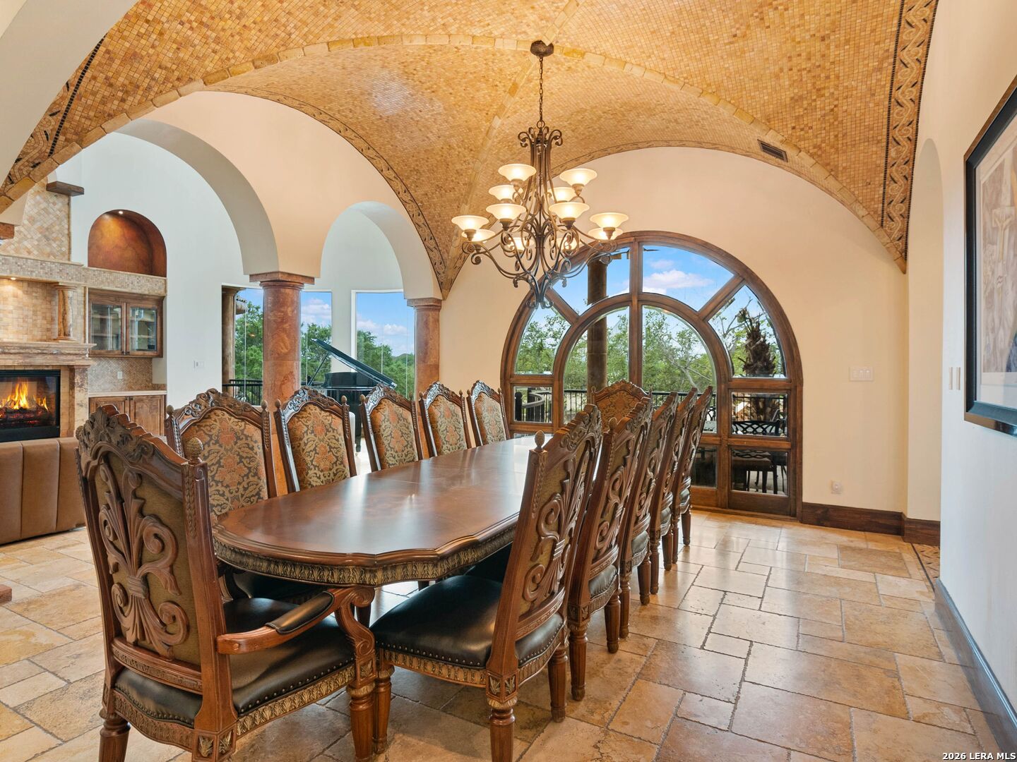 Set behind the gates of one of San Antonio's most exclusive enclaves, this refined Tuscan inspired estate blends European architecture with resort caliber living. Framed by mature oak trees and thoughtfully landscaped grounds, the residence delivers a sense of arrival defined by proportion, craftsmanship, and timeless design. Inside, soaring ceilings, graceful archways, and curated architectural detailing create a seamless flow throughout the home. A private elevator connects all levels, offering both convenience and long term functionality. Natural light fills the interiors, enhancing the scale and warmth of each living space. At the center of the home, the chef's kitchen is designed for both everyday living and elevated entertaining, featuring commercial grade appliances, custom cabinetry, and effortless connection to multiple terraces and Juliet balconies. Interior spaces transition naturally outdoors, creating an ideal setting for dining, hosting, or quiet retreat. Designed for entertainment and comfort, the home includes a private theater, observatory style library, and well appointed bedroom suites offering privacy and flexibility. Discreet solar integration and advanced home systems support modern living while preserving the integrity of the architecture. Outdoors, over 2,000 square feet of terrace and entertaining space surrounds a Keith Zars heated pool and spa complete with waterslide and multiple gathering areas anchored by dual outdoor fireplaces. The result is a private retreat that feels both expansive and intimate. A stately three car garage completes the property, delivering functionality without compromising design. This is a residence defined by craftsmanship, setting, and thoughtful execution, offering a rare opportunity to experience elevated living within a truly distinguished estate environment.