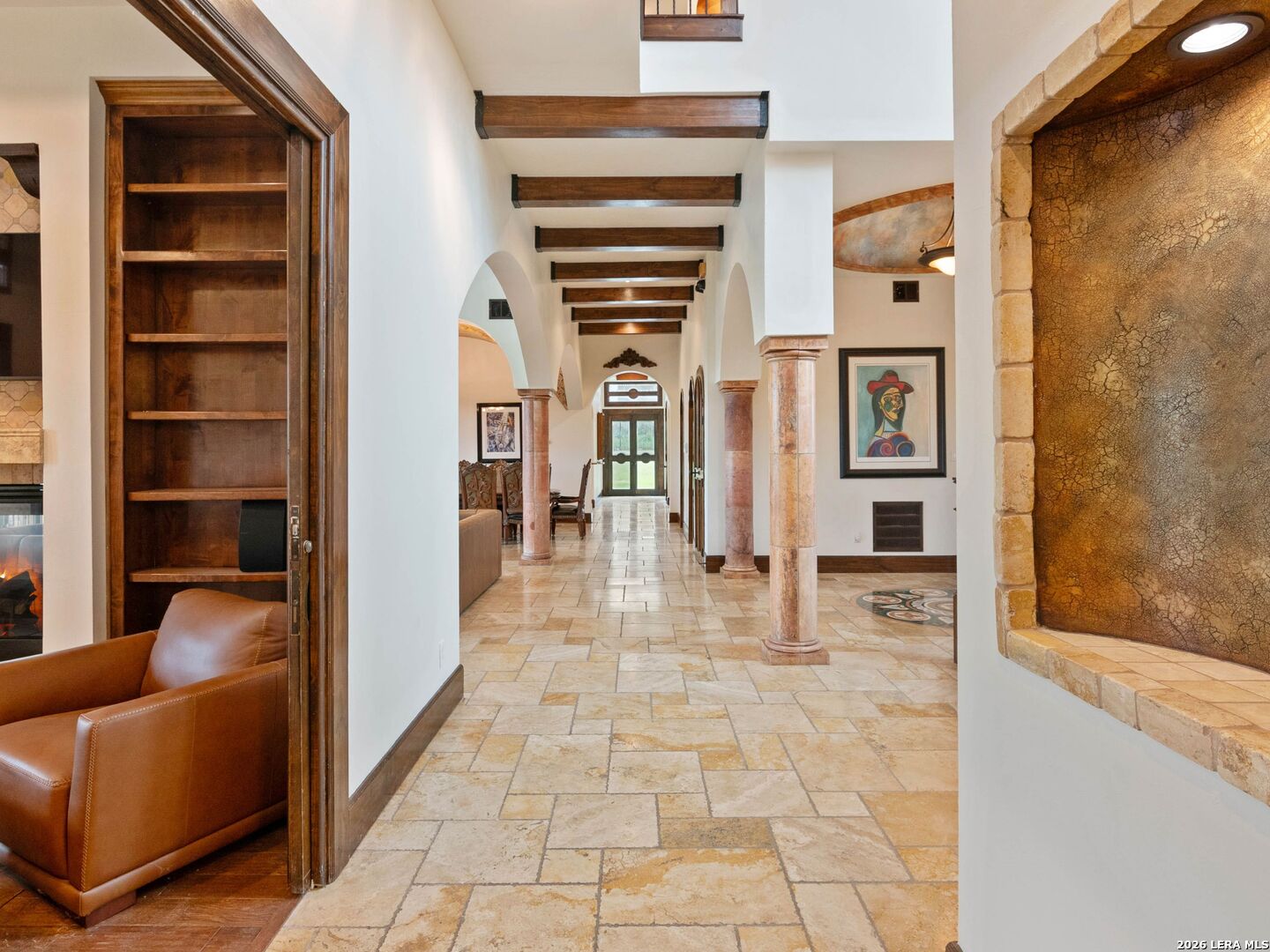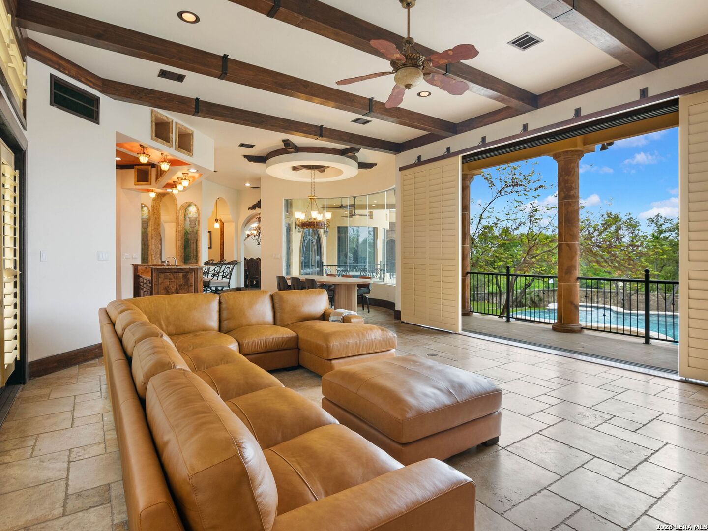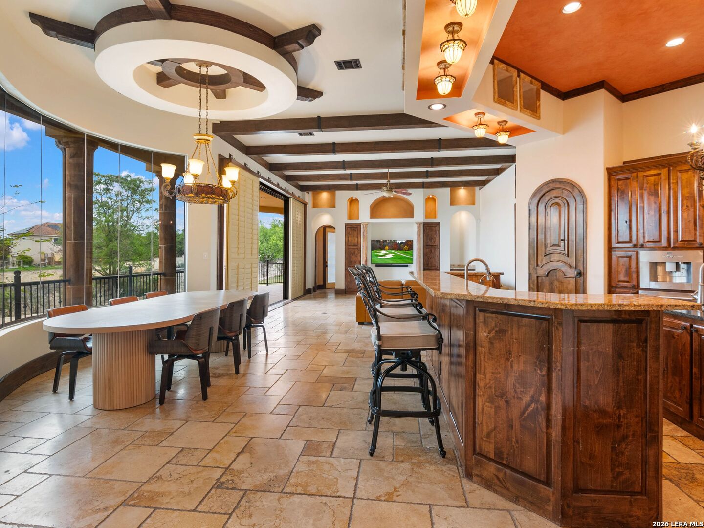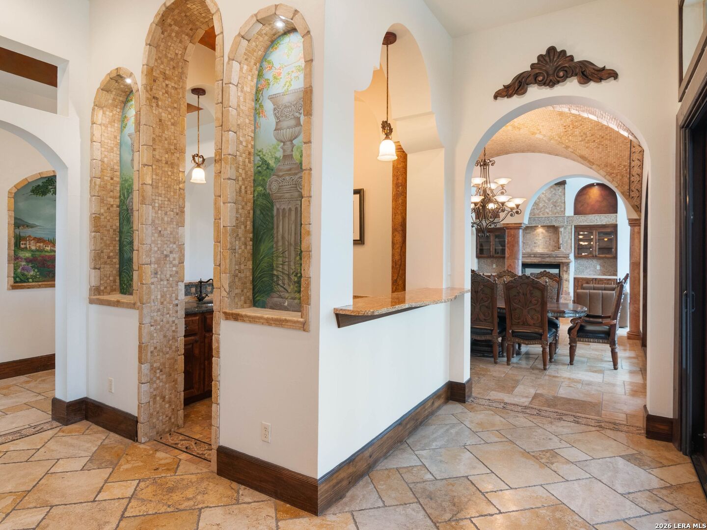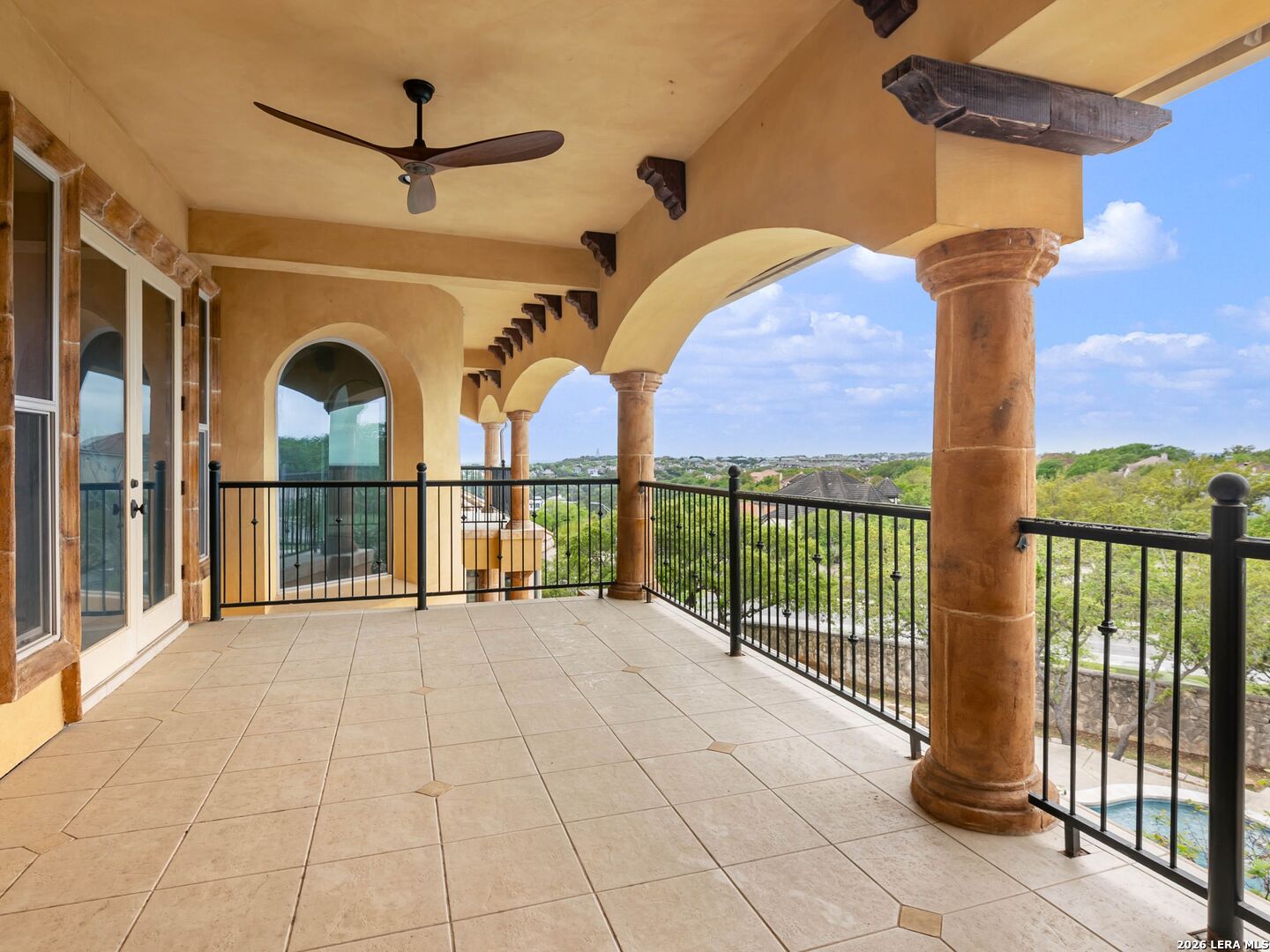 Set behind the gates of one of San Antonio's most exclusive enclaves, this refined Tuscan inspired estate blends European architecture with resort caliber living. Framed by mature oak trees and thoughtfully landscaped grounds, the residence delivers a sense of arrival defined by proportion, craftsmanship, and timeless design. Inside, soaring ceilings, graceful archways, and curated architectural detailing create a seamless flow throughout the home. A private elevator connects all levels, offering both convenience and long term functionality. Natural light fills the interiors, enhancing the scale and warmth of each living space. At the center of the home, the chef's kitchen is designed for both everyday living and elevated entertaining, featuring commercial grade appliances, custom cabinetry, and effortless connection to multiple terraces and Juliet balconies. Interior spaces transition naturally outdoors, creating an ideal setting for dining, hosting, or quiet retreat. Designed for entertainment and comfort, the home includes a private theater, observatory style library, and well appointed bedroom suites offering privacy and flexibility. Discreet solar integration and advanced home systems support modern living while preserving the integrity of the architecture. Outdoors, over 2,000 square feet of terrace and entertaining space surrounds a Keith Zars heated pool and spa complete with waterslide and multiple gathering areas anchored by dual outdoor fireplaces. The result is a private retreat that feels both expansive and intimate. A stately three car garage completes the property, delivering functionality without compromising design. This is a residence defined by craftsmanship, setting, and thoughtful execution, offering a rare opportunity to experience elevated living within a truly distinguished estate environment.