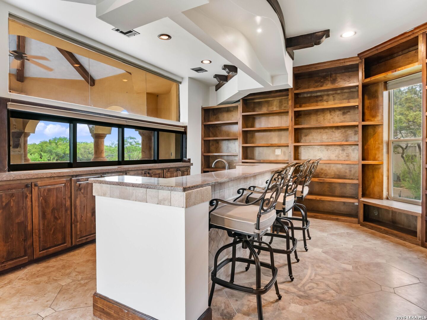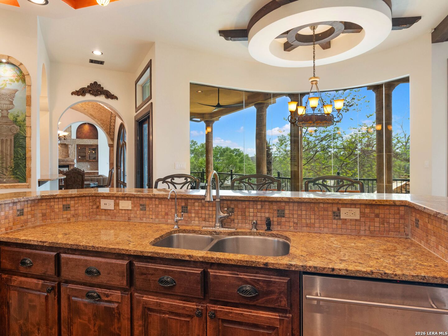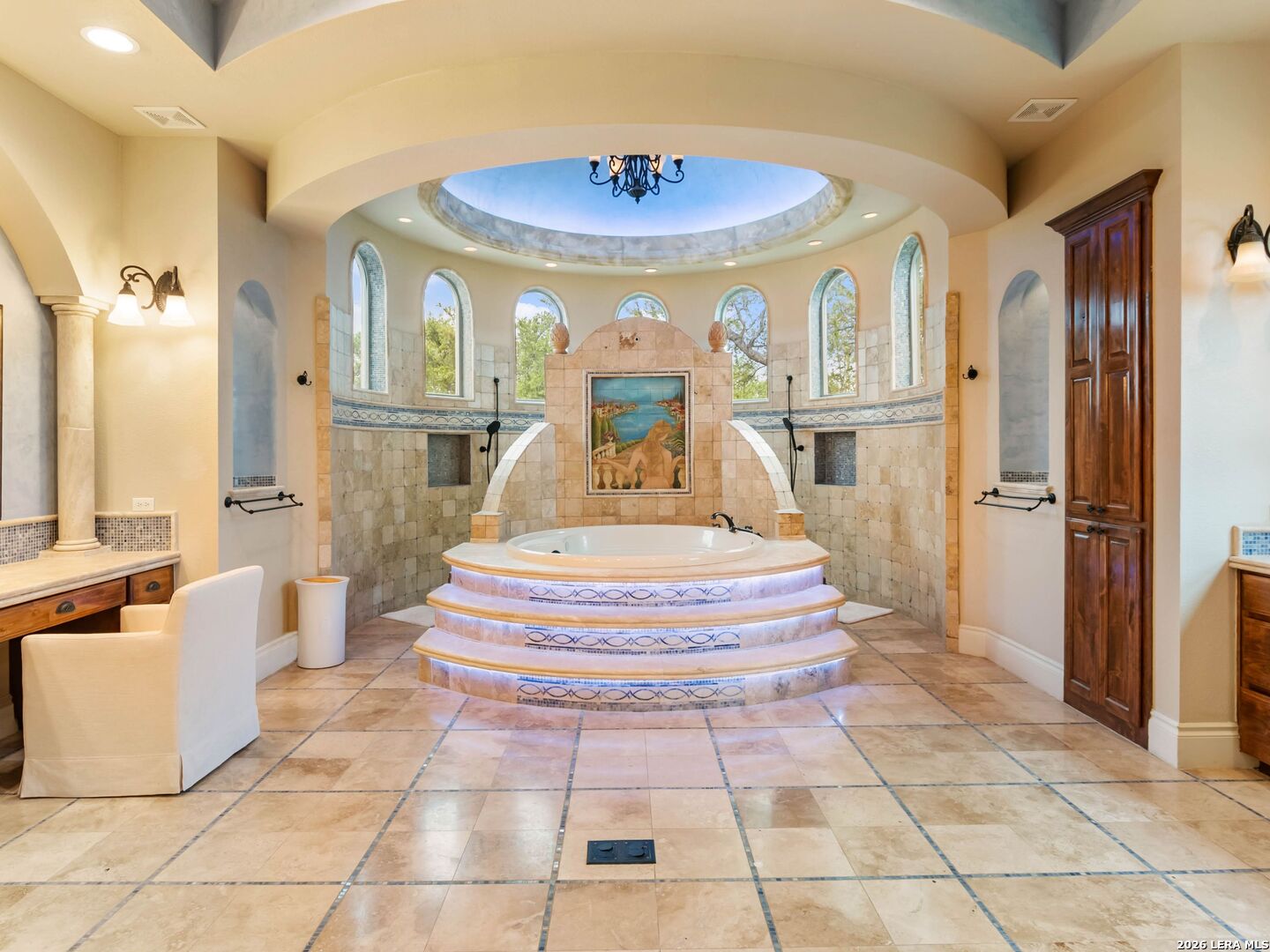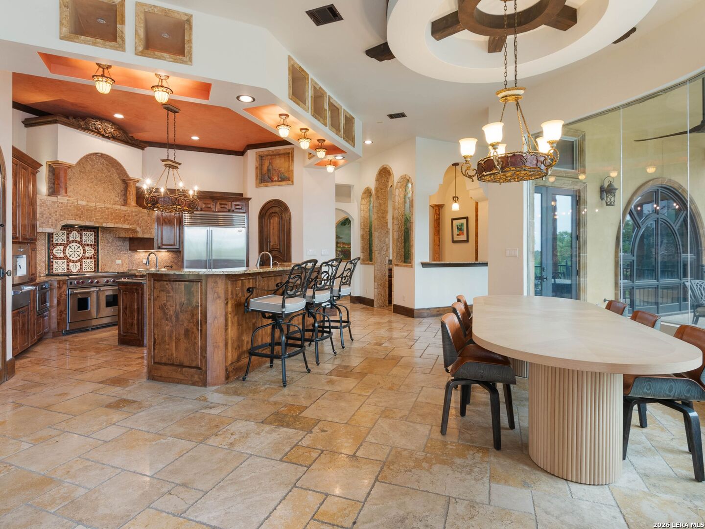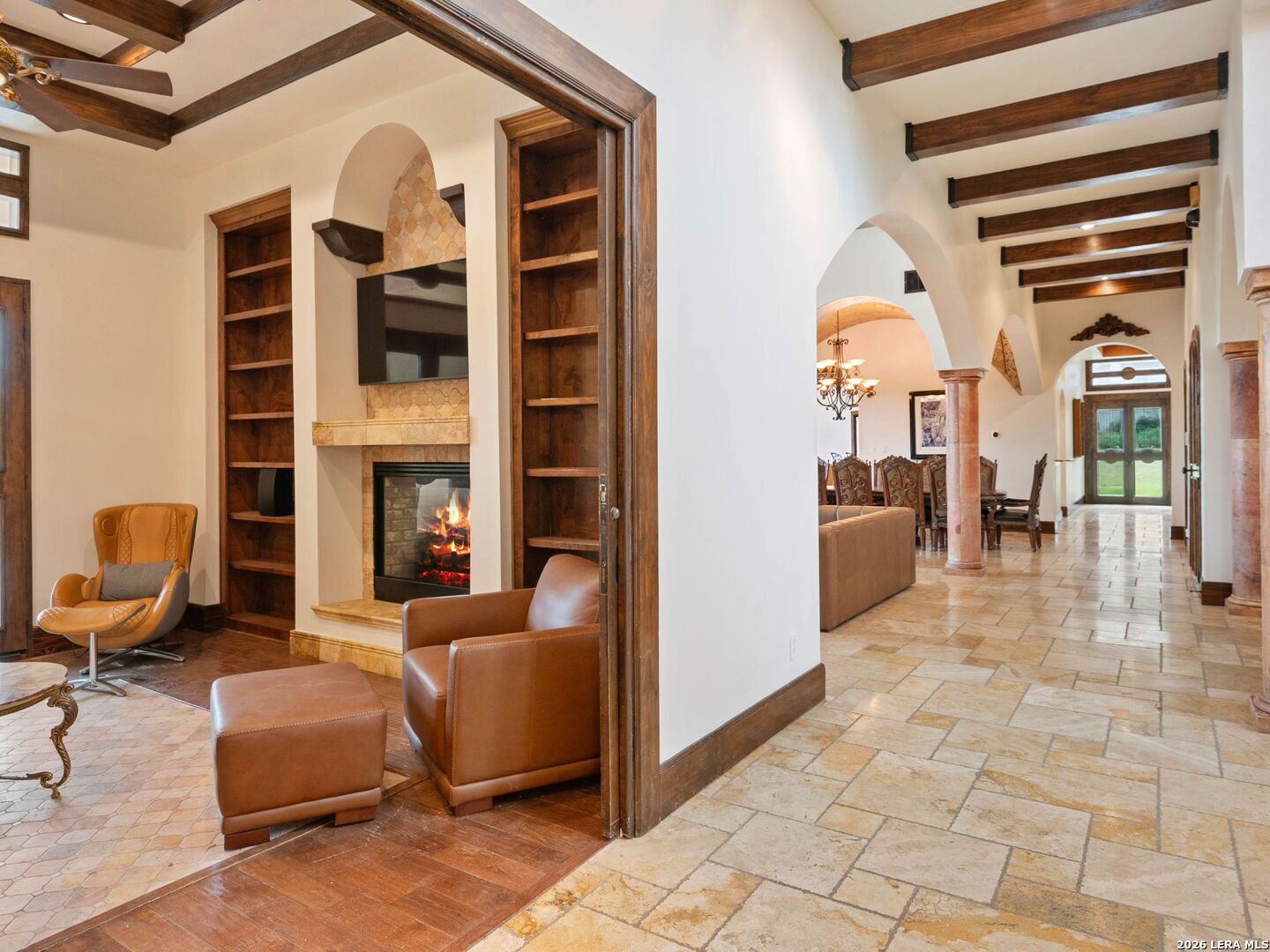 Set behind the gates of one of San Antonio's most exclusive enclaves, this refined Tuscan inspired estate blends European architecture with resort caliber living. Framed by mature oak trees and thoughtfully landscaped grounds, the residence delivers a sense of arrival defined by proportion, craftsmanship, and timeless design. Inside, soaring ceilings, graceful archways, and curated architectural detailing create a seamless flow throughout the home. A private elevator connects all levels, offering both convenience and long term functionality. Natural light fills the interiors, enhancing the scale and warmth of each living space. At the center of the home, the chef's kitchen is designed for both everyday living and elevated entertaining, featuring commercial grade appliances, custom cabinetry, and effortless connection to multiple terraces and Juliet balconies. Interior spaces transition naturally outdoors, creating an ideal setting for dining, hosting, or quiet retreat. Designed for entertainment and comfort, the home includes a private theater, observatory style library, and well appointed bedroom suites offering privacy and flexibility. Discreet solar integration and advanced home systems support modern living while preserving the integrity of the architecture. Outdoors, over 2,000 square feet of terrace and entertaining space surrounds a Keith Zars heated pool and spa complete with waterslide and multiple gathering areas anchored by dual outdoor fireplaces. The result is a private retreat that feels both expansive and intimate. A stately three car garage completes the property, delivering functionality without compromising design. This is a residence defined by craftsmanship, setting, and thoughtful execution, offering a rare opportunity to experience elevated living within a truly distinguished estate environment.