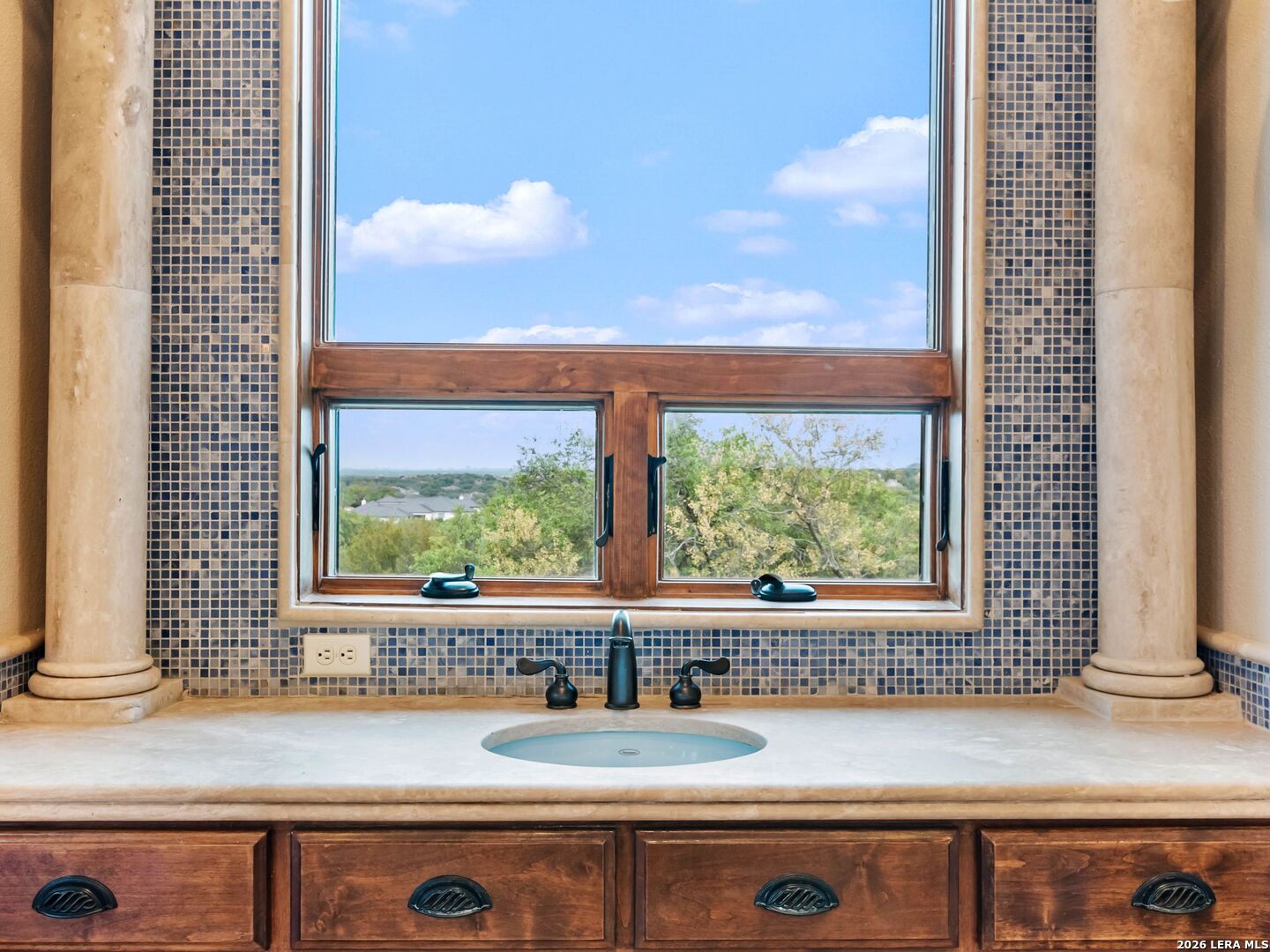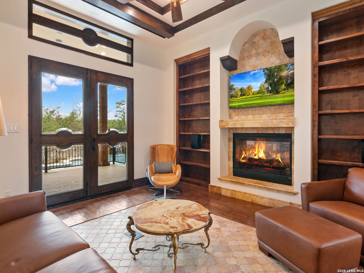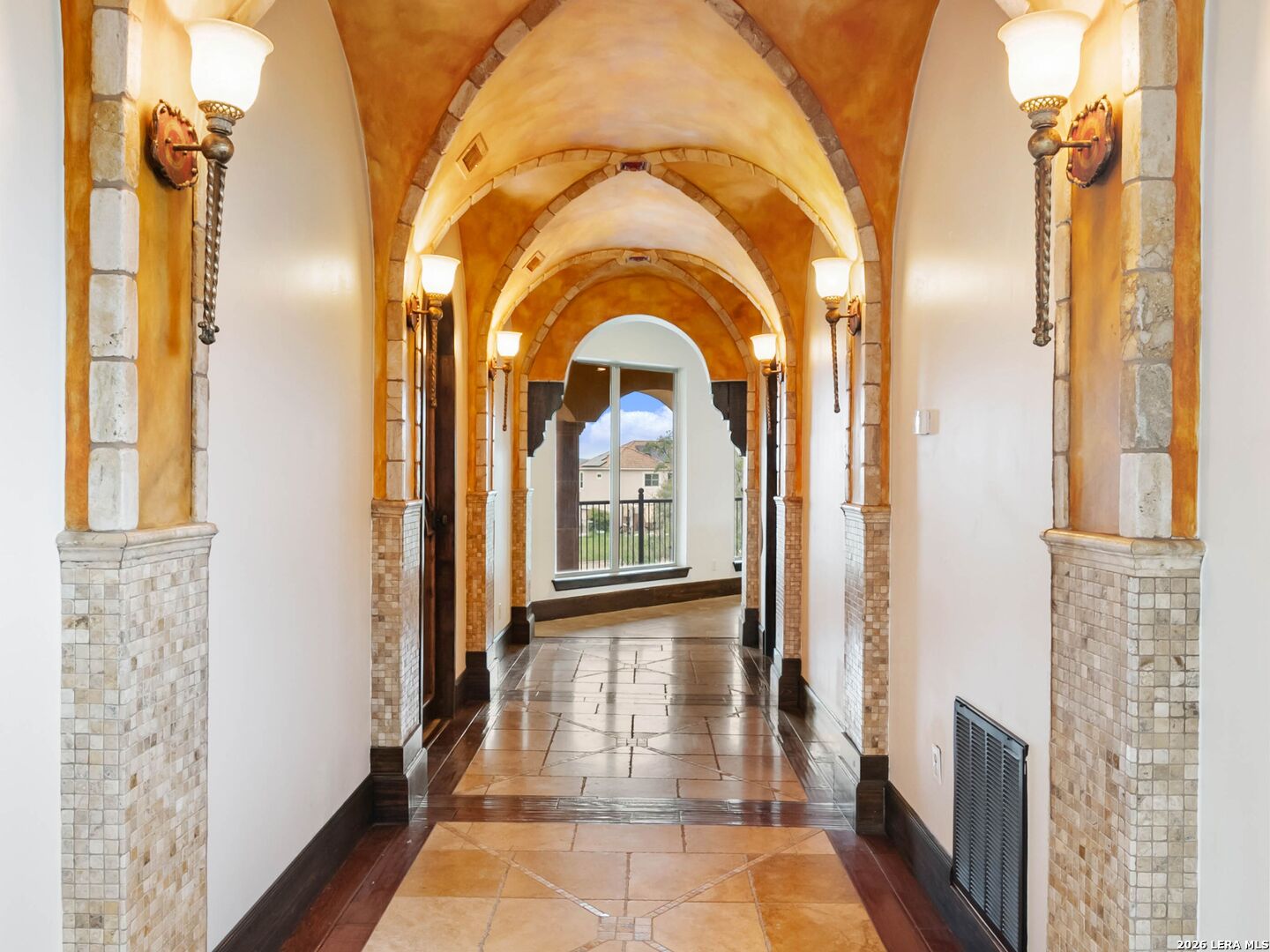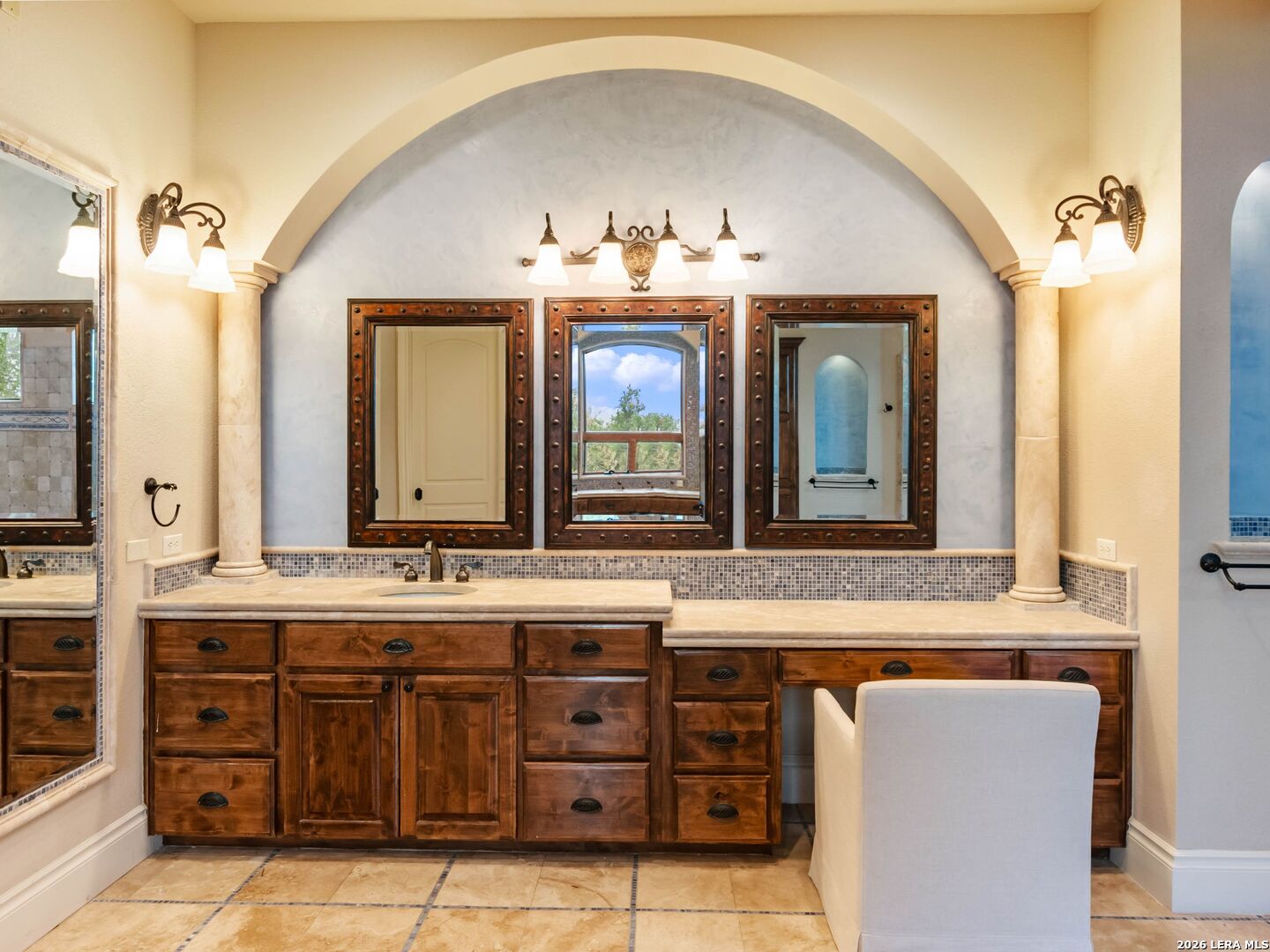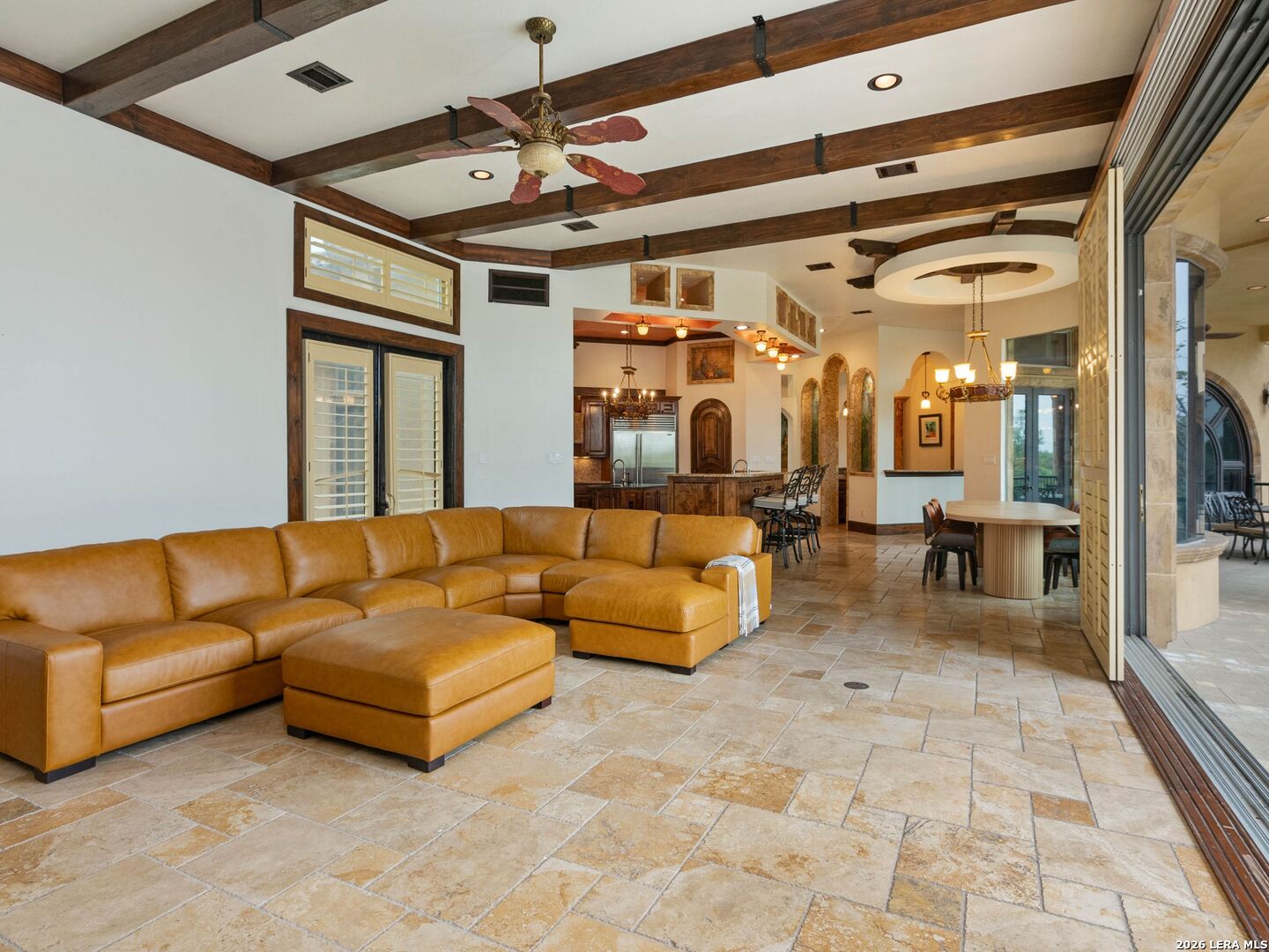Set behind the gates of one of San Antonio's most exclusive enclaves, this refined Tuscan inspired estate blends European architecture with resort caliber living. Framed by mature oak trees and thoughtfully landscaped grounds, the residence delivers a sense of arrival defined by proportion, craftsmanship, and timeless design. Inside, soaring ceilings, graceful archways, and curated architectural detailing create a seamless flow throughout the home. A private elevator connects all levels, offering both convenience and long term functionality. Natural light fills the interiors, enhancing the scale and warmth of each living space. At the center of the home, the chef's kitchen is designed for both everyday living and elevated entertaining, featuring commercial grade appliances, custom cabinetry, and effortless connection to multiple terraces and Juliet balconies. Interior spaces transition naturally outdoors, creating an ideal setting for dining, hosting, or quiet retreat. Designed for entertainment and comfort, the home includes a private theater, observatory style library, and well appointed bedroom suites offering privacy and flexibility. Discreet solar integration and advanced home systems support modern living while preserving the integrity of the architecture. Outdoors, over 2,000 square feet of terrace and entertaining space surrounds a Keith Zars heated pool and spa complete with waterslide and multiple gathering areas anchored by dual outdoor fireplaces. The result is a private retreat that feels both expansive and intimate. A stately three car garage completes the property, delivering functionality without compromising design. This is a residence defined by craftsmanship, setting, and thoughtful execution, offering a rare opportunity to experience elevated living within a truly distinguished estate environment.