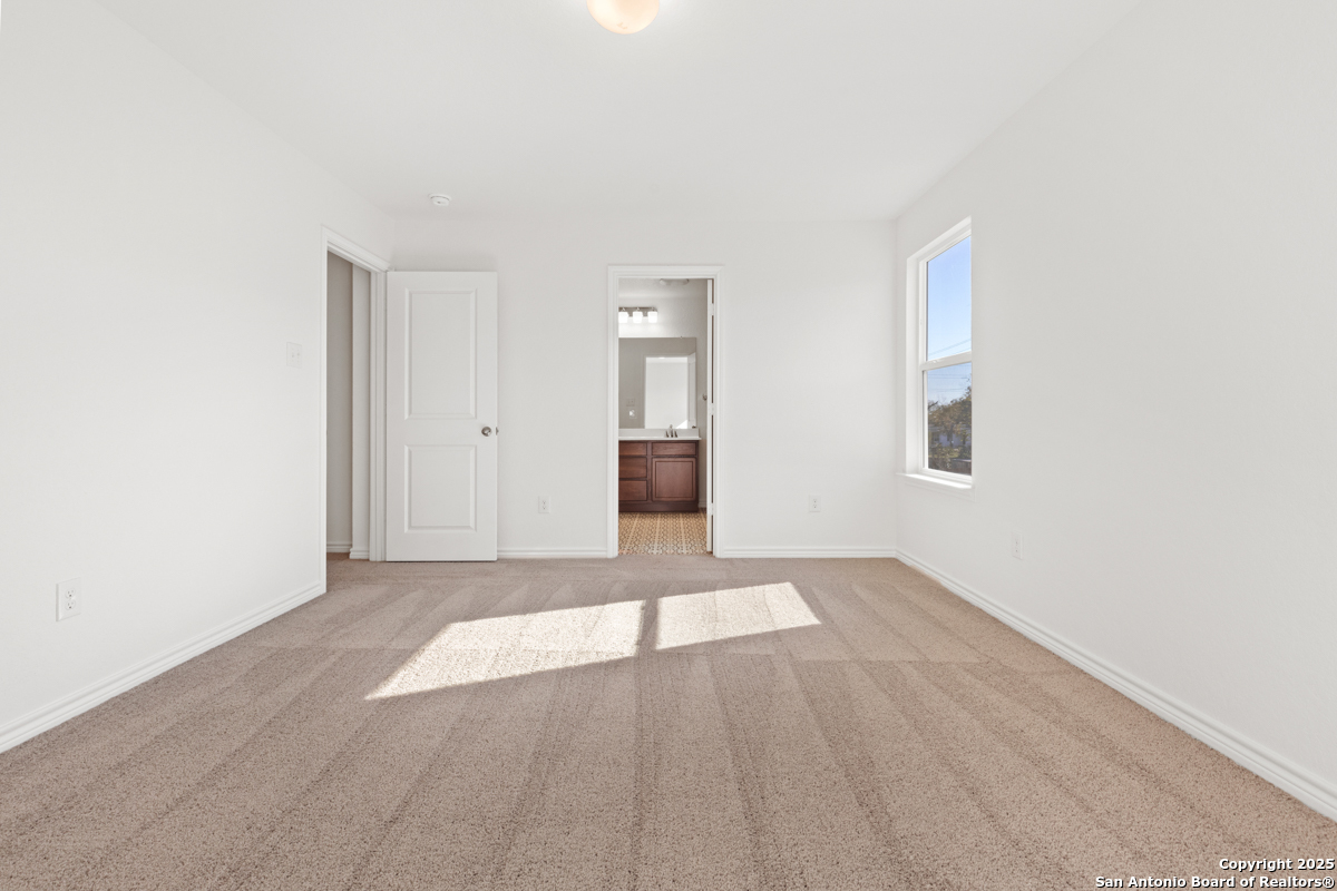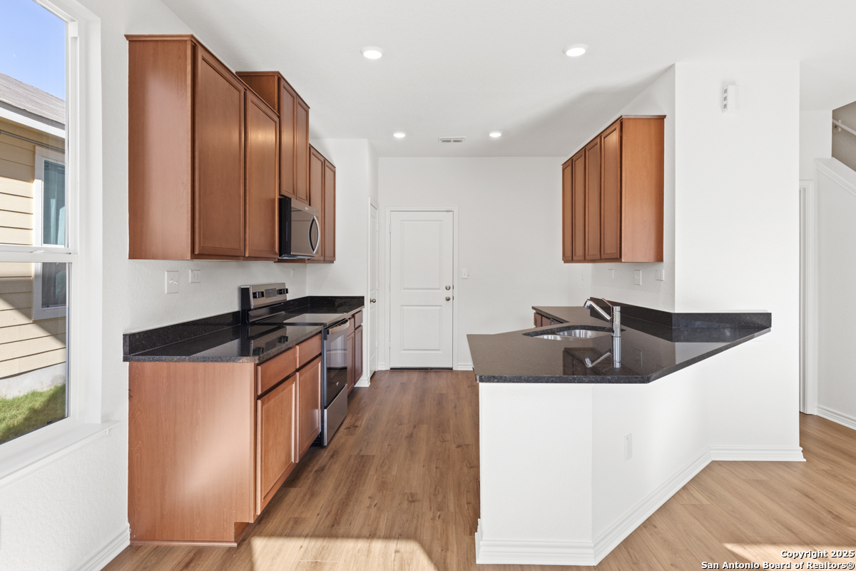 Discover comfort and style in this inviting home featuring 9-ft. ceilings on the first floor for a spacious feel. The kitchen shines with Whirlpool stainless steel appliances, granite countertops in Uba Tuba, an undermount sink, and an extended breakfast bar ideal for gatherings. The primary bath offers an extended cabinet with knee space, dual vanity, and a 42-in. garden tub/shower with a Daltile tile surround. Decorative touches include a Carrara-style entry door, Kwikset Polo knob interior hardware, and durable vinyl plank flooring. Enjoy peace of mind with a wireless security system. Outside, a fully sodded yard and automatic sprinkler system add ease and curb appeal.