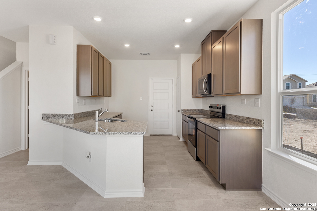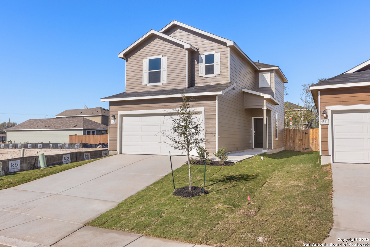 This inviting home features 9-ft. first floor ceilings for a spacious, airy feel. The kitchen is equipped with Whirlpool stainless steel appliances, Woodmont Dakota Shaker panel 42-in. upper cabinets, an extended breakfast bar, and granite countertops in Arctic Pearl. The primary bath offers upgraded cabinets, a dual vanity, and a 42-in. garden tub/shower with a Daltile tile surround. Decorative highlights include a Carrara-style entry door, Kwikset Polo knob interior hardware, Stone Theory ceramic tile flooring in the kitchen and great room, and vinyl plank flooring in the bathrooms. Additional features include a wireless security system, fully sodded yard, and an automatic sprinkler system.