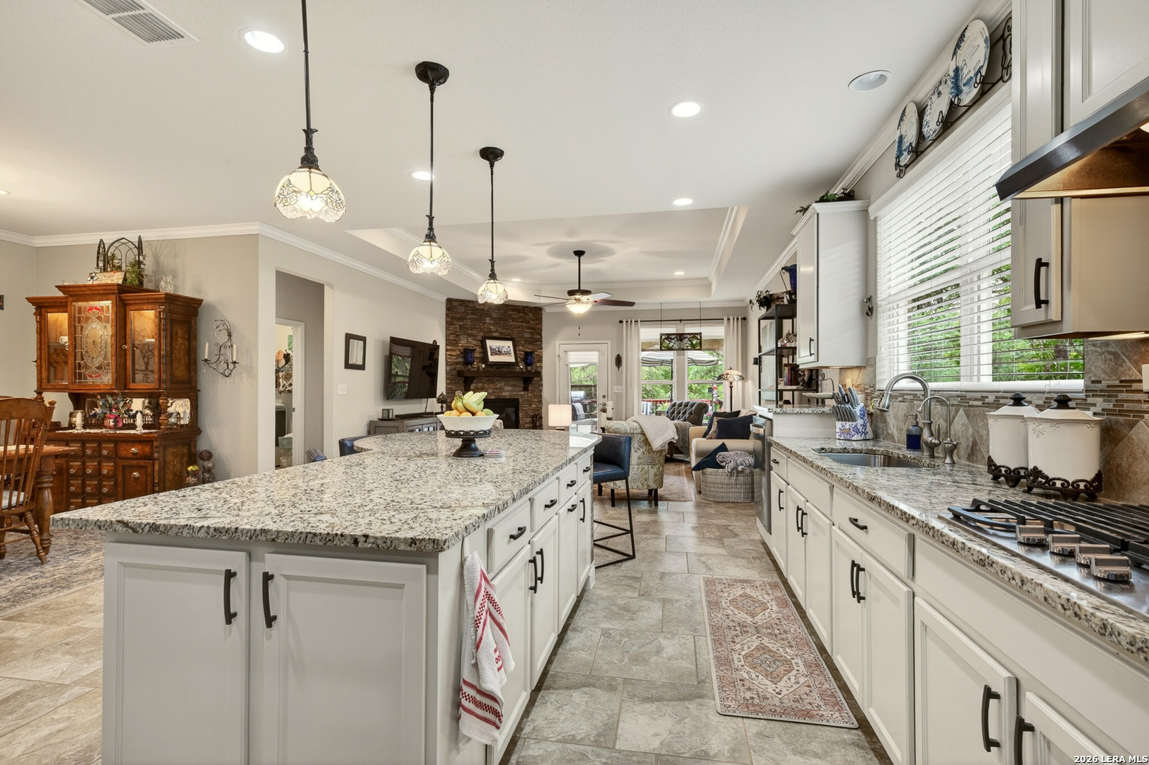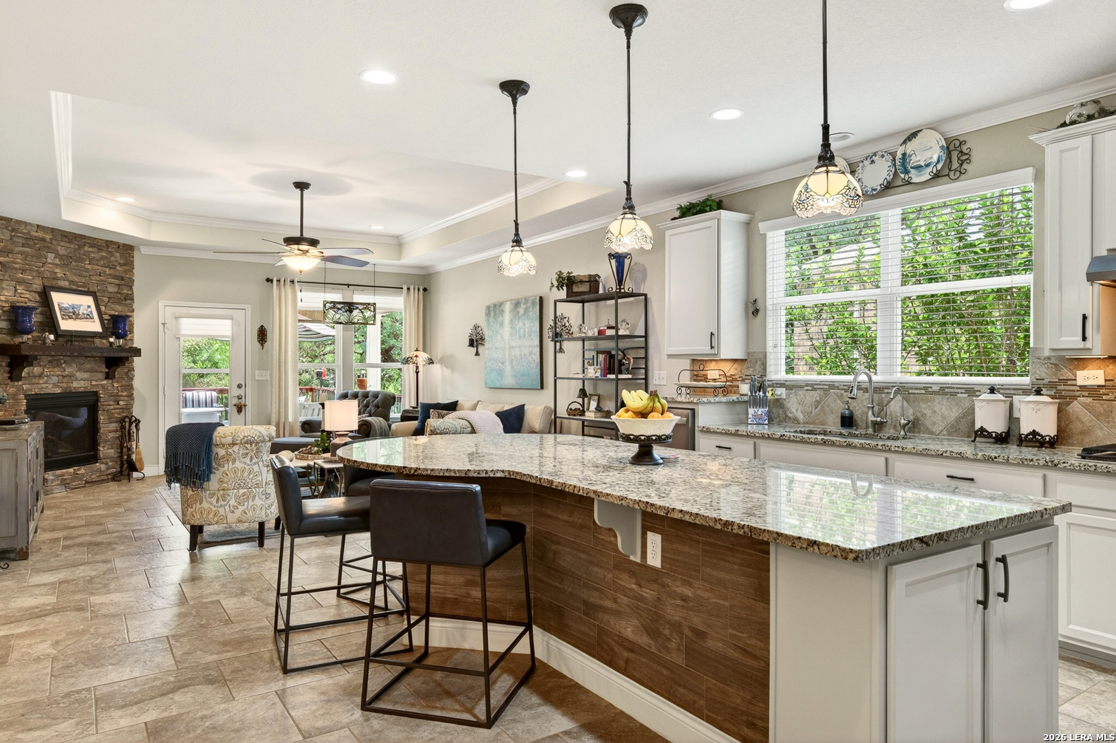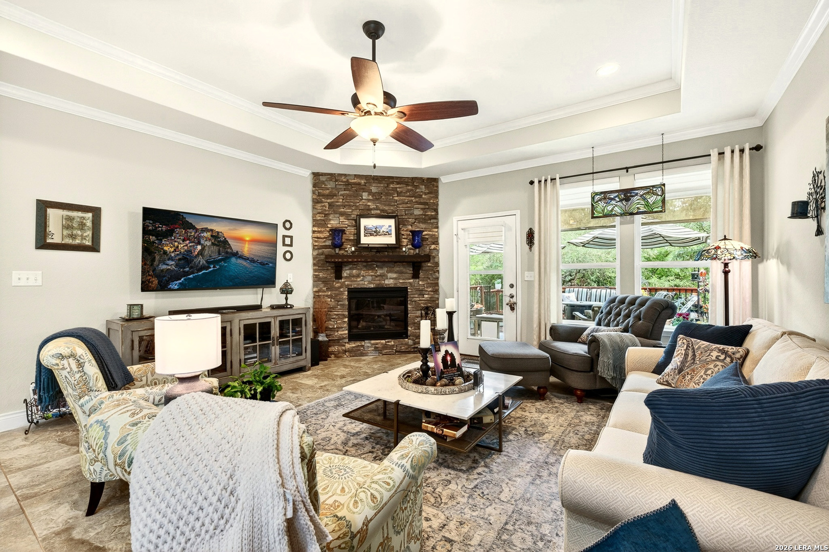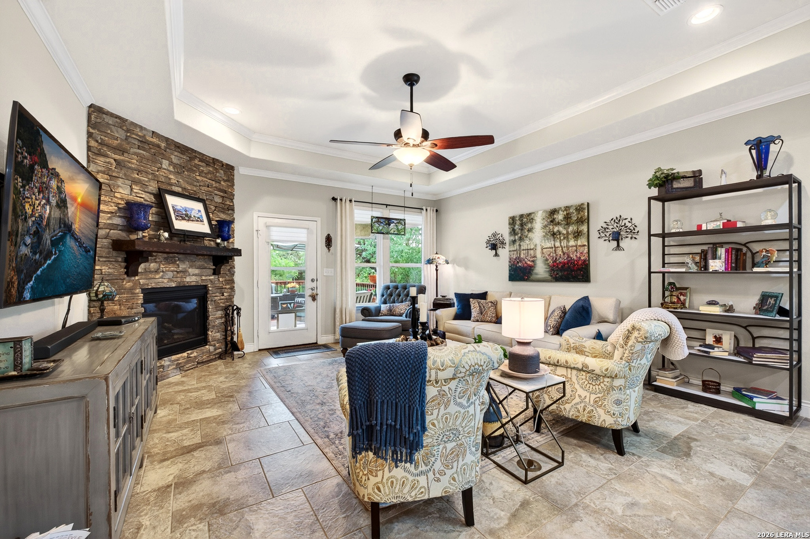 Exceptional upgrades and features are included in this home that sits on a beautiful greenbelt lot that backs onto a walking trail with easy access to the resort. The completely landscaped property features a large deck off the covered patio, as well as a covered front porch. The home boasts a stacked rock fireplace with gas insert, tile floors throughout (except for the bedrooms which have Oak wood flooring), and tile on the front and back porches, as well as tile surrounding the large kitchen island. Stainless steel built-in appliances, refinished cabinets, soft-close drawers, and custom pullouts are featured in the kitchen & separate coffee bar area. Gorgeous custom built-ins in the study include 4 file cabinets and adjustable shelves, and soft close built-in doors. Even the guest bath has been updated. The interior has been recently painted. No maintenance Leaf Guard gutters, and the property has iron fencing with three gates. Enjoy the amazing amenities in this resort-style community with amenities galore.
